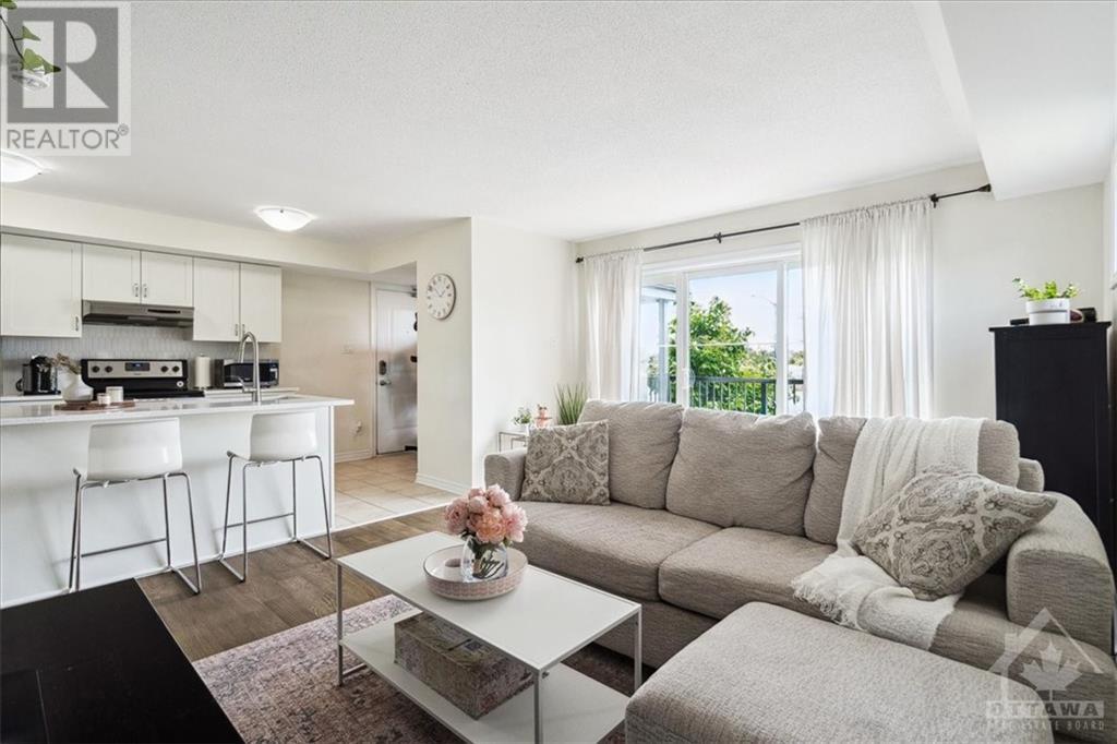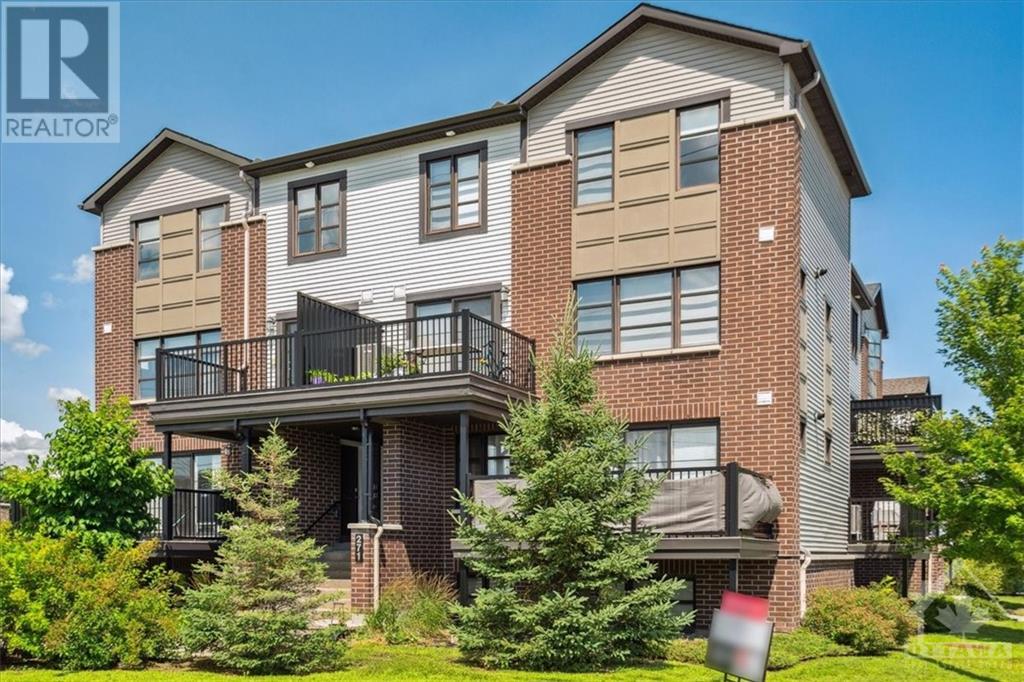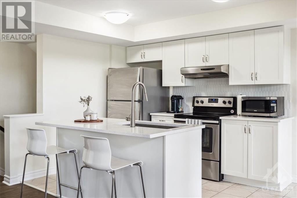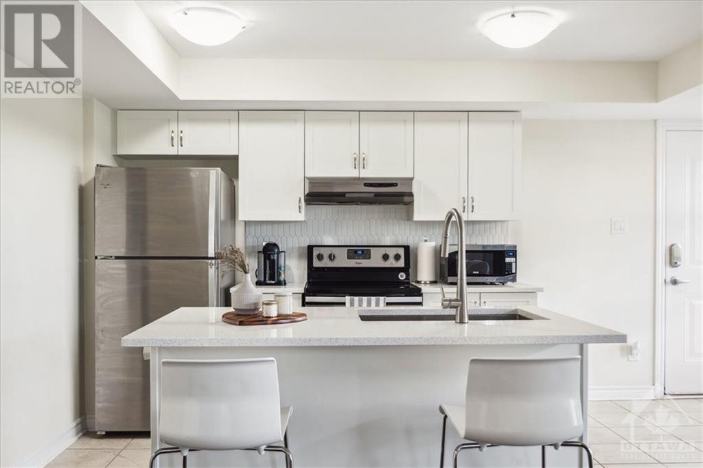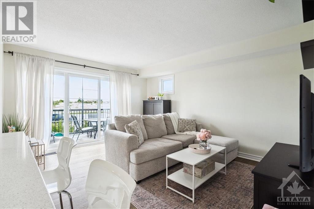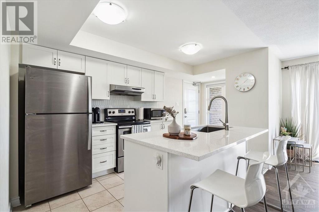 Discover modern living in this stylish 2-bedroom stacked townhouse nestled in Barrhaven, steps away from public transit. Step into an open-concept main floor featuring an upgraded kitchen (2021) w/ceramic tile floor, breakfast bar island, quartz countertops, & a pantry for added convenience. Enhanced by upgraded engineered hardwood flooring, the living/dining room opens up to a large private balcony through patio doors. The lower level, with two well-sized bedrooms boasts quality carpeting, large windows with custom blinds & generous closet space. The stylish main bathroom (upgraded in 2021) offers a soaker tub, quartz countertops & ceramic tile flooring. Laundry needs are easily met with the included laundry closet while an ample storage room provides space for your belongings. This property stands out with its modern upgrades & features, providing an appealing & comfortable living space in the heart of Barrhaven. Don't miss this one! (id:22211)