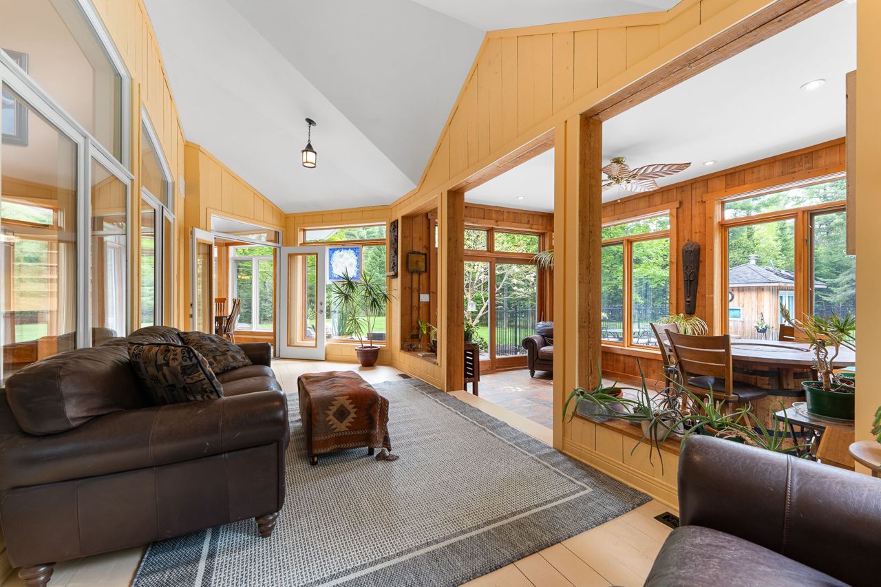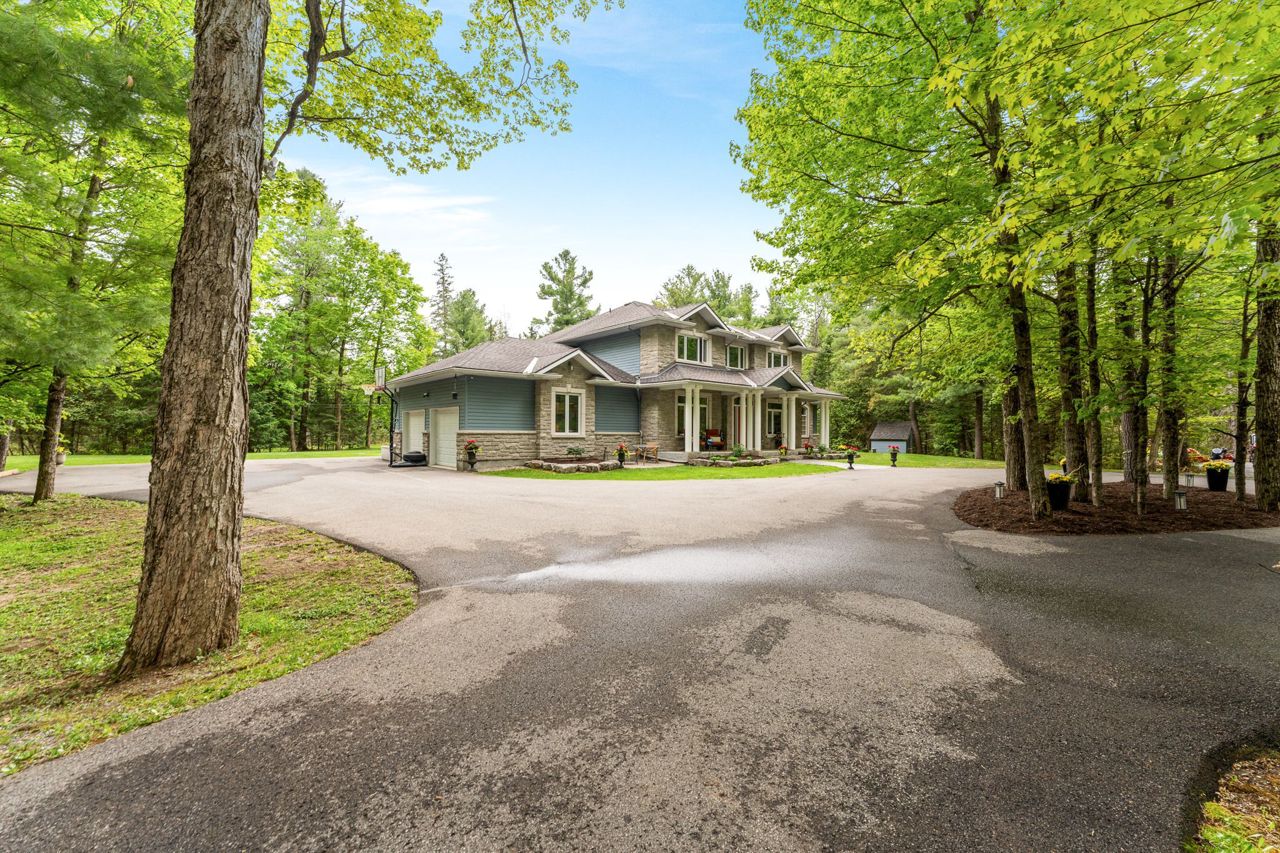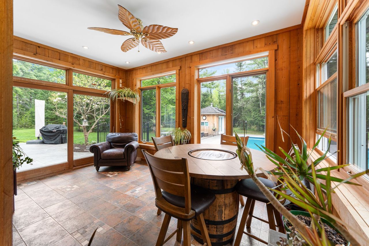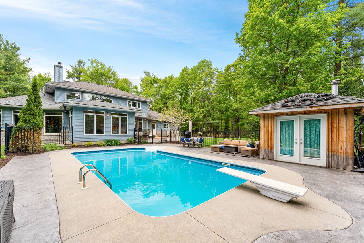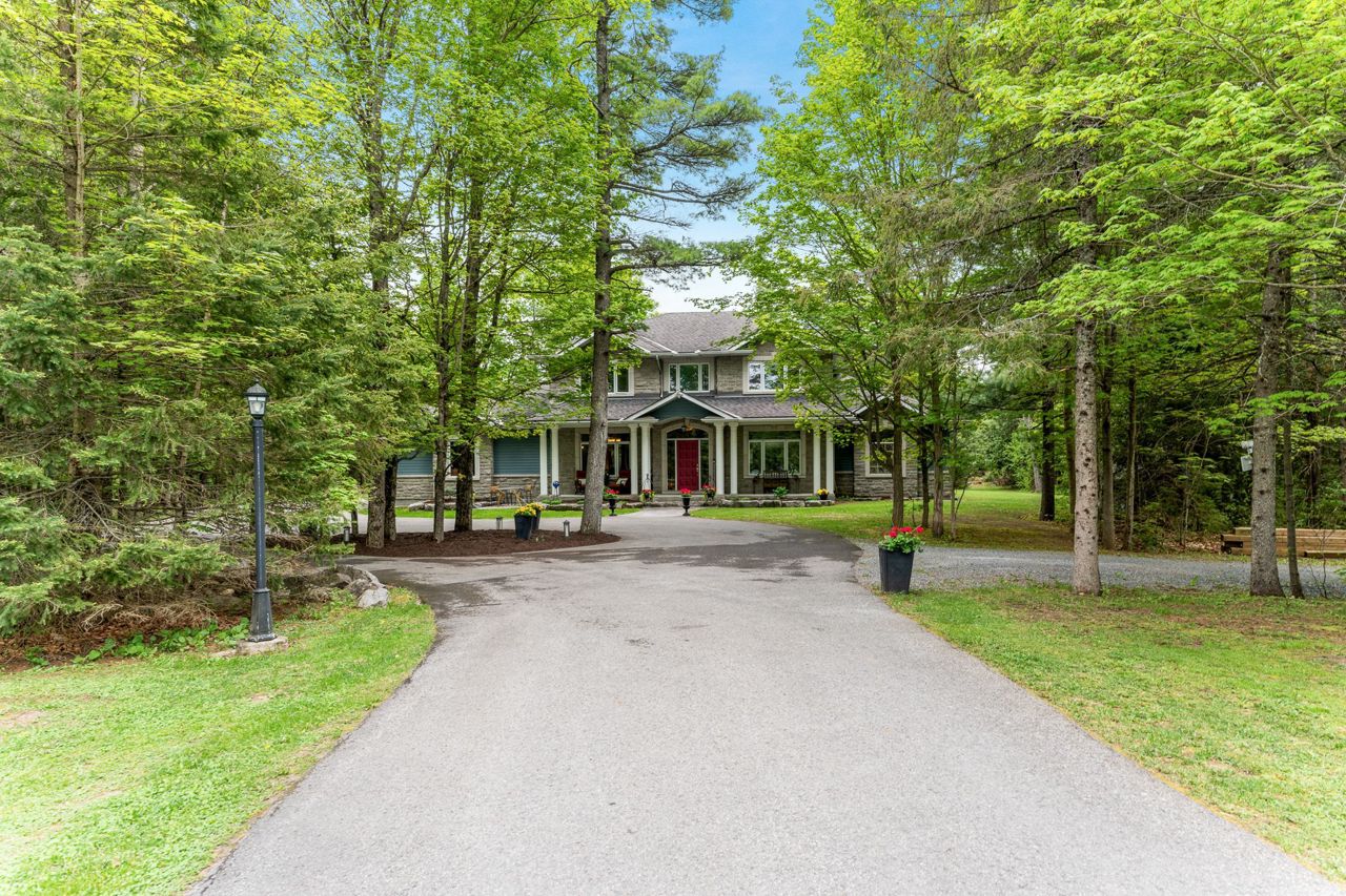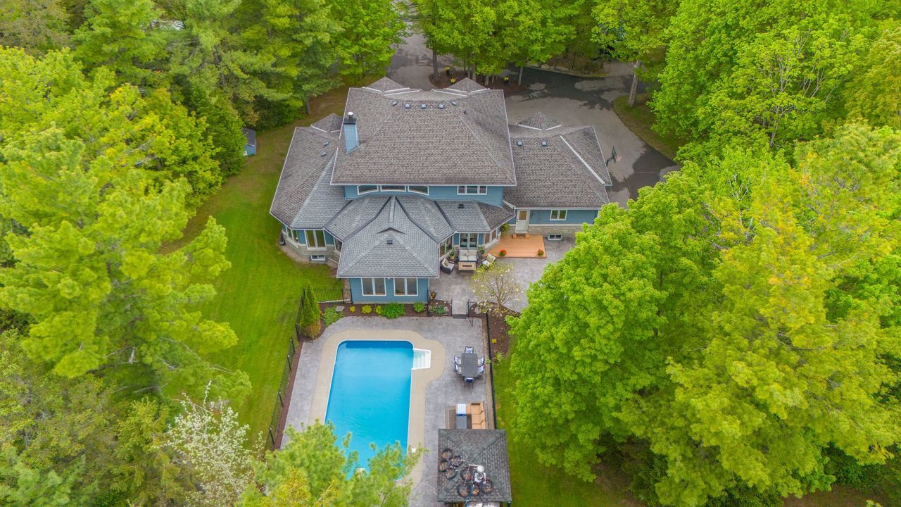 Forest-Inspired Masterpiece in the Heart of Nature and Luxury.. If your heart longs for the rustic charm of a wooded retreat and the serenity of a forested landscape, prepare to fall in love. This breathtaking estate captures the essence of refined, nature-inspired living without sacrificing convenience. Nestled on a private, tree surrounded 5.5-acre sanctuary just 10 minutes from shopping and all amenities, this custom-designed home offers a rare blend of seclusion and sophistication. Thoughtfully crafted for the discerning homeowner, the soaring great room features a dramatic two-story fieldstone fireplace and postcard-worthy views. Overlooking it is a chefs kitchen with top-tier cabinetry, granite countertops, and premium tile flooring ideal for entertaining or everyday indulgence. Elegant reclaimed wood beams, hewn from century-old timbers recovered from the Ottawa River by Logs End, lend timeless character to the principal rooms on the main level. The modified center hall plan flows into a grand den/office and formal dining room. Main-level primary suite is a tranquil retreat with panoramic forest views, a luxurious ensuite, and unmatched privacy. Year-round relaxation awaits in the bright solarium or sunroom, both overlooking the solar heated 9-foot-deep saltwater pool a true backyard oasis. Upstairs, three spacious bedrooms offer comfort and privacy and include Juliette balcony overlooking main living area. Open-concept, finished lower level adds versatility: home gym, custom wine cellar, designer bar, and stylish powder room perfect for entertaining or unwinding. Crafted with uncompromising quality and set in a location that feels worlds away yet minutes from everything, this exceptional home invites you to experience mountain-inspired luxury like never before.
