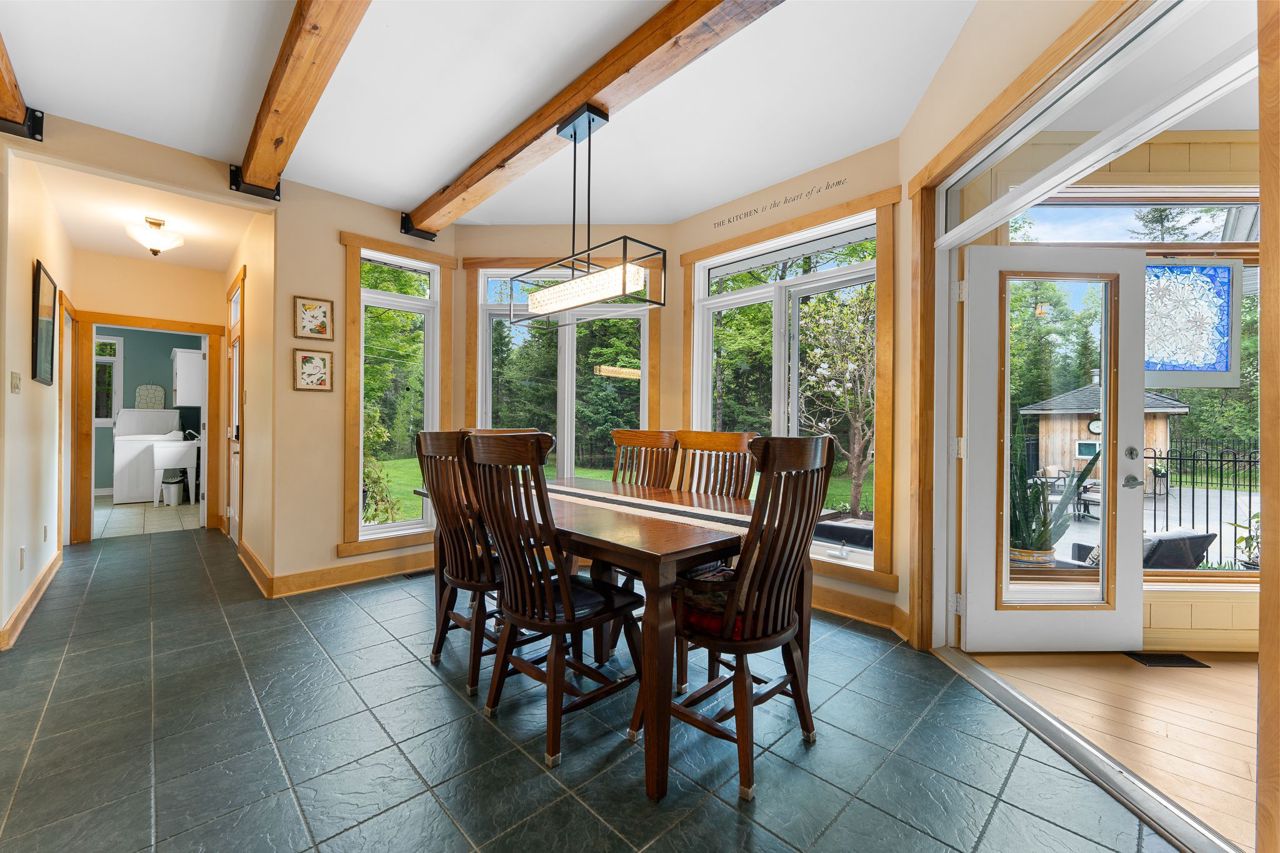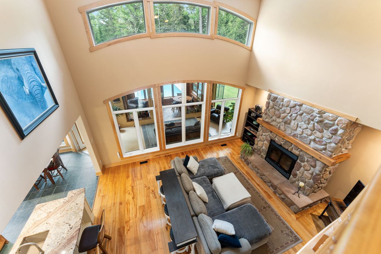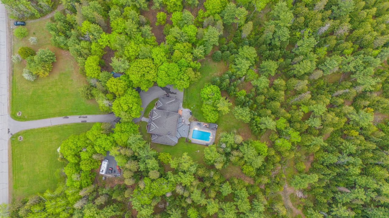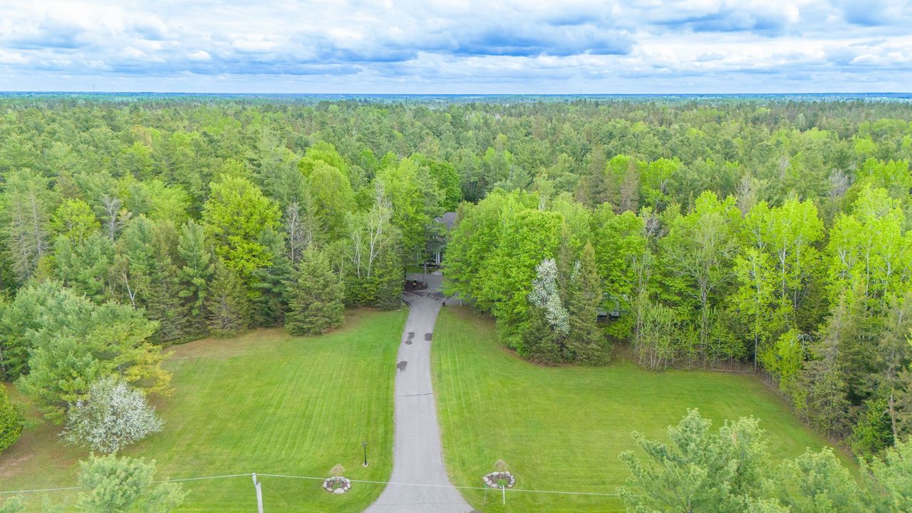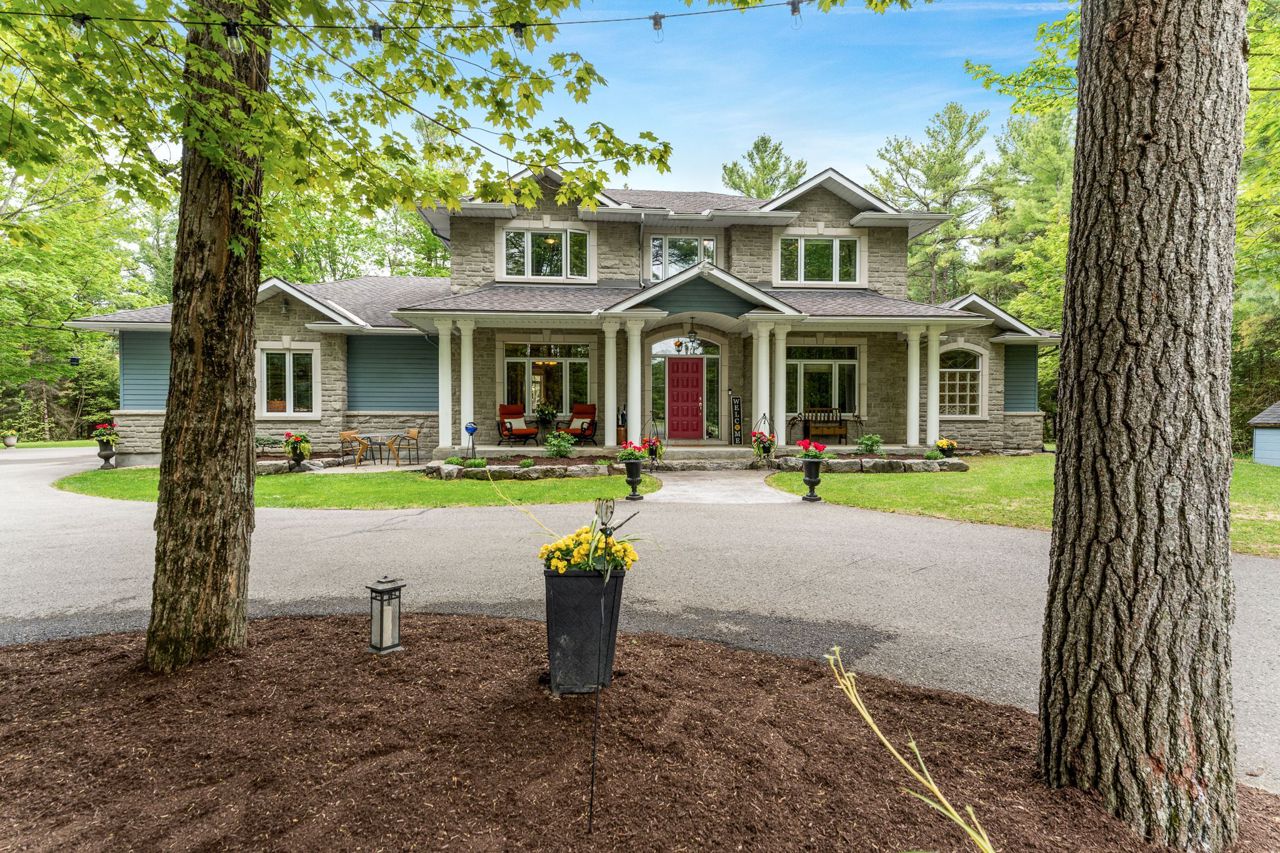 Forest-Inspired Masterpiece in the Heart of Nature and Luxury.. If your heart longs for the rustic charm of a wooded retreat and the serenity of a forested landscape, prepare to fall in love. This breathtaking estate captures the essence of refined, nature-inspired living without sacrificing convenience. Nestled on a private, tree surrounded 5.5-acre sanctuary just 10 minutes from shopping and all amenities, this custom-designed home offers a rare blend of seclusion and sophistication. Thoughtfully crafted for the discerning homeowner, the soaring great room features a dramatic two-story fieldstone fireplace and postcard-worthy views. Overlooking it is a chefs kitchen with top-tier cabinetry, granite countertops, and premium tile flooring ideal for entertaining or everyday indulgence. Elegant reclaimed wood beams, hewn from century-old timbers recovered from the Ottawa River by Logs End, lend timeless character to the principal rooms on the main level. The modified center hall plan flows into a grand den/office and formal dining room. Main-level primary suite is a tranquil retreat with panoramic forest views, a luxurious ensuite, and unmatched privacy. Year-round relaxation awaits in the bright solarium or sunroom, both overlooking the solar heated 9-foot-deep saltwater pool a true backyard oasis. Upstairs, three spacious bedrooms offer comfort and privacy and include Juliette balcony overlooking main living area. Open-concept, finished lower level adds versatility: home gym, custom wine cellar, designer bar, and stylish powder room perfect for entertaining or unwinding. Crafted with uncompromising quality and set in a location that feels worlds away yet minutes from everything, this exceptional home invites you to experience mountain-inspired luxury like never before.