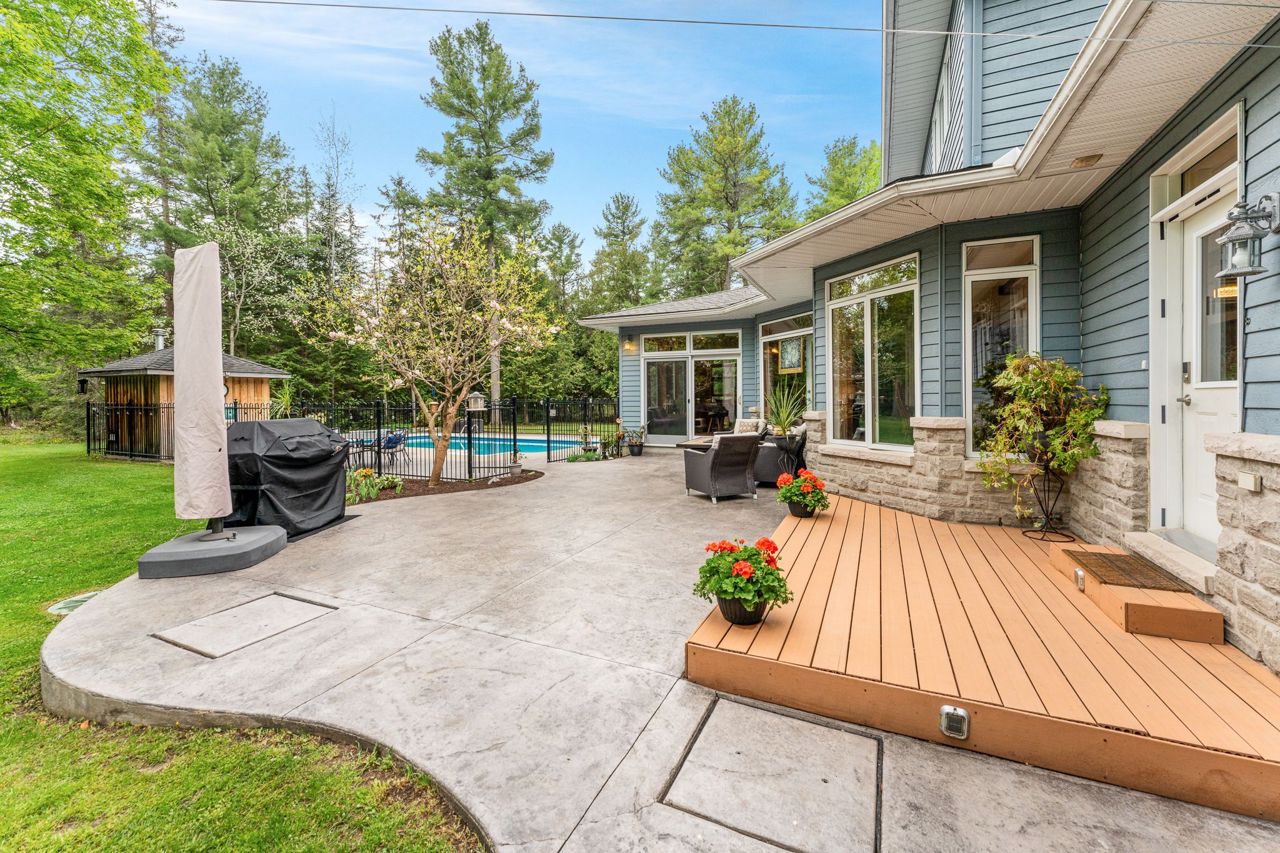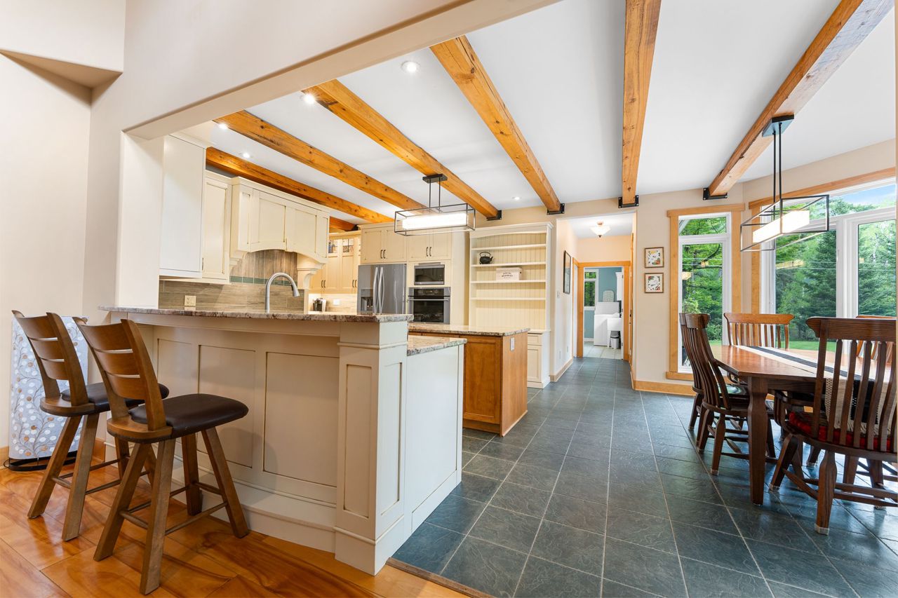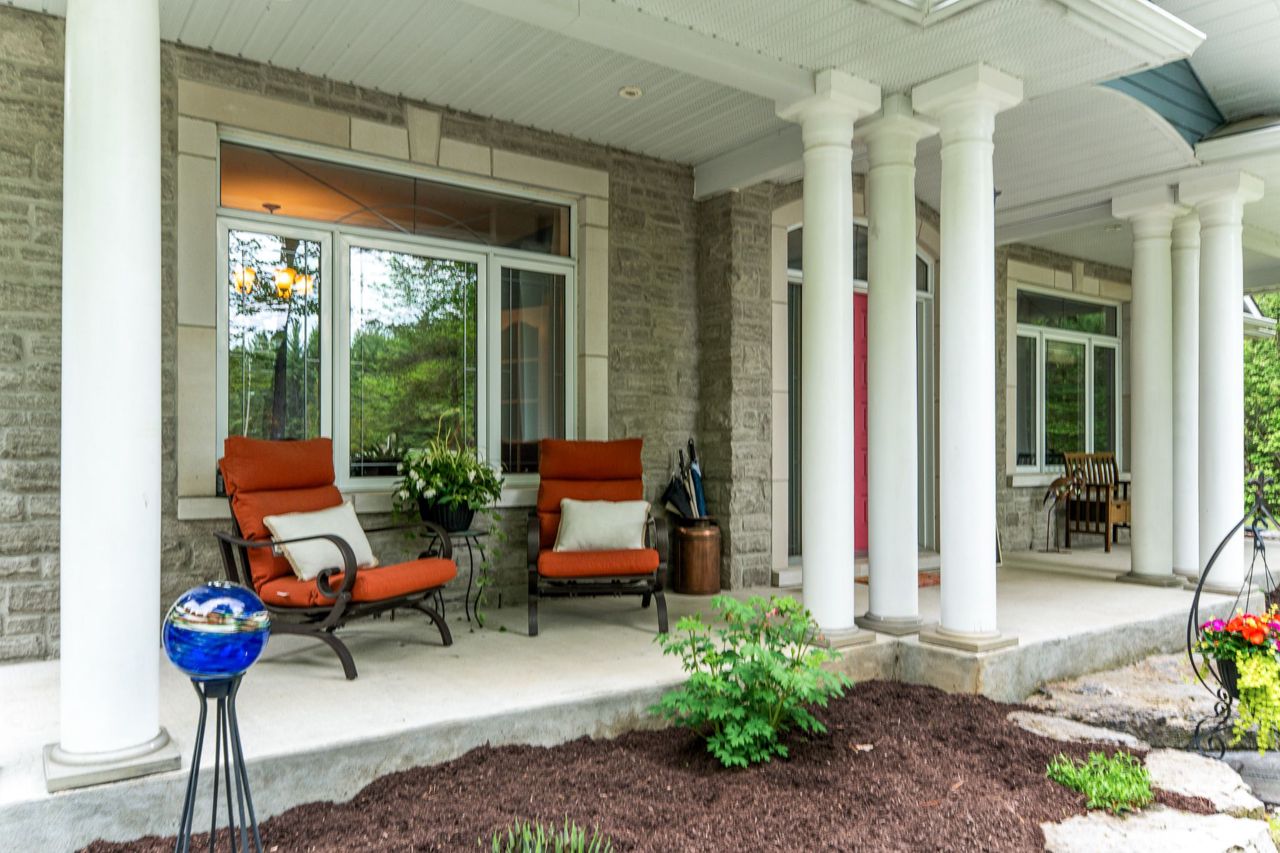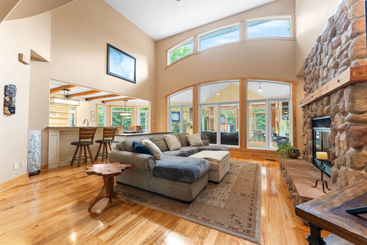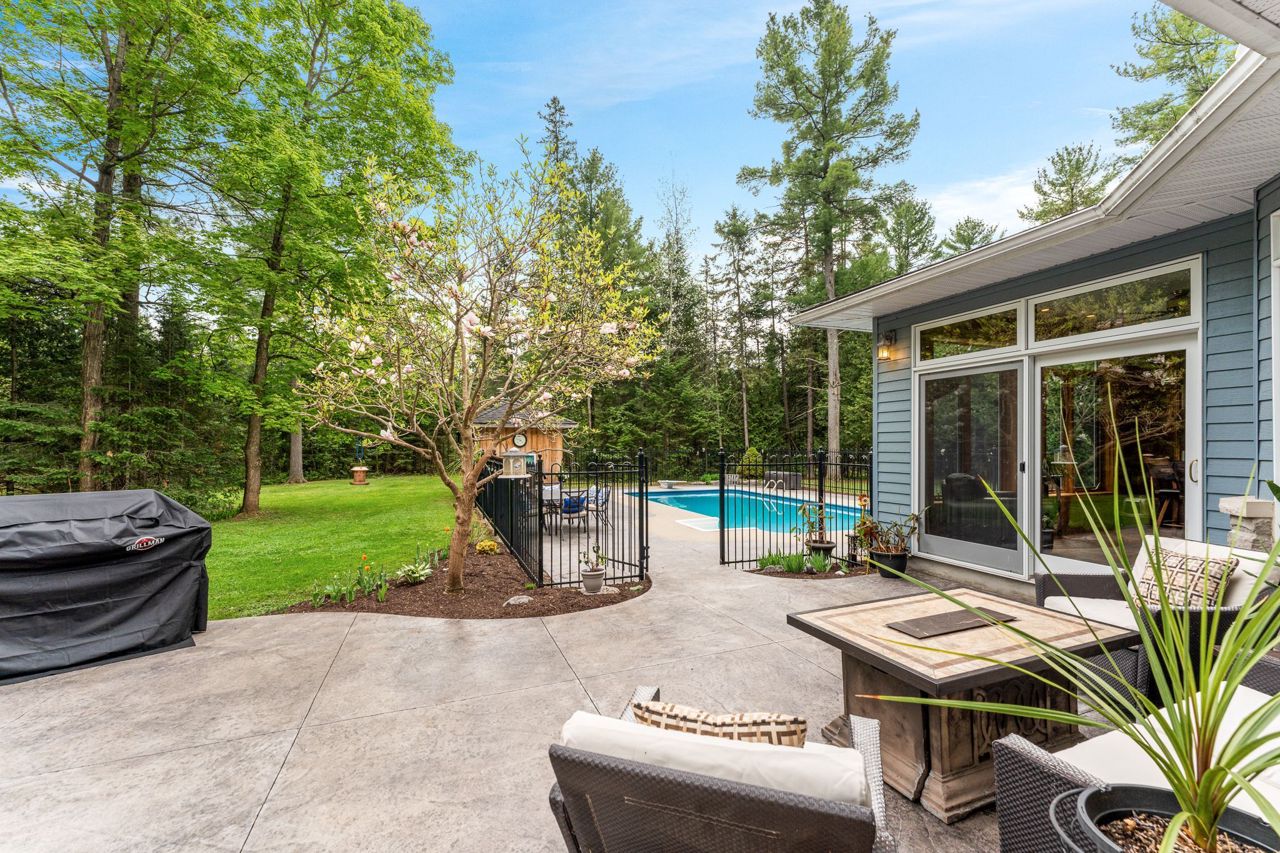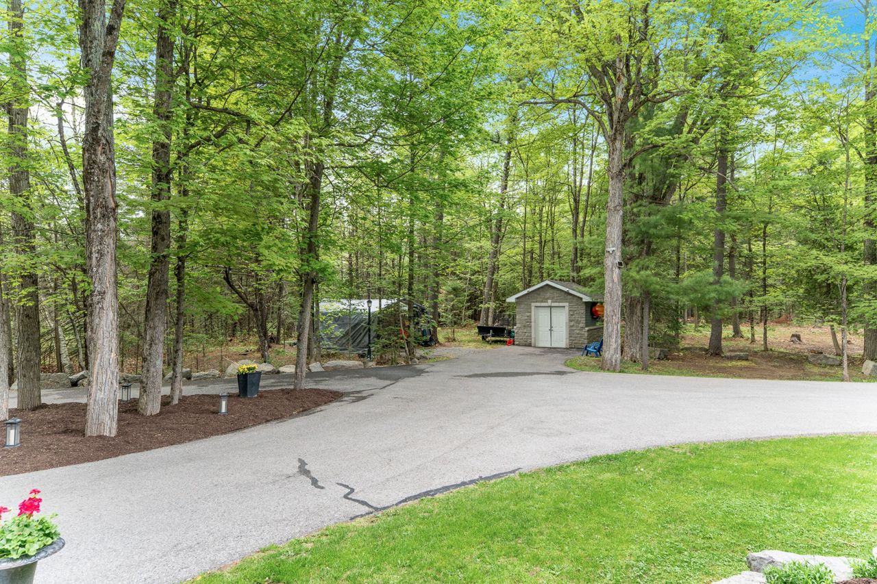 Forest-Inspired Masterpiece in the Heart of Nature and Luxury.. If your heart longs for the rustic charm of a wooded retreat and the serenity of a forested landscape, prepare to fall in love. This breathtaking estate captures the essence of refined, nature-inspired living without sacrificing convenience. Nestled on a private, tree surrounded 5.5-acre sanctuary just 10 minutes from shopping and all amenities, this custom-designed home offers a rare blend of seclusion and sophistication. Thoughtfully crafted for the discerning homeowner, the soaring great room features a dramatic two-story fieldstone fireplace and postcard-worthy views. Overlooking it is a chefs kitchen with top-tier cabinetry, granite countertops, and premium tile flooring ideal for entertaining or everyday indulgence. Elegant reclaimed wood beams, hewn from century-old timbers recovered from the Ottawa River by Logs End, lend timeless character to the principal rooms on the main level. The modified center hall plan flows into a grand den/office and formal dining room. Main-level primary suite is a tranquil retreat with panoramic forest views, a luxurious ensuite, and unmatched privacy. Year-round relaxation awaits in the bright solarium or sunroom, both overlooking the solar heated 9-foot-deep saltwater pool a true backyard oasis. Upstairs, three spacious bedrooms offer comfort and privacy and include Juliette balcony overlooking main living area. Open-concept, finished lower level adds versatility: home gym, custom wine cellar, designer bar, and stylish powder room perfect for entertaining or unwinding. Crafted with uncompromising quality and set in a location that feels worlds away yet minutes from everything, this exceptional home invites you to experience mountain-inspired luxury like never before.