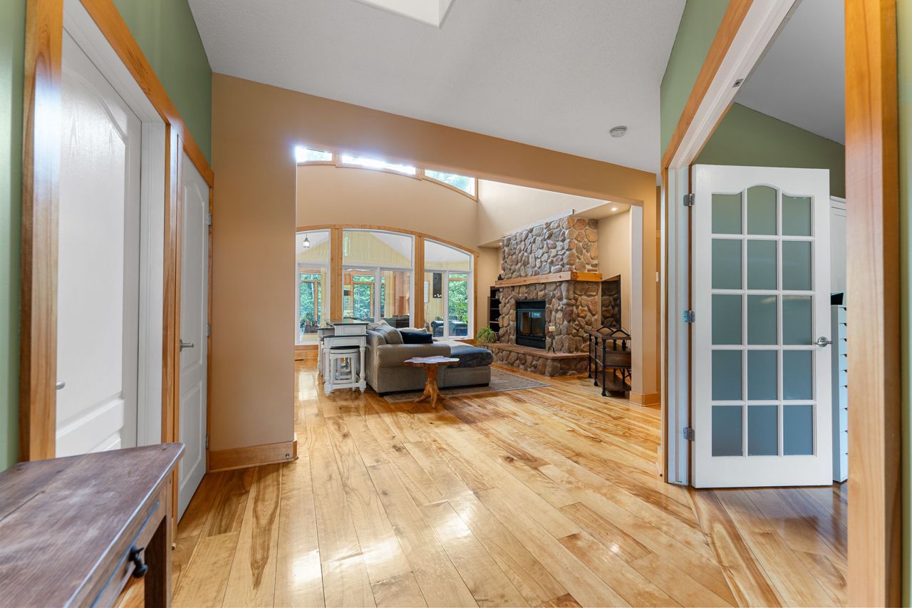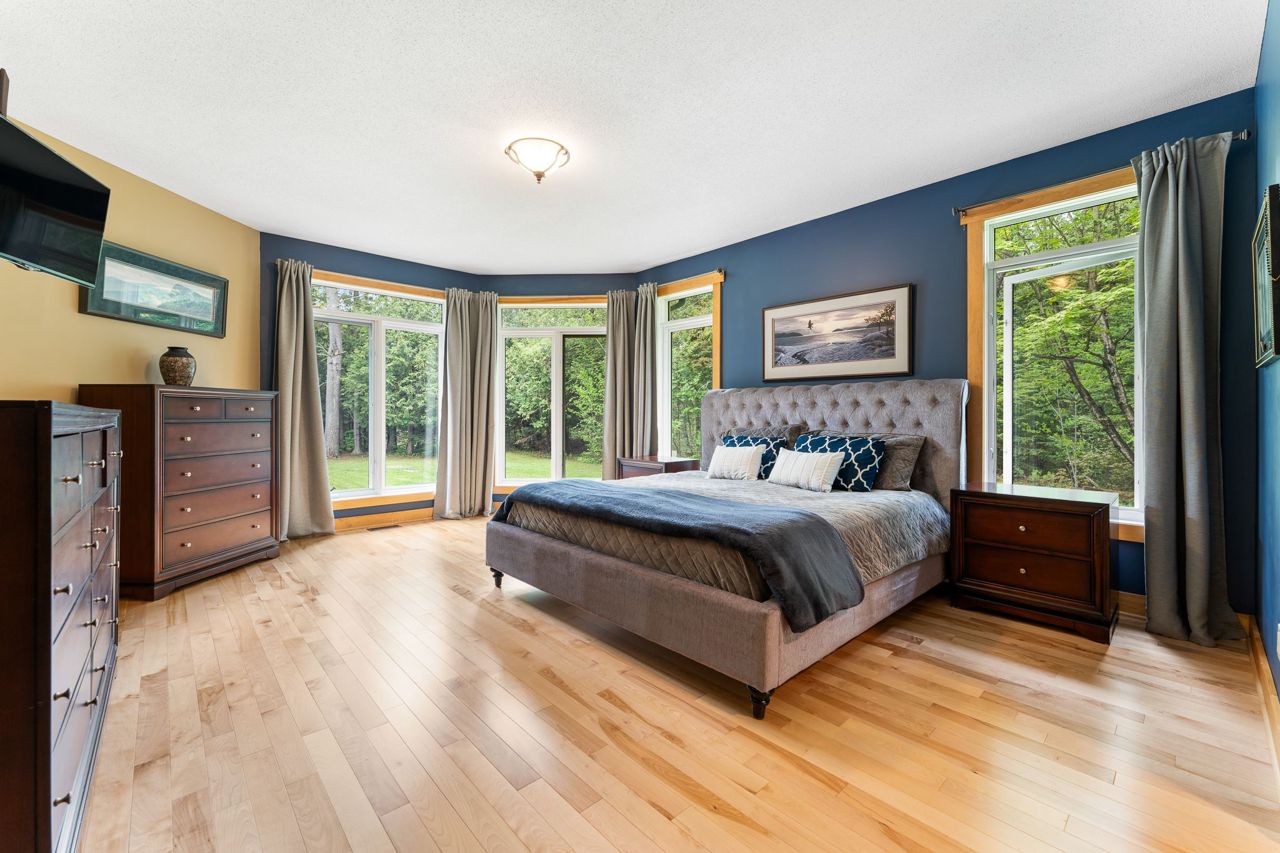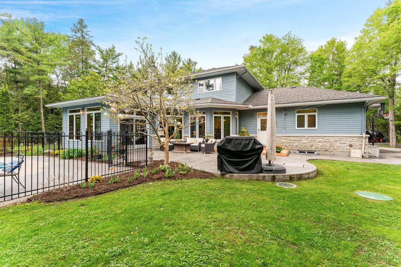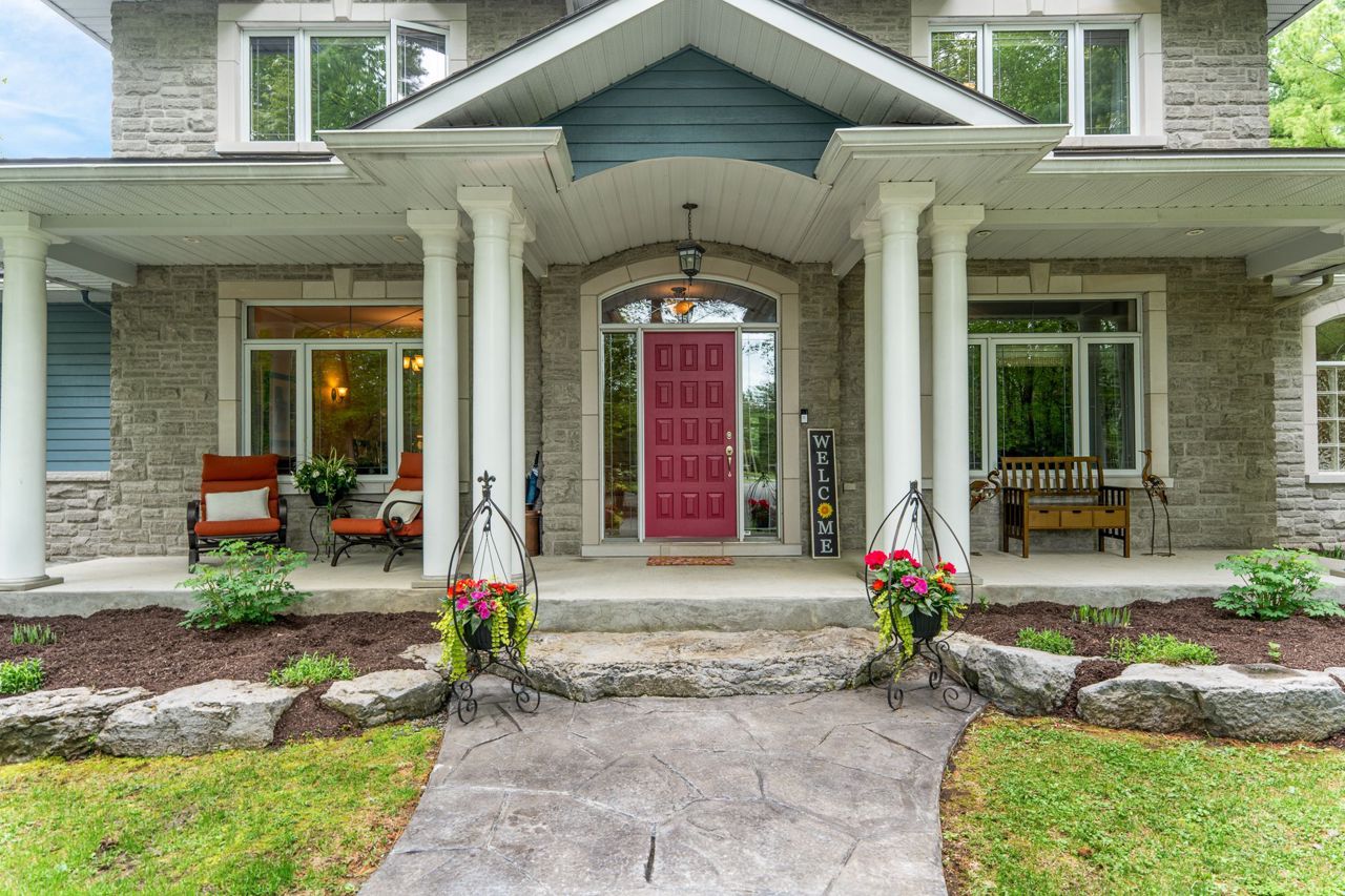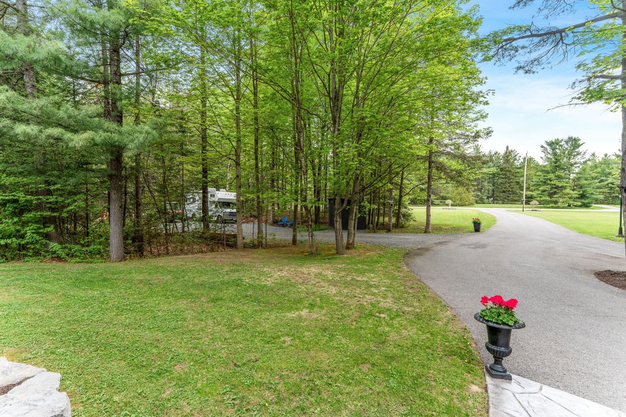 Forest-Inspired Masterpiece in the Heart of Nature and Luxury.. If your heart longs for the rustic charm of a wooded retreat and the serenity of a forested landscape, prepare to fall in love. This breathtaking estate captures the essence of refined, nature-inspired living without sacrificing convenience. Nestled on a private, tree surrounded 5.5-acre sanctuary just 10 minutes from shopping and all amenities, this custom-designed home offers a rare blend of seclusion and sophistication. Thoughtfully crafted for the discerning homeowner, the soaring great room features a dramatic two-story fieldstone fireplace and postcard-worthy views. Overlooking it is a chefs kitchen with top-tier cabinetry, granite countertops, and premium tile flooring ideal for entertaining or everyday indulgence. Elegant reclaimed wood beams, hewn from century-old timbers recovered from the Ottawa River by Logs End, lend timeless character to the principal rooms on the main level. The modified center hall plan flows into a grand den/office and formal dining room. Main-level primary suite is a tranquil retreat with panoramic forest views, a luxurious ensuite, and unmatched privacy. Year-round relaxation awaits in the bright solarium or sunroom, both overlooking the solar heated 9-foot-deep saltwater pool a true backyard oasis. Upstairs, three spacious bedrooms offer comfort and privacy and include Juliette balcony overlooking main living area. Open-concept, finished lower level adds versatility: home gym, custom wine cellar, designer bar, and stylish powder room perfect for entertaining or unwinding. Crafted with uncompromising quality and set in a location that feels worlds away yet minutes from everything, this exceptional home invites you to experience mountain-inspired luxury like never before.