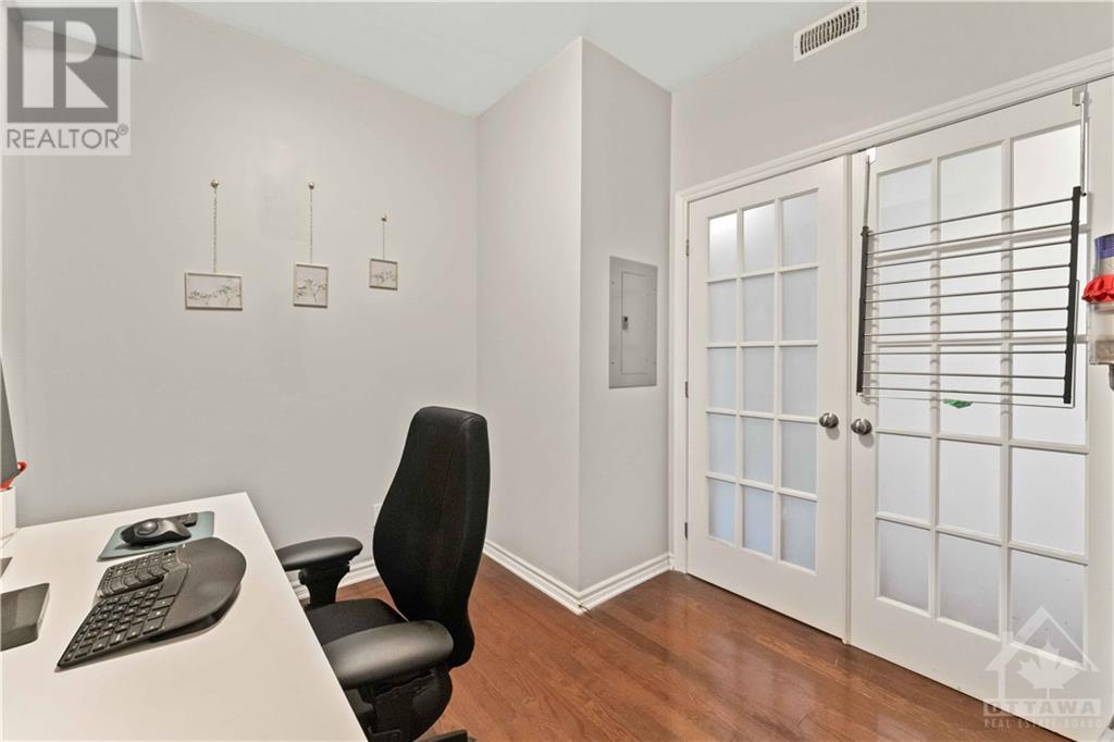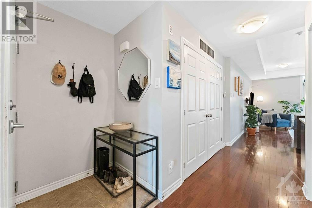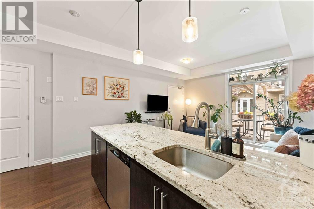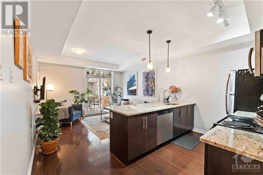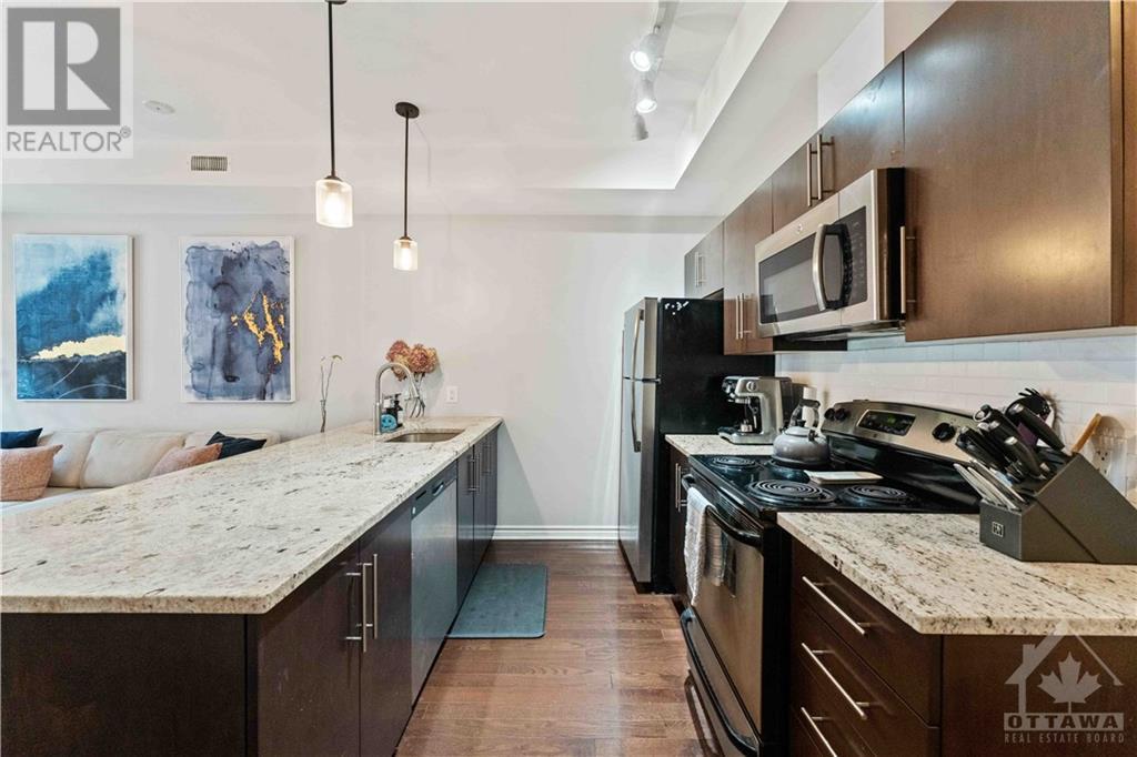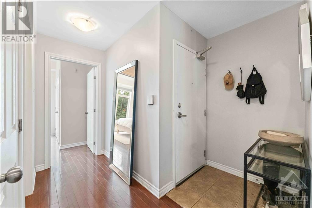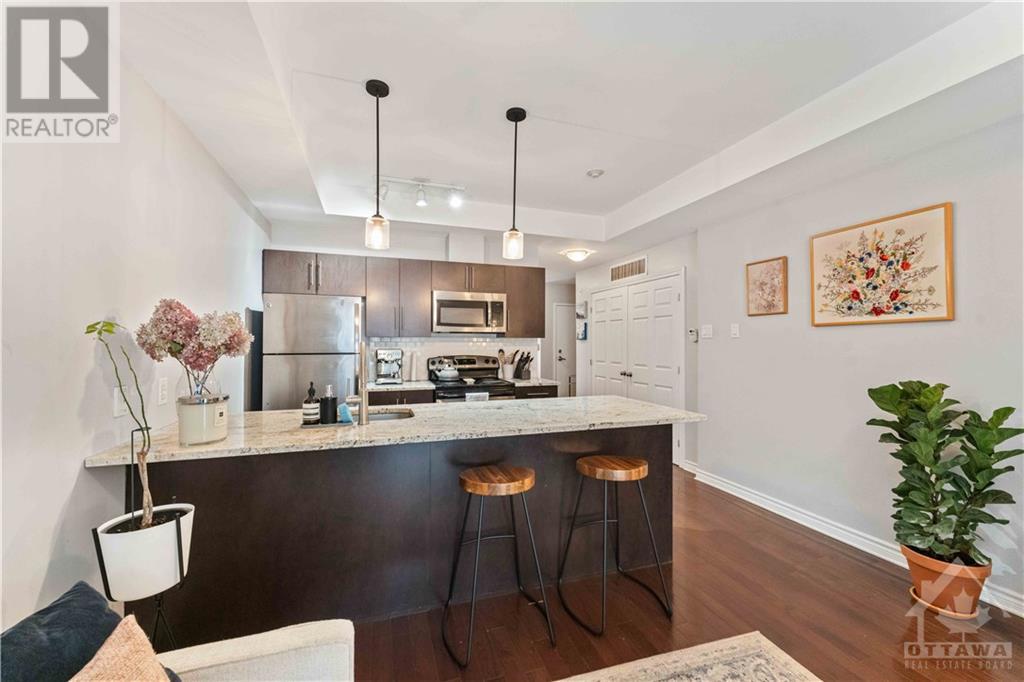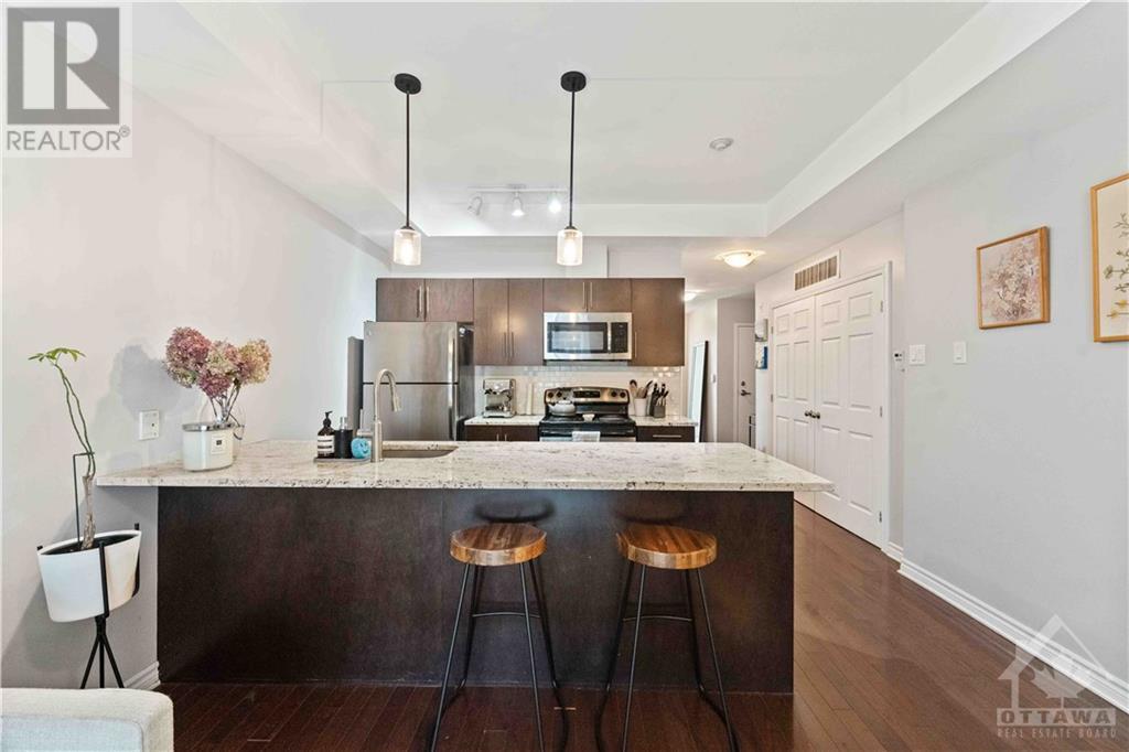 This modern one bedroom plus den features rich hardwood throughout, an open concept floor plan, plenty of cabinet space in the kitchen, stone countertops and a large breakfast bar that is perfect for entertaining. The private den with french doors is a great space for a home office or tv room. The spacious bedroom has tons of storage and an oversized window. The patio overlooks the courtyard. No need to clear the snow off the car - heated, underground parking included, with inside access from the building. Excellent location for access to transit, shopping at the Trainyards or St Laurent, the Ottawa Hospital as well as downtown. Ample visitor parking. In-unit laundry. (id:22211)