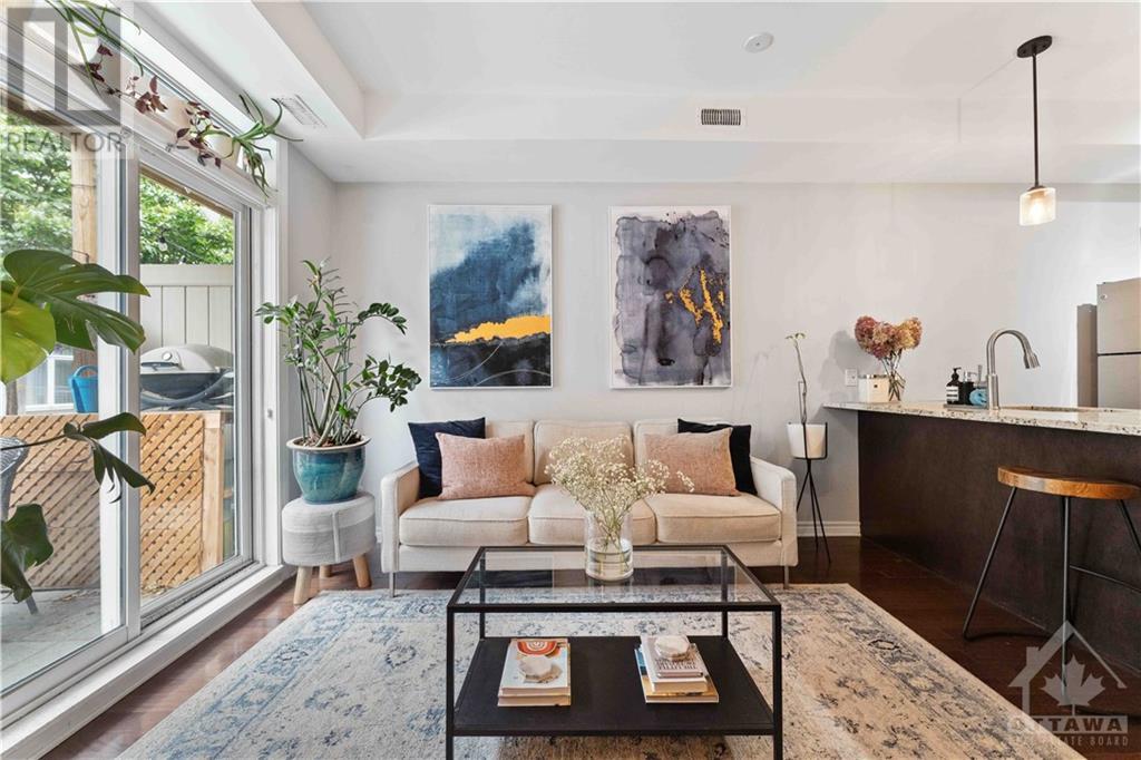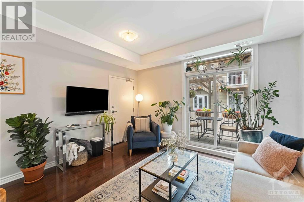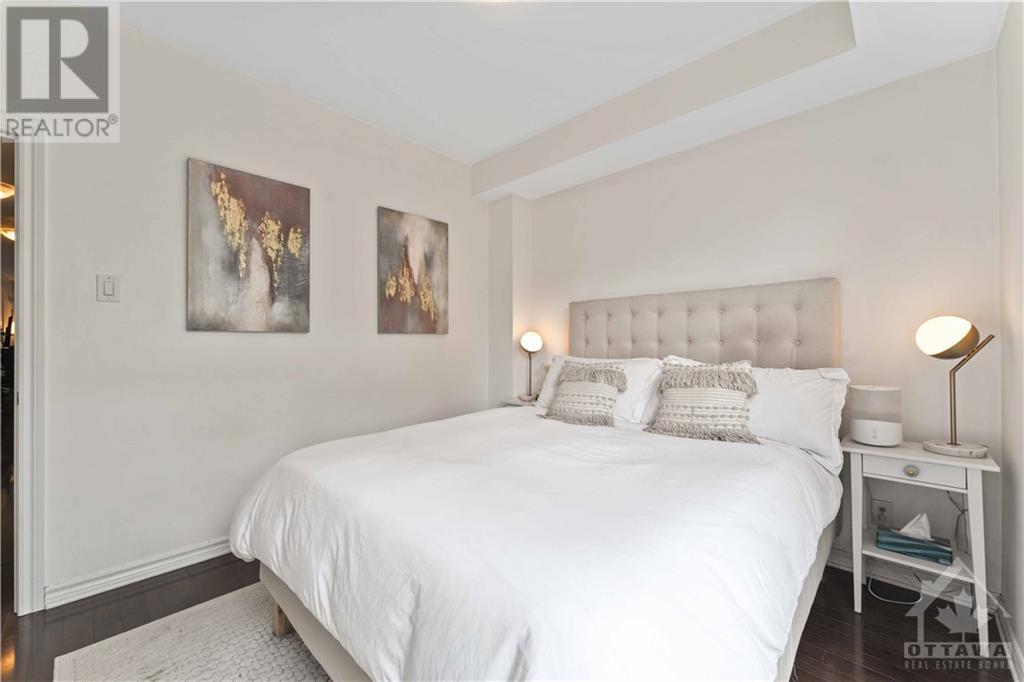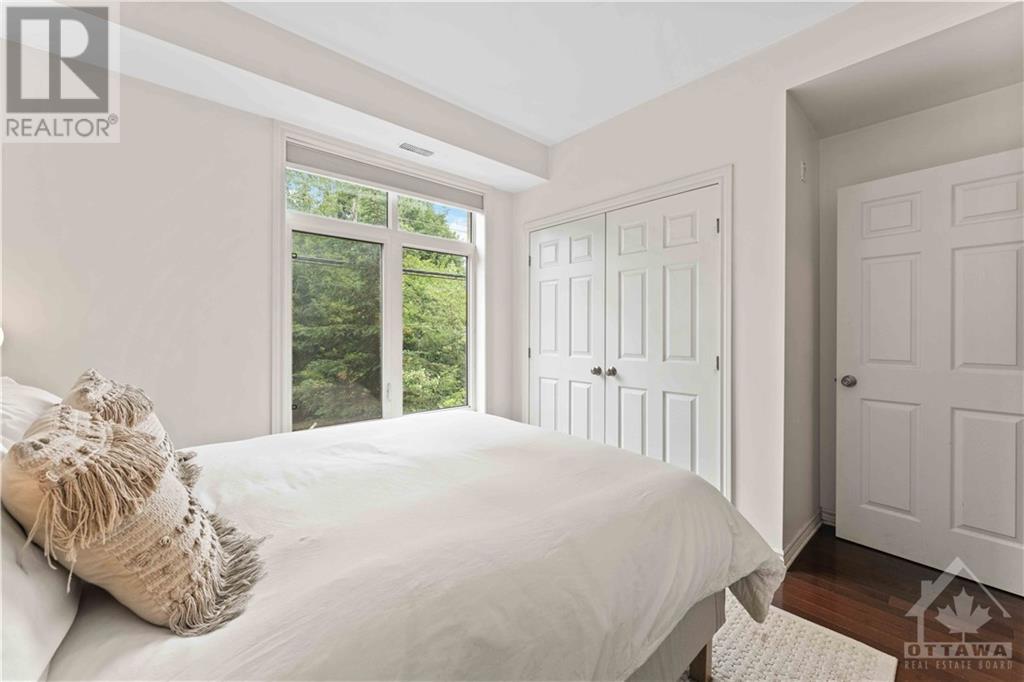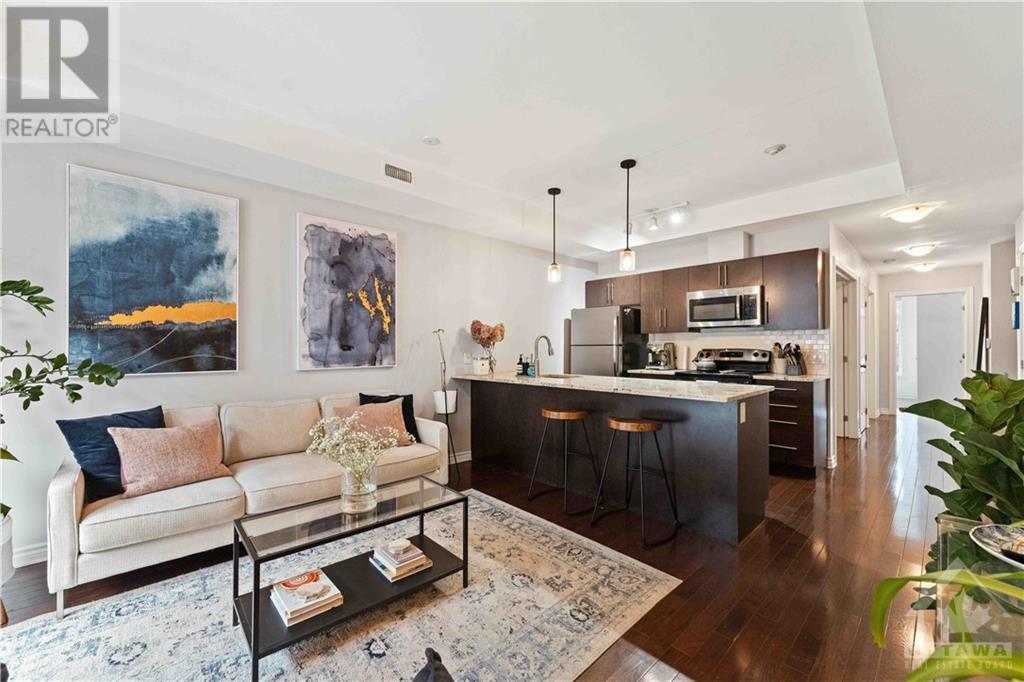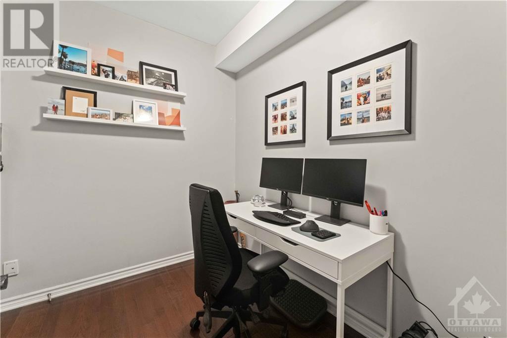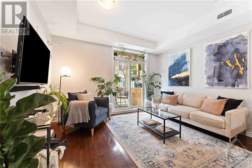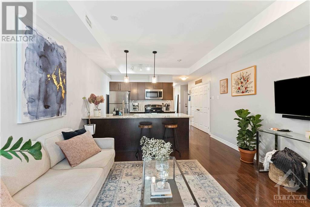 This modern one bedroom plus den features rich hardwood throughout, an open concept floor plan, plenty of cabinet space in the kitchen, stone countertops and a large breakfast bar that is perfect for entertaining. The private den with french doors is a great space for a home office or tv room. The spacious bedroom has tons of storage and an oversized window. The patio overlooks the courtyard. No need to clear the snow off the car - heated, underground parking included, with inside access from the building. Excellent location for access to transit, shopping at the Trainyards or St Laurent, the Ottawa Hospital as well as downtown. Ample visitor parking. In-unit laundry. (id:22211)