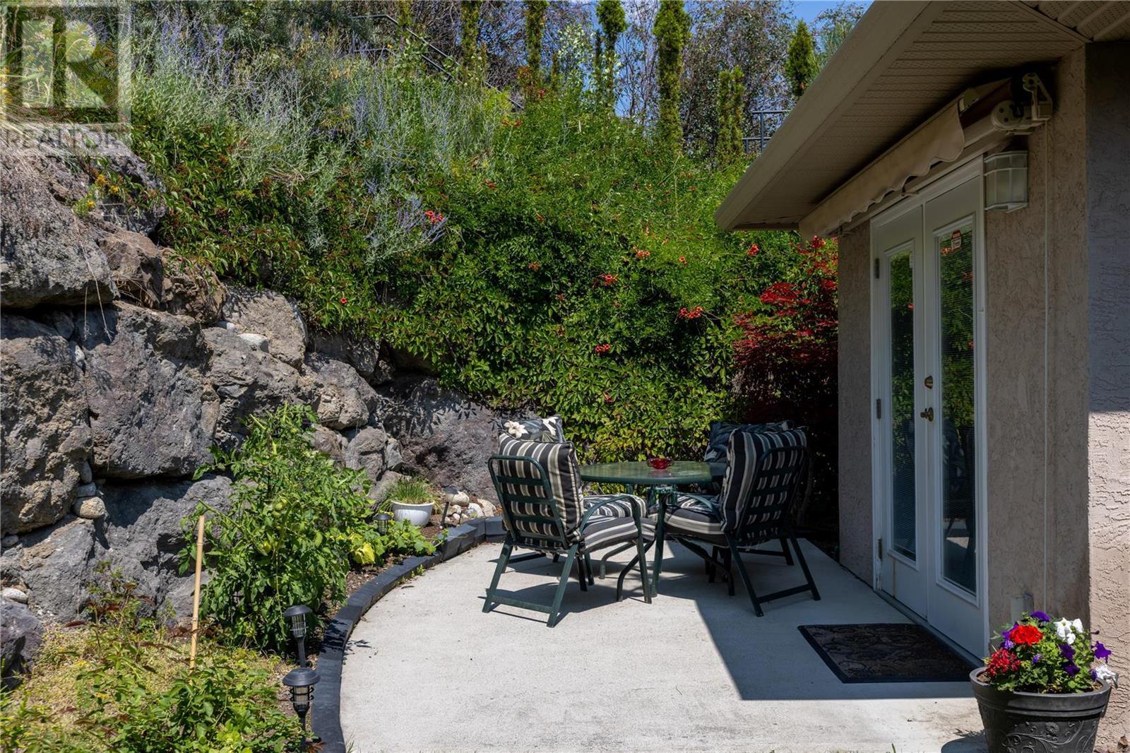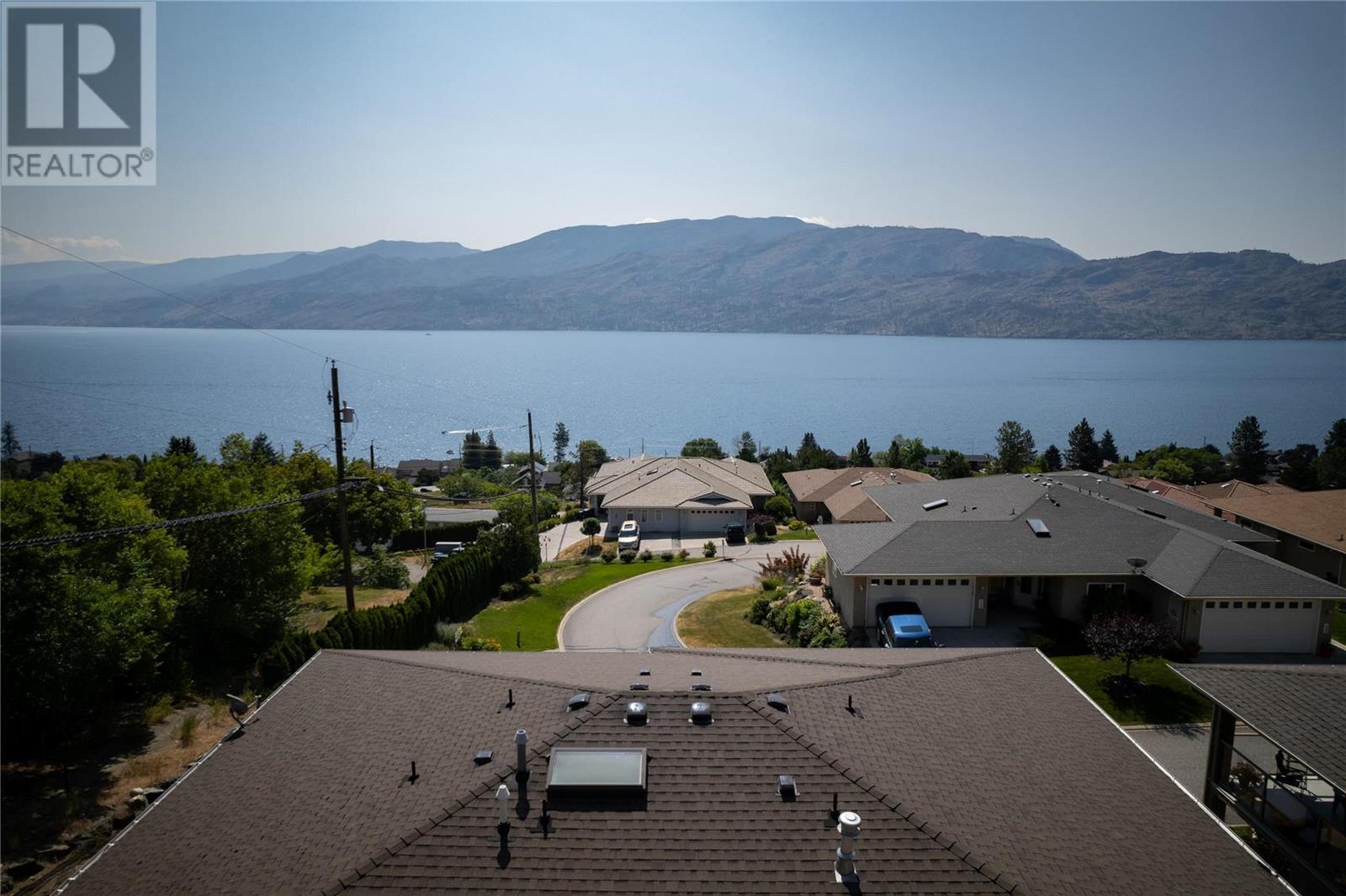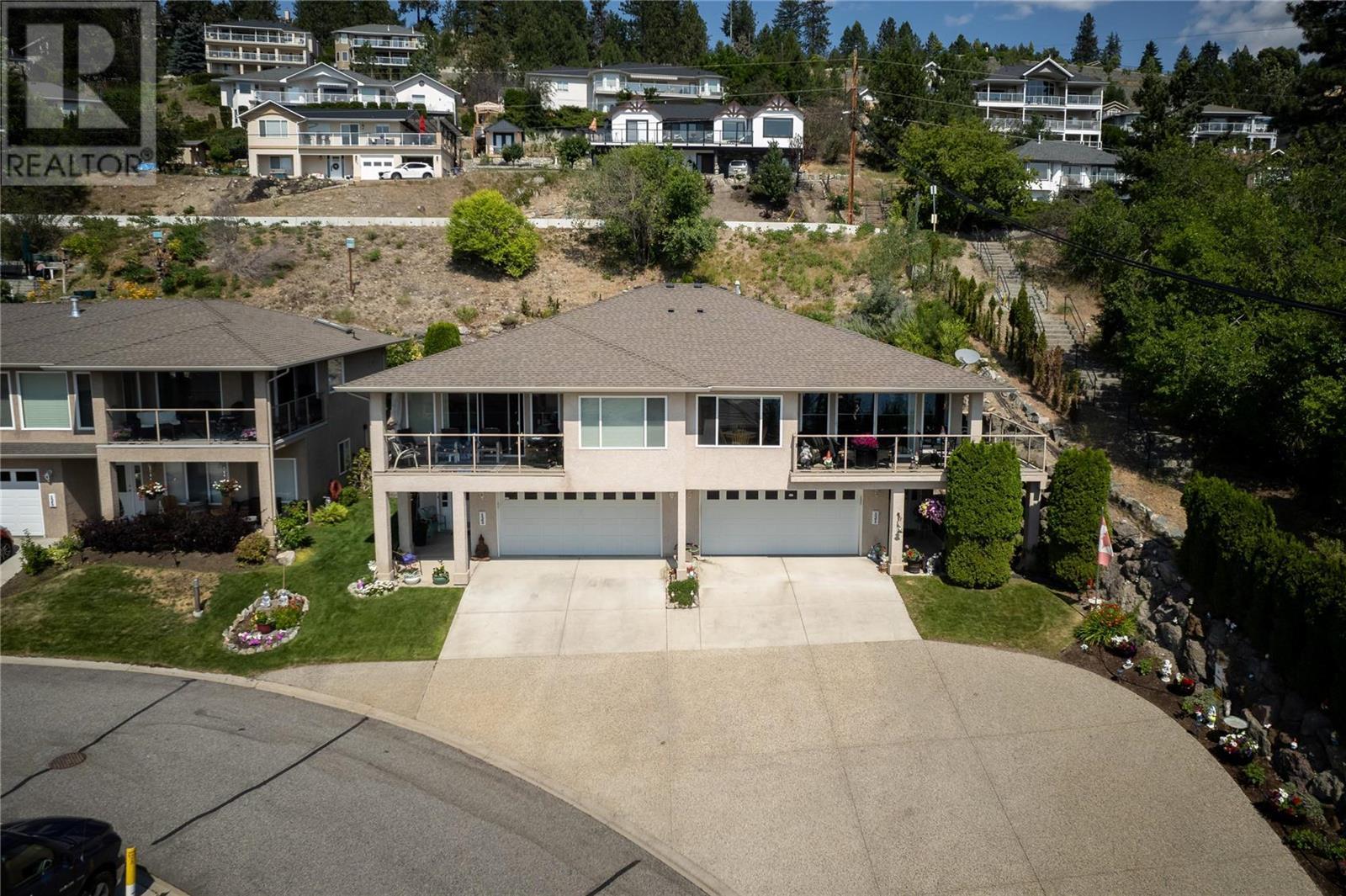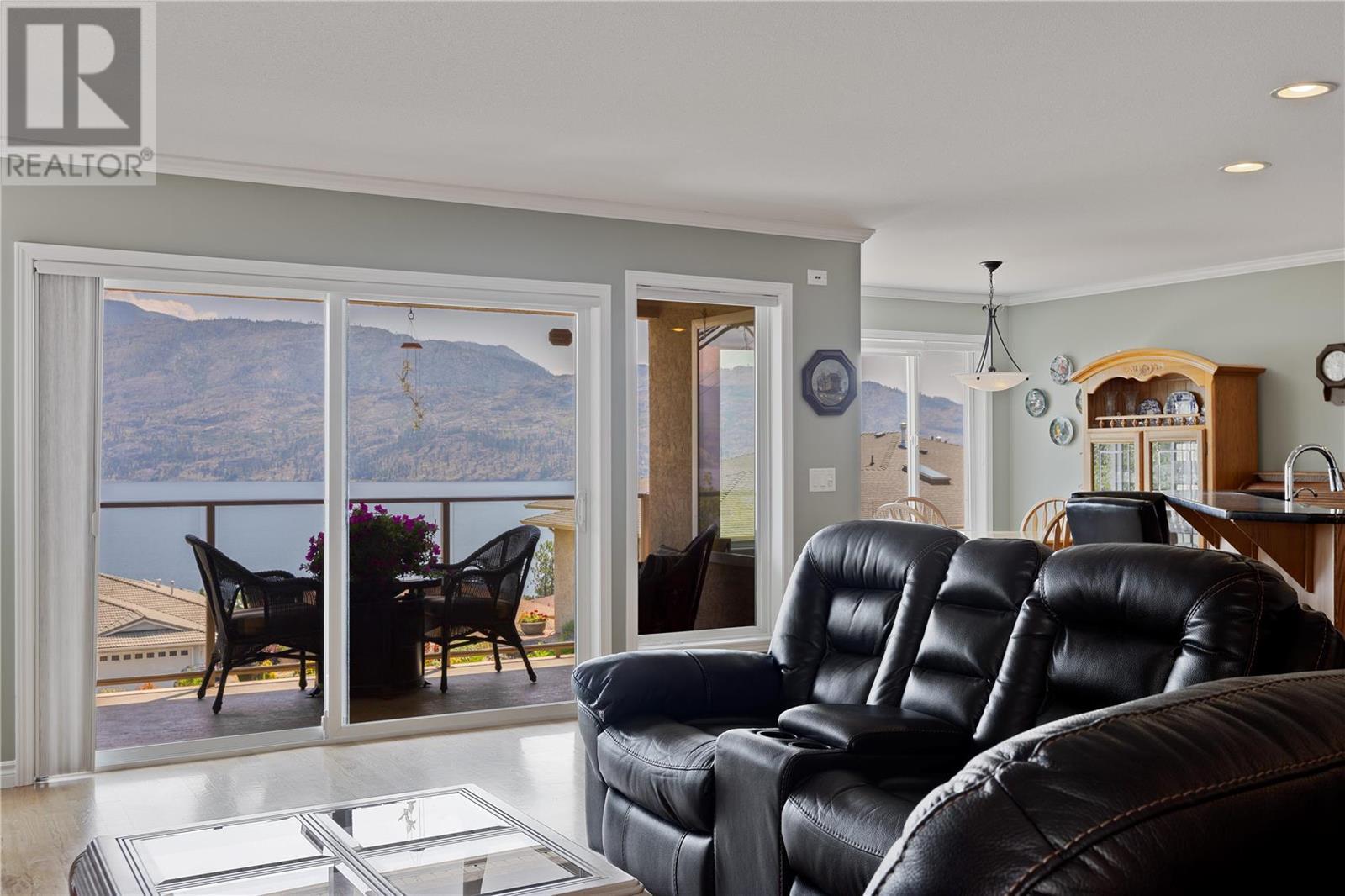 Discover idyllic small-town living with views of the Okanagan Lake and sounding mountains that will leave you breathless. Some mornings the lake is so calm that it looks like glass. Sip a morning coffee on the covered deck savour the peace and quiet. This impeccably maintained townhome is located in The Terraces, a community above the quaint beach town of Peachland. Restaurants, cafes, and shops all line its main street. This home was designed to ensure all the main rooms have a front-row seat to those spectacular views. Wall-to-wall windows let in an abundance of natural light. This spacious two-bedroom plus den, three full bath townhome embraces an open plan living and is ideal for entertaining. The kitchen is well appointed with a huge island for guests to gather around while you prepare the charcuterie board. The living room features a gas fireplace, hardwood floors, and large windows that capture picturesque views of Okanagan Lake and Rattlesnake Island. Sliding glass doors open directly onto the oversized deck. The primary bedroom has an ensuite with a walk-in shower. A private patio in the backyard with a large retractable awning ensures shade on a hot sunny day. The basement has an unfinished storage area along with a den, cold room and full bathroom. A double garage has plenty of room for your vehicles and bikes. Make this remarkable townhome your everyday retreat. (id:22211)