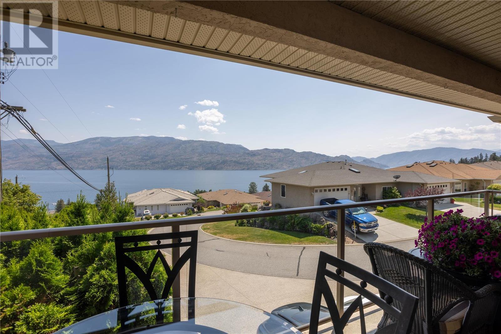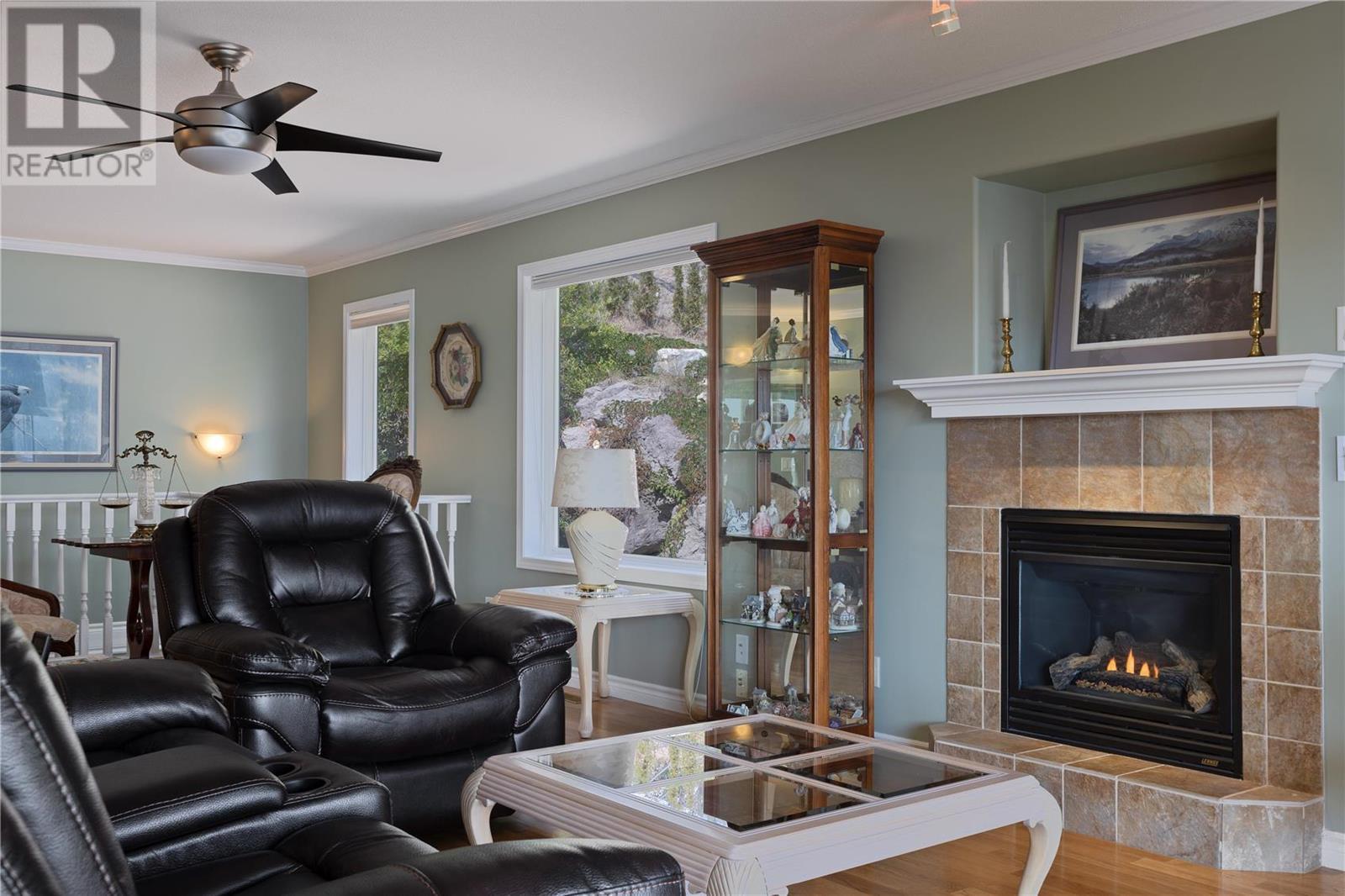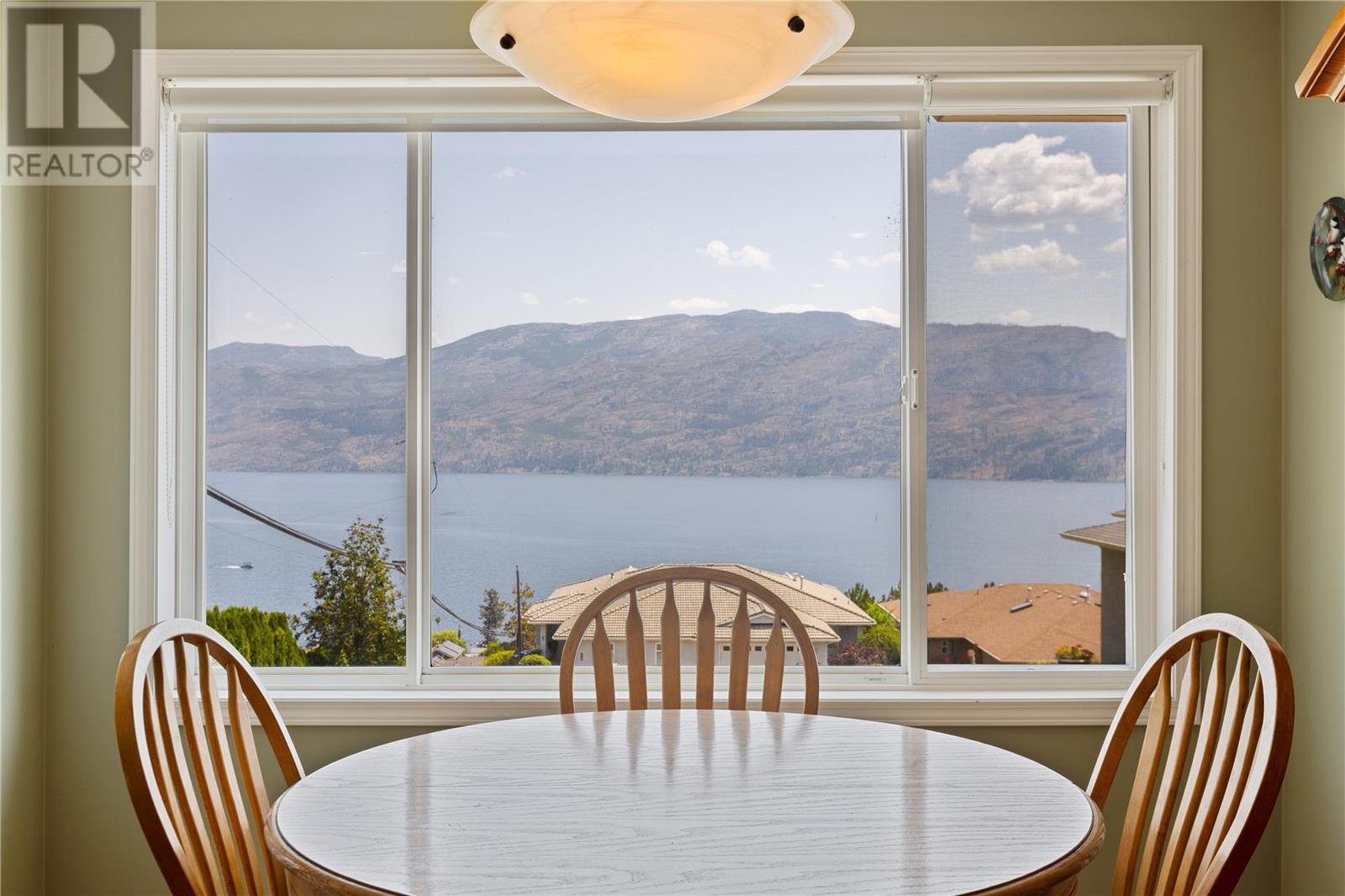 Discover idyllic small-town living with views of the Okanagan Lake and sounding mountains that will leave you breathless. Some mornings the lake is so calm that it looks like glass. Sip a morning coffee on the covered deck savour the peace and quiet. This impeccably maintained townhome is located in The Terraces, a community above the quaint beach town of Peachland. Restaurants, cafes, and shops all line its main street. This home was designed to ensure all the main rooms have a front-row seat to those spectacular views. Wall-to-wall windows let in an abundance of natural light. This spacious two-bedroom plus den, three full bath townhome embraces an open plan living and is ideal for entertaining. The kitchen is well appointed with a huge island for guests to gather around while you prepare the charcuterie board. The living room features a gas fireplace, hardwood floors, and large windows that capture picturesque views of Okanagan Lake and Rattlesnake Island. Sliding glass doors open directly onto the oversized deck. The primary bedroom has an ensuite with a walk-in shower. A private patio in the backyard with a large retractable awning ensures shade on a hot sunny day. The basement has an unfinished storage area along with a den, cold room and full bathroom. A double garage has plenty of room for your vehicles and bikes. Make this remarkable townhome your everyday retreat. (id:22211)