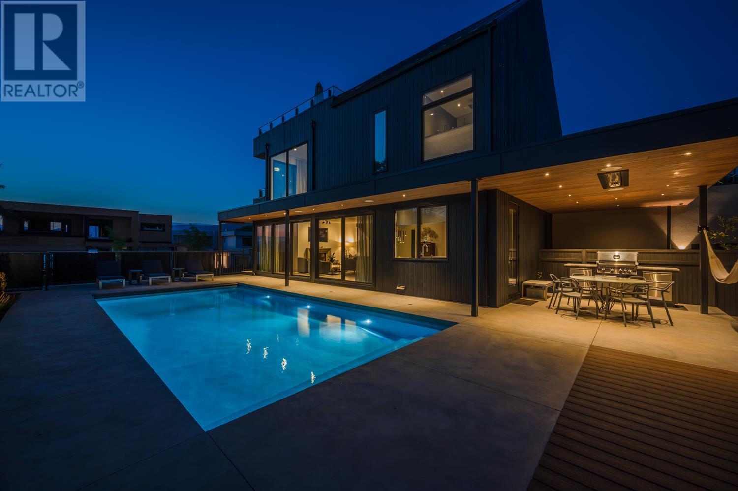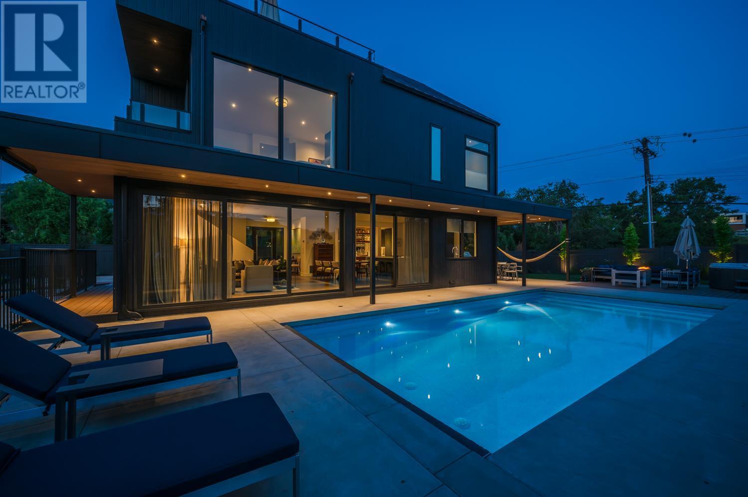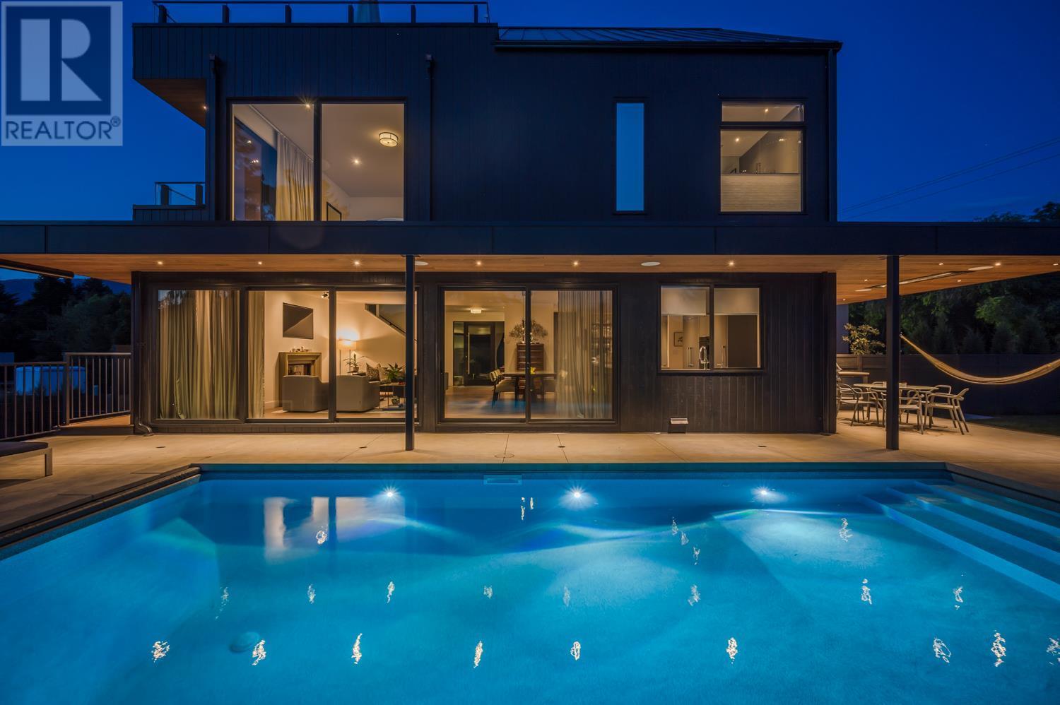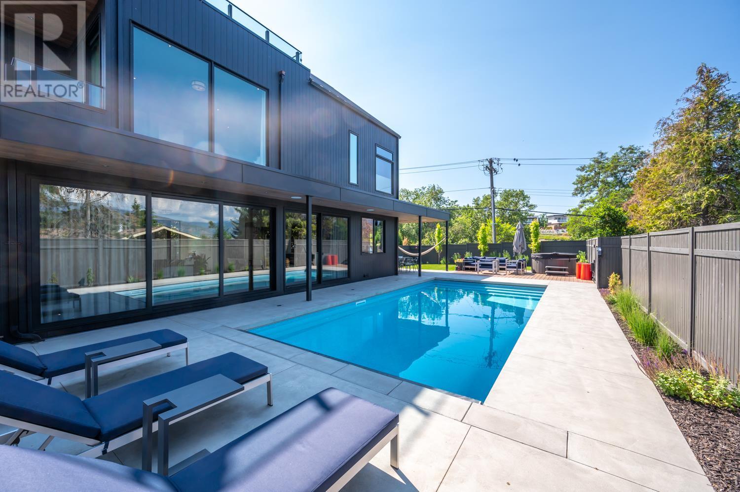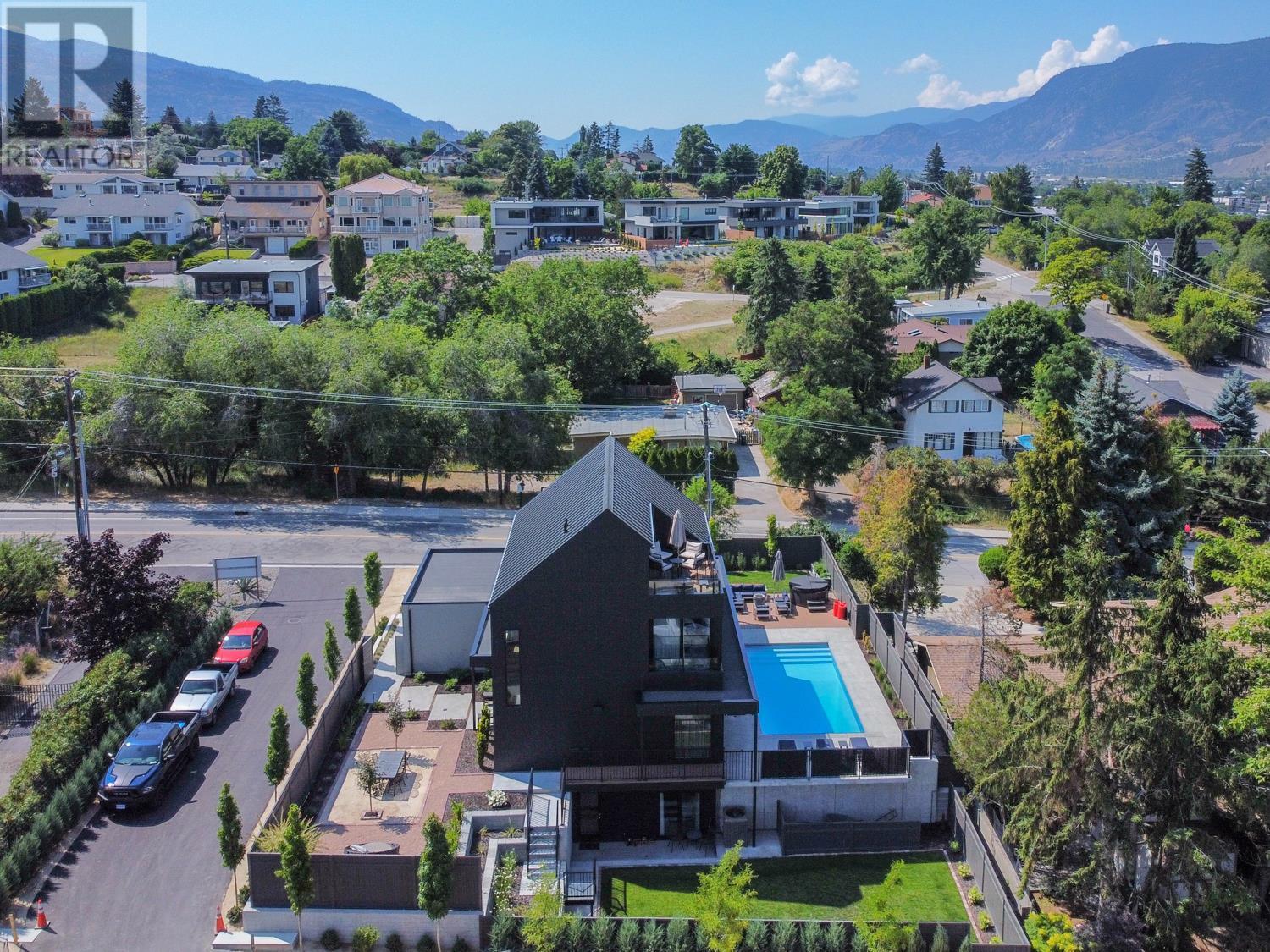 Welcome to a modern one-of-a-kind exquisitely designed residence. Located on Penticton’s Golden Mile, this elegant home is steps from the KVR and minutes from Naramata Bench wineries. A gated entrance welcomes you to a private courtyard that is also perfect for al fresco dining. The stylish and inviting open plan living and dining areas are masterfully complimented by the chef’s kitchen featuring custom cabinetry, integrated Fisher & Paykel appliances, a well-appointed dry bar, and a butler’s pantry with a secondary fridge and dishwasher. Indoor-outdoor living extends into the beautifully landscaped gardens that surround the salt water pool, jacuzzi, lounge, and covered dining and BBQ terrace. The gracious primary suite includes two walk-in closets and ensuite with a luxurious wet room. A home gym and guest suite complete the lower level with direct access to yet another garden. The highlight of this stunning home is the rooftop deck with unparalleled views of the lake and city. (id:22211)