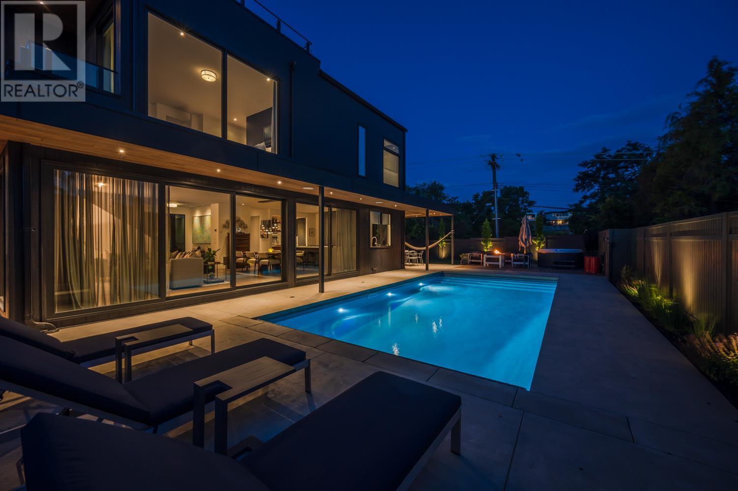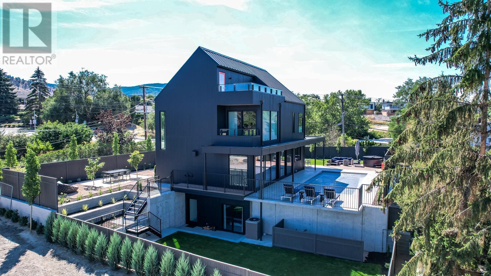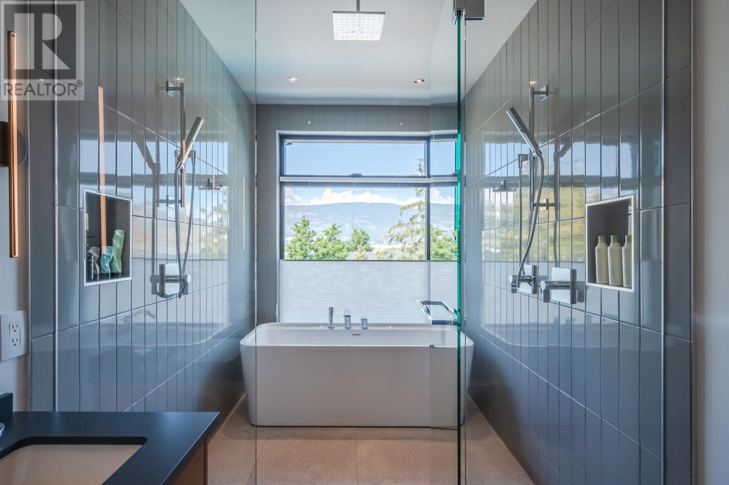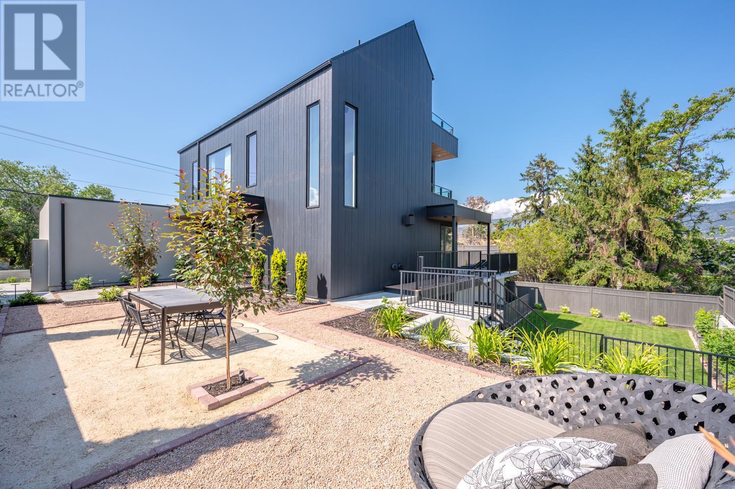 Welcome to a modern one-of-a-kind exquisitely designed residence. Located on Penticton’s Golden Mile, this elegant home is steps from the KVR and minutes from Naramata Bench wineries. A gated entrance welcomes you to a private courtyard that is also perfect for al fresco dining. The stylish and inviting open plan living and dining areas are masterfully complimented by the chef’s kitchen featuring custom cabinetry, integrated Fisher & Paykel appliances, a well-appointed dry bar, and a butler’s pantry with a secondary fridge and dishwasher. Indoor-outdoor living extends into the beautifully landscaped gardens that surround the salt water pool, jacuzzi, lounge, and covered dining and BBQ terrace. The gracious primary suite includes two walk-in closets and ensuite with a luxurious wet room. A home gym and guest suite complete the lower level with direct access to yet another garden. The highlight of this stunning home is the rooftop deck with unparalleled views of the lake and city. (id:22211)