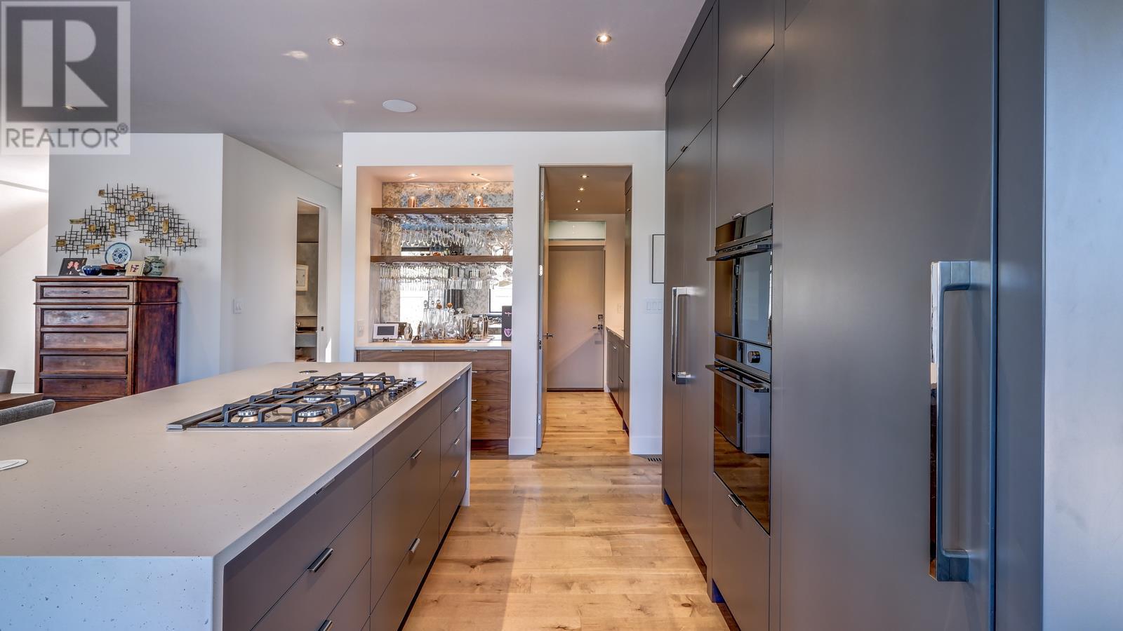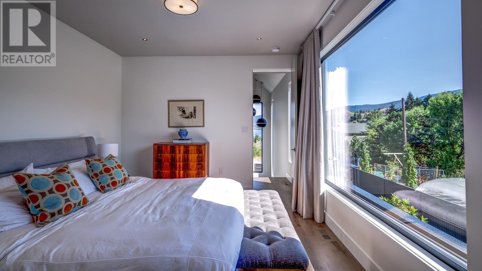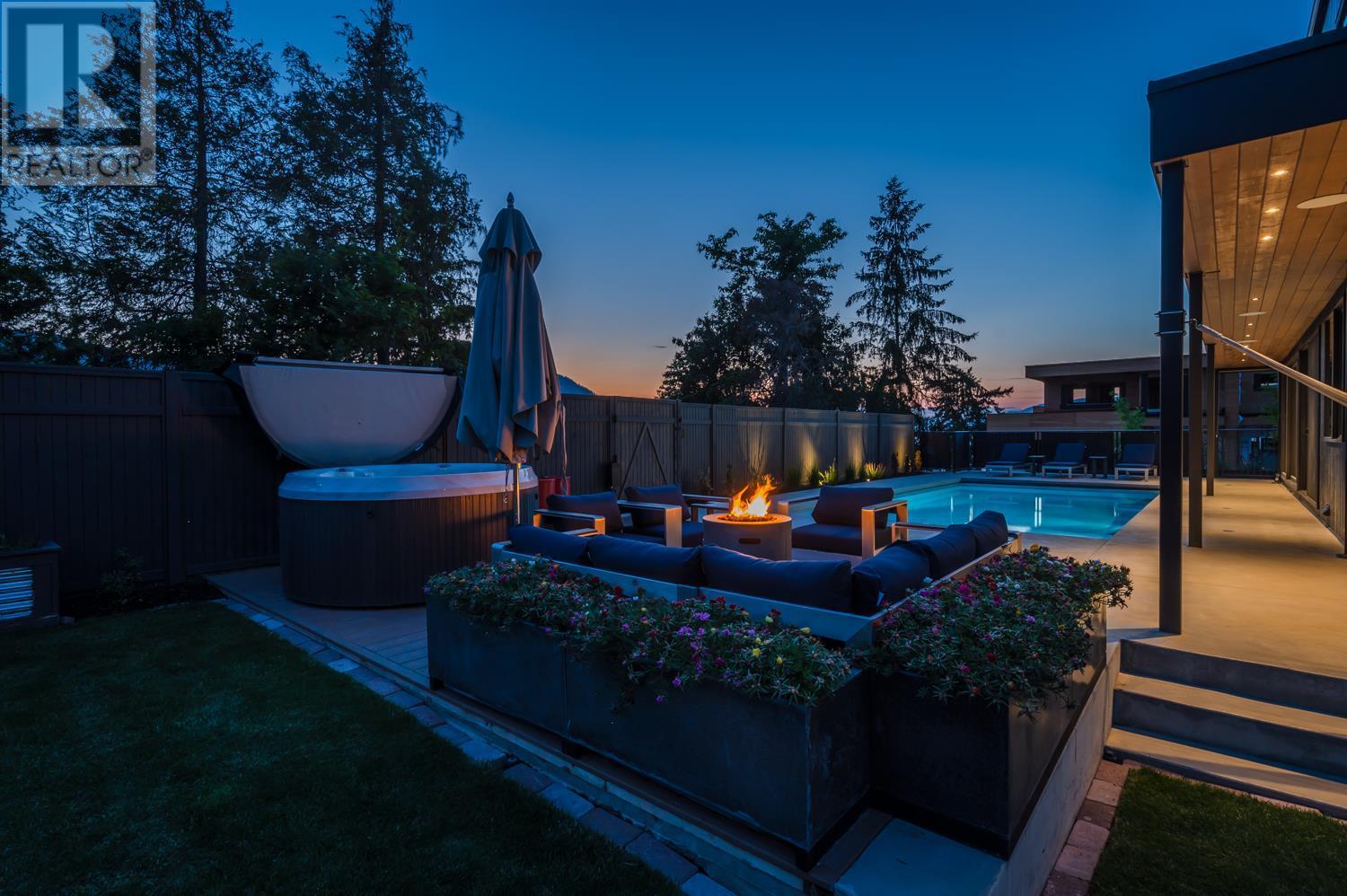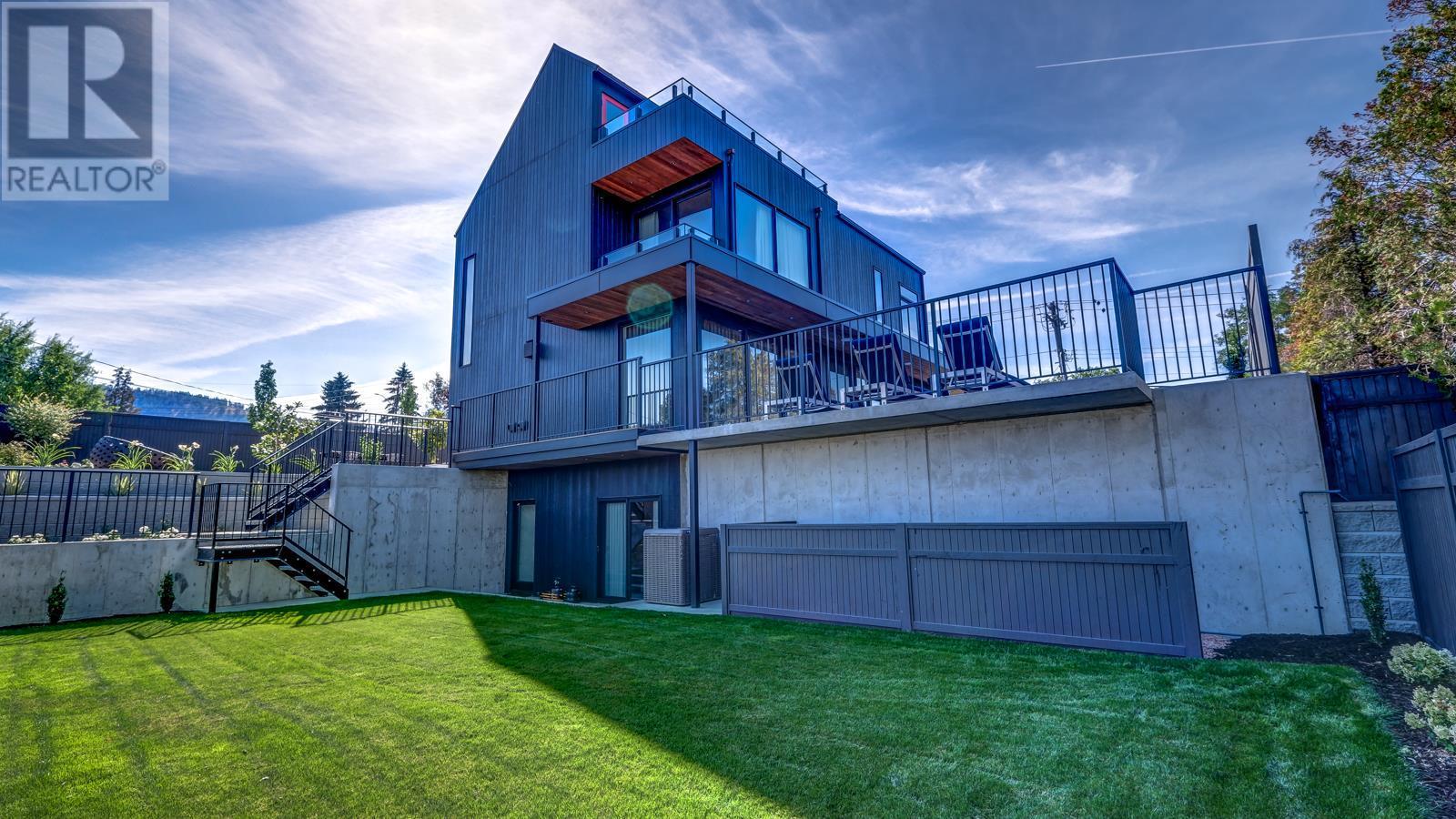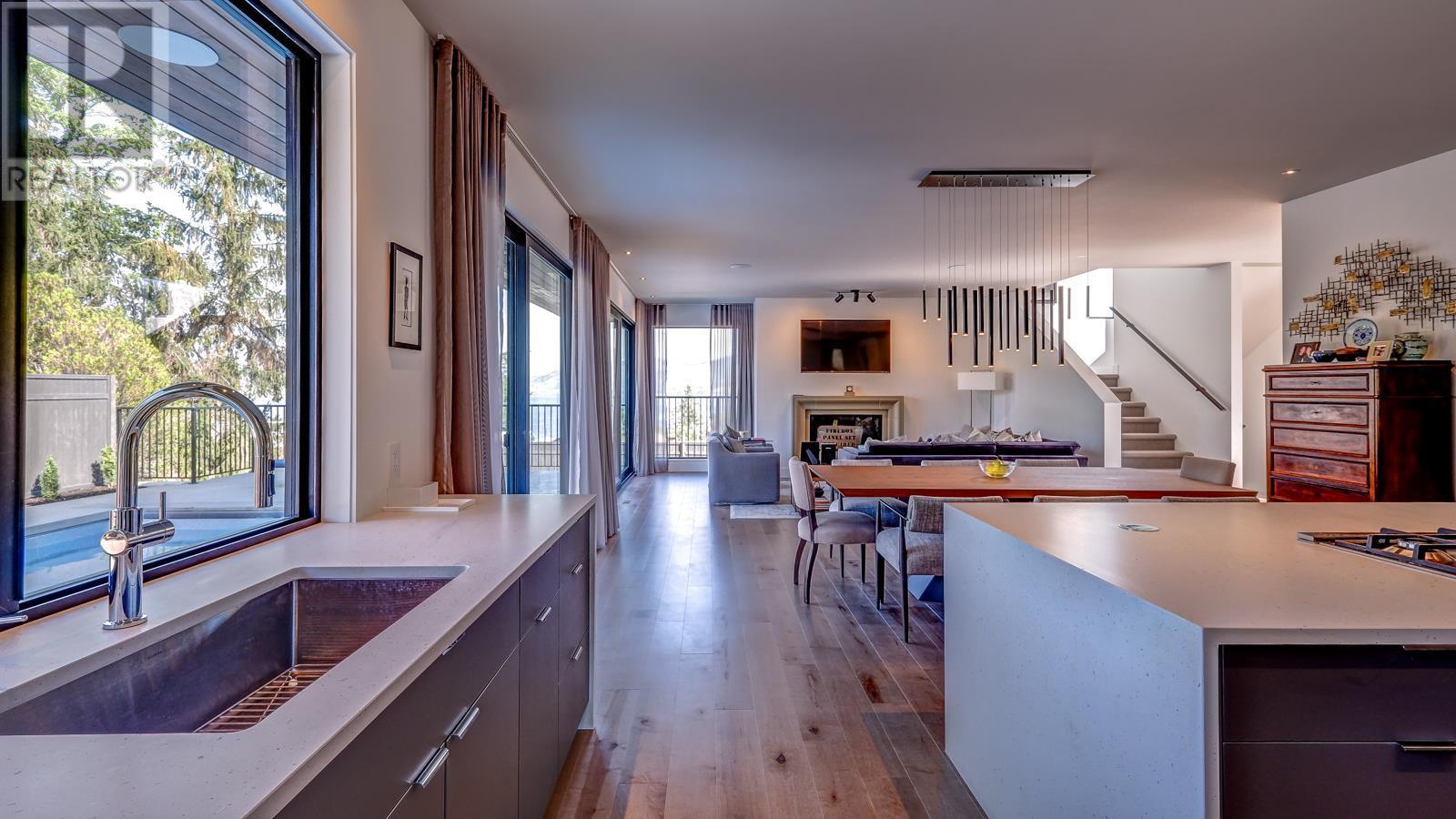Welcome to a modern one-of-a-kind exquisitely designed residence. Located on Penticton’s Golden Mile, this elegant home is steps from the KVR and minutes from Naramata Bench wineries. A gated entrance welcomes you to a private courtyard that is also perfect for al fresco dining. The stylish and inviting open plan living and dining areas are masterfully complimented by the chef’s kitchen featuring custom cabinetry, integrated Fisher & Paykel appliances, a well-appointed dry bar, and a butler’s pantry with a secondary fridge and dishwasher. Indoor-outdoor living extends into the beautifully landscaped gardens that surround the salt water pool, jacuzzi, lounge, and covered dining and BBQ terrace. The gracious primary suite includes two walk-in closets and ensuite with a luxurious wet room. A home gym and guest suite complete the lower level with direct access to yet another garden. The highlight of this stunning home is the rooftop deck with unparalleled views of the lake and city. (id:22211)