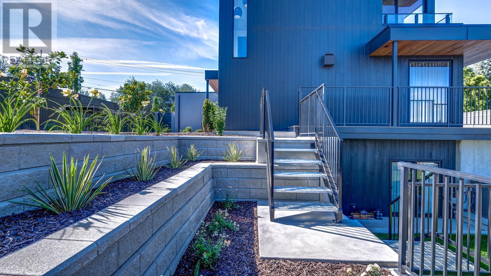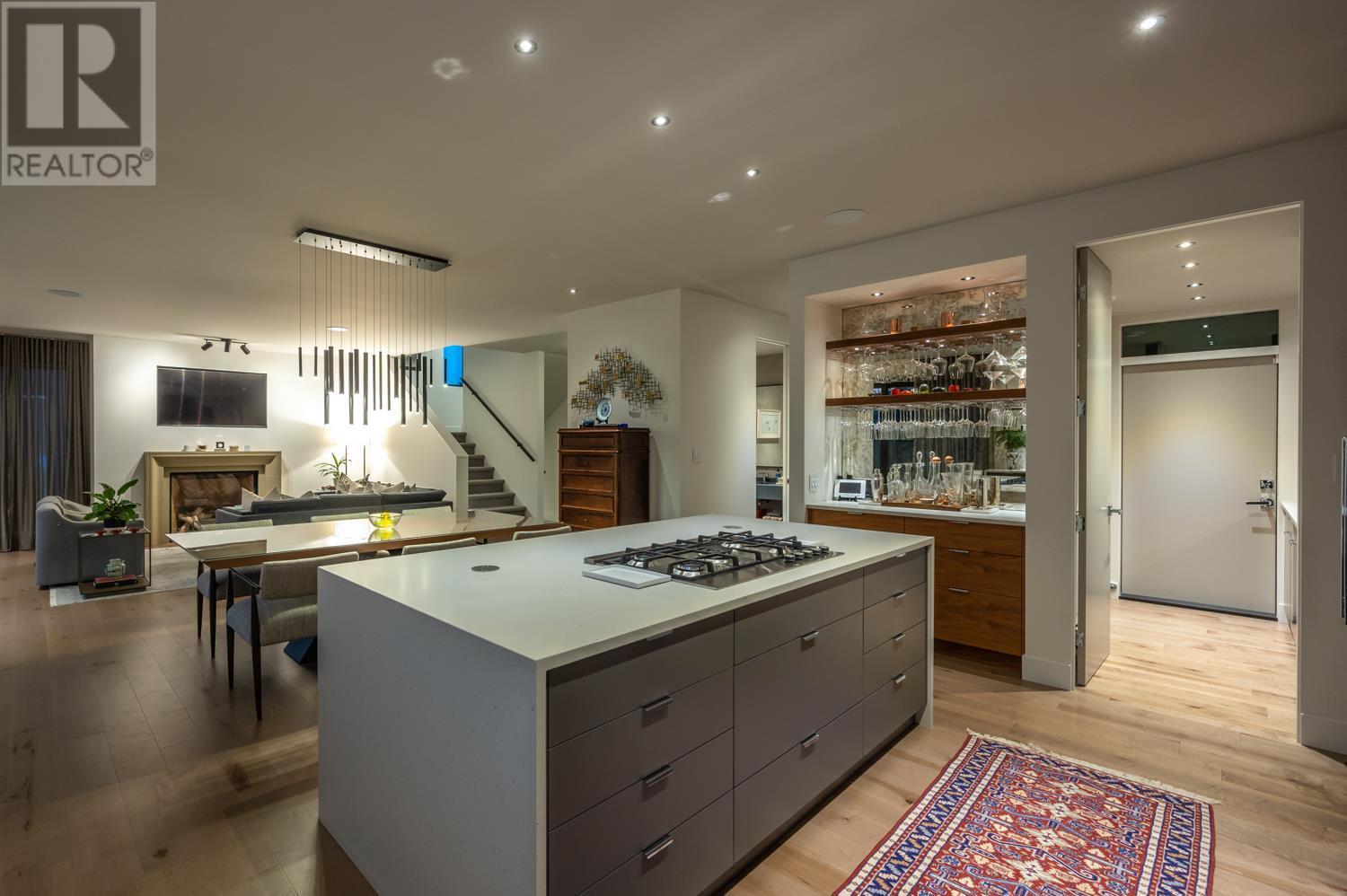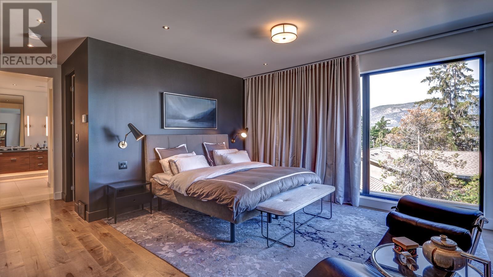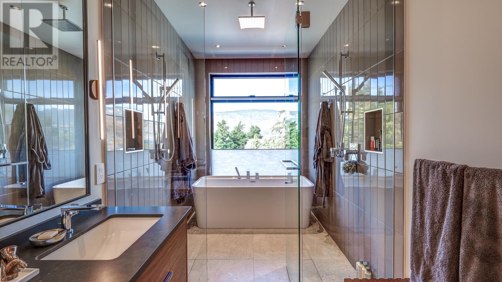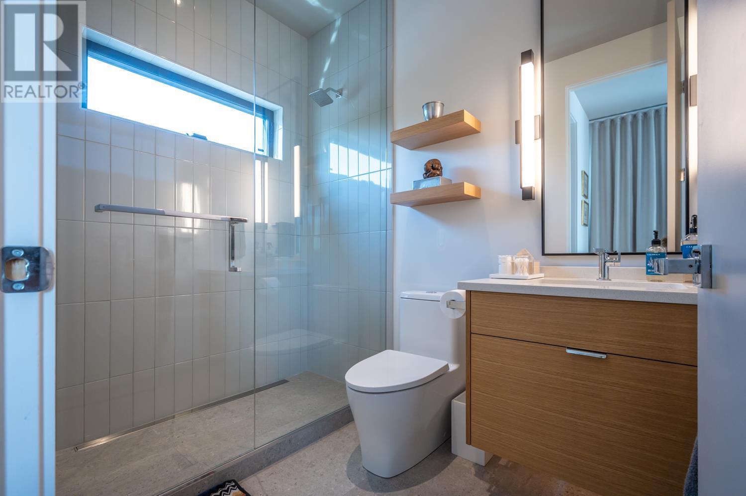 Welcome to a modern one-of-a-kind exquisitely designed residence. Located on Penticton’s Golden Mile, this elegant home is steps from the KVR and minutes from Naramata Bench wineries. A gated entrance welcomes you to a private courtyard that is also perfect for al fresco dining. The stylish and inviting open plan living and dining areas are masterfully complimented by the chef’s kitchen featuring custom cabinetry, integrated Fisher & Paykel appliances, a well-appointed dry bar, and a butler’s pantry with a secondary fridge and dishwasher. Indoor-outdoor living extends into the beautifully landscaped gardens that surround the salt water pool, jacuzzi, lounge, and covered dining and BBQ terrace. The gracious primary suite includes two walk-in closets and ensuite with a luxurious wet room. A home gym and guest suite complete the lower level with direct access to yet another garden. The highlight of this stunning home is the rooftop deck with unparalleled views of the lake and city. (id:22211)