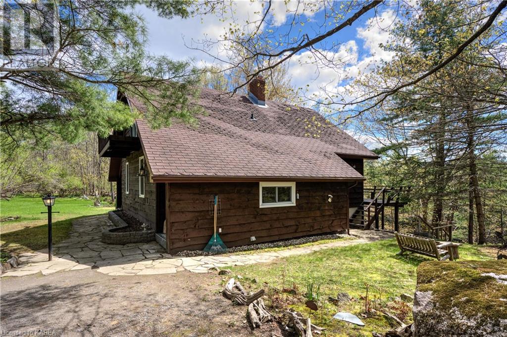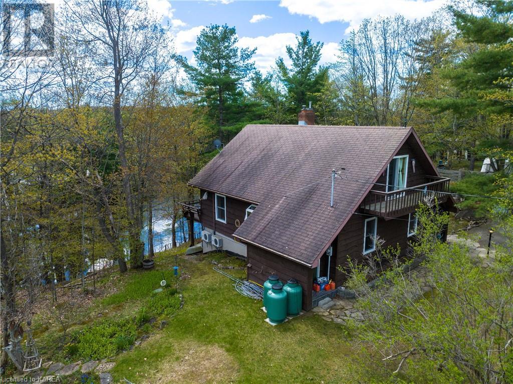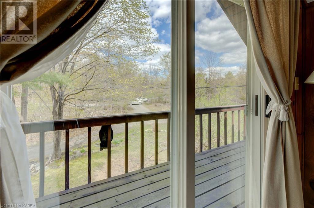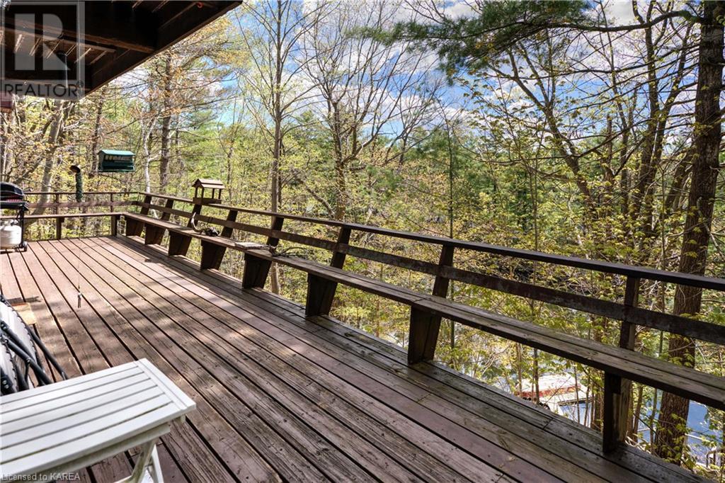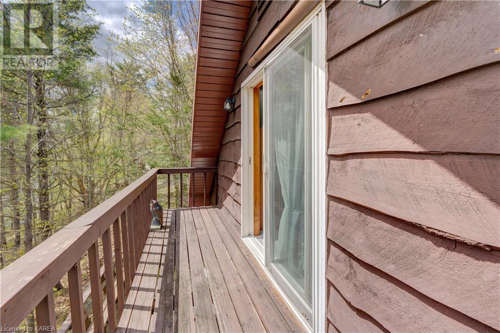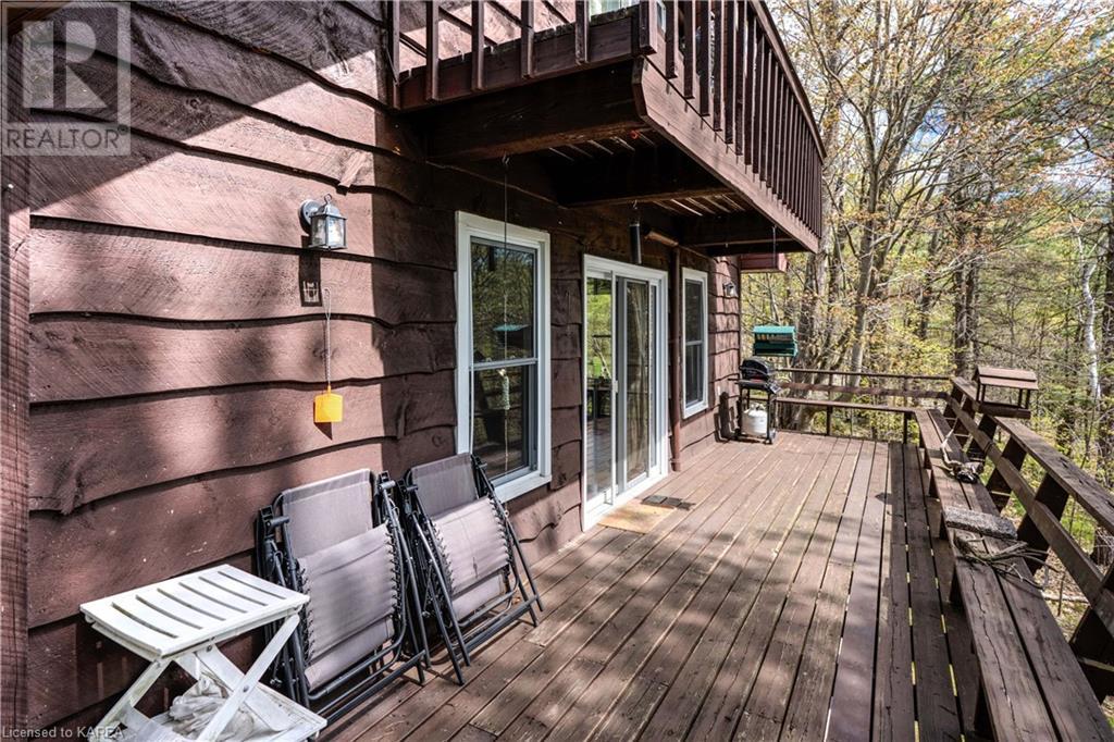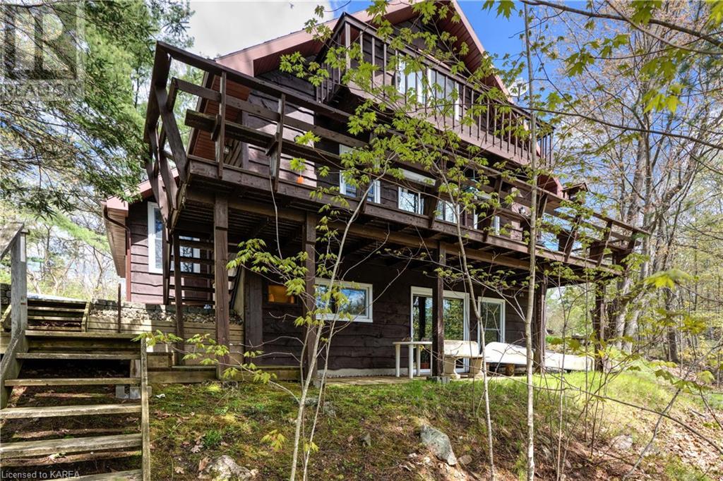Waterfront home with acreage and privacy on Devil Lake! This property is located in Jones Bay – a quiet section of Devil Lake that is on the east side of Perth Road. Access to the main part of the lake is via the culvert that goes under Perth Road. The property includes 4.5 acres of land with a mixture of trees, rocks and a great yard with perennials. The home is a chalet-style home with 3 bedrooms on the upper floor and a bedroom in the basement. There is a main floor office that could also be used as a small bedroom. There is a main floor 2-pc bathroom, a full bathroom on the upper level as well as a shower in the basement. The main level has a family room with a propane fireplace and a patio door that leads to the deck. Each of the bedrooms on the upper level has their own private balcony to enjoy mornings or evenings outside with the sounds and sites of nature. The full, walkout basement has a recreation room with a propane wood stove, laundry facilities, a bedroom, large cold cellar plus plenty of storage space. There is a patio outside on this level and stairs that lead to the waterfront. The bay is shallow and not ideal for swimming but great for nature lovers, fishermen, etc. Located just 35 minutes north of Kingston or 10 minutes south of Westport. (id:22211)