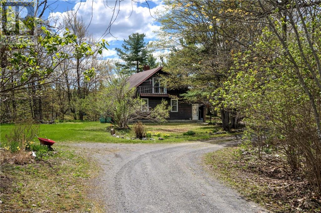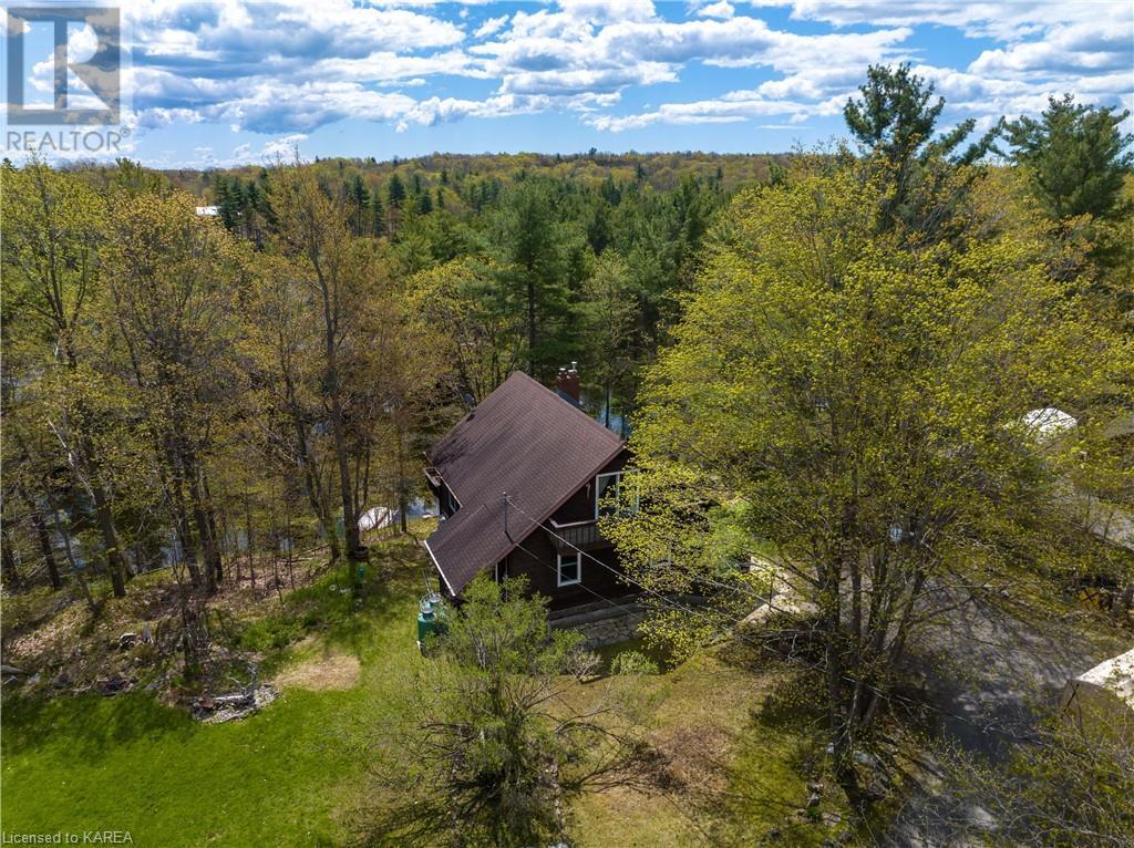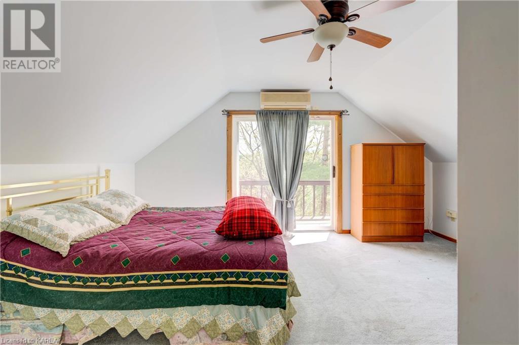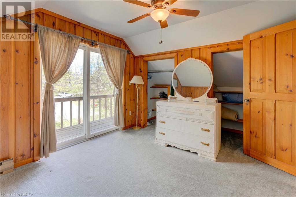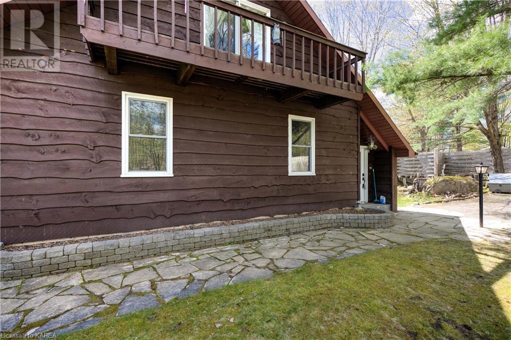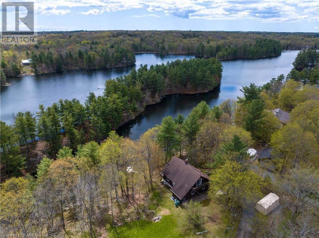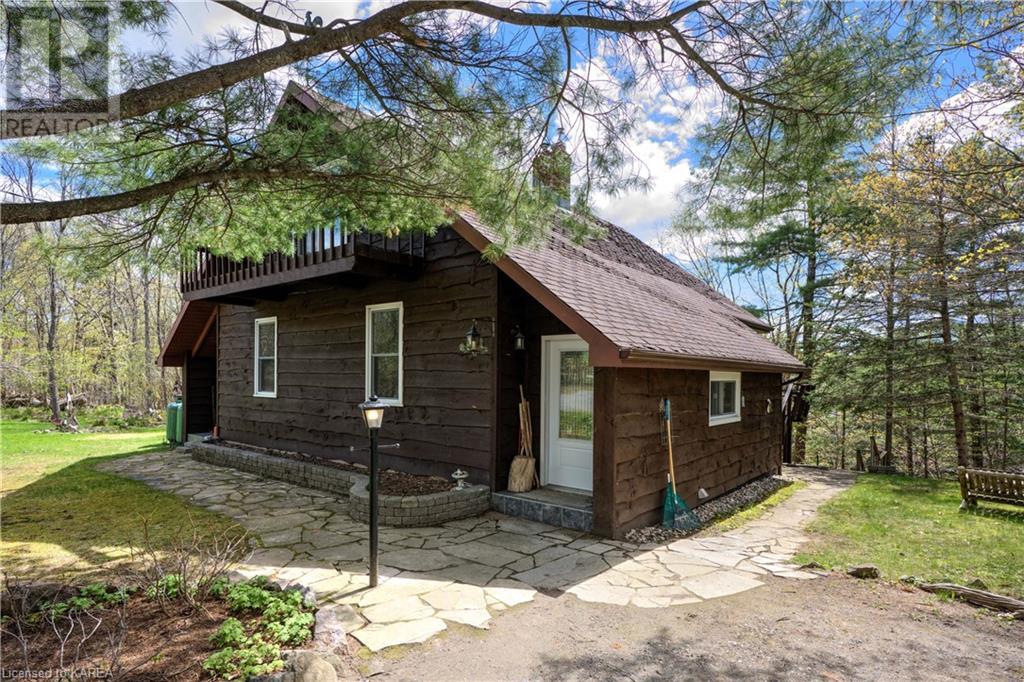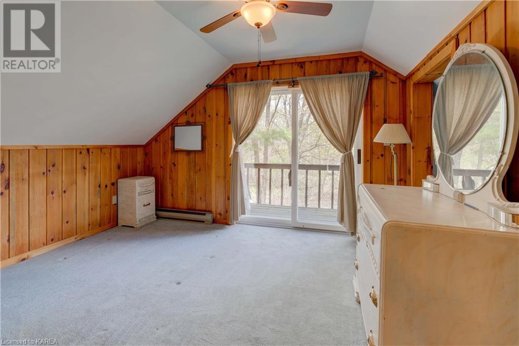 Waterfront home with acreage and privacy on Devil Lake! This property is located in Jones Bay – a quiet section of Devil Lake that is on the east side of Perth Road. Access to the main part of the lake is via the culvert that goes under Perth Road. The property includes 4.5 acres of land with a mixture of trees, rocks and a great yard with perennials. The home is a chalet-style home with 3 bedrooms on the upper floor and a bedroom in the basement. There is a main floor office that could also be used as a small bedroom. There is a main floor 2-pc bathroom, a full bathroom on the upper level as well as a shower in the basement. The main level has a family room with a propane fireplace and a patio door that leads to the deck. Each of the bedrooms on the upper level has their own private balcony to enjoy mornings or evenings outside with the sounds and sites of nature. The full, walkout basement has a recreation room with a propane wood stove, laundry facilities, a bedroom, large cold cellar plus plenty of storage space. There is a patio outside on this level and stairs that lead to the waterfront. The bay is shallow and not ideal for swimming but great for nature lovers, fishermen, etc. Located just 35 minutes north of Kingston or 10 minutes south of Westport. (id:22211)