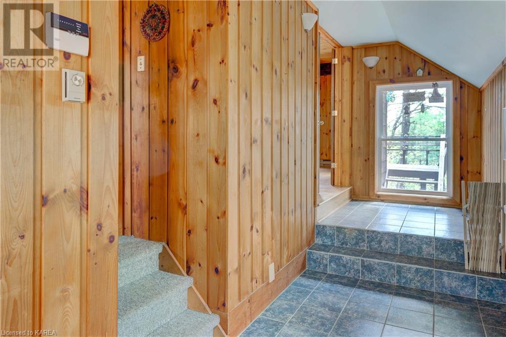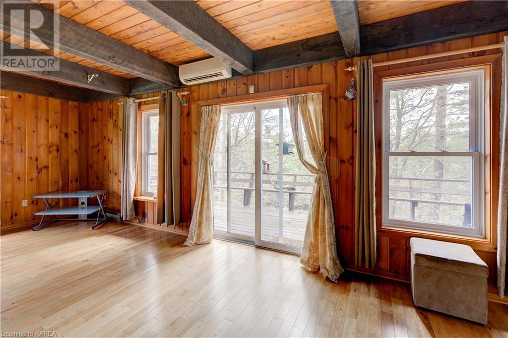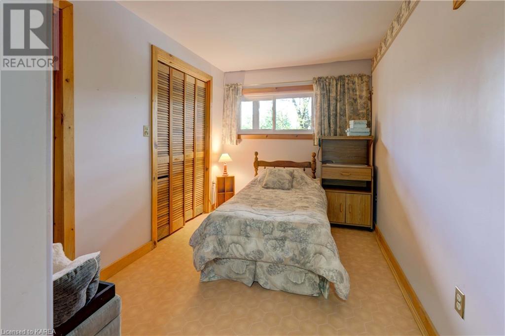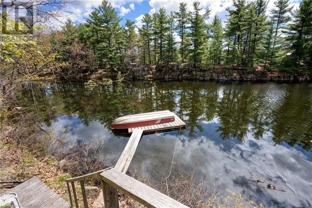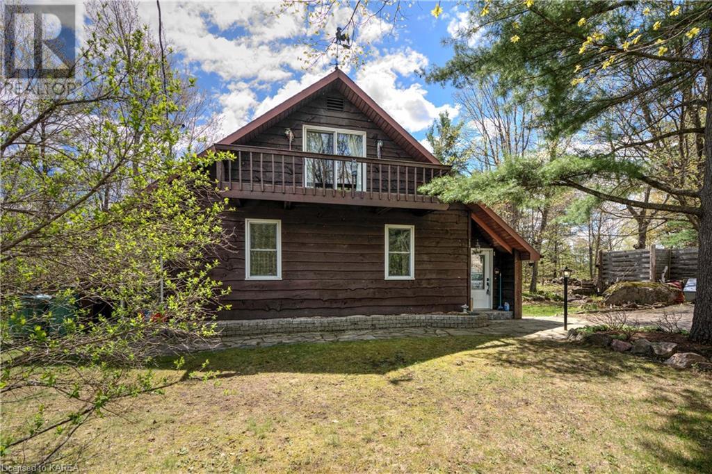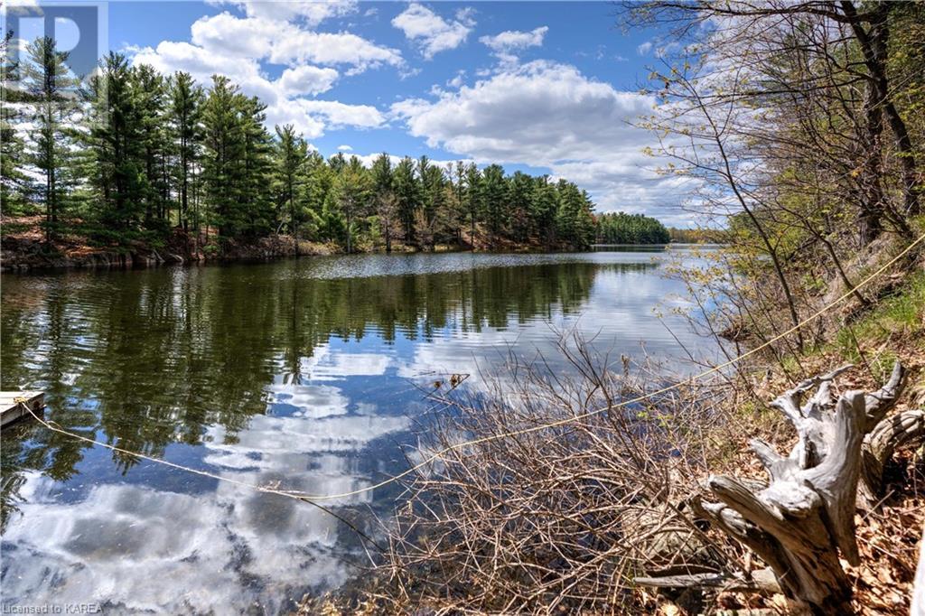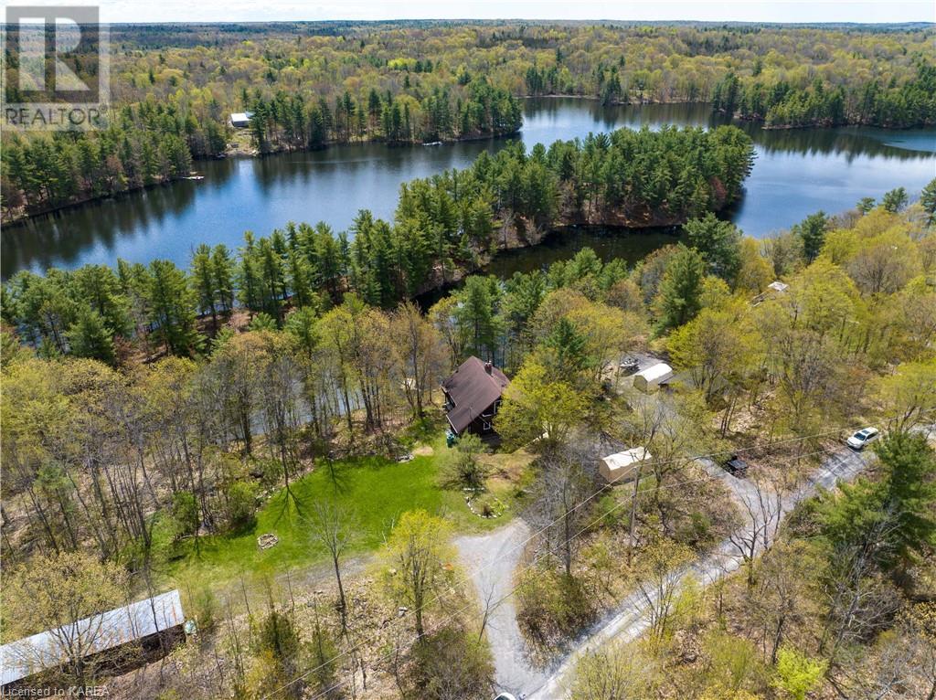Waterfront home with acreage and privacy on Devil Lake! This property is located in Jones Bay – a quiet section of Devil Lake that is on the east side of Perth Road. Access to the main part of the lake is via the culvert that goes under Perth Road. The property includes 4.5 acres of land with a mixture of trees, rocks and a great yard with perennials. The home is a chalet-style home with 3 bedrooms on the upper floor and a bedroom in the basement. There is a main floor office that could also be used as a small bedroom. There is a main floor 2-pc bathroom, a full bathroom on the upper level as well as a shower in the basement. The main level has a family room with a propane fireplace and a patio door that leads to the deck. Each of the bedrooms on the upper level has their own private balcony to enjoy mornings or evenings outside with the sounds and sites of nature. The full, walkout basement has a recreation room with a propane wood stove, laundry facilities, a bedroom, large cold cellar plus plenty of storage space. There is a patio outside on this level and stairs that lead to the waterfront. The bay is shallow and not ideal for swimming but great for nature lovers, fishermen, etc. Located just 35 minutes north of Kingston or 10 minutes south of Westport. (id:22211)