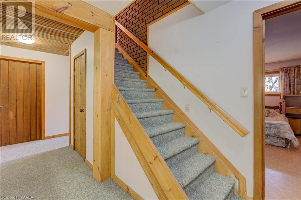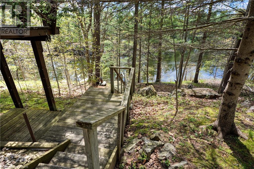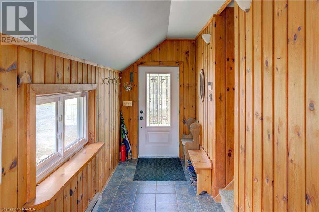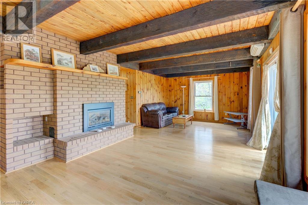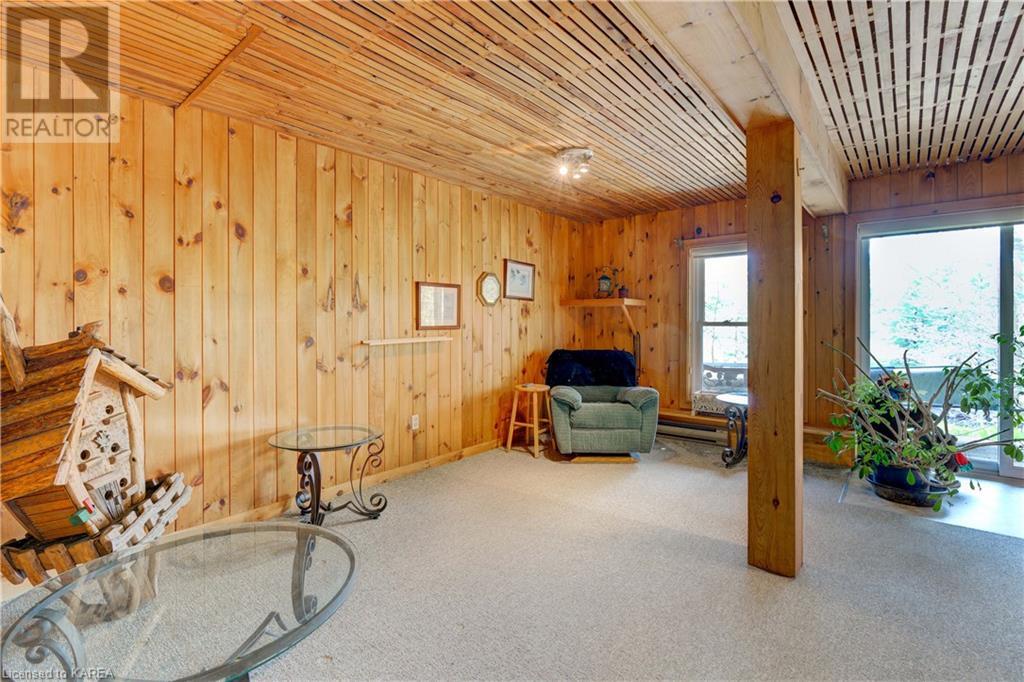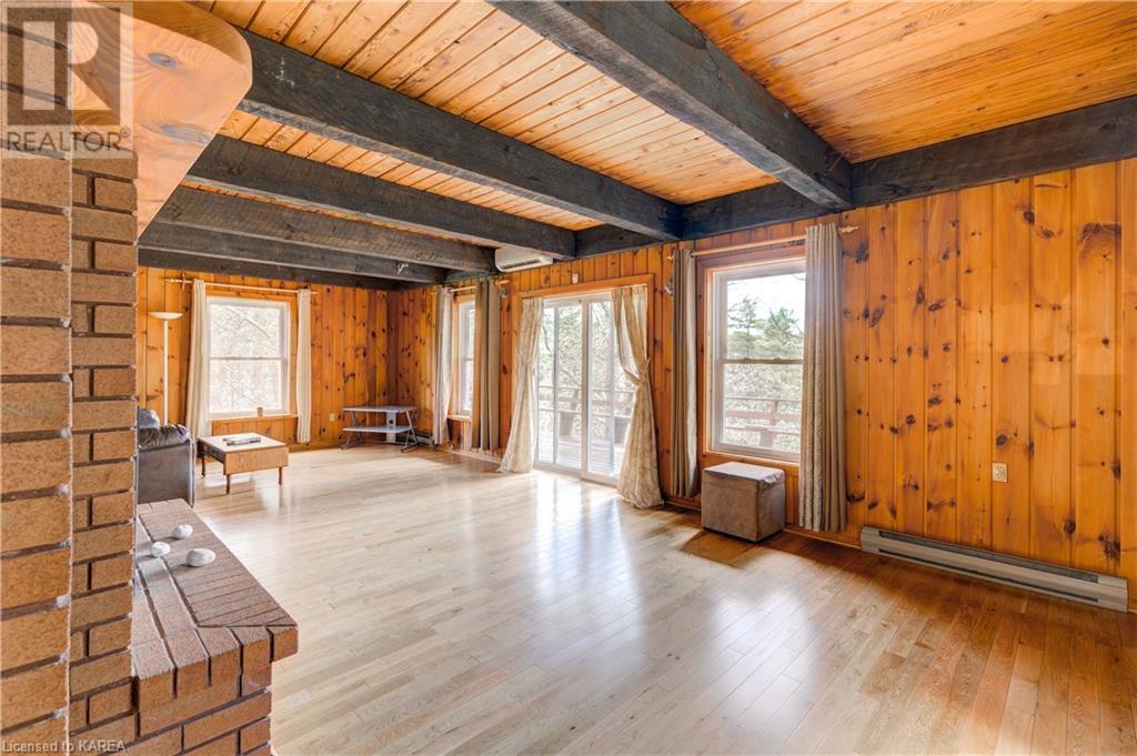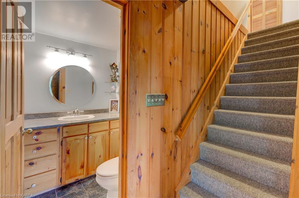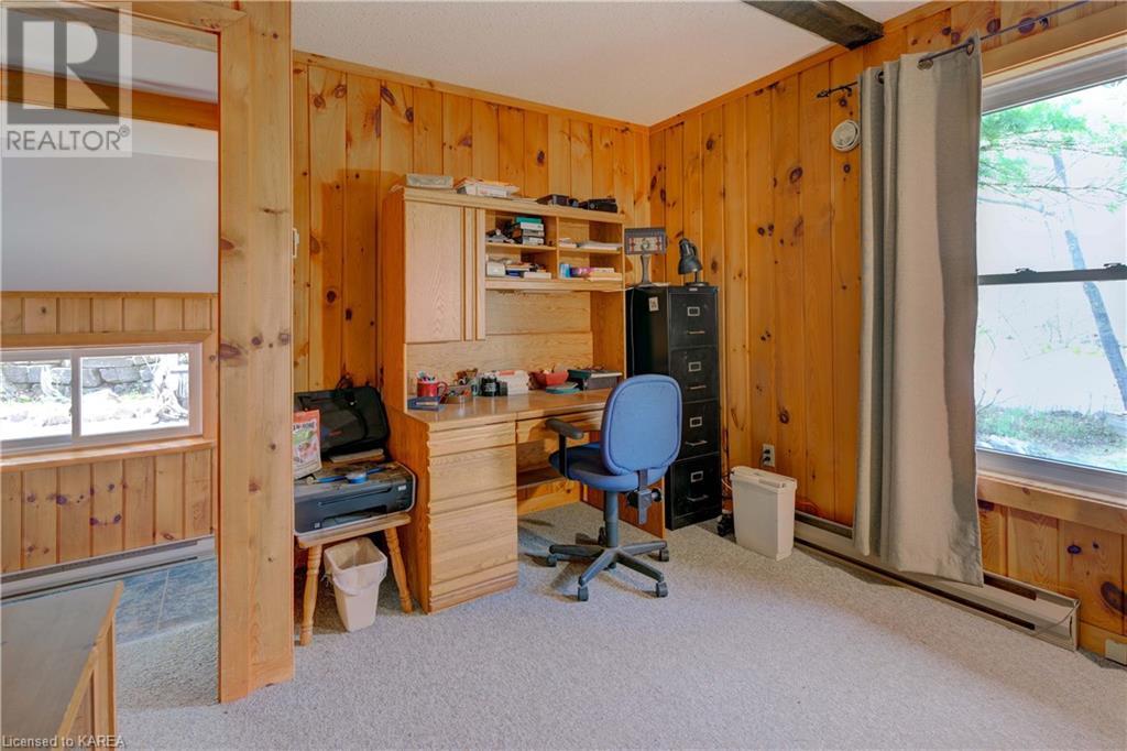 Waterfront home with acreage and privacy on Devil Lake! This property is located in Jones Bay – a quiet section of Devil Lake that is on the east side of Perth Road. Access to the main part of the lake is via the culvert that goes under Perth Road. The property includes 4.5 acres of land with a mixture of trees, rocks and a great yard with perennials. The home is a chalet-style home with 3 bedrooms on the upper floor and a bedroom in the basement. There is a main floor office that could also be used as a small bedroom. There is a main floor 2-pc bathroom, a full bathroom on the upper level as well as a shower in the basement. The main level has a family room with a propane fireplace and a patio door that leads to the deck. Each of the bedrooms on the upper level has their own private balcony to enjoy mornings or evenings outside with the sounds and sites of nature. The full, walkout basement has a recreation room with a propane wood stove, laundry facilities, a bedroom, large cold cellar plus plenty of storage space. There is a patio outside on this level and stairs that lead to the waterfront. The bay is shallow and not ideal for swimming but great for nature lovers, fishermen, etc. Located just 35 minutes north of Kingston or 10 minutes south of Westport. (id:22211)