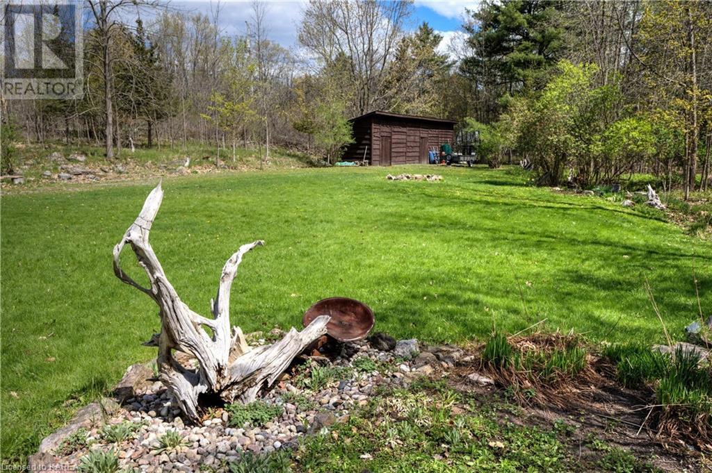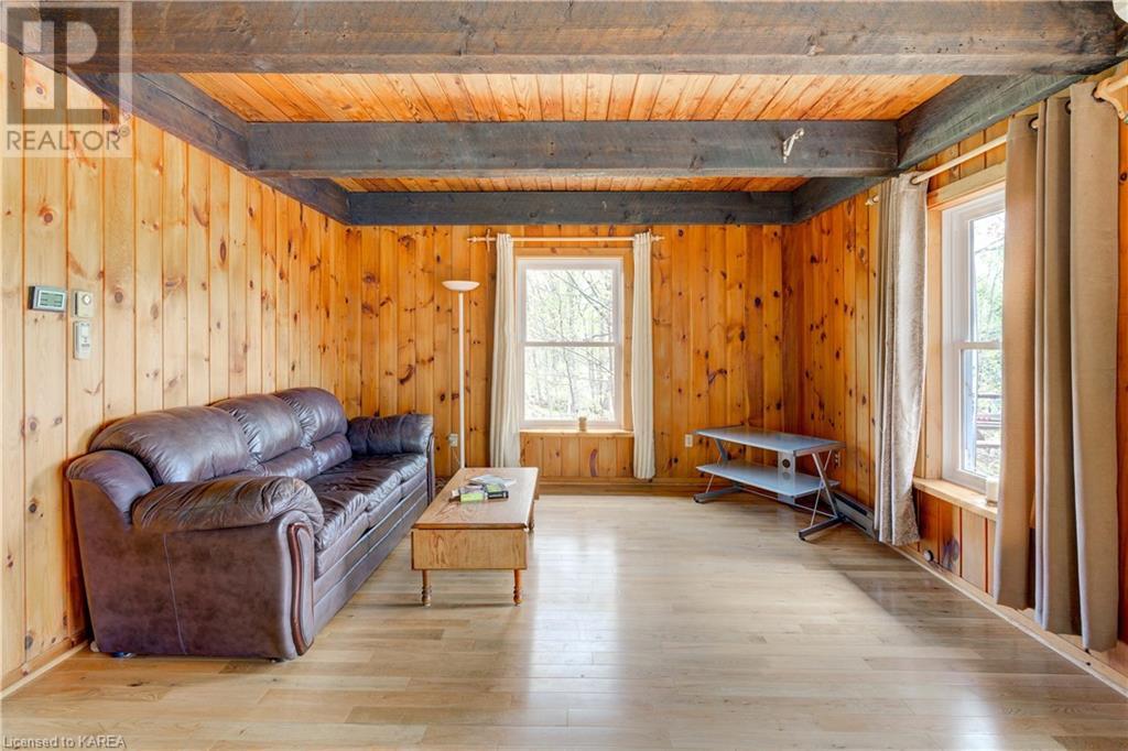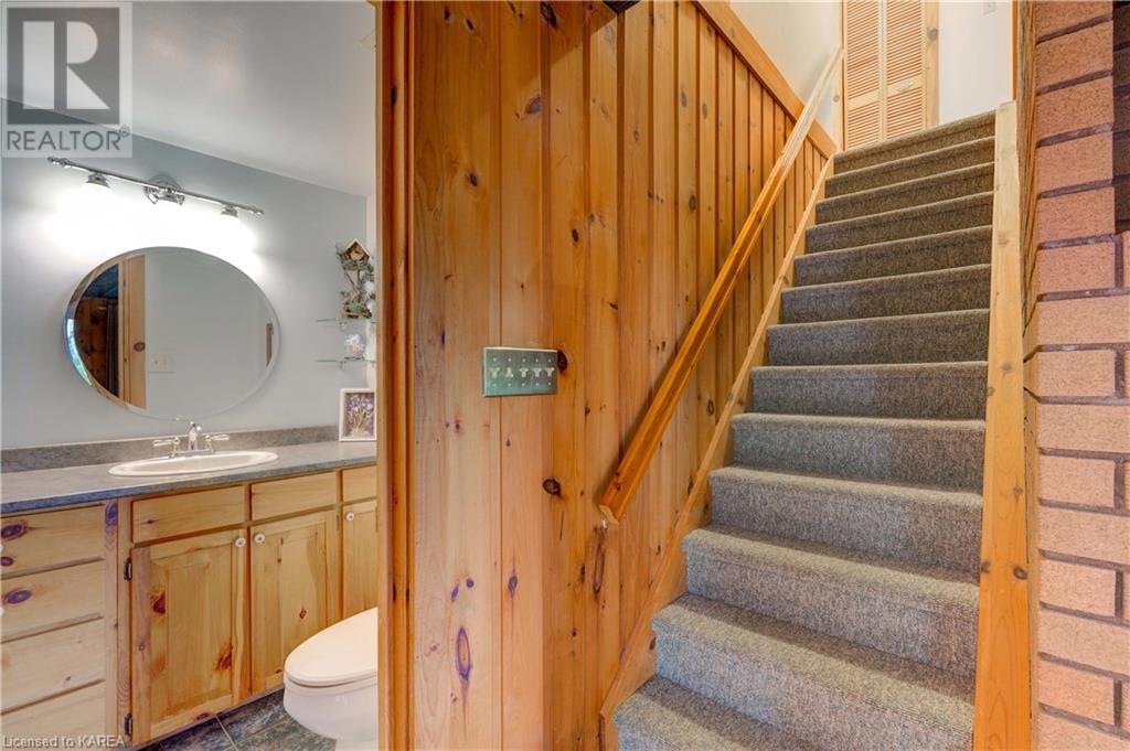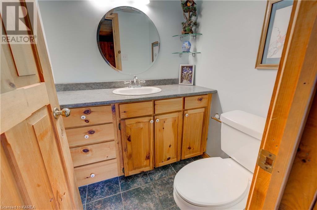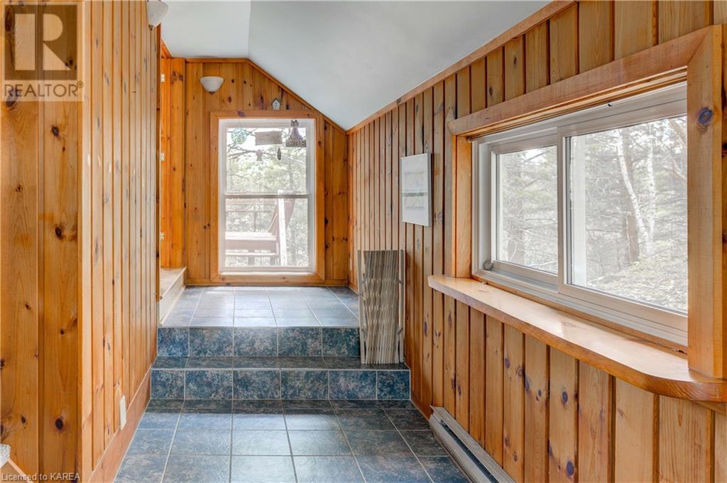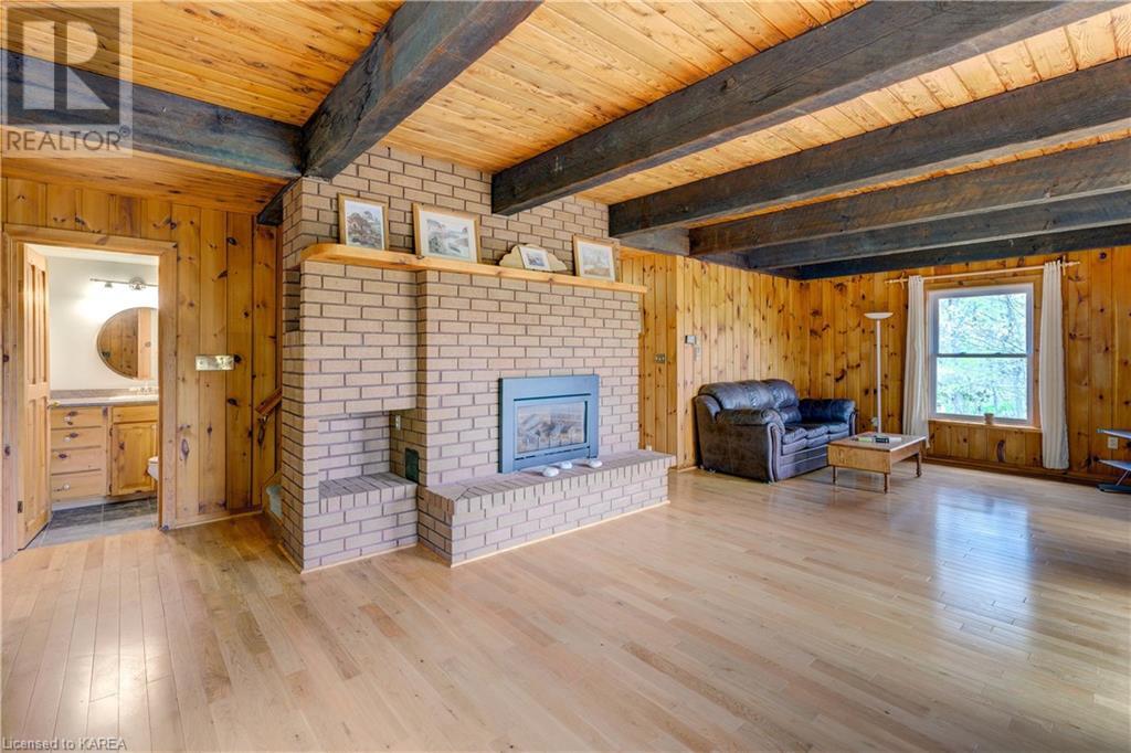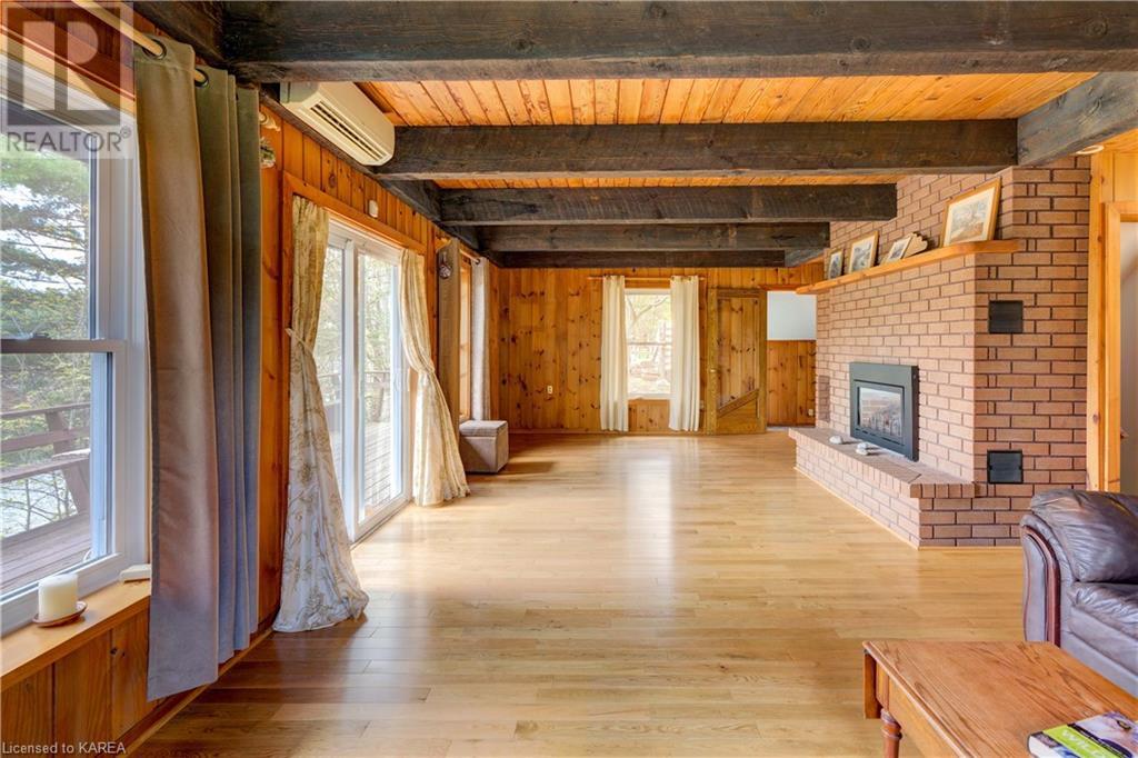 Waterfront home with acreage and privacy on Devil Lake! This property is located in Jones Bay – a quiet section of Devil Lake that is on the east side of Perth Road. Access to the main part of the lake is via the culvert that goes under Perth Road. The property includes 4.5 acres of land with a mixture of trees, rocks and a great yard with perennials. The home is a chalet-style home with 3 bedrooms on the upper floor and a bedroom in the basement. There is a main floor office that could also be used as a small bedroom. There is a main floor 2-pc bathroom, a full bathroom on the upper level as well as a shower in the basement. The main level has a family room with a propane fireplace and a patio door that leads to the deck. Each of the bedrooms on the upper level has their own private balcony to enjoy mornings or evenings outside with the sounds and sites of nature. The full, walkout basement has a recreation room with a propane wood stove, laundry facilities, a bedroom, large cold cellar plus plenty of storage space. There is a patio outside on this level and stairs that lead to the waterfront. The bay is shallow and not ideal for swimming but great for nature lovers, fishermen, etc. Located just 35 minutes north of Kingston or 10 minutes south of Westport. (id:22211)