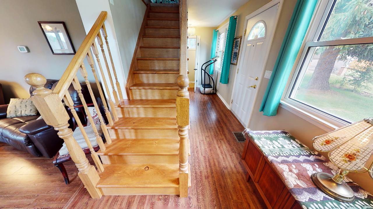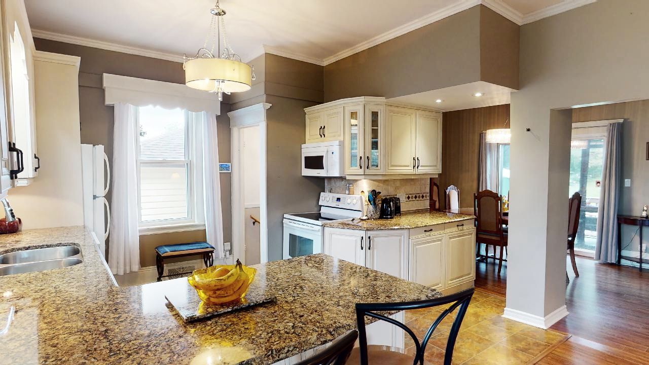Situated in a beautiful north end family neighbourhood with a park nearby and quick access to Parkway Trail! Country in the city on this 160 foot deep lot by 112 feet wide. Yard is quite deep and beautiful, complete with pretty gardens, mature trees, a shed for extra storage. 1467 square foot home on 2 floors. Mainfloor features updated stunning kitchen with granite countertops, breakfast bar opens into livingroom and diningroom is off to one side. Livingroom is toasty warm in the winter with an impressive gas fireplace. Great open concept space for entertaining. The dining room has patio doors to deck overlooking privacy and nature. There is a bedroom on the mainfloor plus a 3 pc and 2 pc bathroom. 2nd floor has 2 large bedrooms with walk in closets. Basement is ideal for storage and laundry facilities are there. Enclosed breezeway to garage provides access to backyard, driveway and garage. Lots of updates.