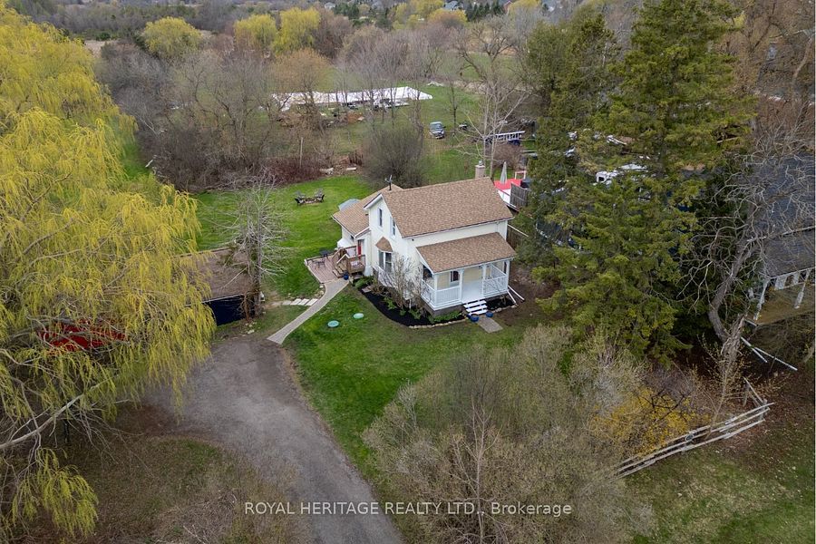 Located in the rural Hamlet Of Claremont, this welcoming century home is perfect for those who want to live in a natural setting while being conveniently located near Pickering, Whitby, Ajax, Stouffville and Uxbridge. Just 5 minutes from Hwy 7/407, 15 minutes from south Pickering/401. The property features an 1,175 sq ft main home AND a separate 790 sq ft detached studio building with parking for up to 5 cars. Situated on a large private lot (. 865 acres), zoned agricultural, the property allows many options for living and home business. Enjoy the outdoors and nature with a stream and beautiful sunsets with a clear view backing onto Federal agricultural land. The property has potential to expand the home including the creation of a separate dwelling with completed custom architectural plans available to the buyer. The main home has been freshly painted and a new furnace, air conditioner and tankless hot water tank installed (2025). The main level features an eat-in kitchen with pantry and tons of sunlight. Large family room with original hardwood flooring and a convenient main bedroom, two bathrooms and laundry room. Upstairs you will find a large second bedroom and a cozy loft area for reading, home office or play. There is an additional heated/air conditioned 790 SQ FT DETACHED STUDIO BUILDING. A former professional music studio, the space is currently used for a home office, home gym and additional bedroom for guests. This versatile space has so much potential for living, home business, art studio, workshop or extra space for family or kids.The Hamlet of Claremont, features many local amenities including a top-rated elementary school, fire station, day cares, community centre with City of Pickering recreation programming, churches and a large park featuring an outdoor ice rink, playground, sport courts and sport fields. The Hamlet has a strong sense of community featuring year-round events!