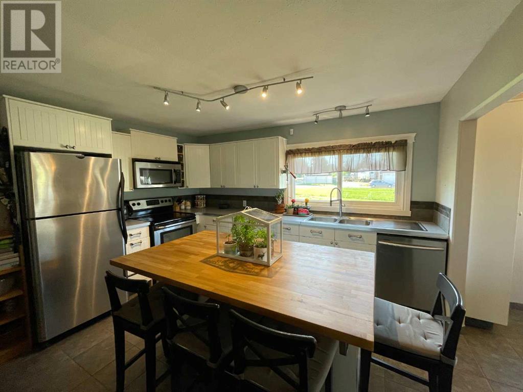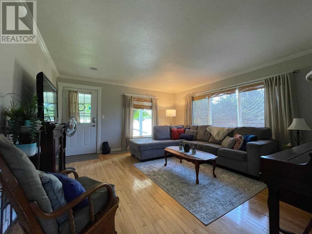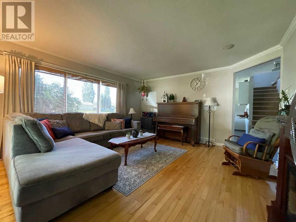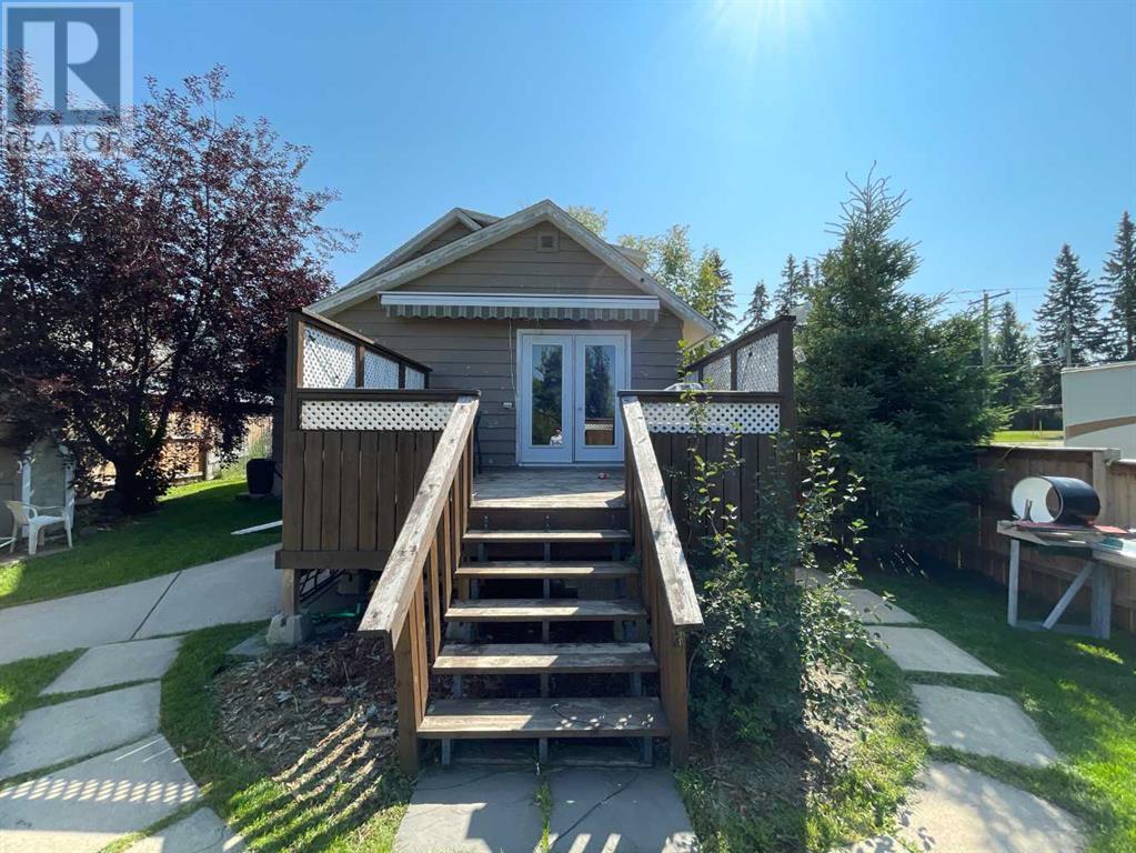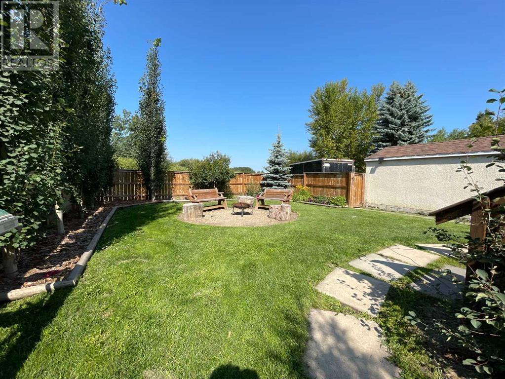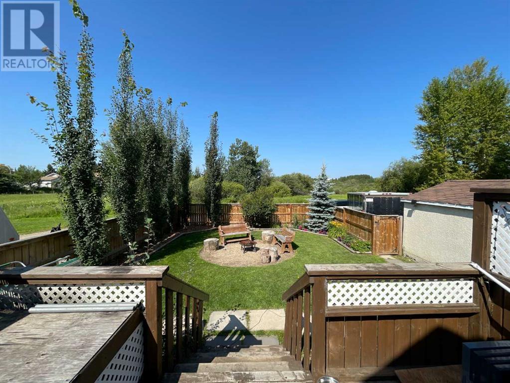 Character and charm are on full display in this spacious, and upgraded 1951 sq. ft. family home! Boasting 5 bedrooms, and 2 baths there is plenty of space for everyone. Gather in the stunning, expansive kitchen featuring crisp white cabinetry, stainless steel appliances, and a sit-up island, or the living room with hardwood flooring and decorative crown moldings. Two bedrooms are located on the main floor including the Primary bedroom. Upstairs you will find 2 more roomy bedrooms. The Basement is fully developed with a family room that is plumbed for a wet bar, 1 more bedroom and full bathroom. So many improvements over the years include new windows, new kitchen, interior/exterior doors, and flooring. More recently, shingles were replaced (2018), new window and garden door (2023), new fence in backyard (2022), new paint (2023), kitchen faucet (2023), and 2 new ceiling fans. Enjoy the serenity of the fenced and beautifully landscaped backyard with a firepit and storage shed. There are no neighbors behind or to the South of this home. It is perfect for outdoor activities. There is also extra space to park an RV. You will love this location that is in close proximity to the golf course and park, walking trails along the Battle River, and the community garden. You will notice pride of ownership and value in this well maintained, affordable property. (id:22211)