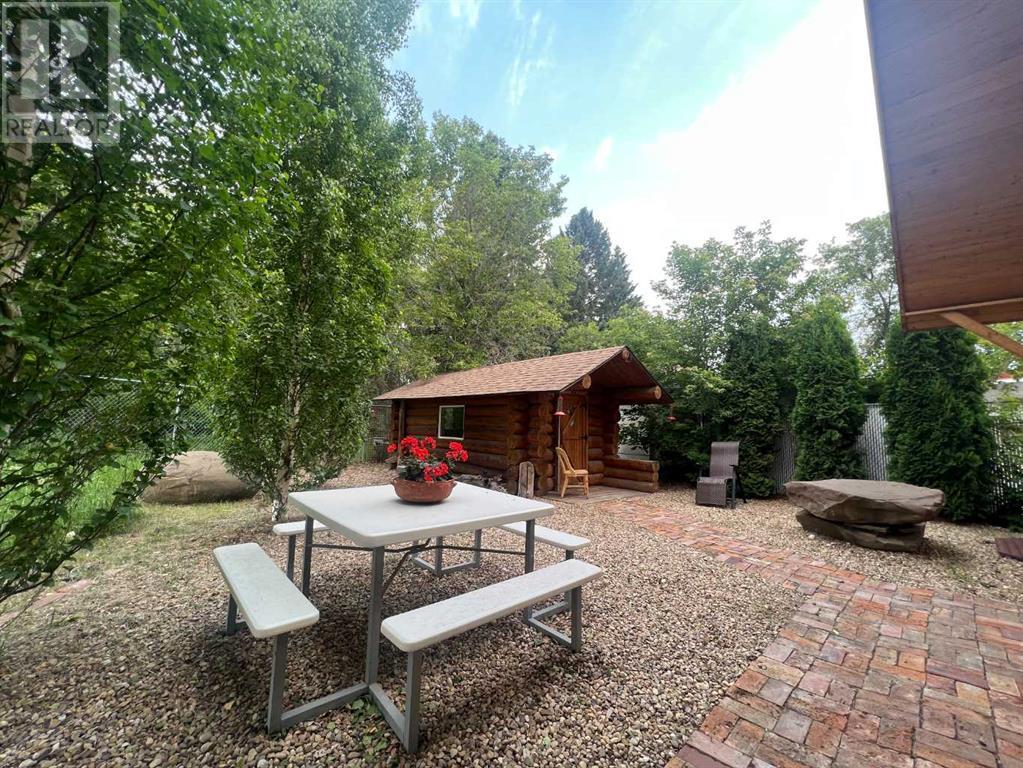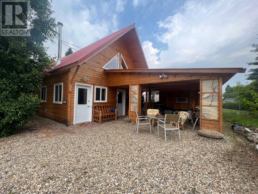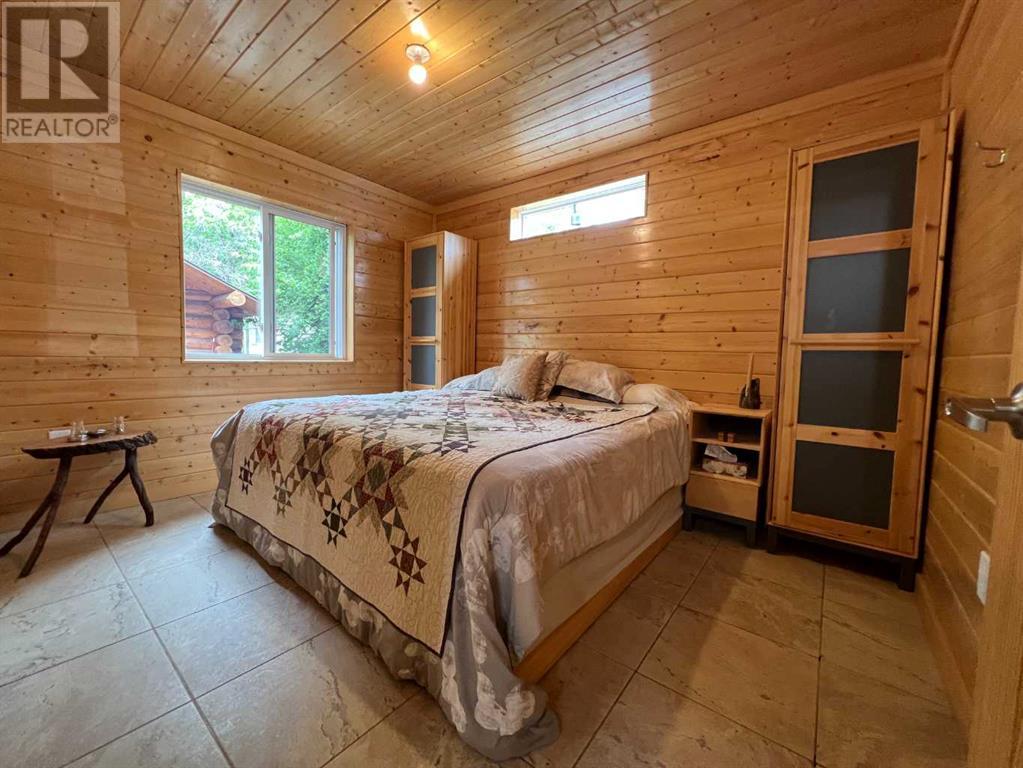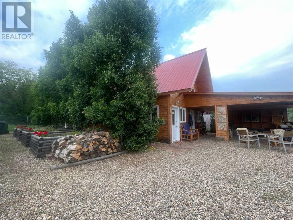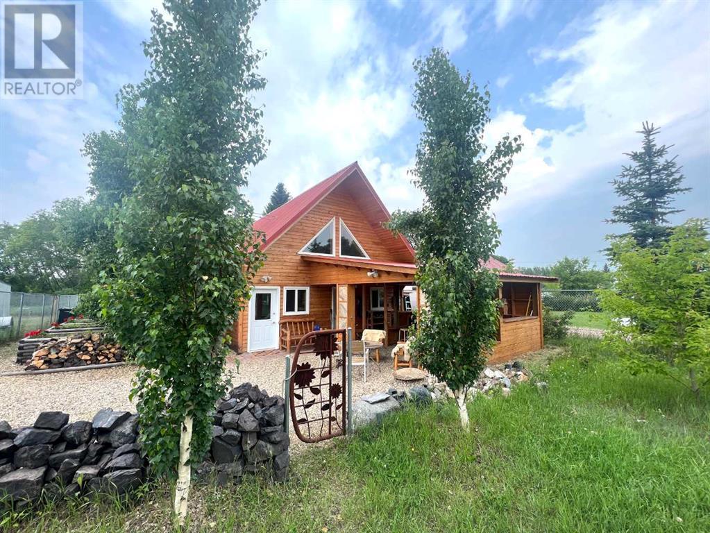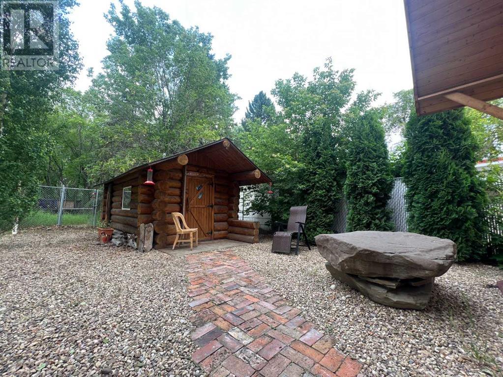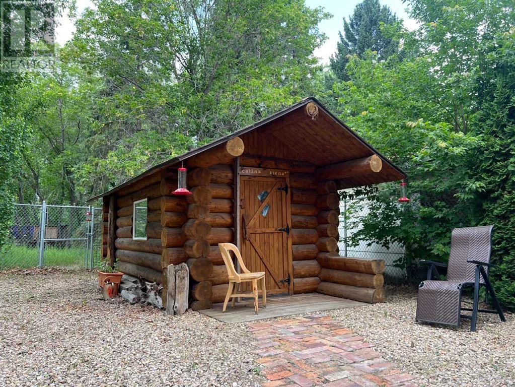 This lightly lived in, charming, one of a kind property has a prime location backing onto the park along the Battle River. The lot features hard-packed coarse sand with a layer of topsoil, providing a solid foundation. Surrounding the lot is a chain-link fence, 6 feet high at the back and sides, and 3 feet high at the front, in compliance with Ponoka Bylaws. Convenient access is available through lockable gates at the back and south side of the property.The front of the property boasts natural landscaping, including a large sandstone boulder, mature trees, and a privacy hedge along the front. There are also raised beds and a garden plot on the south side, with sandstone boulders adding a touch of character. A brick path connects the main dwelling to a log guest cabin/studio. Gravel covers the area from the gates to the dwellings and around the raised beds, and Parkland Pillars line the brick path.The main dwelling is a thoughtfully designed 24'x40' Knotty Pine Cabin with energy-efficient features. The steel-roofed cabin includes front and back roof extensions, three entry doors, and extra windows for ample natural light. The cabin also benefits from an automatic heat-exchange ventilation system, providing comfortable year-round living. Heating is provided by a silent and dust-free electric under-floor system with independent thermostats for five zones. A modern wood-burning stove with a baking oven adds coziness to the sitting area.The cabin's interior offers 2 bedrooms, and 2 full baths upon an open layout with a spacious level entrance, sitting area, studio, bathroom, bedroom, main floor laundry, modern kitchen, large pantry, and office/work space. The tile floors throughout the main floor offer easy cleaning and warm up well with the in-floor heat. The kitchen boasts beautiful quartz countertops and a moveable island for convenience. The loft serves as a master bedroom suite, complete with a full bathroom and ample storage. The entire cabin is illuminated wit h LED lighting, some with dimmer controls. Outdoor security is enhanced by motion-detecting lights over the exterior doors.A pine and steel-roofed carport, currently utilized as a wood and stone work shop, is attached to the front of the cabin. Additional shop benches and wood storage can be found on the north side of the cabin. Don't miss this opportunity to own a unique, energy efficient property with a well-designed cabin and beautiful surroundings. (id:22211)