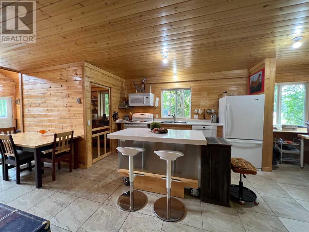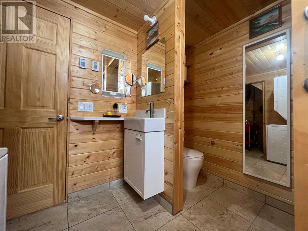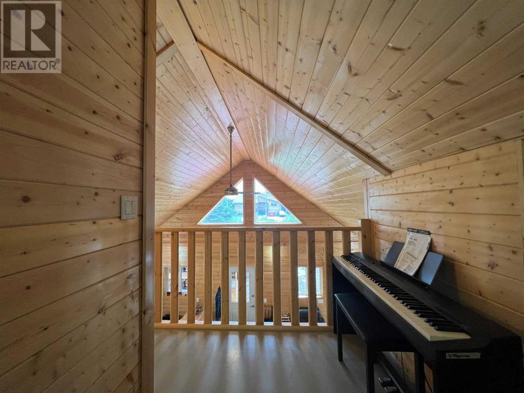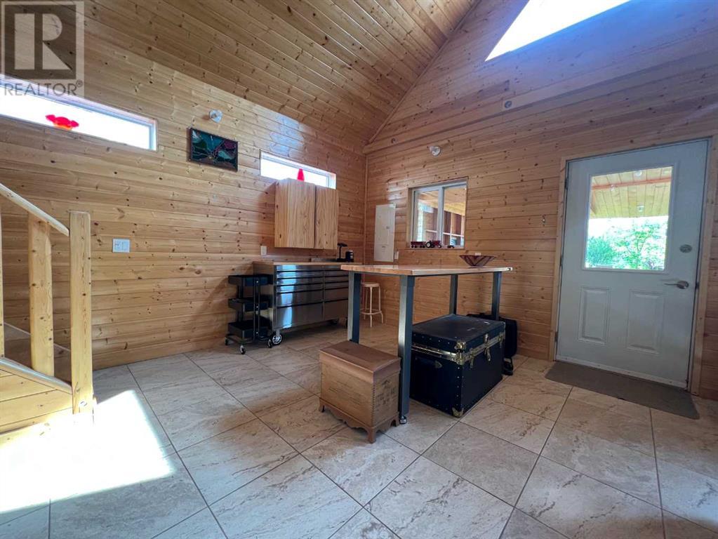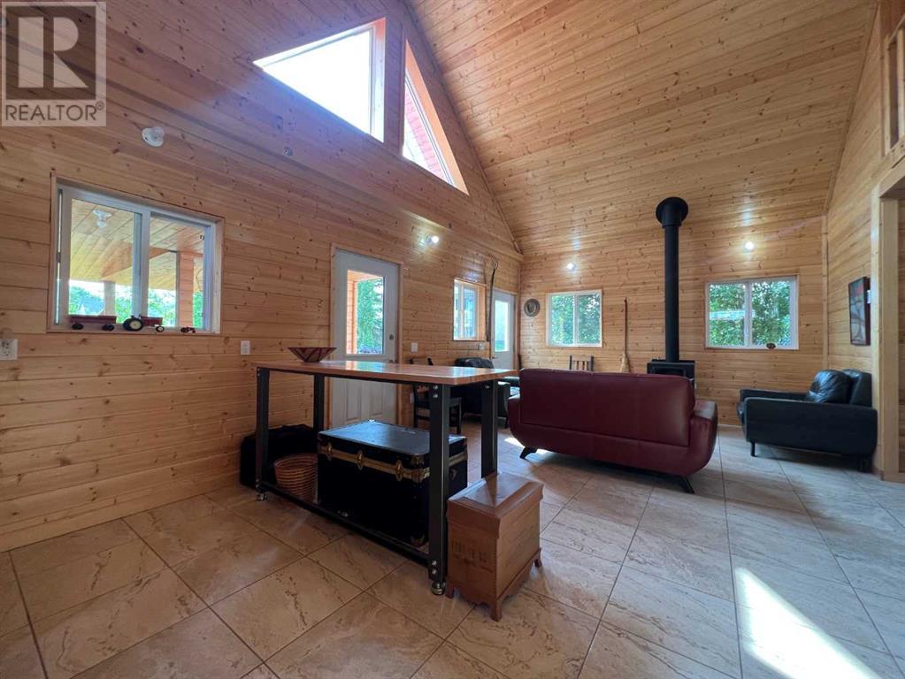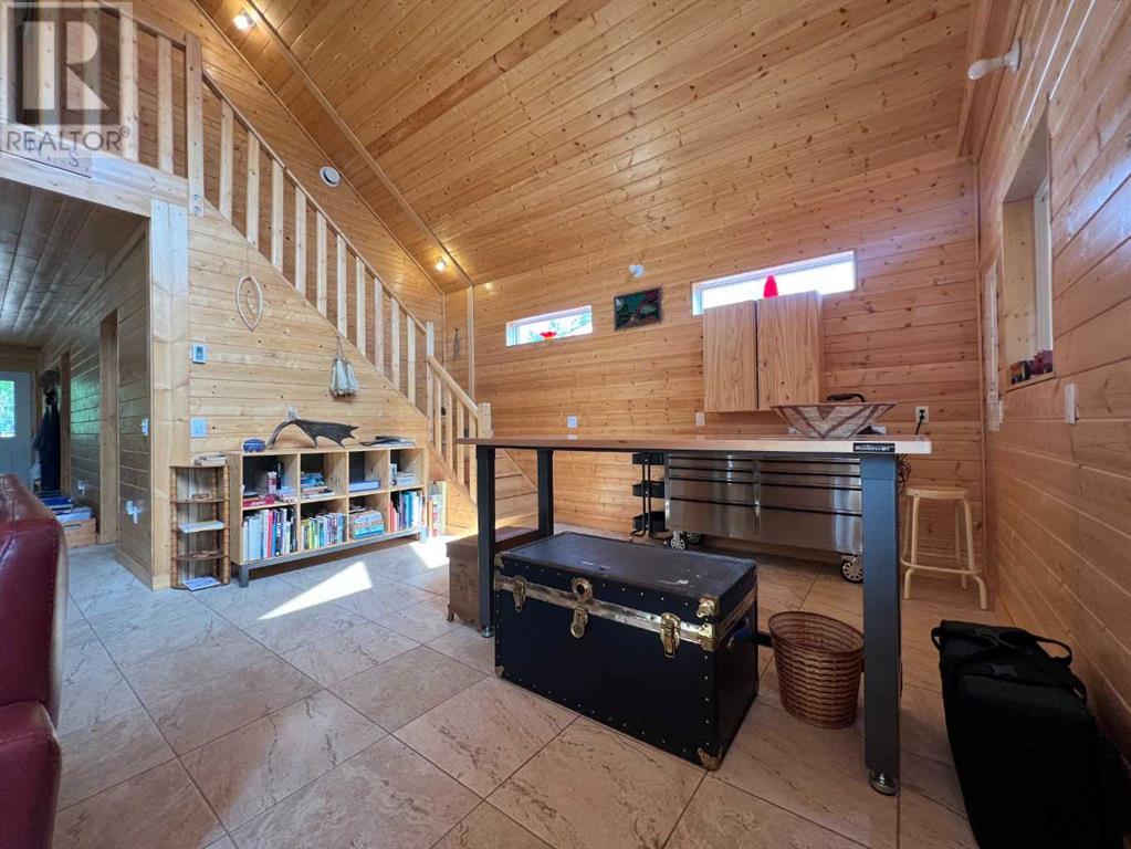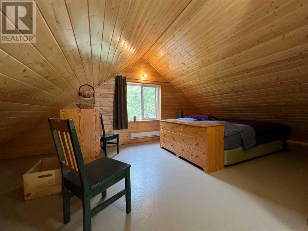 This lightly lived in, charming, one of a kind property has a prime location backing onto the park along the Battle River. The lot features hard-packed coarse sand with a layer of topsoil, providing a solid foundation. Surrounding the lot is a chain-link fence, 6 feet high at the back and sides, and 3 feet high at the front, in compliance with Ponoka Bylaws. Convenient access is available through lockable gates at the back and south side of the property.The front of the property boasts natural landscaping, including a large sandstone boulder, mature trees, and a privacy hedge along the front. There are also raised beds and a garden plot on the south side, with sandstone boulders adding a touch of character. A brick path connects the main dwelling to a log guest cabin/studio. Gravel covers the area from the gates to the dwellings and around the raised beds, and Parkland Pillars line the brick path.The main dwelling is a thoughtfully designed 24'x40' Knotty Pine Cabin with energy-efficient features. The steel-roofed cabin includes front and back roof extensions, three entry doors, and extra windows for ample natural light. The cabin also benefits from an automatic heat-exchange ventilation system, providing comfortable year-round living. Heating is provided by a silent and dust-free electric under-floor system with independent thermostats for five zones. A modern wood-burning stove with a baking oven adds coziness to the sitting area.The cabin's interior offers 2 bedrooms, and 2 full baths upon an open layout with a spacious level entrance, sitting area, studio, bathroom, bedroom, main floor laundry, modern kitchen, large pantry, and office/work space. The tile floors throughout the main floor offer easy cleaning and warm up well with the in-floor heat. The kitchen boasts beautiful quartz countertops and a moveable island for convenience. The loft serves as a master bedroom suite, complete with a full bathroom and ample storage. The entire cabin is illuminated wit h LED lighting, some with dimmer controls. Outdoor security is enhanced by motion-detecting lights over the exterior doors.A pine and steel-roofed carport, currently utilized as a wood and stone work shop, is attached to the front of the cabin. Additional shop benches and wood storage can be found on the north side of the cabin. Don't miss this opportunity to own a unique, energy efficient property with a well-designed cabin and beautiful surroundings. (id:22211)