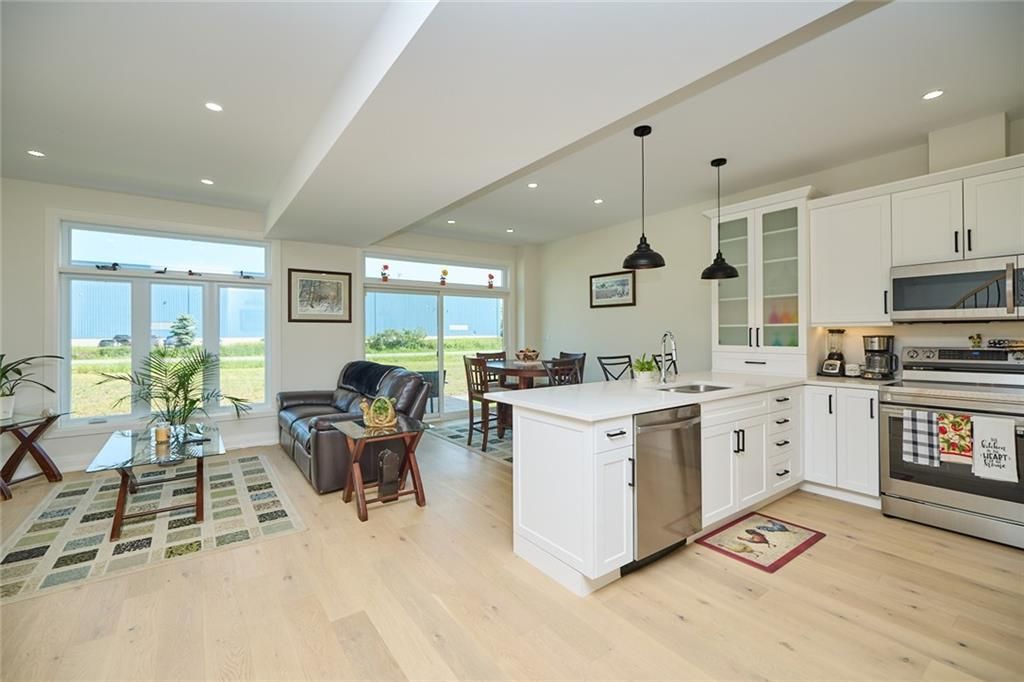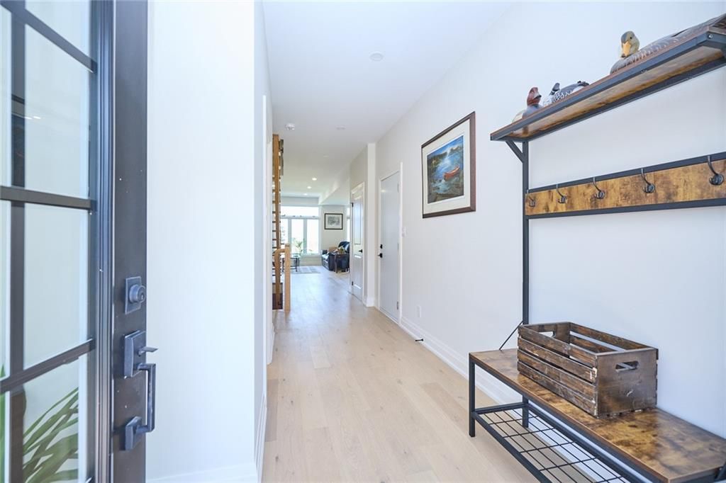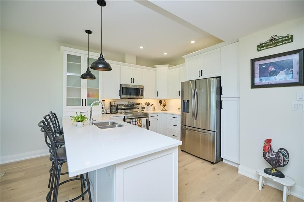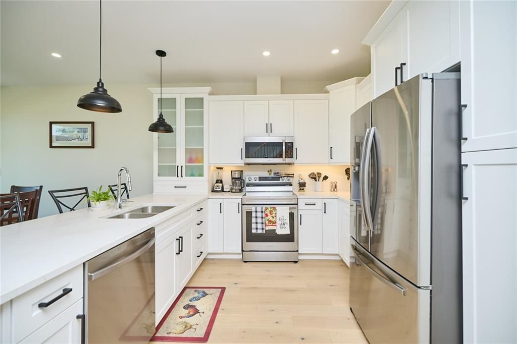 Newly built, move-in ready, modern farmhouse style, 2-storey freehold townhome with 3 bedrooms & 3 bathrooms. This interior unit's exterior features include front masonry stone, board & batten style vinyl siding, and a beautiful timber beam front entrance. The stylish finishes continue inside to the 2000sq ft of finished living space which includes a light filled main floor great room, dining room with sliding doors to the back deck and kitchen (with large island, 3 seat breakfast bar, custom cabinetry with glass door inserts and brand new appliances), 2pc powder room and a stunning wood and metal staircase and railing.