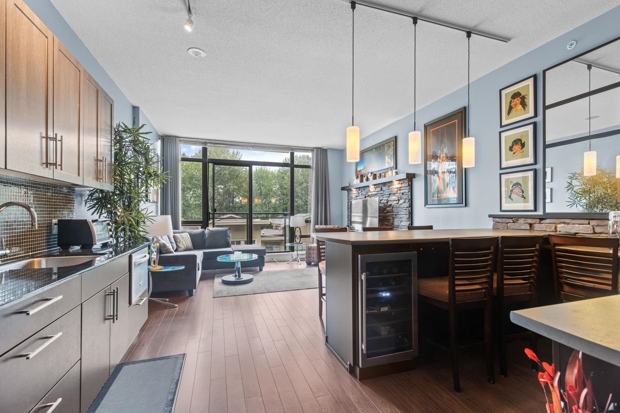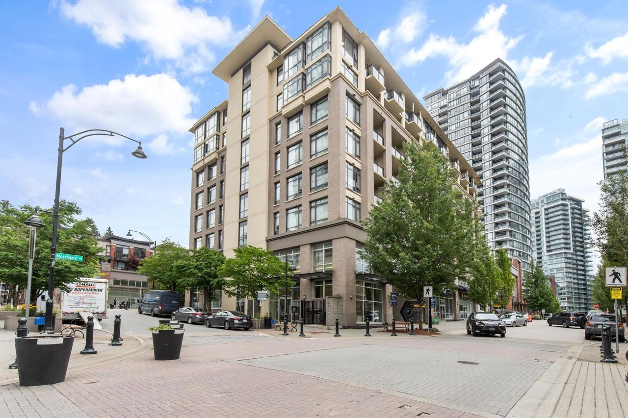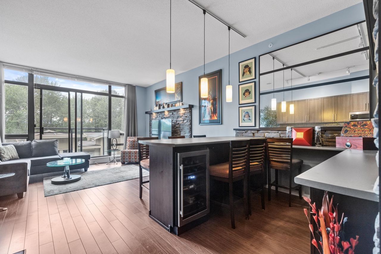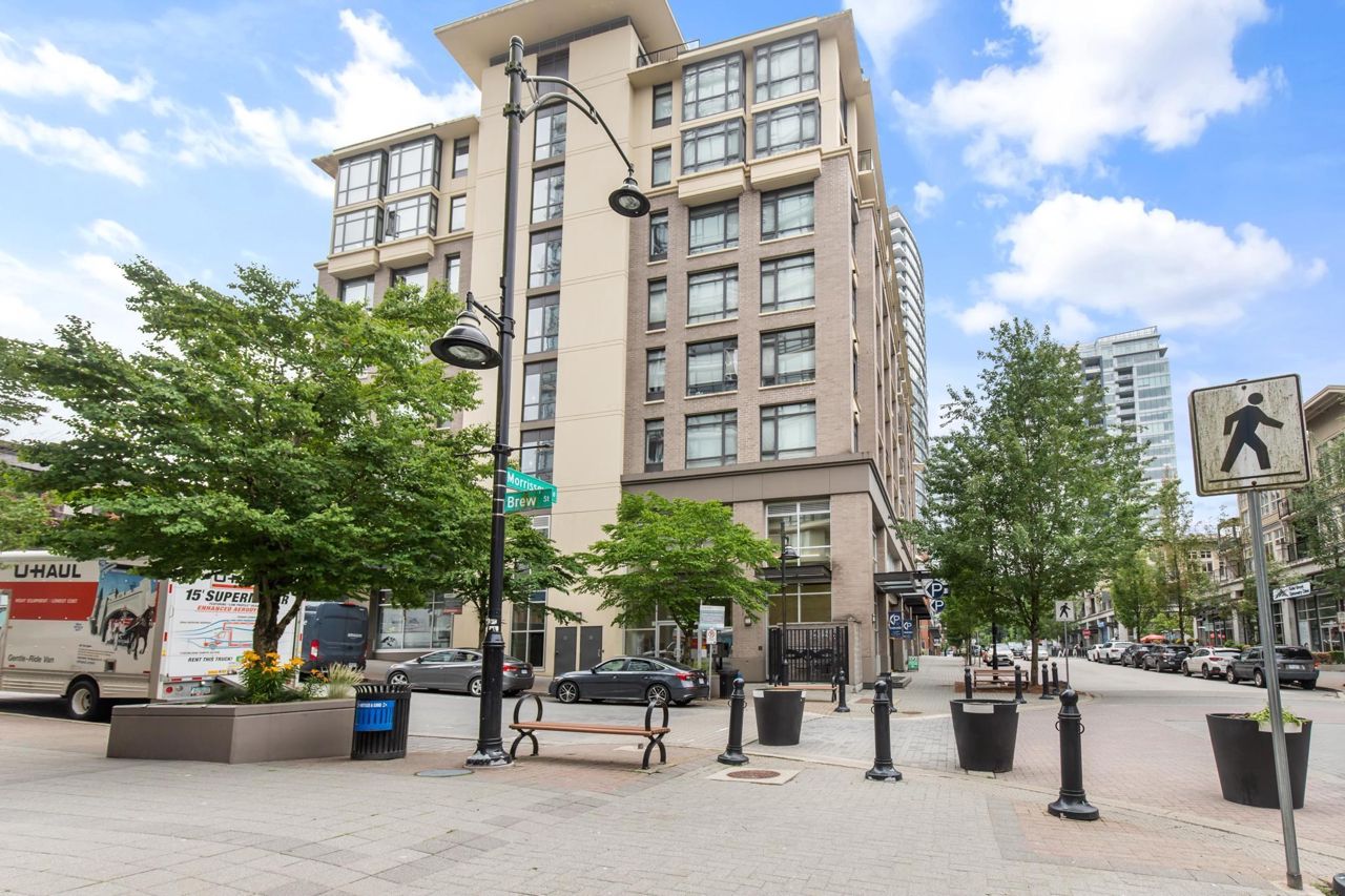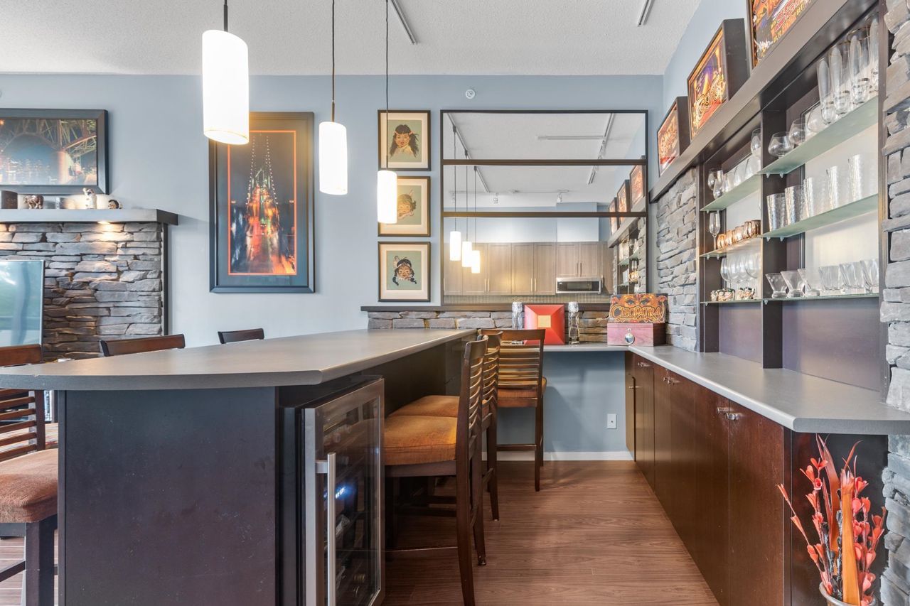 Welcome to The Room in Port Moody! Situated centrally in the heart of Suter Brook Village this spacious 1 Bedroom/1 Bathroom condo boasts 10 ft ceilings & an amazing floor plan. Enter into the condo and take in all of the updates throughout! Premium kitchen with granite countertops, SS appliances & custom bar area with built in wine fridge & cabinetry - perfect for entertainers. Beautiful hardwood floors span the unit with an open living room with built in fireplace feature & the bedroom features a built in wardrobe. Concrete building also boasting tons of amenities including a gym, pool, jacuzzi, squash court, & games room. 1 parking stall & 1 storage locker. 2 pets allowed. Located next to a commercial plaza for all your shopping needs, various restaurants and parks are also close by!
