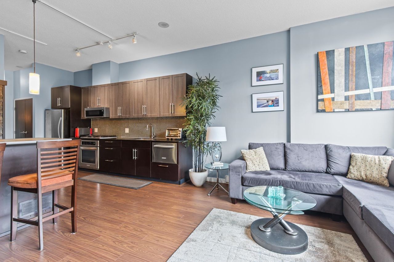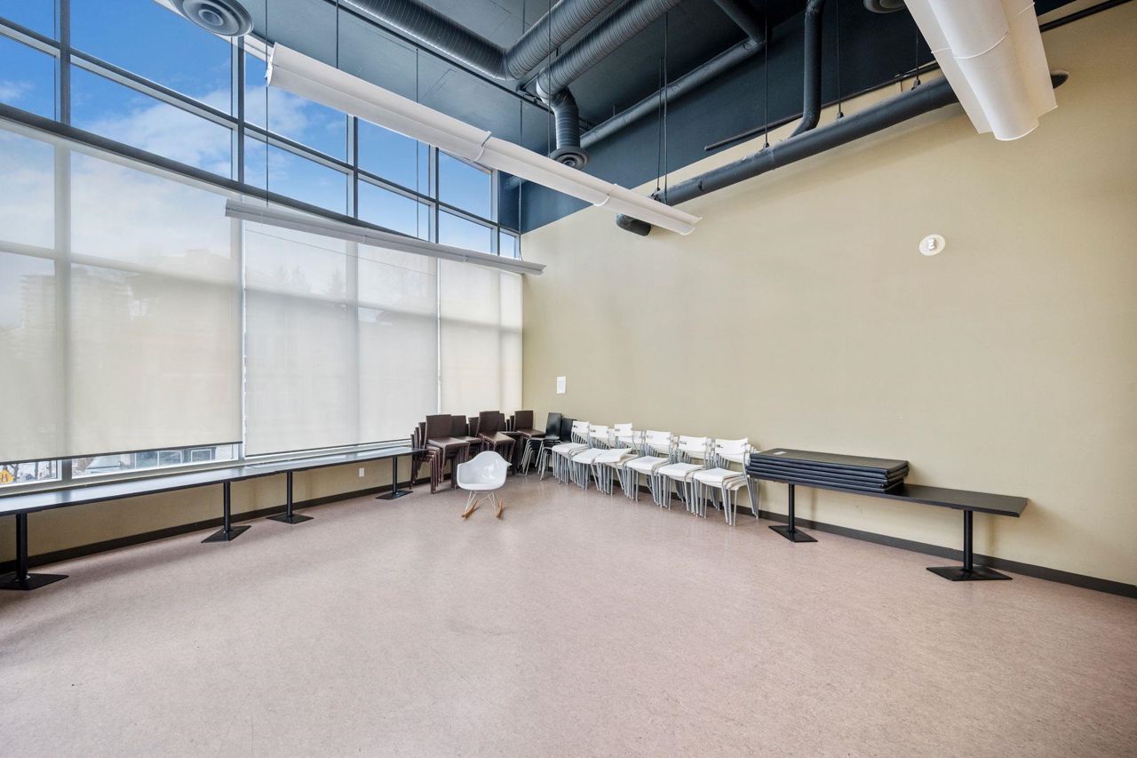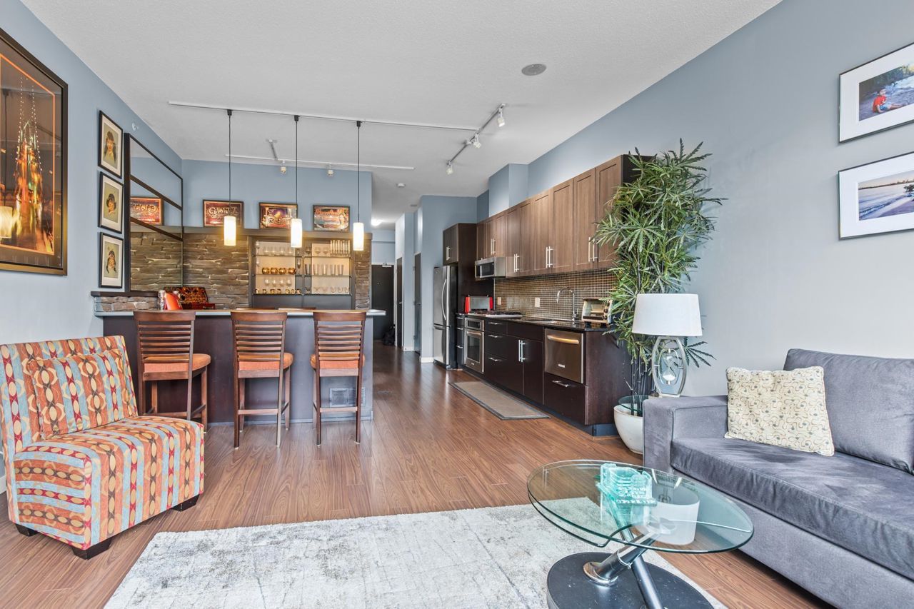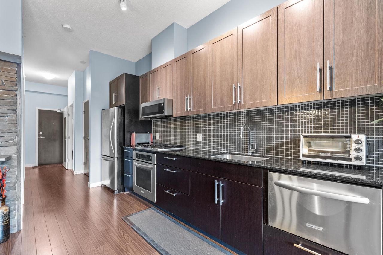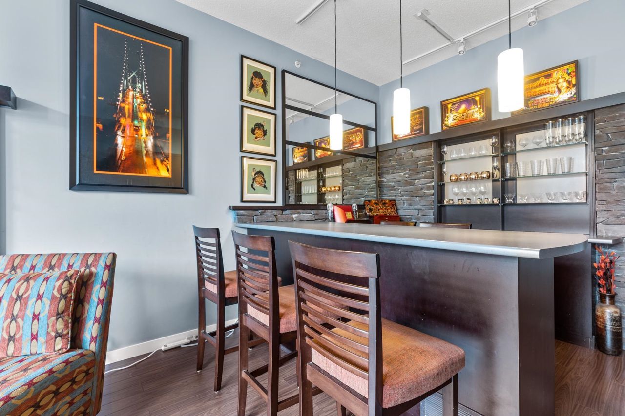 Welcome to The Room in Port Moody! Situated centrally in the heart of Suter Brook Village this spacious 1 Bedroom/1 Bathroom condo boasts 10 ft ceilings & an amazing floor plan. Enter into the condo and take in all of the updates throughout! Premium kitchen with granite countertops, SS appliances & custom bar area with built in wine fridge & cabinetry - perfect for entertainers. Beautiful hardwood floors span the unit with an open living room with built in fireplace feature & the bedroom features a built in wardrobe. Concrete building also boasting tons of amenities including a gym, pool, jacuzzi, squash court, & games room. 1 parking stall & 1 storage locker. 2 pets allowed. Located next to a commercial plaza for all your shopping needs, various restaurants and parks are also close by!