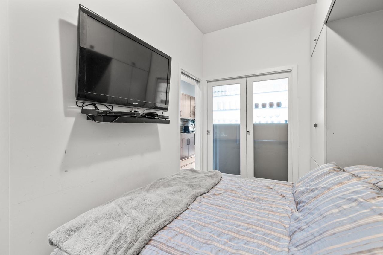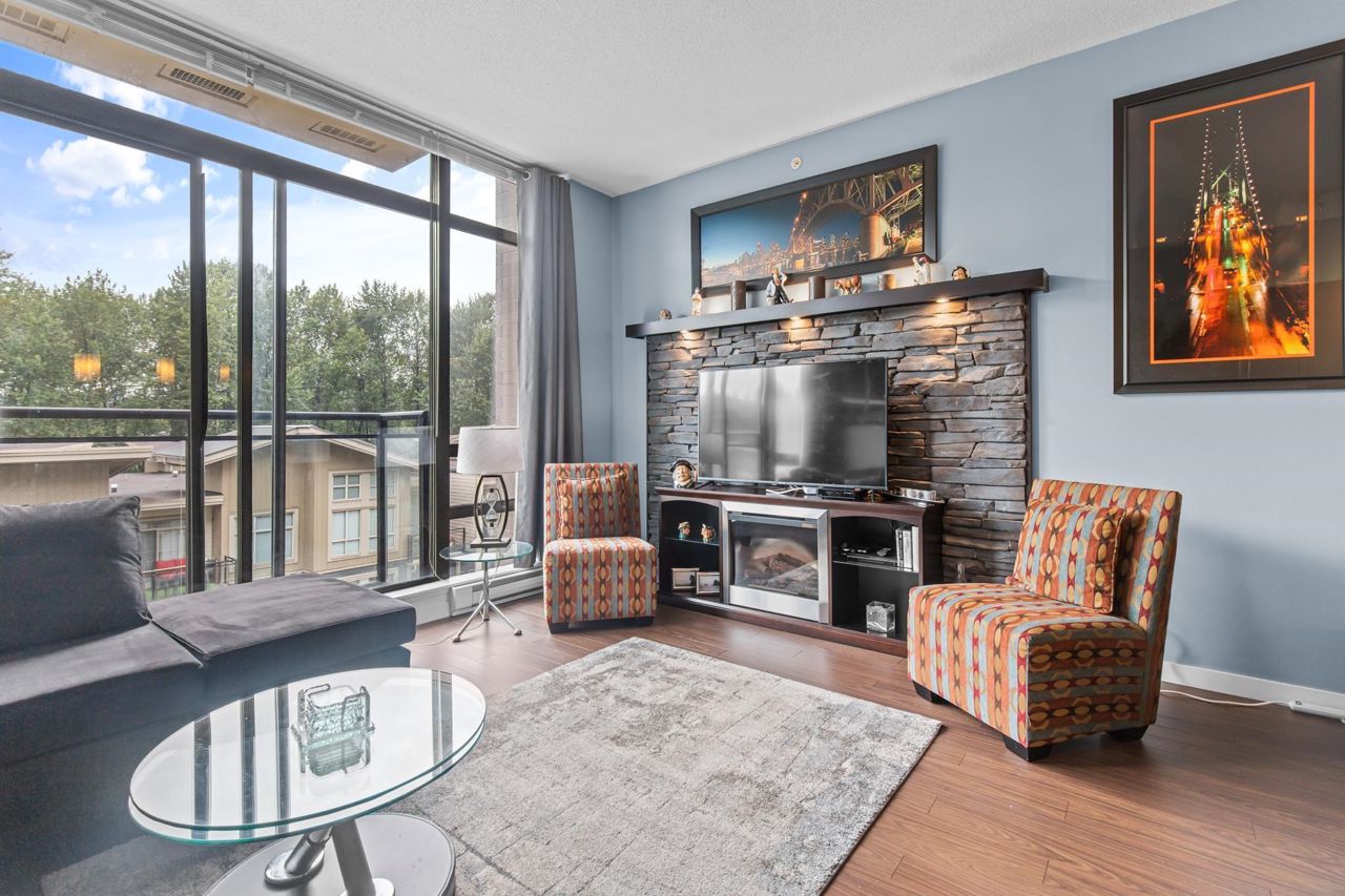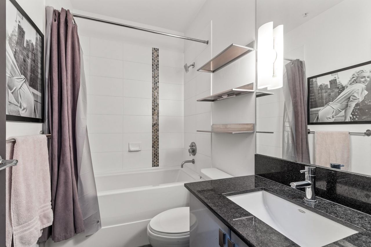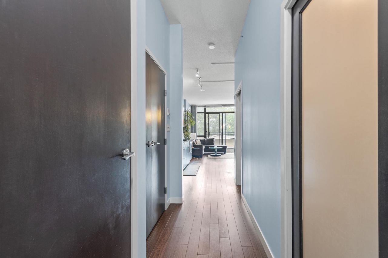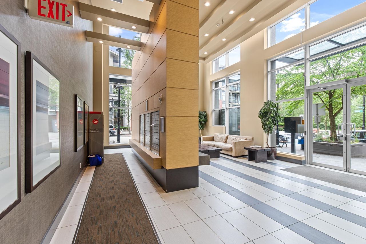 Welcome to The Room in Port Moody! Situated centrally in the heart of Suter Brook Village this spacious 1 Bedroom/1 Bathroom condo boasts 10 ft ceilings & an amazing floor plan. Enter into the condo and take in all of the updates throughout! Premium kitchen with granite countertops, SS appliances & custom bar area with built in wine fridge & cabinetry - perfect for entertainers. Beautiful hardwood floors span the unit with an open living room with built in fireplace feature & the bedroom features a built in wardrobe. Concrete building also boasting tons of amenities including a gym, pool, jacuzzi, squash court, & games room. 1 parking stall & 1 storage locker. 2 pets allowed. Located next to a commercial plaza for all your shopping needs, various restaurants and parks are also close by!