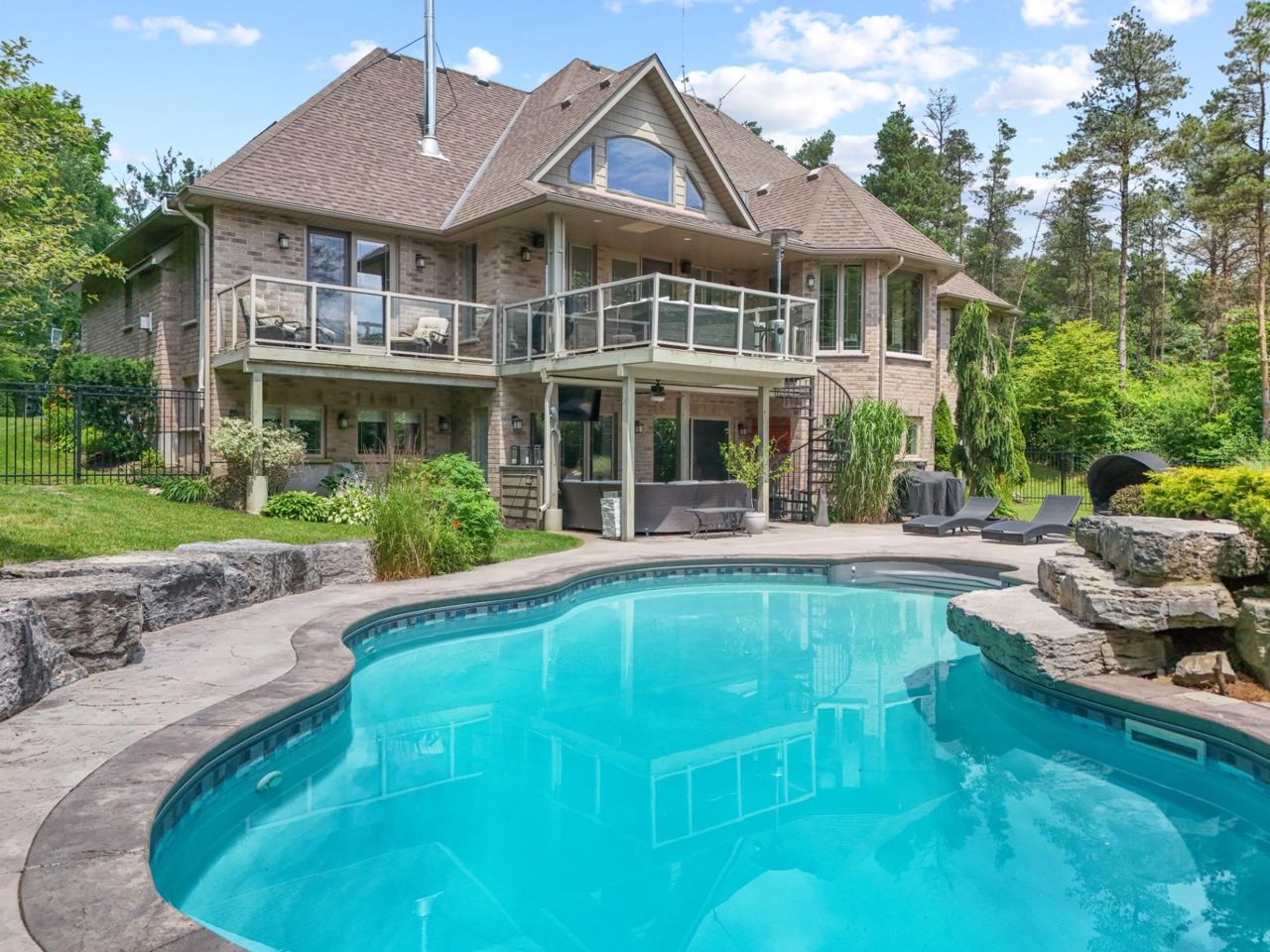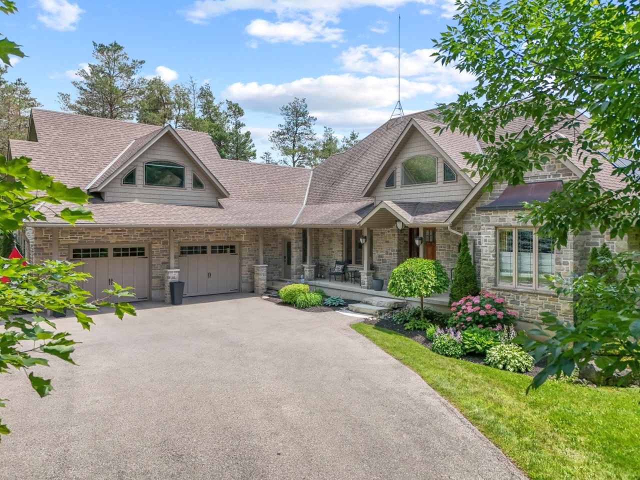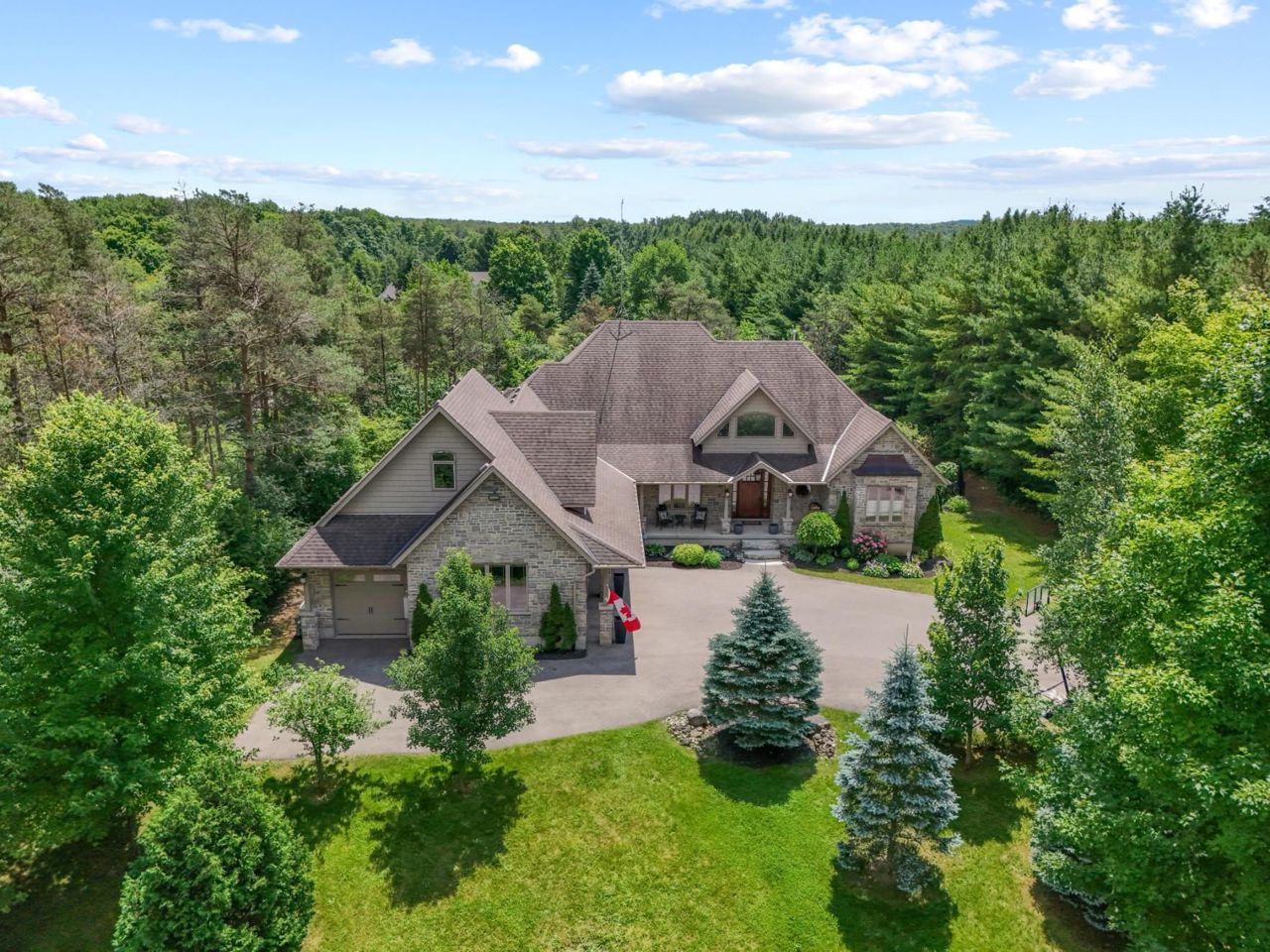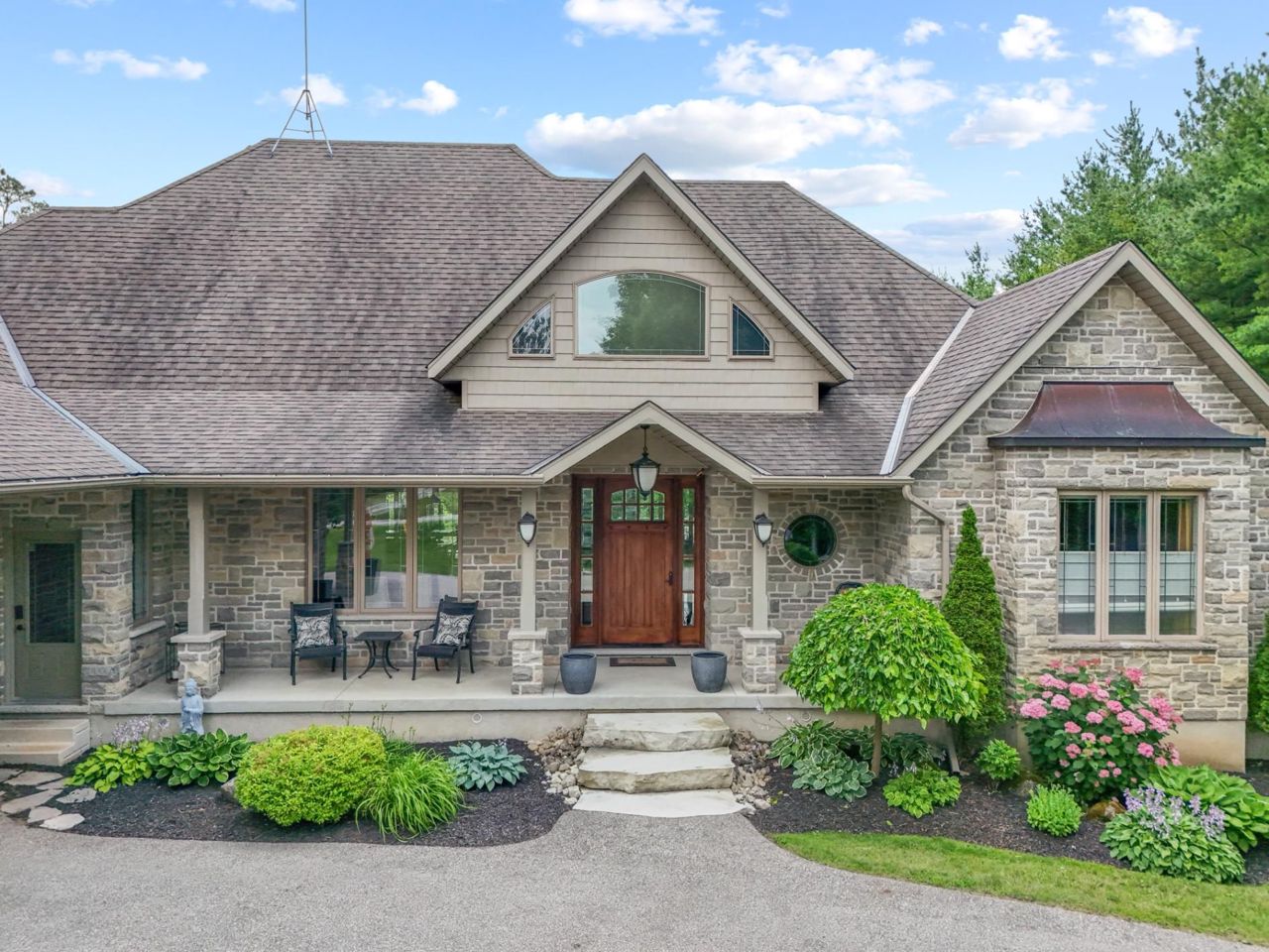 5-bdrm estate on 1.4-acre lot W/backyard oasis nestled amidst mature trees! The winding tree-lined driveway reveals stately stone bungaloft W/oversized garage W/car lift to accommodate 4 cars & landscaped grounds. Grand 2-story foyer welcomes you to spectacular great room W/bamboo hardwood, vaulted ceilings & wall of windows. Floor-to-ceiling stone fireplace adds touch of warmth. Custom kitchen W/top-tier appliances, granite countertops & high-end cabinetry W/glass accents. Massive island invites casual dining & complemented by luxurious conveniences such as pot filler, W/I pantry with B/I beverage fridge & wine racks. Adjacent to kitchen is sun-drenched reading nook W/beautiful views. Dining room W/bamboo hardwood, elegant lighting & expansive window. Primary suite W/bamboo hardwood & floor-to-ceiling stone fireplace. Dbl doors open to dressing room W/custom B/Is. Spa-like ensuite W/soaker tub, glass shower & expansive dbl sink vanity W/quartz counters. There is a private balcony overlooking the pool! There are 2 add'l main-floor bdrms each W/private ensuites & W/I closets. The bonus 700sqft + loft W/vaulted ceilings offers versatile space for an office, playroom or movie room all supported by Fiber Optic High-Speed Internet. B/I speakers throughout main floor & outside. Renovated W/O bsmt W/huge rec area, engineered hardwood, secondary full kitchen W/quartz counters & breakfast bar ideal for casual dining. There is a workout room, 2 bdrms & bathroom. This space is set up for in-law suite making it ideal for multi-generational families! Unwind on terrace W/glass railings for unobstructed views of saltwater pool & forest beyond. Descend the spiral staircase to patio offering sunlit areas & shaded retreats. Saltwater pool W/stone waterfall becomes centre piece for entertainment. Generator offers peace of mind guaranteeing power during any outages. Mins from South-End Guelph amenities, 15-min to 401, 30-min to Mississauga, 1hr to Toronto & 40-min to Toronto Airport