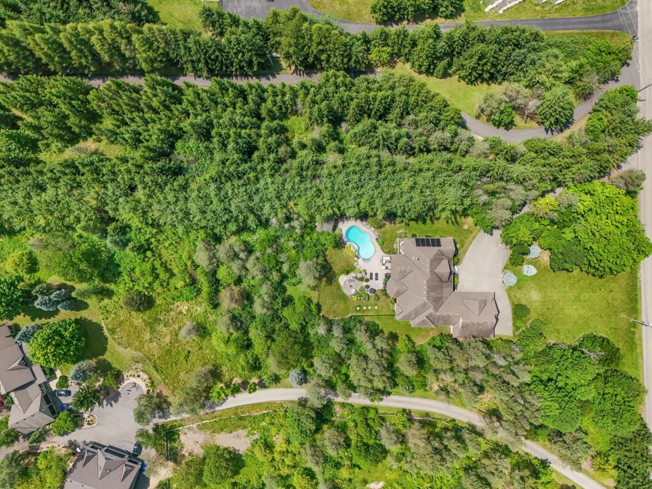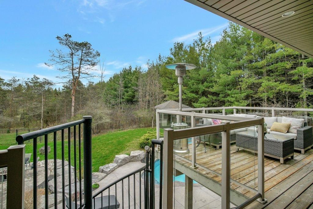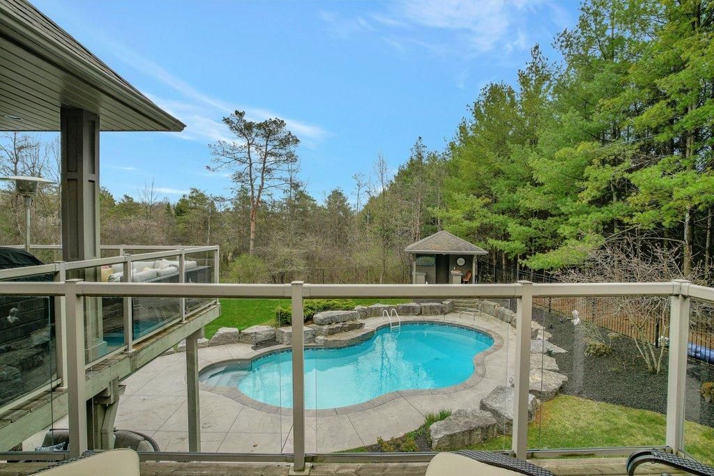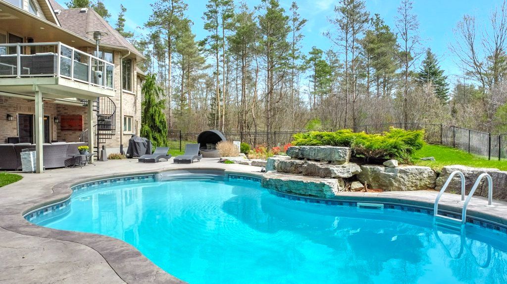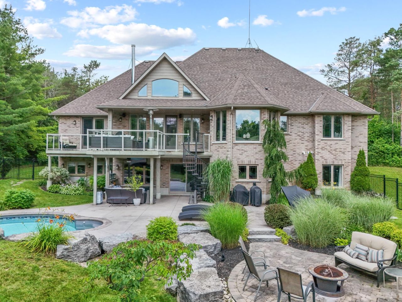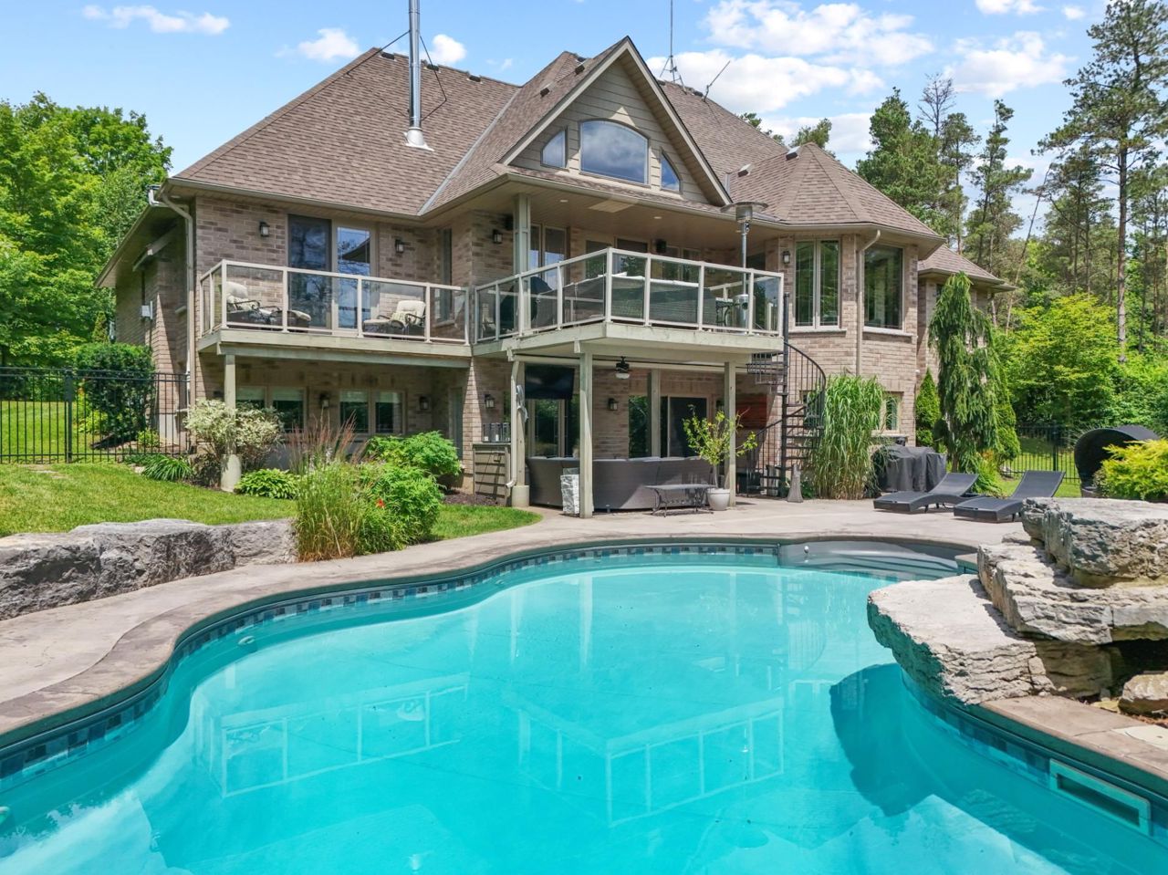 5-bdrm estate on 1.4-acre lot W/backyard oasis nestled amidst mature trees! The winding tree-lined driveway reveals stately stone bungaloft W/oversized garage W/car lift to accommodate 4 cars & landscaped grounds. Grand 2-story foyer welcomes you to spectacular great room W/bamboo hardwood, vaulted ceilings & wall of windows. Floor-to-ceiling stone fireplace adds touch of warmth. Custom kitchen W/top-tier appliances, granite countertops & high-end cabinetry W/glass accents. Massive island invites casual dining & complemented by luxurious conveniences such as pot filler, W/I pantry with B/I beverage fridge & wine racks. Adjacent to kitchen is sun-drenched reading nook W/beautiful views. Dining room W/bamboo hardwood, elegant lighting & expansive window. Primary suite W/bamboo hardwood & floor-to-ceiling stone fireplace. Dbl doors open to dressing room W/custom B/Is. Spa-like ensuite W/soaker tub, glass shower & expansive dbl sink vanity W/quartz counters. There is a private balcony overlooking the pool! There are 2 add'l main-floor bdrms each W/private ensuites & W/I closets. The bonus 700sqft + loft W/vaulted ceilings offers versatile space for an office, playroom or movie room all supported by Fiber Optic High-Speed Internet. B/I speakers throughout main floor & outside. Renovated W/O bsmt W/huge rec area, engineered hardwood, secondary full kitchen W/quartz counters & breakfast bar ideal for casual dining. There is a workout room, 2 bdrms & bathroom. This space is set up for in-law suite making it ideal for multi-generational families! Unwind on terrace W/glass railings for unobstructed views of saltwater pool & forest beyond. Descend the spiral staircase to patio offering sunlit areas & shaded retreats. Saltwater pool W/stone waterfall becomes centre piece for entertainment. Generator offers peace of mind guaranteeing power during any outages. Mins from South-End Guelph amenities, 15-min to 401, 30-min to Mississauga, 1hr to Toronto & 40-min to Toronto Airport
