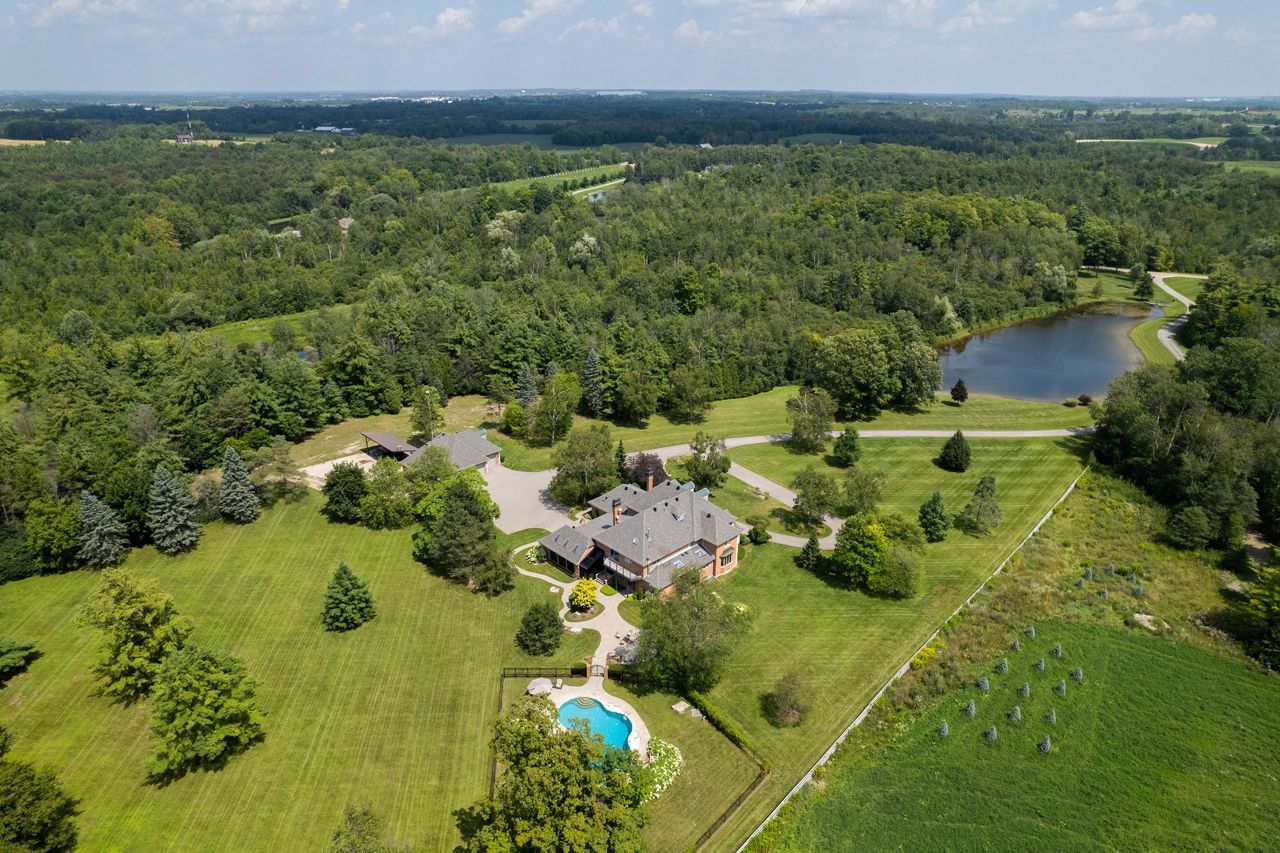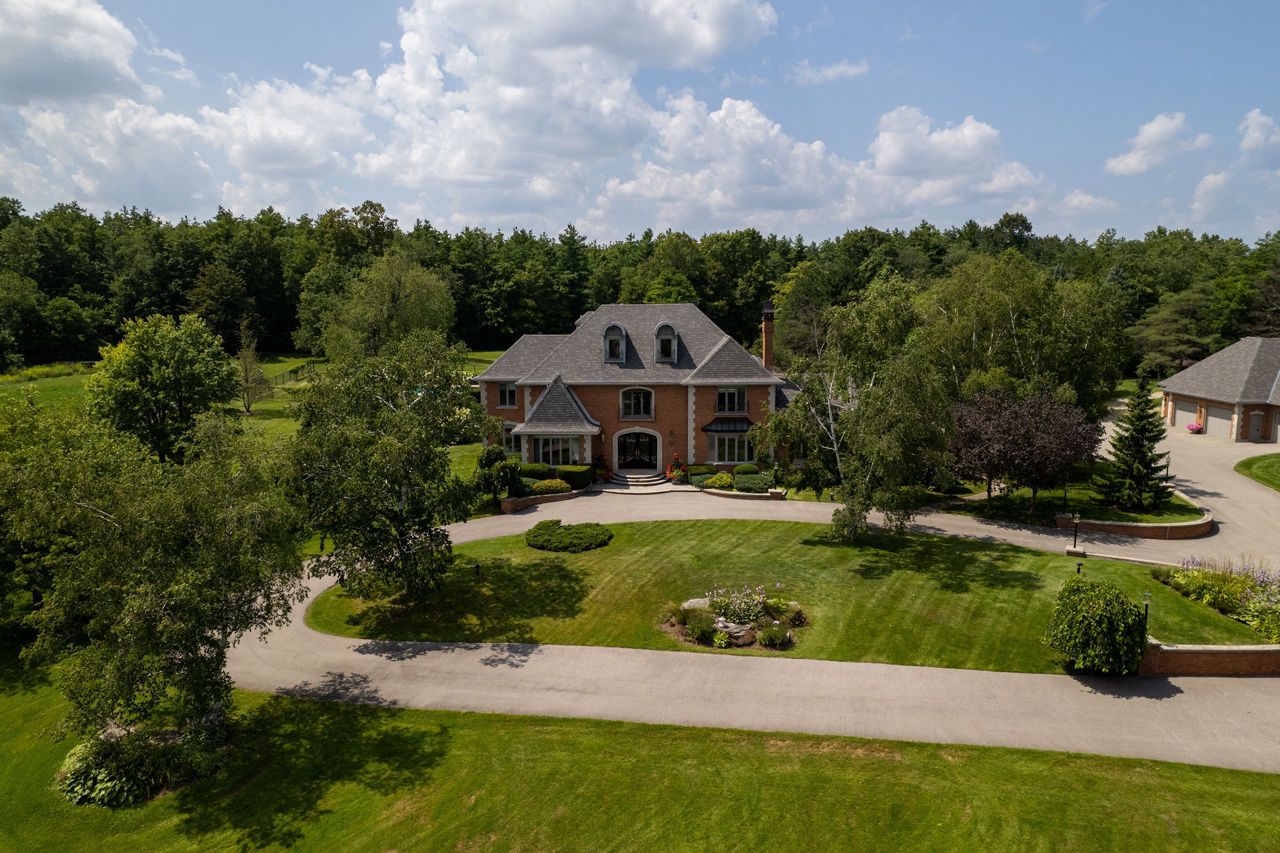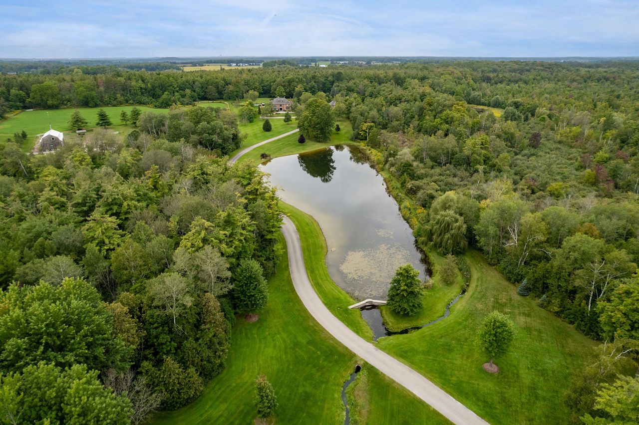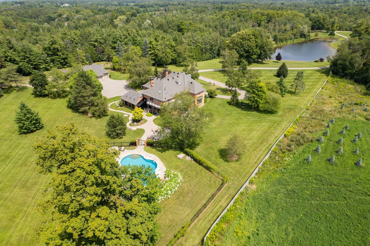 Down a private .5KM long drive that wraps around a manicured spring-fed pond this exquisite French chateau inspired estate w/nearly 14,000 sqft of living space is perfectly perched to capture the manor’s beauty + reflections at dusk w/in the nearly 14-acres w/century-old trees +spring-fed pond. Crafted in a manner that is rarely seen: brick extr w/keystone corners, copper chimney toppers, iron-detailed dormers + an immaculate custom forged iron+glass front entrance.Expertly curated living spaces w/ walnut + doweled oak hrdwd flring, milled entranceways + panelling, plaster crown moulding, custom built-ins + natural stonework.7 beds, 9 baths, 5 FPs. Main flr self-contained guest suite. Defined rear yard w/expansive stone patios, perennial gardens + fenced salt-water gunite pool w/flagstone lounge +lush perennials.Detached wrkshp w/6 bays+lift. Reverse osmosis+geothermal heating. 100 conservation acres of walking/biking trails from your backyard. Walk to coffee shops, short drive to Guelph/Cambridge, HWYs + local airport+3 universities.