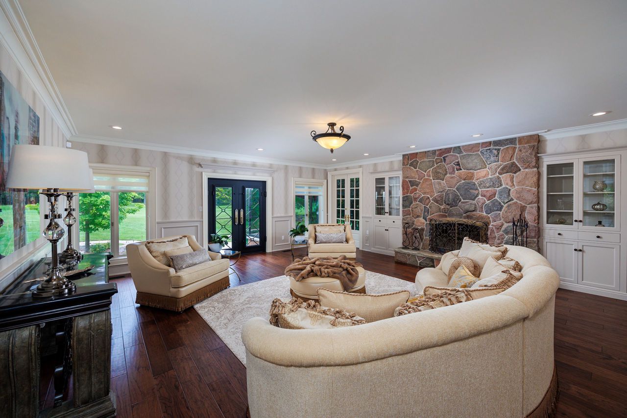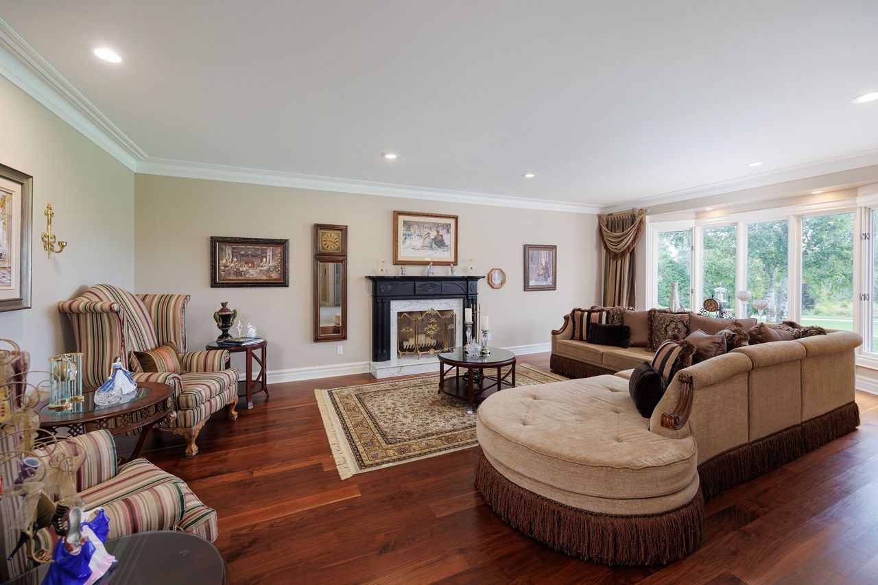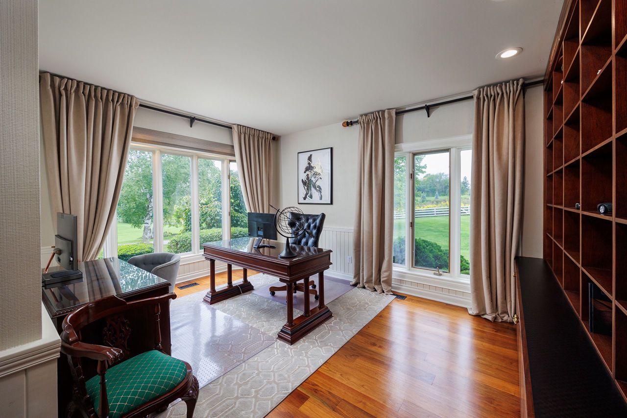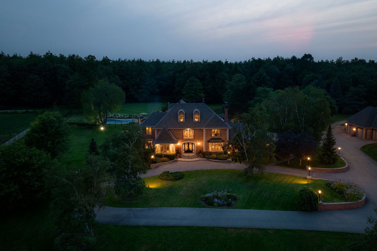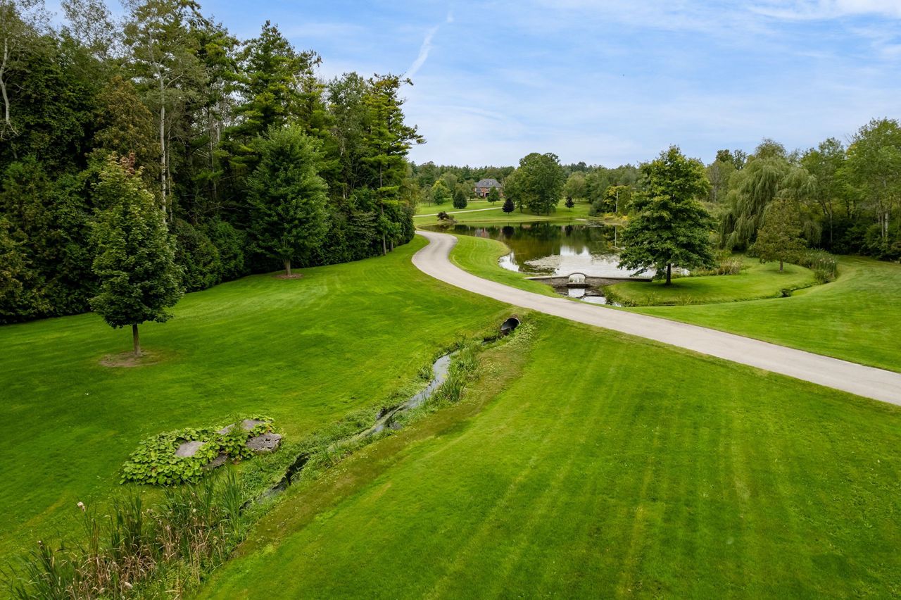 Down a private .5KM long drive that wraps around a manicured spring-fed pond this exquisite French chateau inspired estate w/nearly 14,000 sqft of living space is perfectly perched to capture the manor’s beauty + reflections at dusk w/in the nearly 14-acres w/century-old trees +spring-fed pond. Crafted in a manner that is rarely seen: brick extr w/keystone corners, copper chimney toppers, iron-detailed dormers + an immaculate custom forged iron+glass front entrance.Expertly curated living spaces w/ walnut + doweled oak hrdwd flring, milled entranceways + panelling, plaster crown moulding, custom built-ins + natural stonework.7 beds, 9 baths, 5 FPs. Main flr self-contained guest suite. Defined rear yard w/expansive stone patios, perennial gardens + fenced salt-water gunite pool w/flagstone lounge +lush perennials.Detached wrkshp w/6 bays+lift. Reverse osmosis+geothermal heating. 100 conservation acres of walking/biking trails from your backyard. Walk to coffee shops, short drive to Guelph/Cambridge, HWYs + local airport+3 universities.