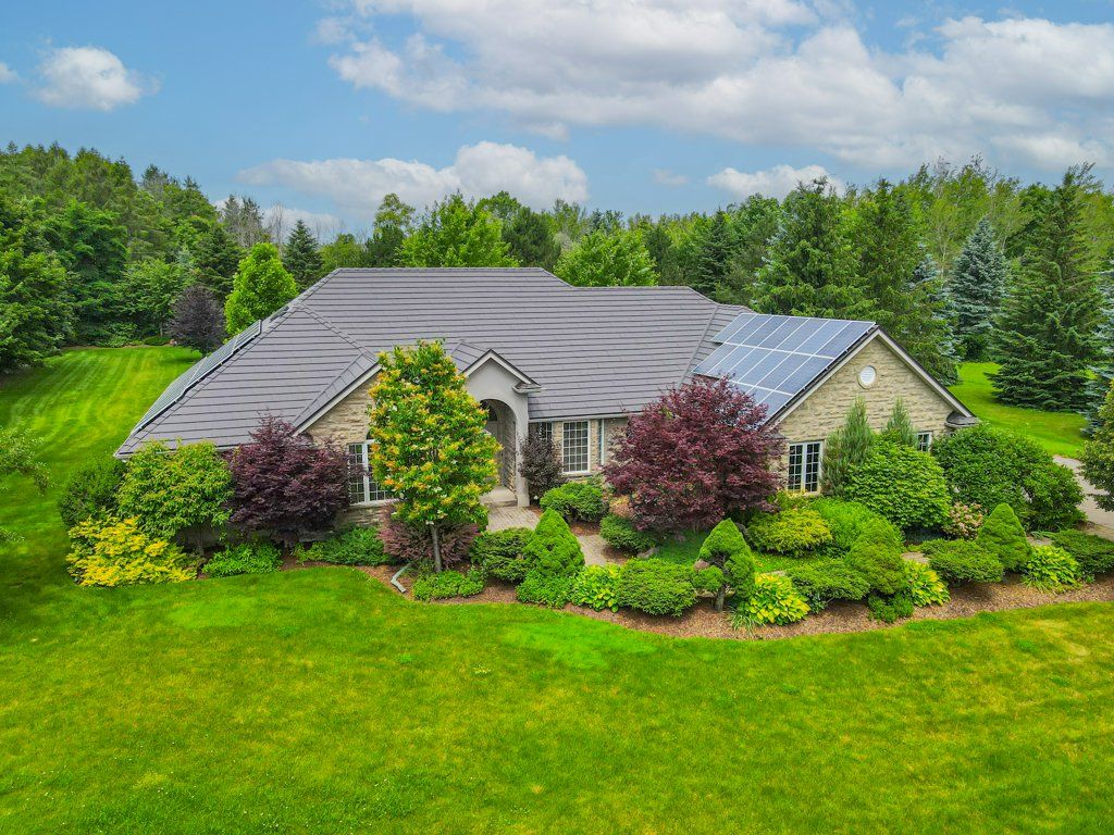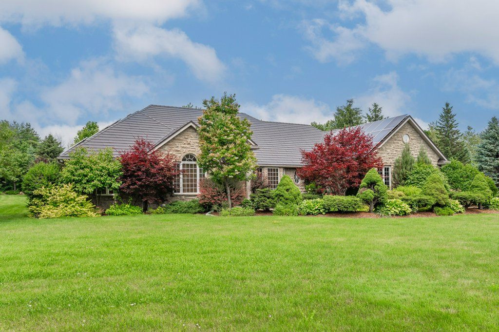 Nestled peacefully in the desirable Fox Run Estates community, this timeless stone bungalow offers all the advantage of prestigious estate living on nearly 1.3 acres. Fabulous family home features 11' ceilings in the open concept principal rooms. Main floor living, family, dining, master with luxury ensuite and 3 additional bedrooms. Exceptionally built one owner home has been meticulously and lovingly cared for. The lower level offers an additional 1,451 sq ft of finished living space and is home to the rec room, great room/gym, 3pc bath, laundry and up to 2 additional bedrooms with plenty of storage space. Additional features include metal roof with solar panels, tesla car charger, 3 car garage plus parking for 10+. This stunning and mature property is a gardeners paradise full of endless possibilities and an extremely rare find. Located only minutes to the 401 and all amenities, this is an opportunity not to be missed.Interboard Listing with Guelph & District Association of Realtors*