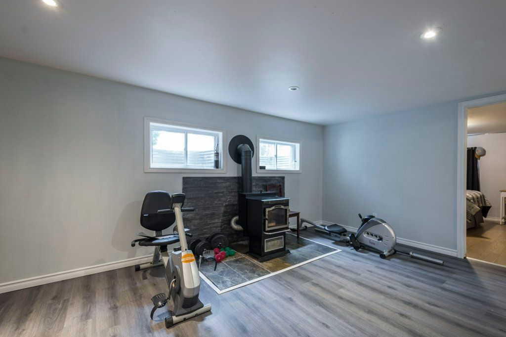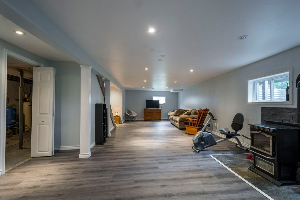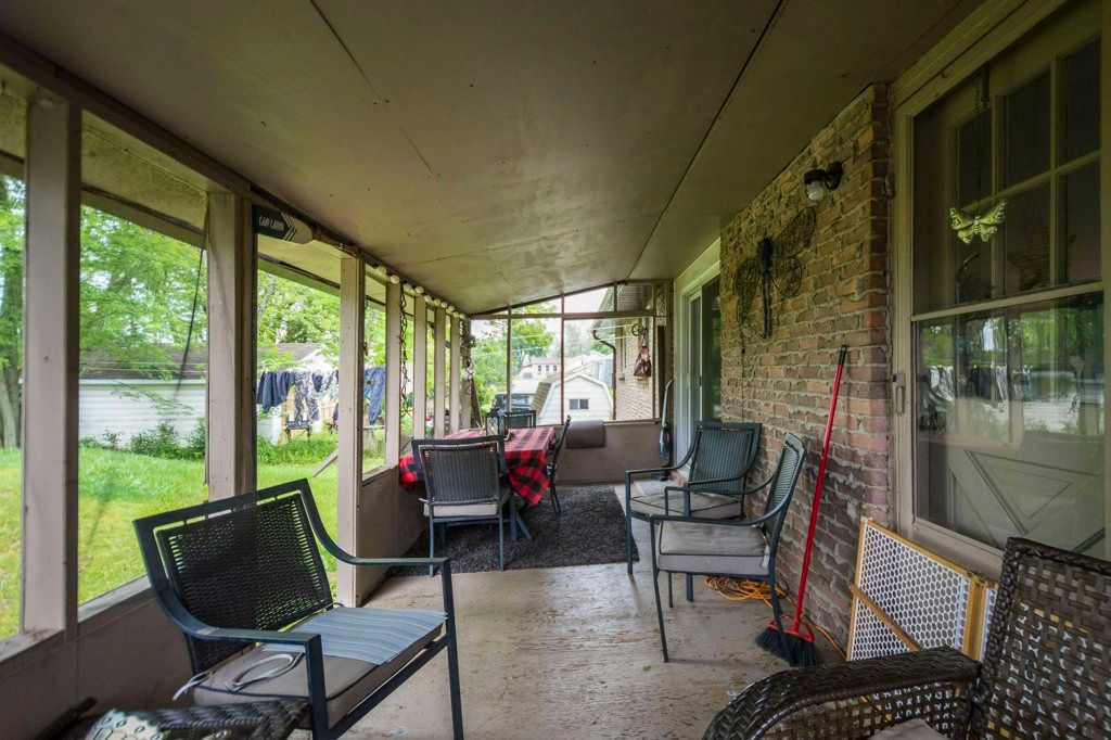 room to the enclosed porch and backyard. Travel downstairs to an oversized rec room with a pellet stove and