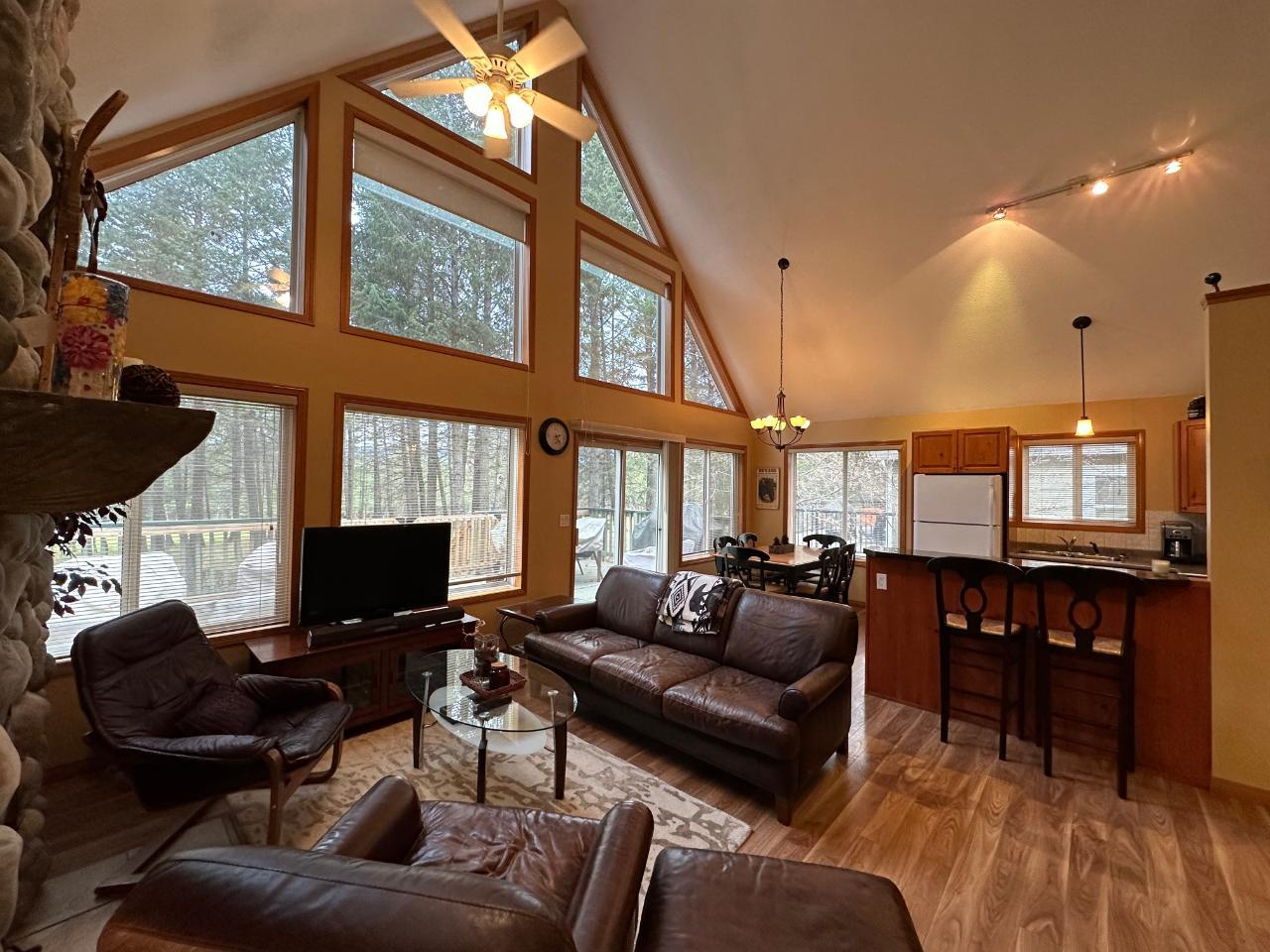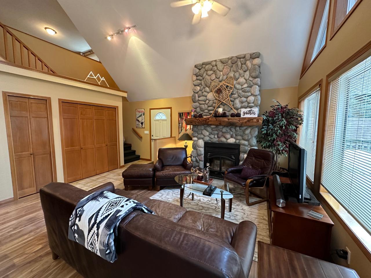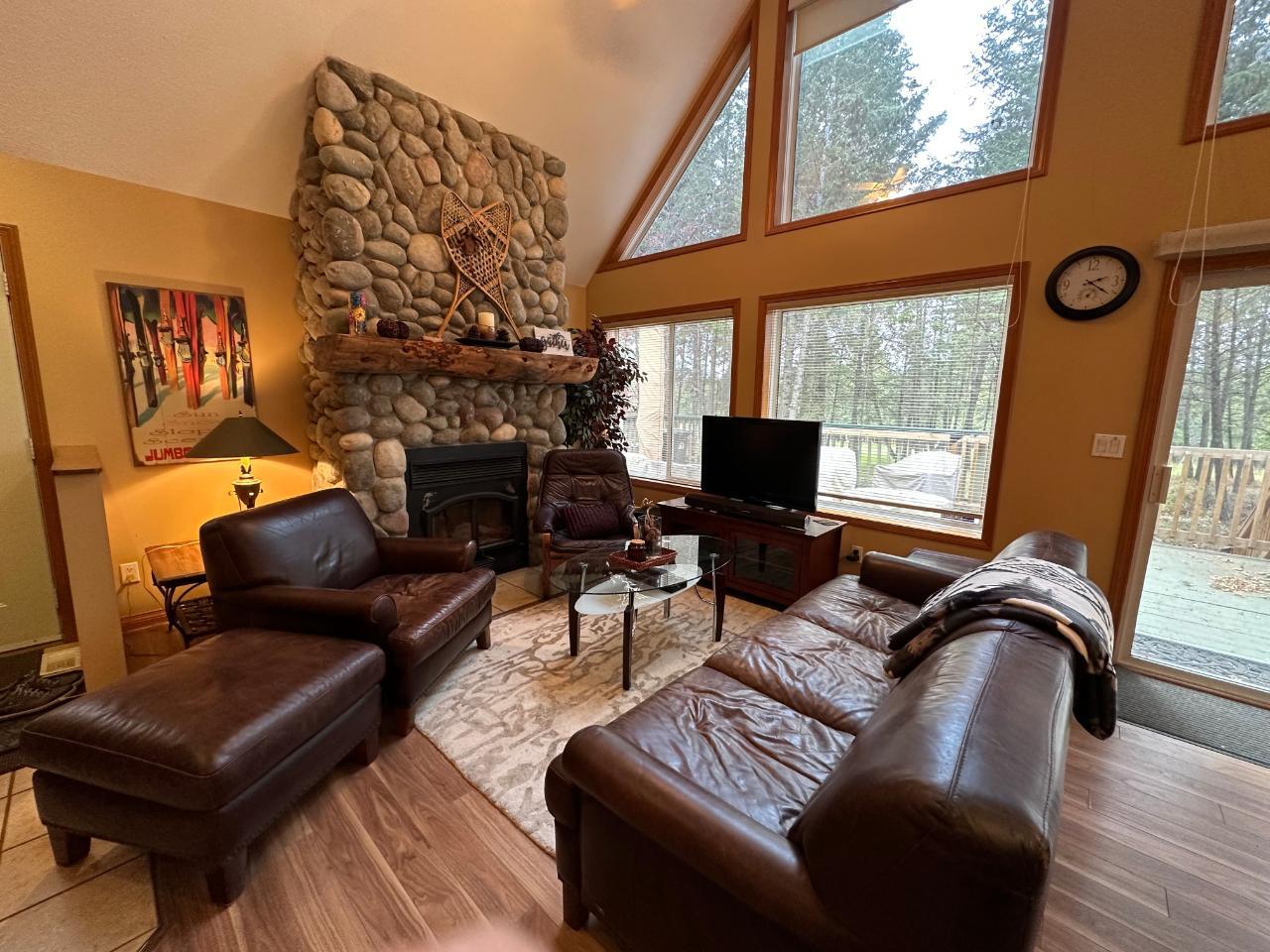 The mountain cabin you have been looking for! This Pine Cone Lane home backs on the 8th hole of the Springs Golf Course. High vaulted ceilings with lots of windows in the living room, kitchen and dining room with a floor to ceiling river rock wood burning fireplace will make this a special family space. Two bedrooms and a full bathroom round out this level. Upstairs there is a large main bedroom with a lovely sitting area, space for a desk and a full ensuite bathroom. The basement is framed and wired ready for your finishing touches. A nice family room and a 4th bedroom are almost complete. There is a rough-in for a 3rd bathroom as well. Outside the home has a very large gated deck that covers 3 sides of the home with all day sun and nice views of the Rockies. The exterior has been recently painted and the home is being sold furnished. Quick possession is available, you could be enjoying the holidays in your new home, don't let this one slip away, call your REALTOR(R) today. (id:22211)