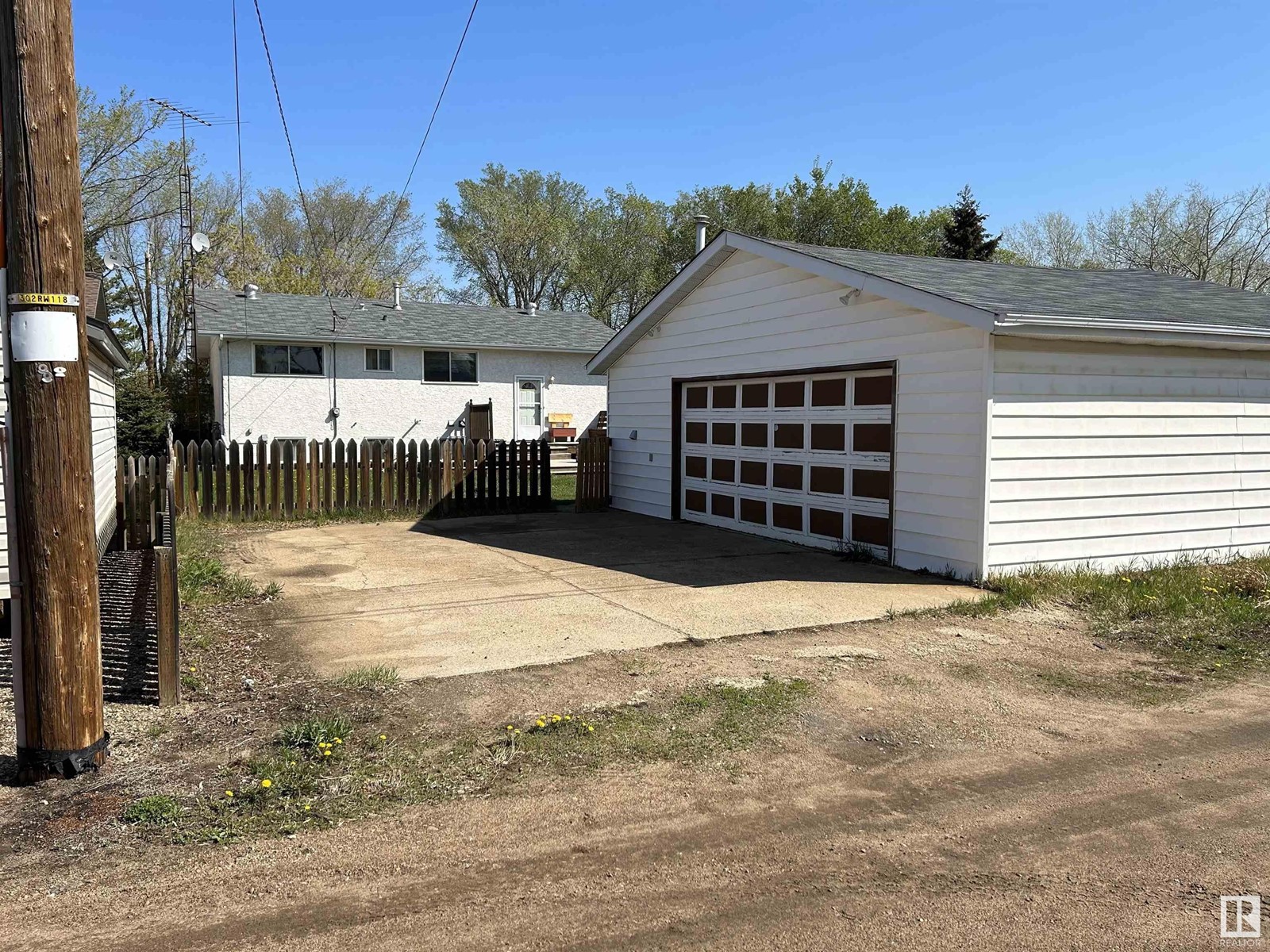 Welcome to this 1186 SqFt Bi-level located on a quiet street on the south side of Redwater. This home has a nice open floor plan on the main level consisting of living room, 4 piece bathroom , kitchen with dining area and 3 bedrooms with the primary having a 2 piece en suite. The basement is fully developed with large rec room, additional bedroom, bathroom and laundry room. The backyard is fully fenced and has a large heated detached garage with extra parking on the cement pad. (id:22211)