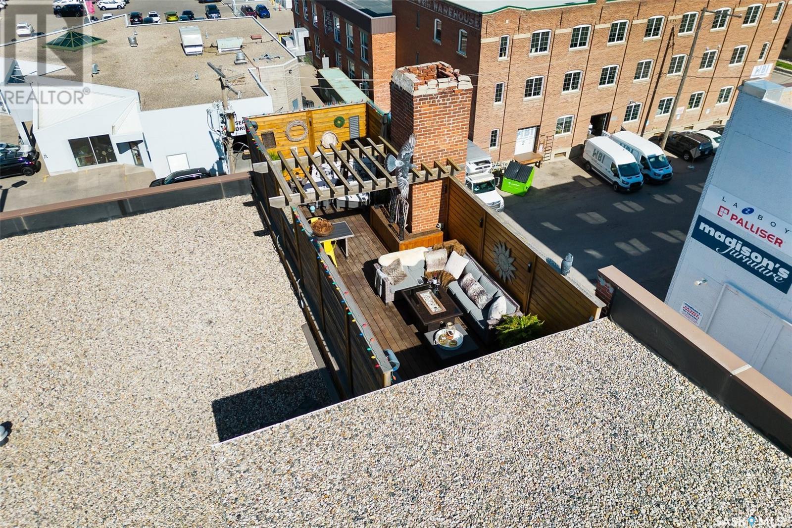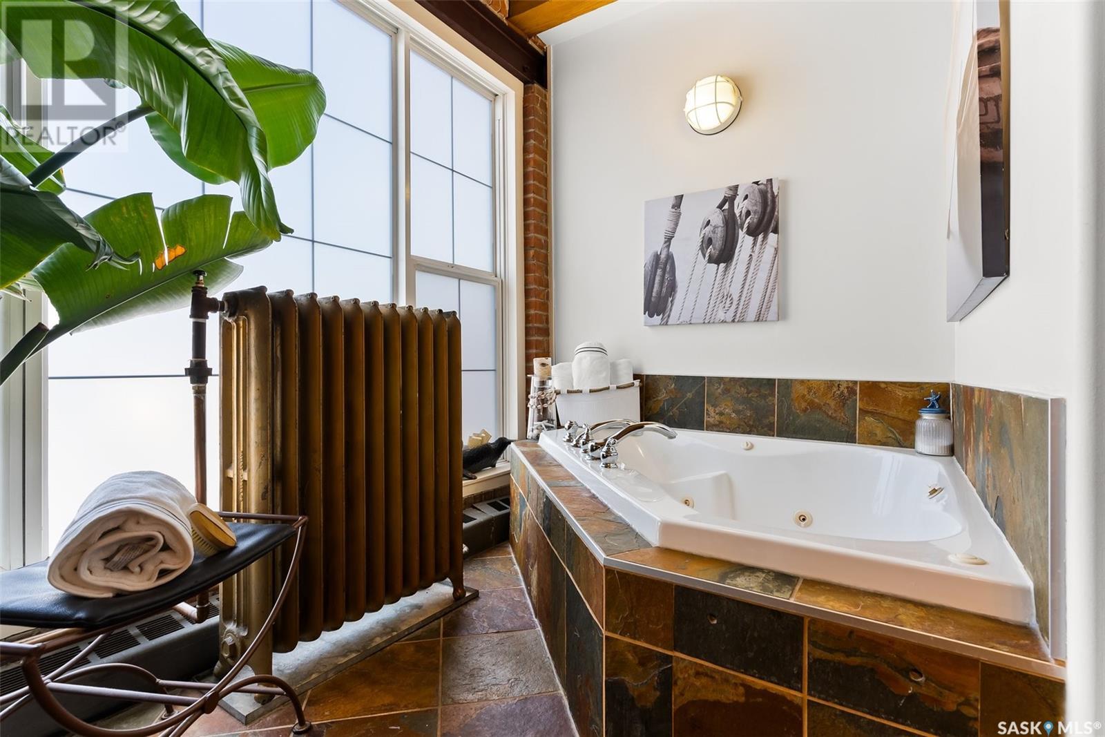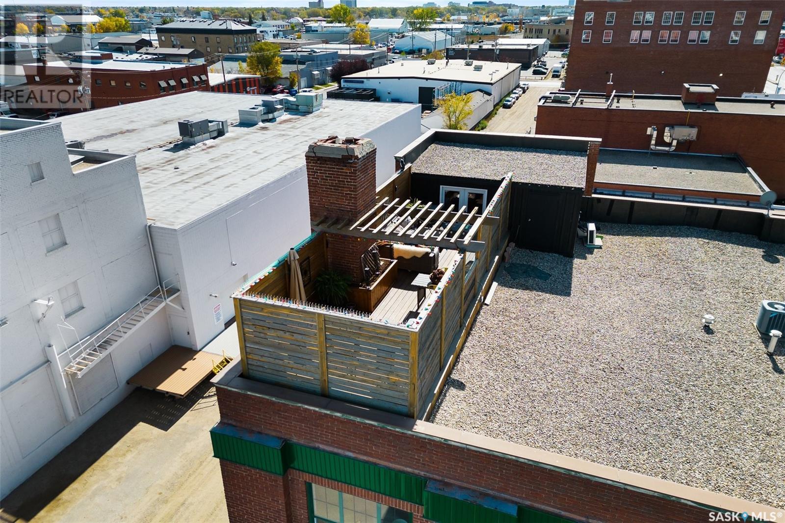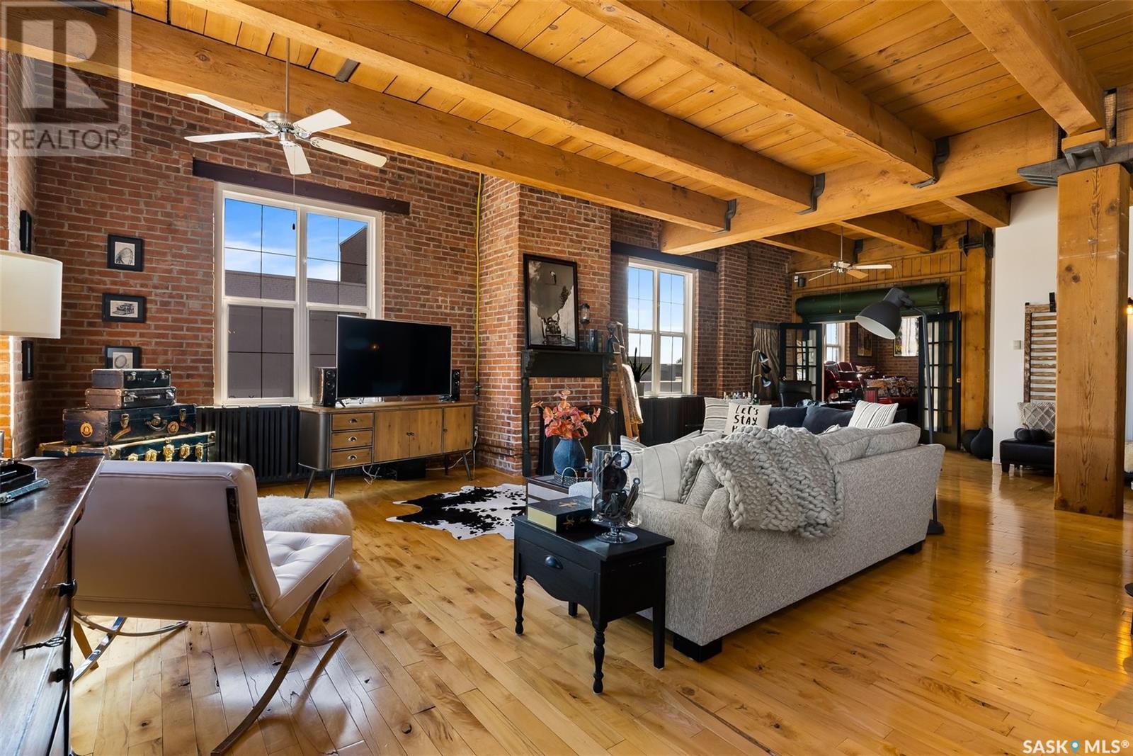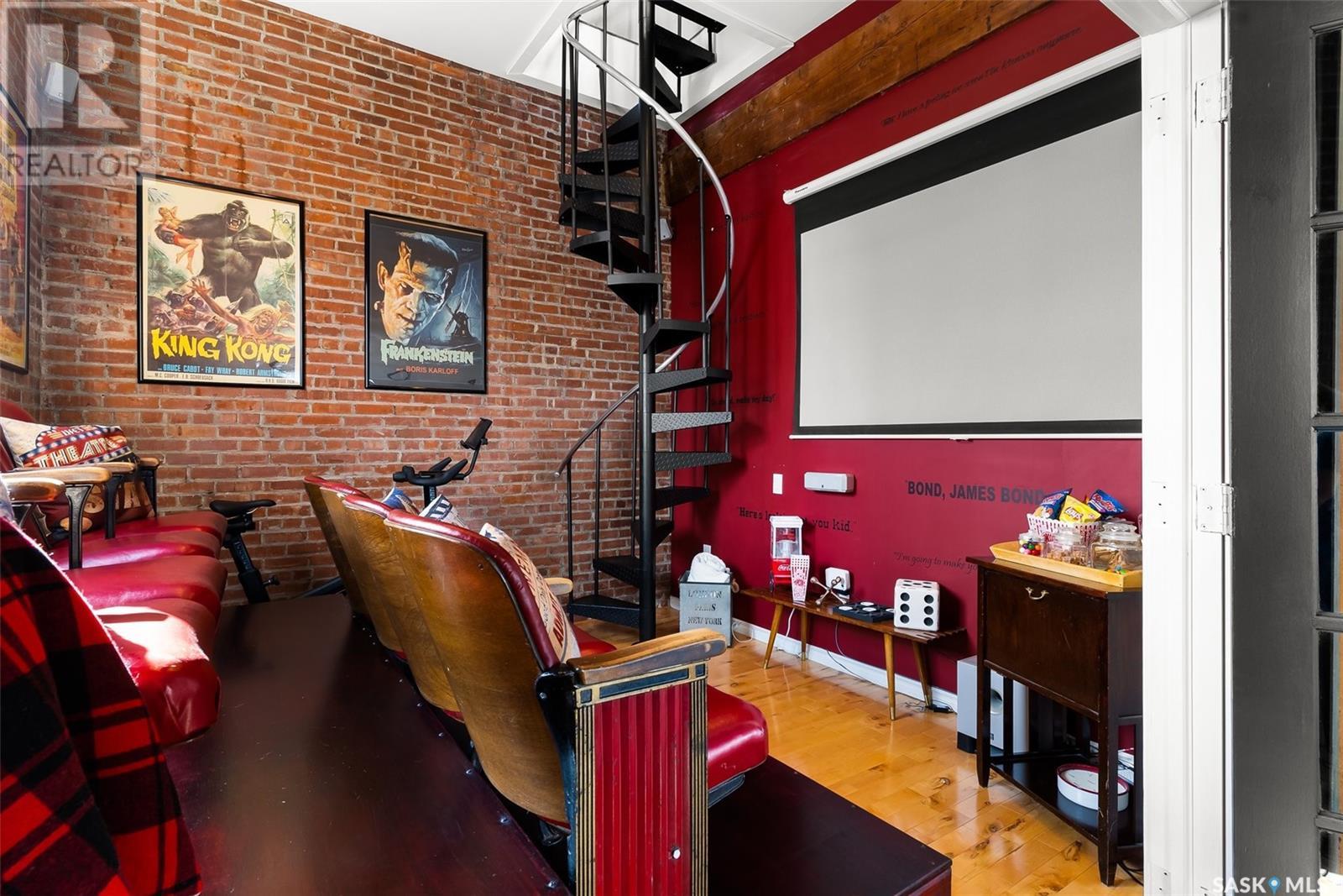Located in the heart of the warehouse district and close to Downtown Regina, This New York style loft apartment is sure to impress & has been meticulously maintained. This unit is both the largest and also the only one with a private rooftop patio. You can’t help but notice the exposed fir beams, brick walls & original character . The open concept living room, kitchen & dining room are filled with natural light & offer hardwood flooring . The kitchen offers plenty of cupboard/ counter space with neutral maple cabinetry, stainless steel appliances & a Bosch gas stove. The dining space is large enough to host any size family gatherings & has windows that overlook the city landscape! The living room features natural light & large entertaining space with endless possibilities! The primary bedroom features a double walk in closet& a fantastic 4 pc ensuite with jet tub& a fiat steam shower .The laundry room is located just off the primary ensuite . There is also a large guest room that also could be utilized as a den or home gym. Just down the hall you will find a tastefully decorated 2 pc powder room.Just off the main living room, you will find a unique & charming “theatre room” complete with antique theatre chairs, entertainment system & separate sonos speaker system. Within the theatre room, you’ll notice a unique circular stair case that leads to the best hidden gem in this property. There is an additional living space that could be utilized as a bonus room or addntl bedroom, this space leads directly to the completely private rooftop deck. The deck overlooks the city skyline and features 2 entry points, Brazilian cherry hardwood, a speaker system & views that are unlike any other ! Additional value added features incl: 2 electrified parking stalls, basement storage space, newly rented boiler system, and so much more .The possibilities are endless in this unit and would be perfect for a young professional or those looking to live in a unique and beautiful apartment! (id:22211)