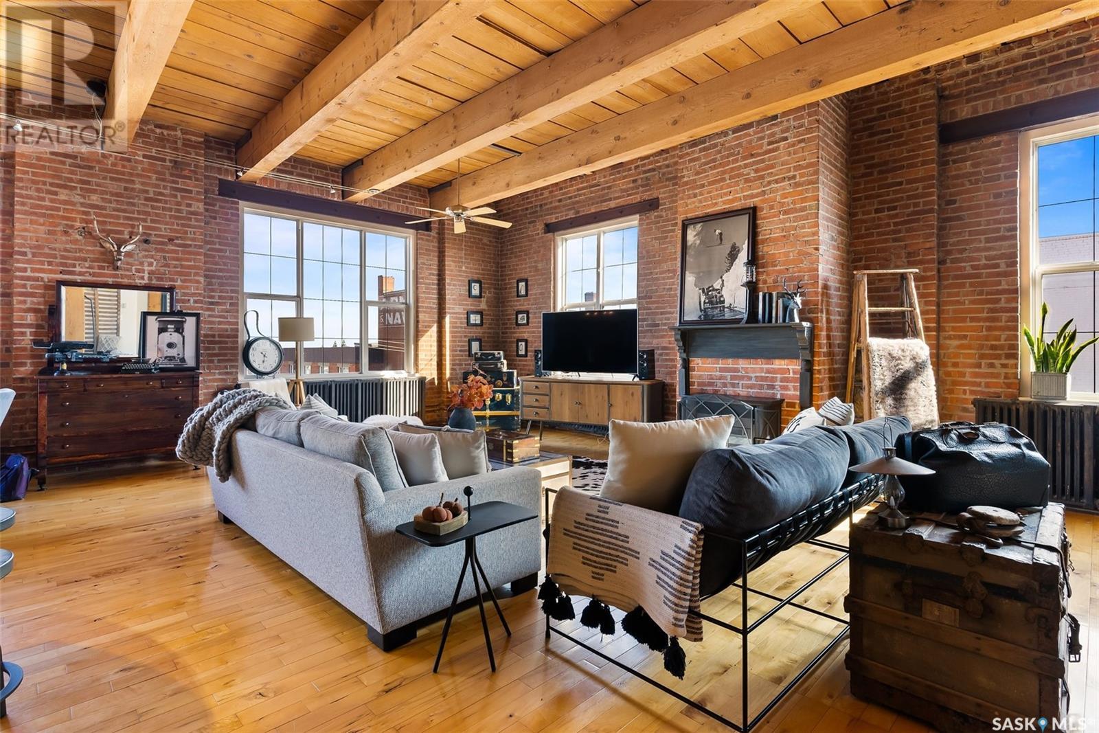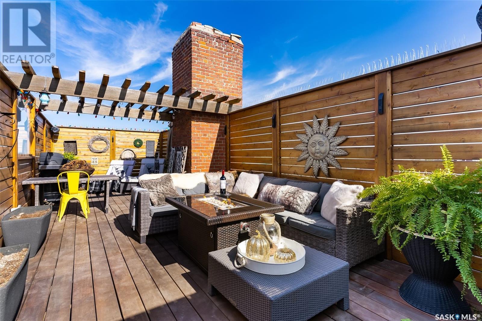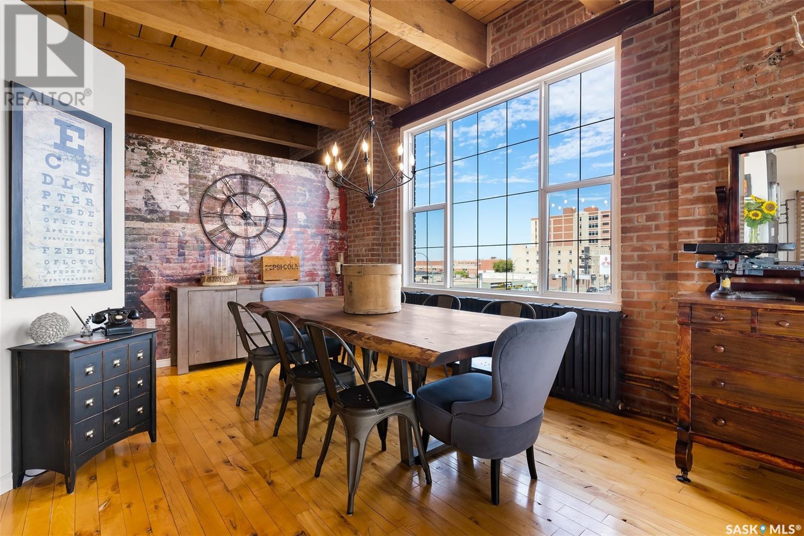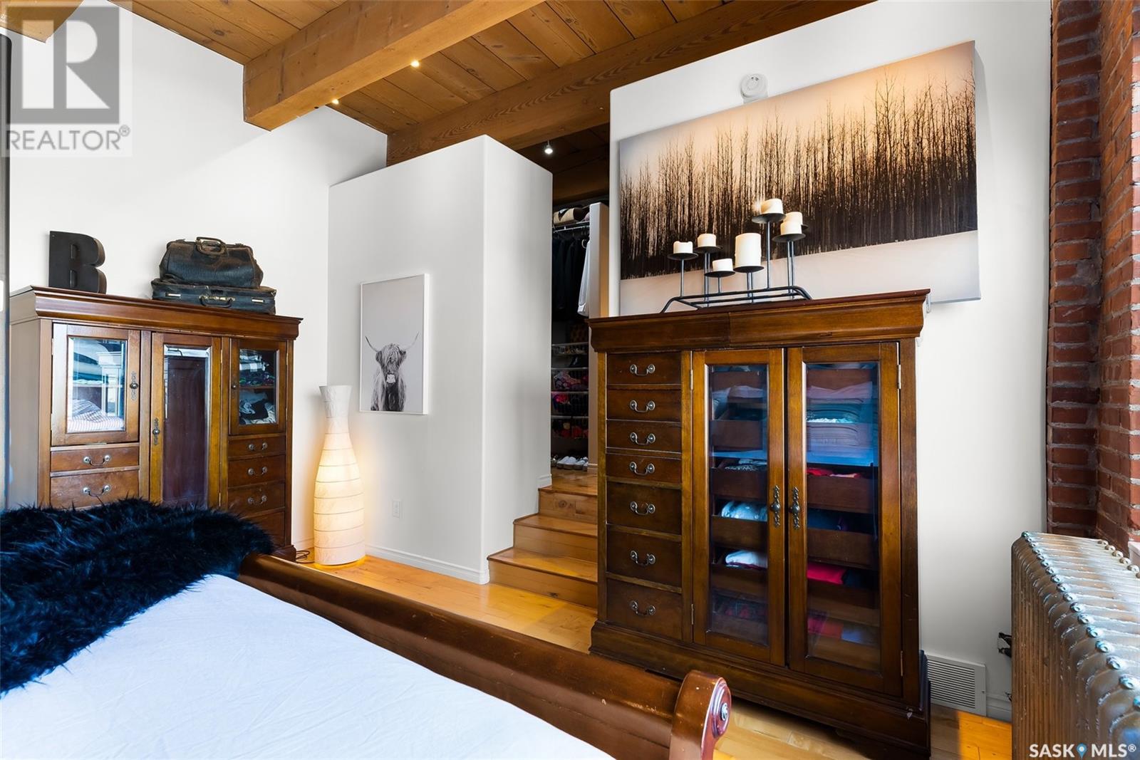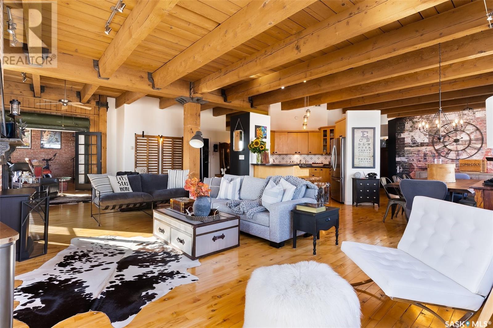 Located in the heart of the warehouse district and close to Downtown Regina, This New York style loft apartment is sure to impress & has been meticulously maintained. This unit is both the largest and also the only one with a private rooftop patio. You can’t help but notice the exposed fir beams, brick walls & original character . The open concept living room, kitchen & dining room are filled with natural light & offer hardwood flooring . The kitchen offers plenty of cupboard/ counter space with neutral maple cabinetry, stainless steel appliances & a Bosch gas stove. The dining space is large enough to host any size family gatherings & has windows that overlook the city landscape! The living room features natural light & large entertaining space with endless possibilities! The primary bedroom features a double walk in closet& a fantastic 4 pc ensuite with jet tub& a fiat steam shower .The laundry room is located just off the primary ensuite . There is also a large guest room that also could be utilized as a den or home gym. Just down the hall you will find a tastefully decorated 2 pc powder room.Just off the main living room, you will find a unique & charming “theatre room” complete with antique theatre chairs, entertainment system & separate sonos speaker system. Within the theatre room, you’ll notice a unique circular stair case that leads to the best hidden gem in this property. There is an additional living space that could be utilized as a bonus room or addntl bedroom, this space leads directly to the completely private rooftop deck. The deck overlooks the city skyline and features 2 entry points, Brazilian cherry hardwood, a speaker system & views that are unlike any other ! Additional value added features incl: 2 electrified parking stalls, basement storage space, newly rented boiler system, and so much more .The possibilities are endless in this unit and would be perfect for a young professional or those looking to live in a unique and beautiful apartment! (id:22211)