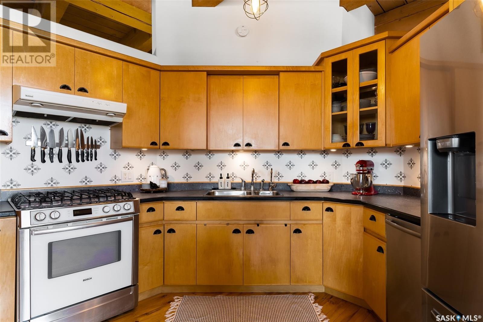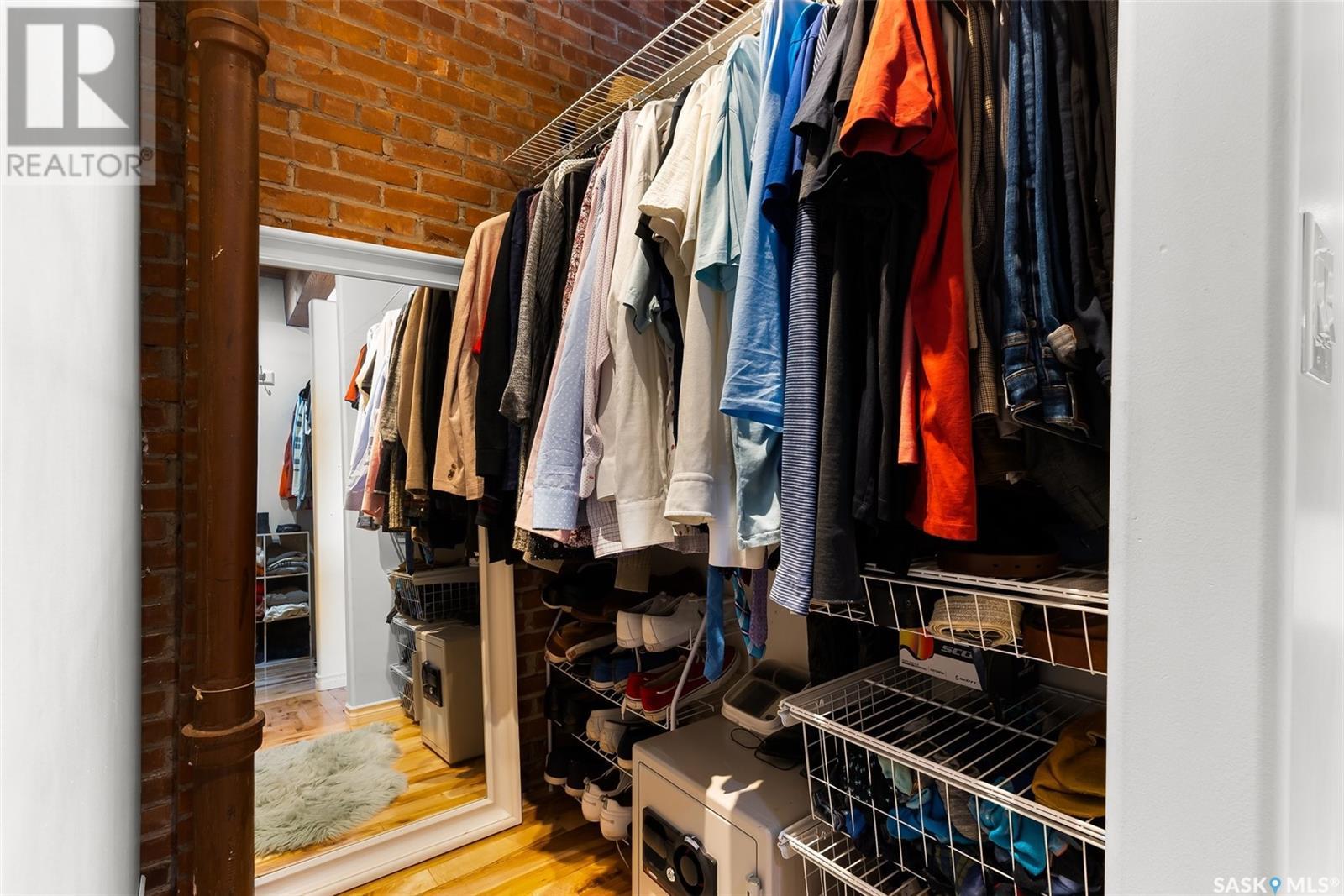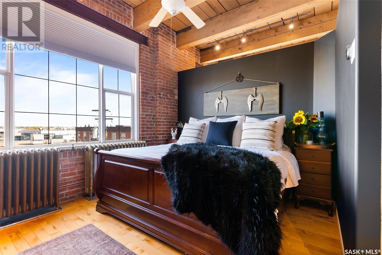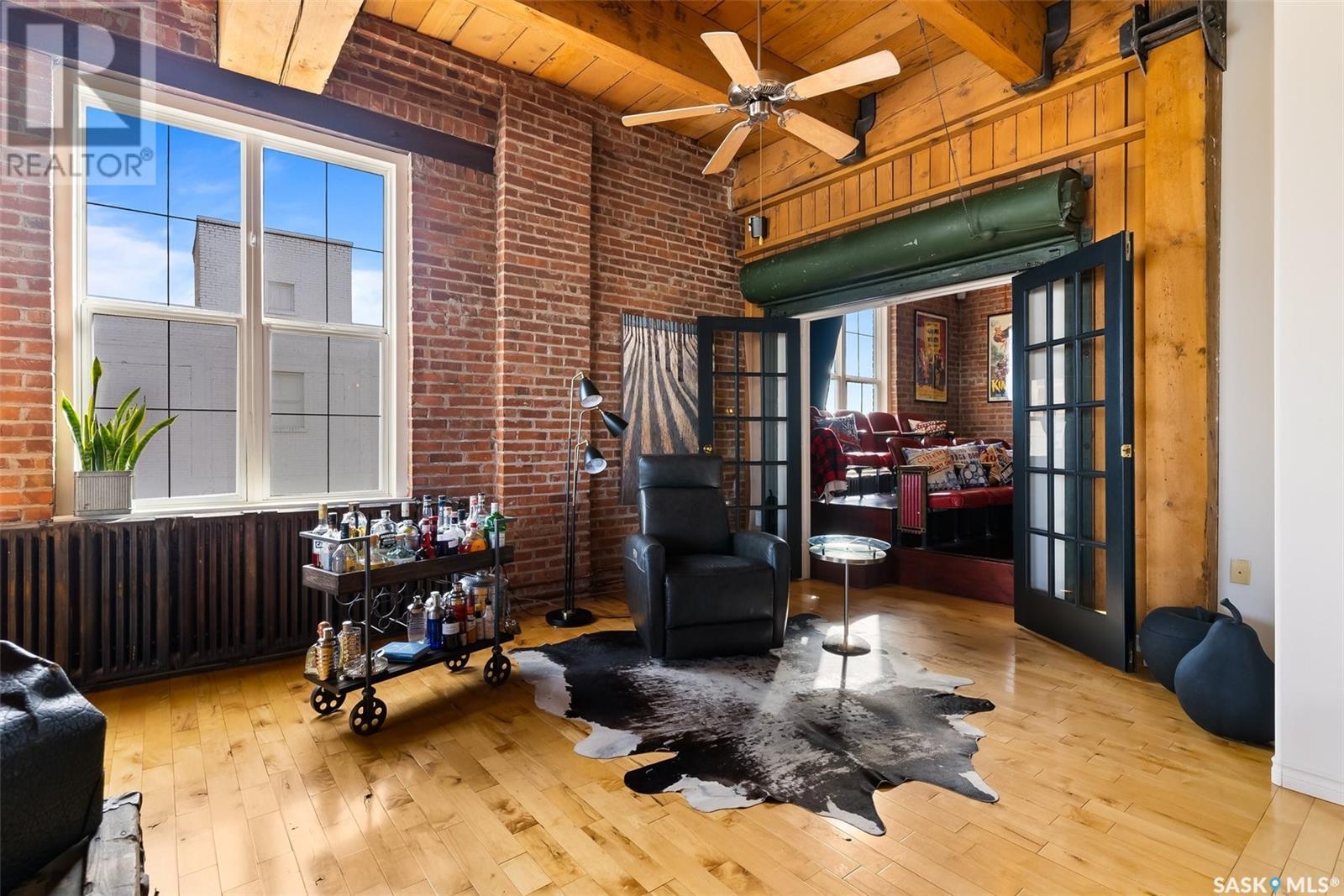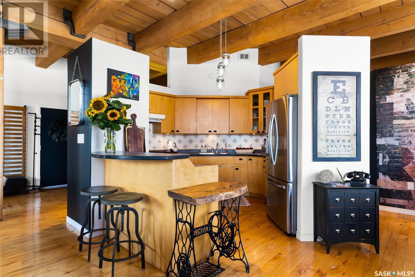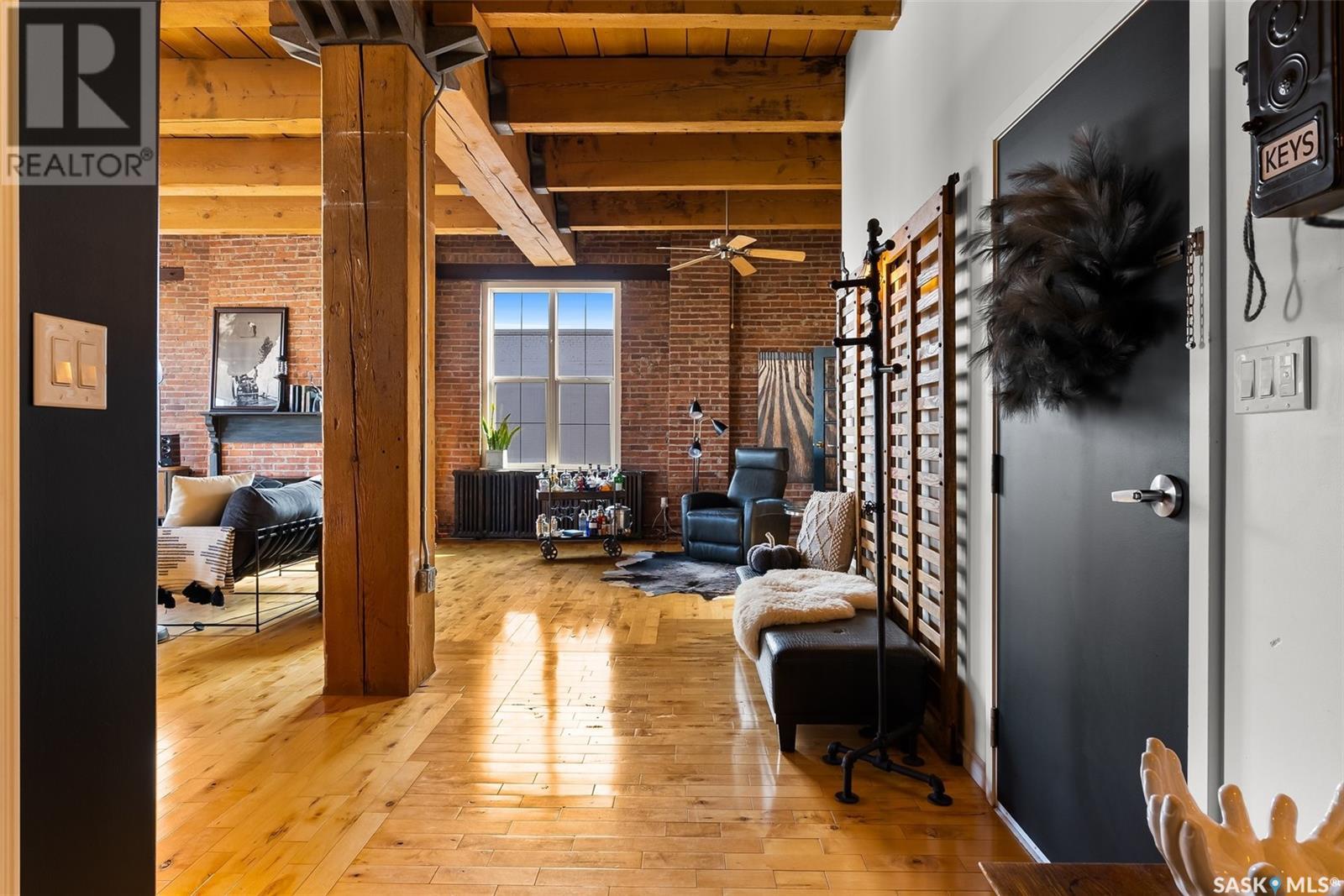 Located in the heart of the warehouse district and close to Downtown Regina, This New York style loft apartment is sure to impress & has been meticulously maintained. This unit is both the largest and also the only one with a private rooftop patio. You can’t help but notice the exposed fir beams, brick walls & original character . The open concept living room, kitchen & dining room are filled with natural light & offer hardwood flooring . The kitchen offers plenty of cupboard/ counter space with neutral maple cabinetry, stainless steel appliances & a Bosch gas stove. The dining space is large enough to host any size family gatherings & has windows that overlook the city landscape! The living room features natural light & large entertaining space with endless possibilities! The primary bedroom features a double walk in closet& a fantastic 4 pc ensuite with jet tub& a fiat steam shower .The laundry room is located just off the primary ensuite . There is also a large guest room that also could be utilized as a den or home gym. Just down the hall you will find a tastefully decorated 2 pc powder room.Just off the main living room, you will find a unique & charming “theatre room” complete with antique theatre chairs, entertainment system & separate sonos speaker system. Within the theatre room, you’ll notice a unique circular stair case that leads to the best hidden gem in this property. There is an additional living space that could be utilized as a bonus room or addntl bedroom, this space leads directly to the completely private rooftop deck. The deck overlooks the city skyline and features 2 entry points, Brazilian cherry hardwood, a speaker system & views that are unlike any other ! Additional value added features incl: 2 electrified parking stalls, basement storage space, newly rented boiler system, and so much more .The possibilities are endless in this unit and would be perfect for a young professional or those looking to live in a unique and beautiful apartment! (id:22211)