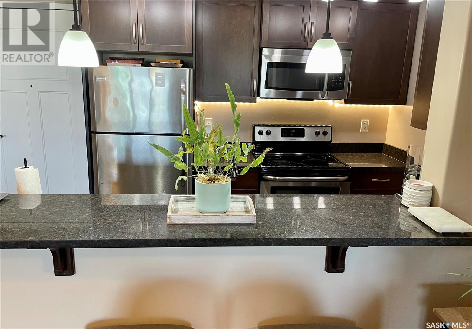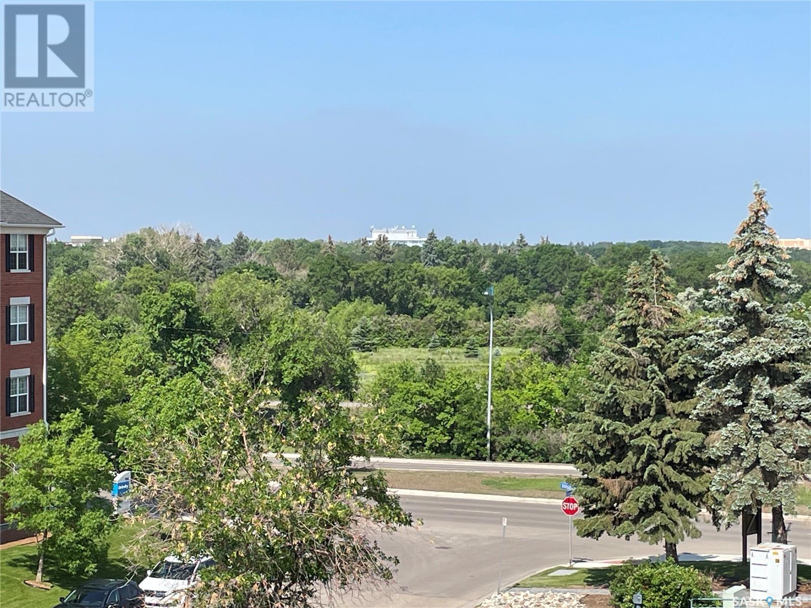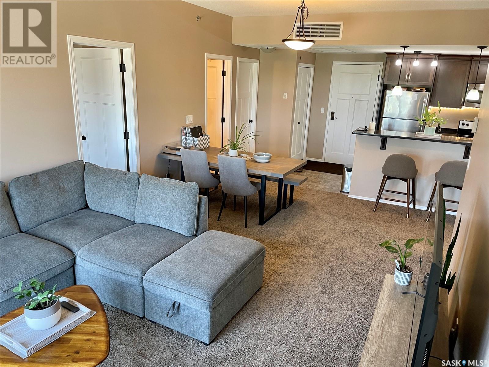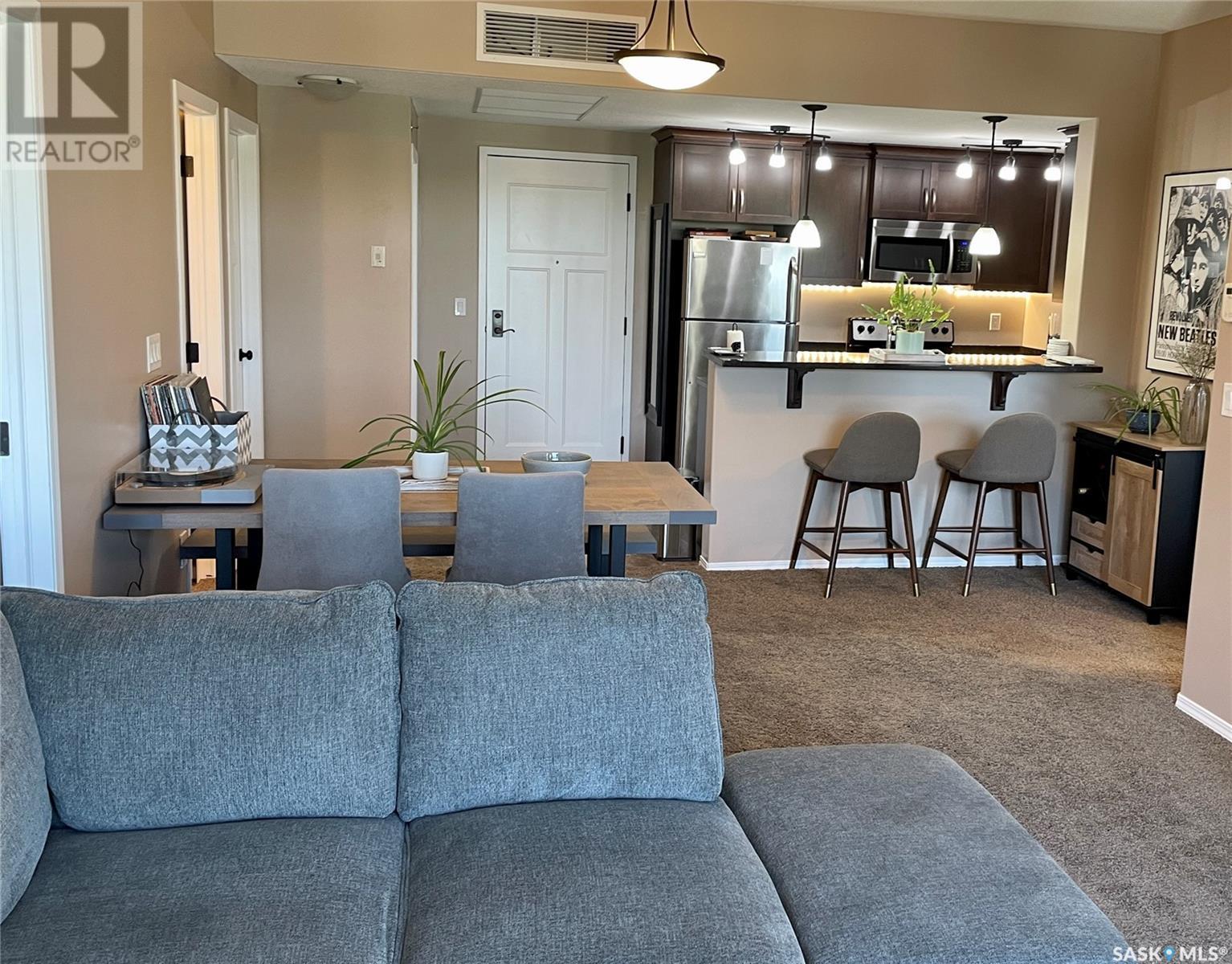 Fabulous 2 bed, 2 bath top floor condo ideally located within walking distance to the University of Regina, Wascana Park, Conexus Art Centre, close to downtown, and all south end amenities. Unit offers an open concept living, dining and kitchen area. Galley style kitchen includes a BI dishwasher, stainless steel appliances, and an eating bar. Living room features a large window overlooking the outdoor deck space and offers nice views of the city and legislative buildings. Generous size primary bedroom offers a 3 piece ensuite featuring a walk in shower. Additional bedroom, a 4 piece bath, laundry/utility/ storage room complete the unit. Covered patio deck is a perfect spot to enjoy a summer evening, or a morning coffee. Added bonus of this unit is the additional storage locker located in the underground parking garage, as well as the one underground parking stall and additional surface stall that is large enough to accommodate a larger truck. This complex also offers an exercise room, bike storage area, amenities room, elevator, and visitor parking. Condo fees include heat, water, sewer, snow removal, common area maintenance, common area insurance, and reserve fund. This unit is a pleasure to show! Please contact sales agent for more info. (id:22211)
