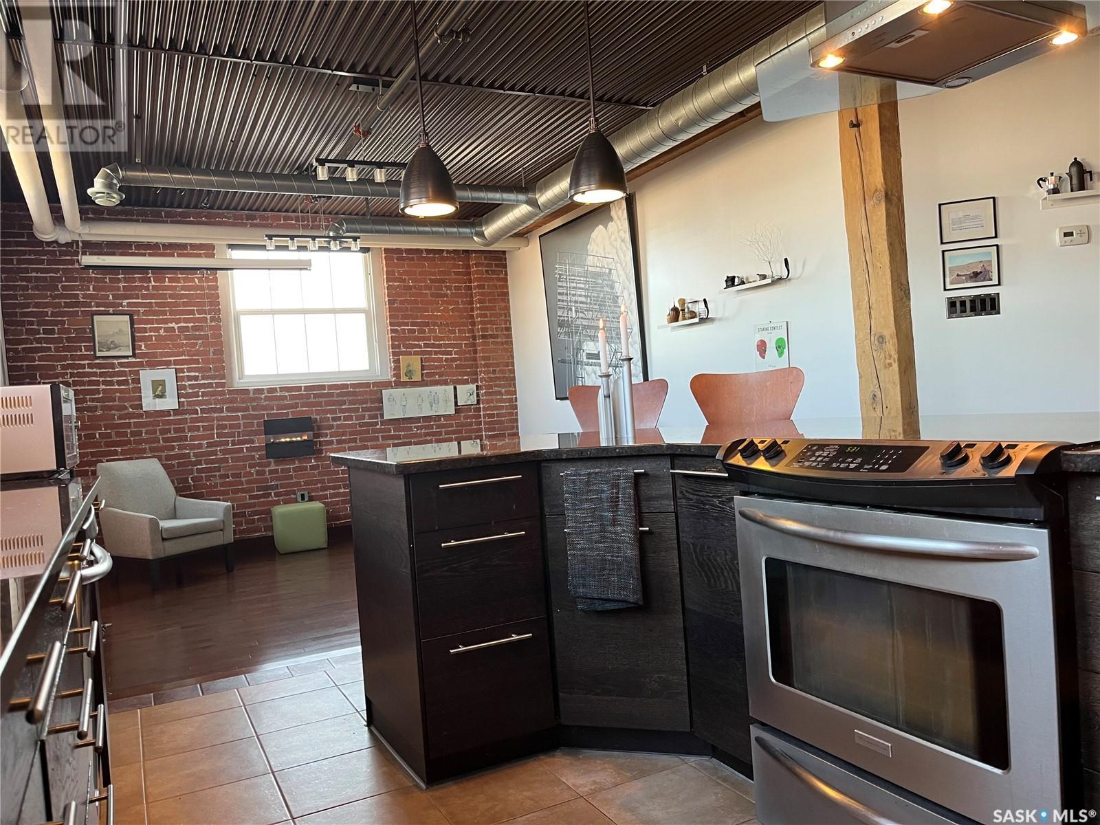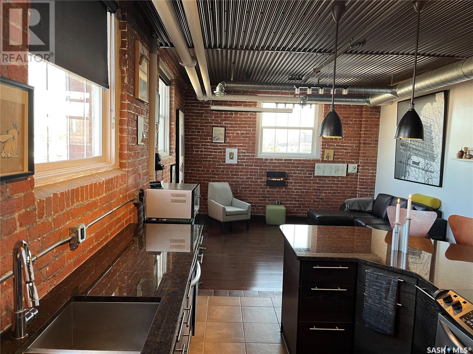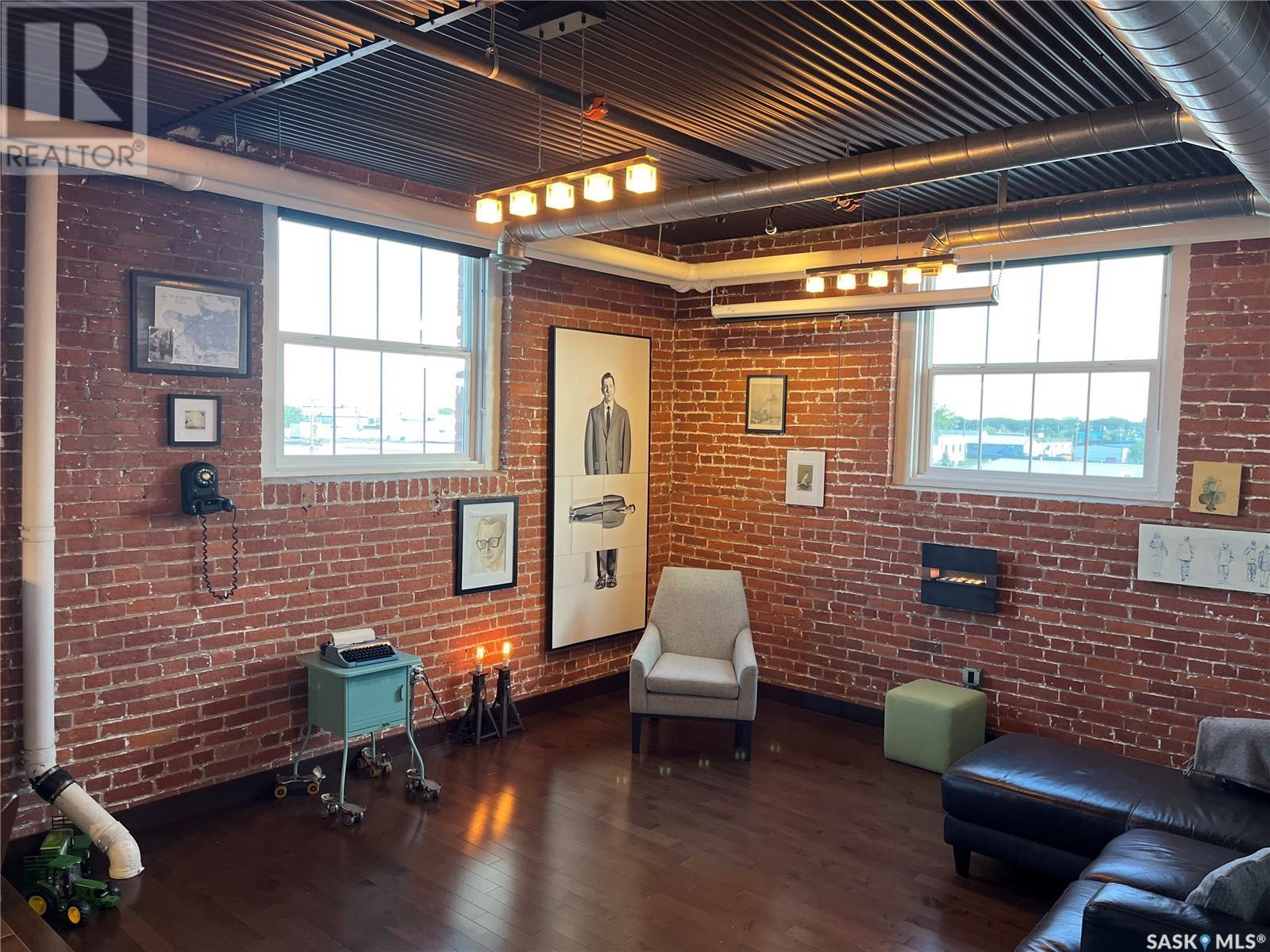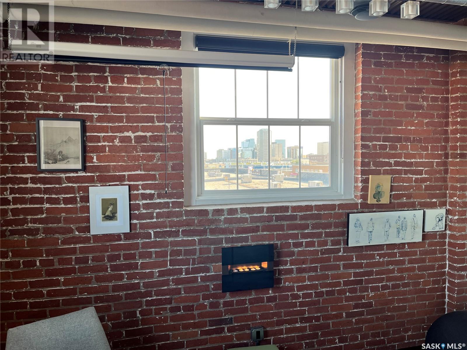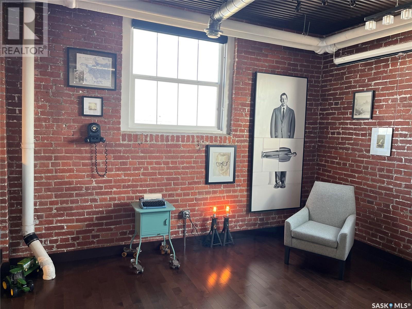 New York style and class right here in Regina. Beautiful south east corner warehouse loft condo in the Brownstone Plaza. Warehouse loft character exposed brick, post and beam. 1 bedroom with newly updated 3piece en-suite bathroom, large 4 piece main bathroom with bubble tub. In floor heat in kitchen and main bathroom. Large laundry/storage room, plus large in unit storage/office with separate entrance. Gated lot parking stall with electric gate opener. Condo fees include water, sewer, heat, exterior building maintenance, interior common maintenance, elevator, intercom, common insurance, and reserve fund. $339,900 Carefree living in Regina’s up and coming Warehouse District. (id:22211)