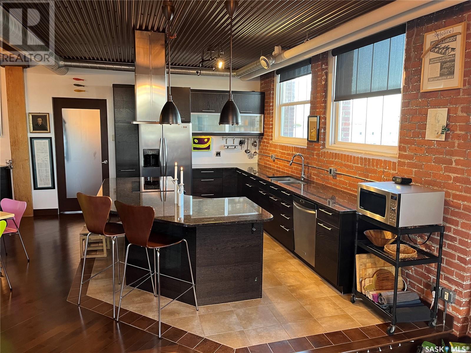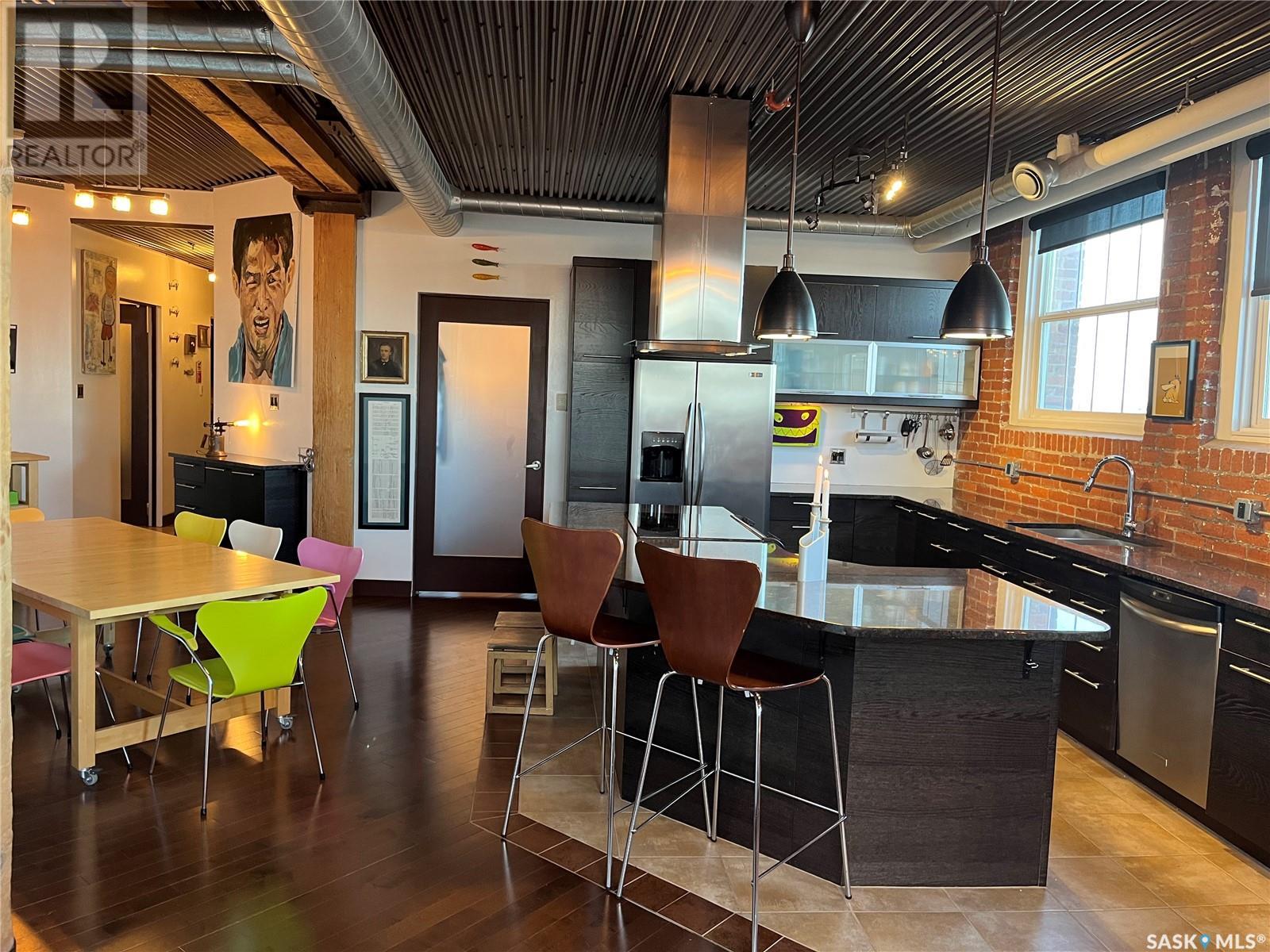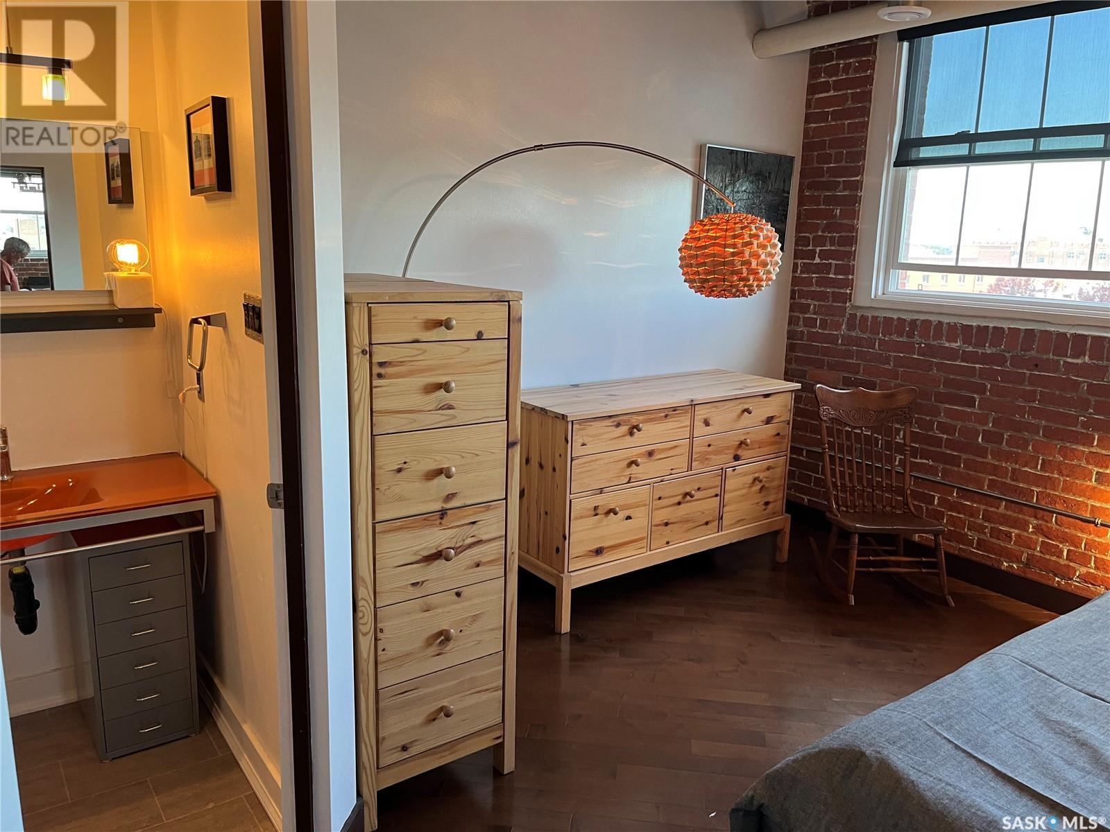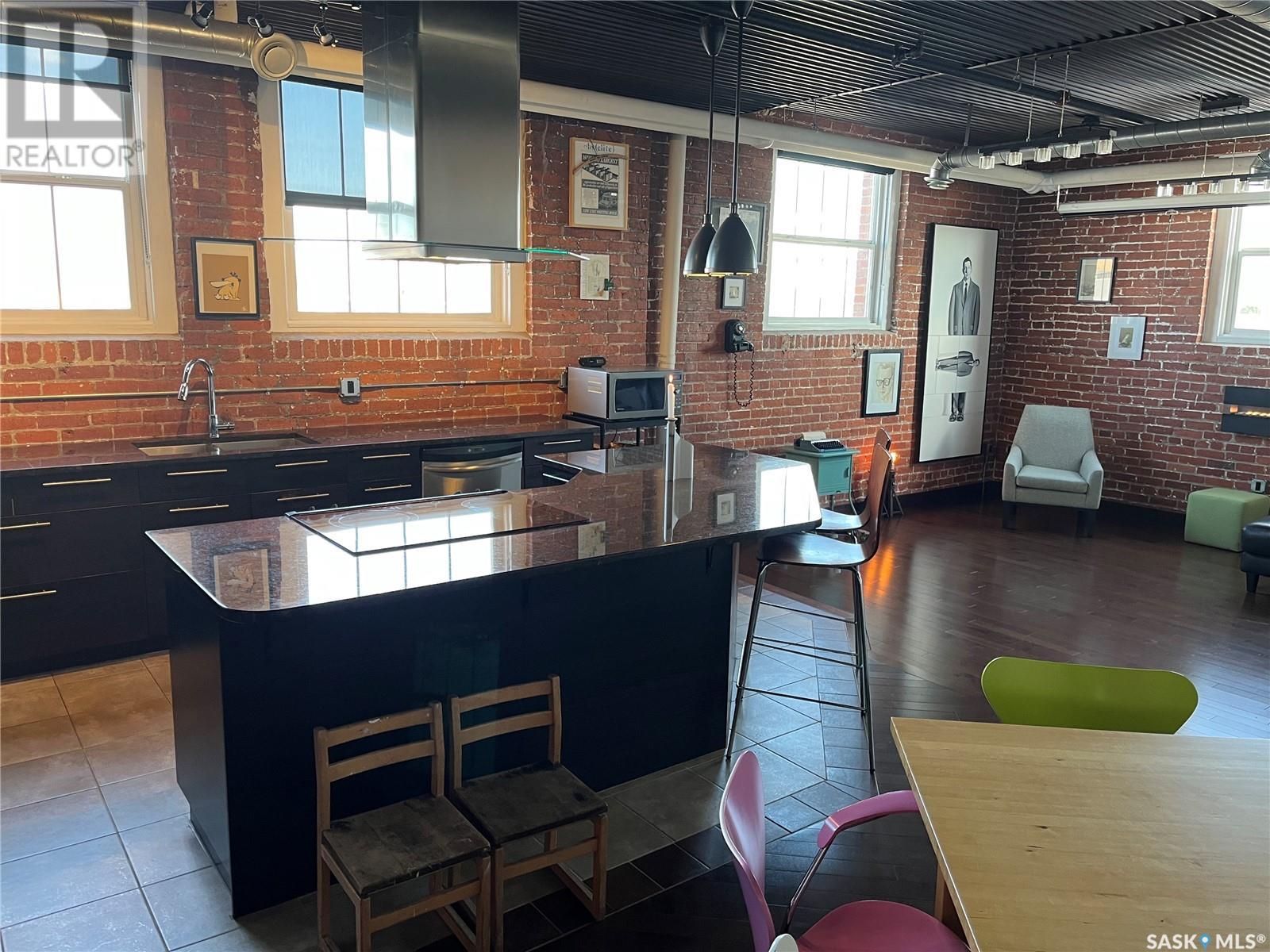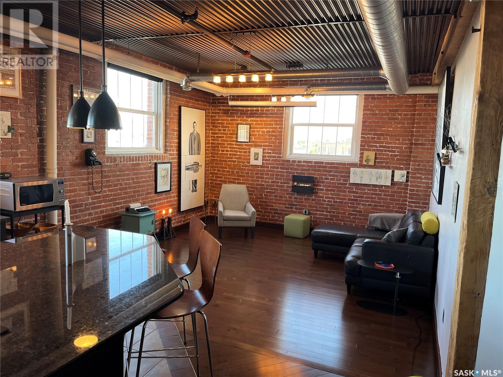 New York style and class right here in Regina. Beautiful south east corner warehouse loft condo in the Brownstone Plaza. Warehouse loft character exposed brick, post and beam. 1 bedroom with newly updated 3piece en-suite bathroom, large 4 piece main bathroom with bubble tub. In floor heat in kitchen and main bathroom. Large laundry/storage room, plus large in unit storage/office with separate entrance. Gated lot parking stall with electric gate opener. Condo fees include water, sewer, heat, exterior building maintenance, interior common maintenance, elevator, intercom, common insurance, and reserve fund. $339,900 Carefree living in Regina’s up and coming Warehouse District. (id:22211)