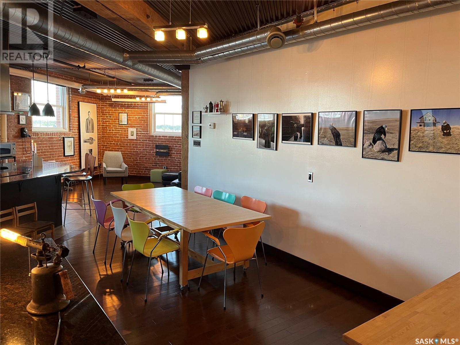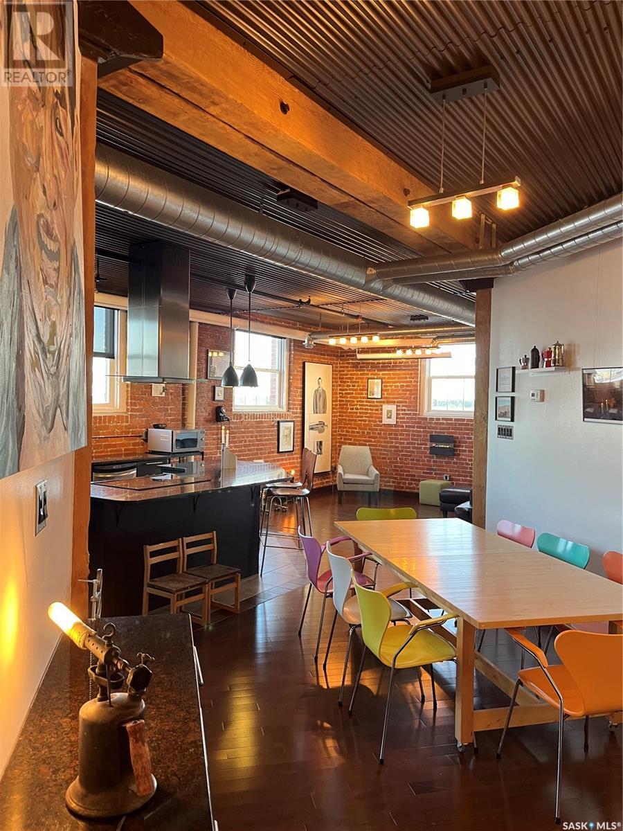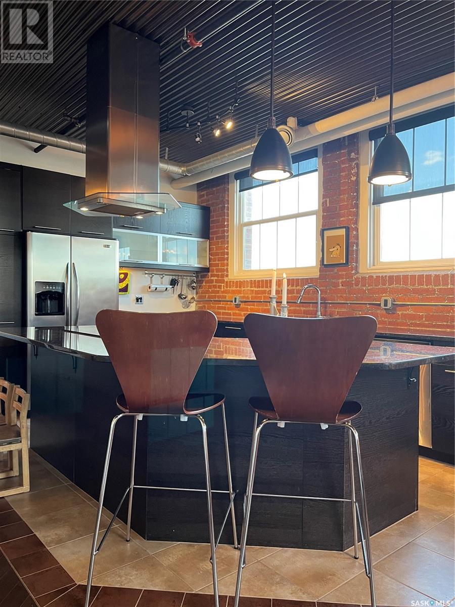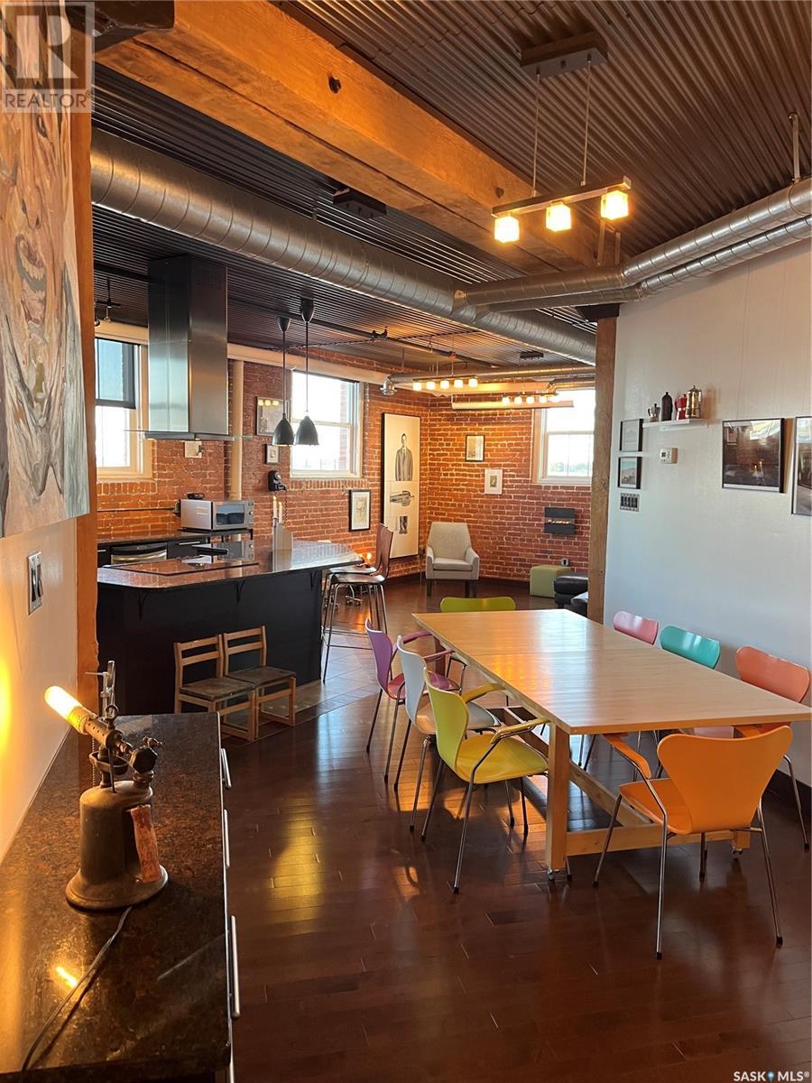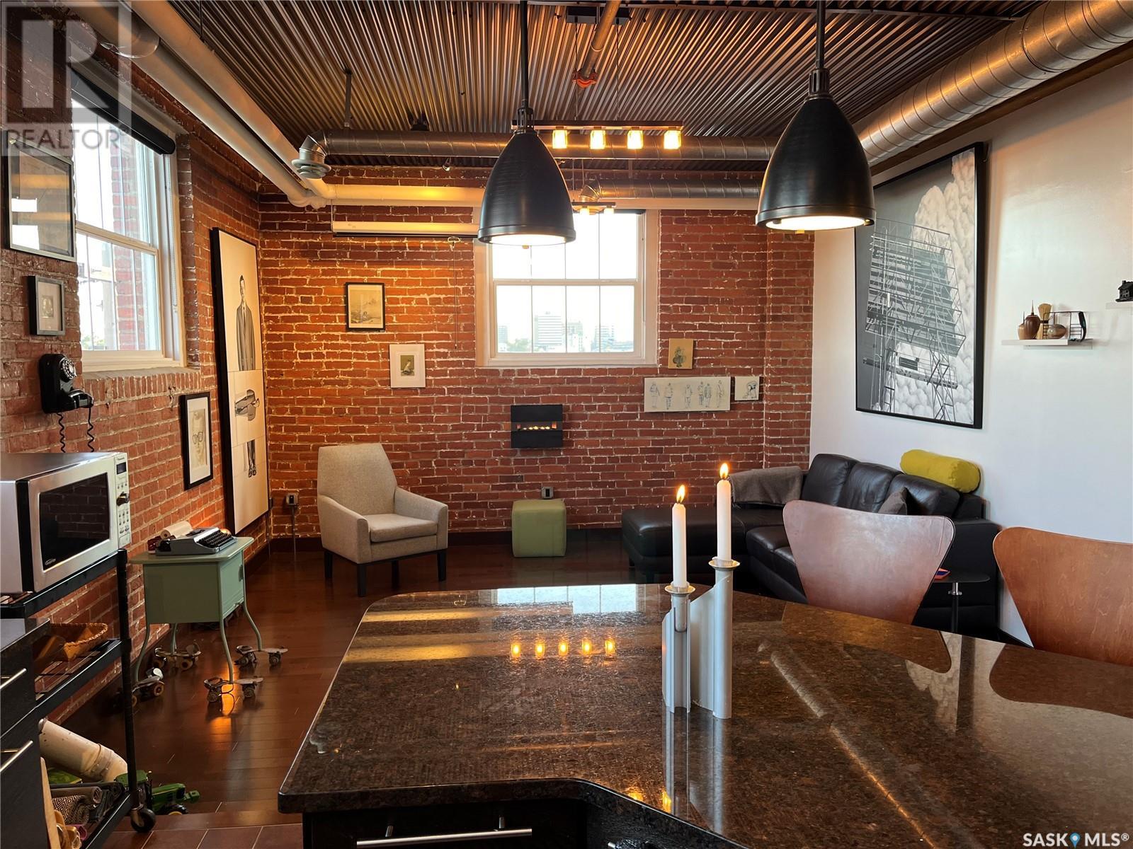 New York style and class right here in Regina. Beautiful south east corner warehouse loft condo in the Brownstone Plaza. Warehouse loft character exposed brick, post and beam. 1 bedroom with newly updated 3piece en-suite bathroom, large 4 piece main bathroom with bubble tub. In floor heat in kitchen and main bathroom. Large laundry/storage room, plus large in unit storage/office with separate entrance. Gated lot parking stall with electric gate opener. Condo fees include water, sewer, heat, exterior building maintenance, interior common maintenance, elevator, intercom, common insurance, and reserve fund. $339,900 Carefree living in Regina’s up and coming Warehouse District. (id:22211)