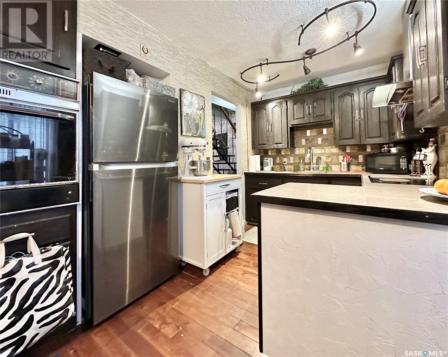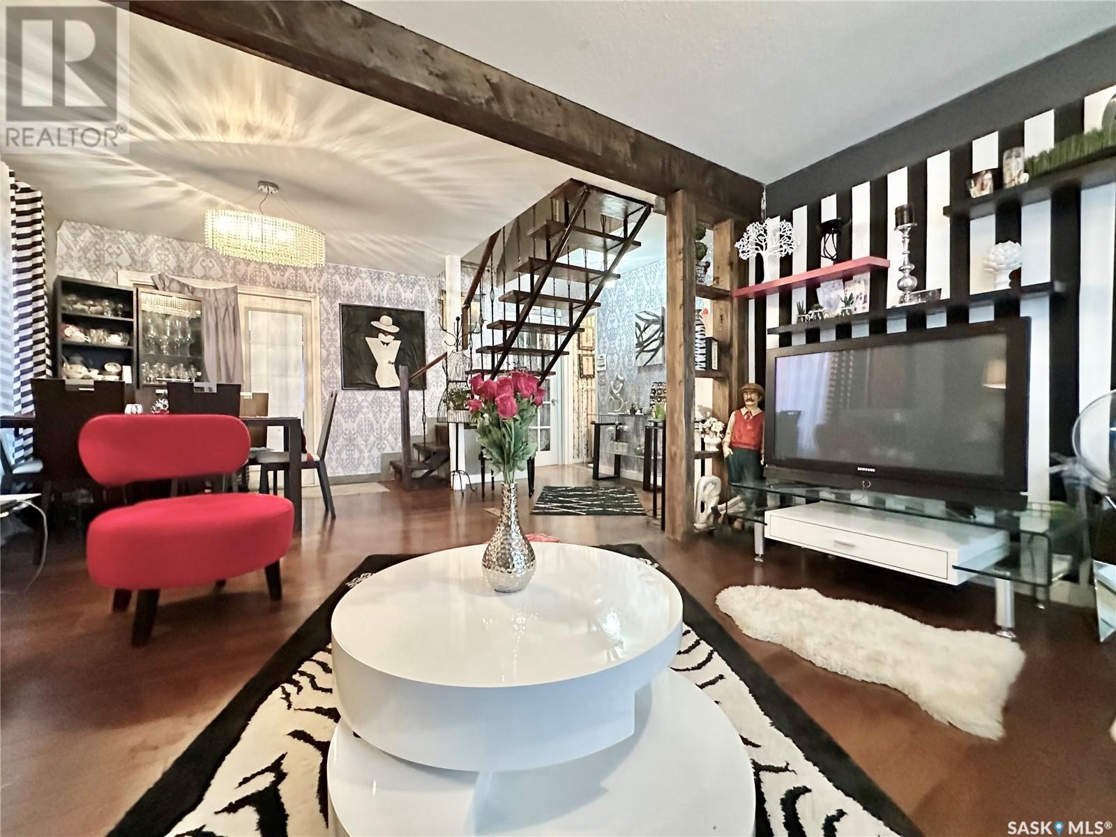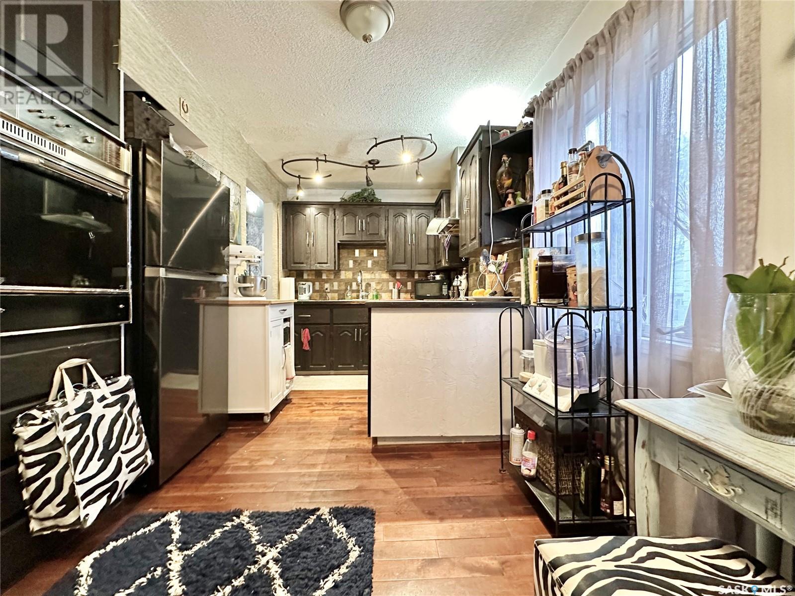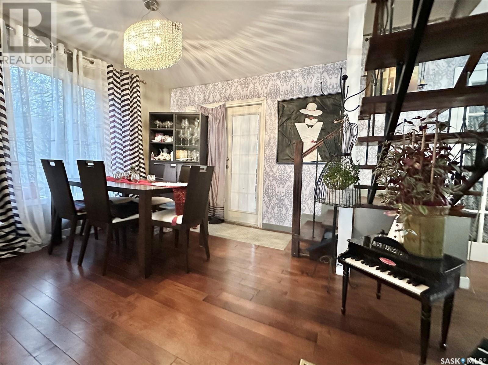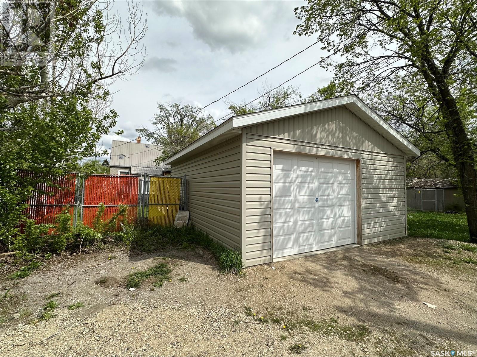 Lovely home centrally located full of character and charm. Bright open concept main level shows off the open stairway leading to upper level. Medium toned hardwood flooring throughout main level with trendy contrasting wall colour. Kitchen has espresso cabinets with a built-in oven, stove top and loads of storage. Room for a table and chairs or stools for the breakfast bar. Spacious living room and dining room lead to a sunroom that is your personal private getaway. This is where you can escape with a beverage and book. Beyond the sunroom is a fenced yard with an oversized single garage and additional parking. Back gate opens so you can park a RV camper or have easy access to your backyard. Bathroom has been updated to include soaker tub, surround, sliding glass shower doors and pedestal sink with storage under. Upper level has two good-sized bedrooms with hardwood floors. Back entry will hold all your outdoor gear and leads to lower level that is partially developed. This home is nicely maintained and close to major arteries of Regina. Central air. Metal roof. Newer furnace. (rented) (id:22211)