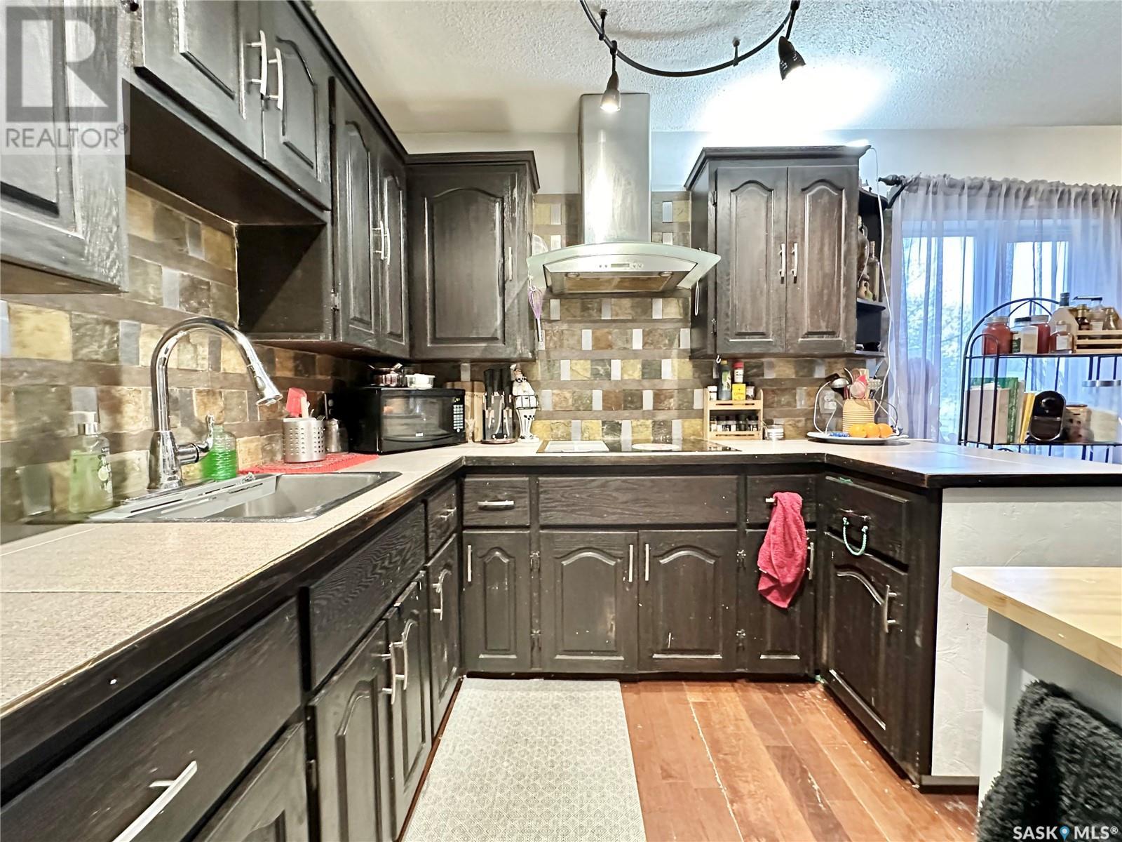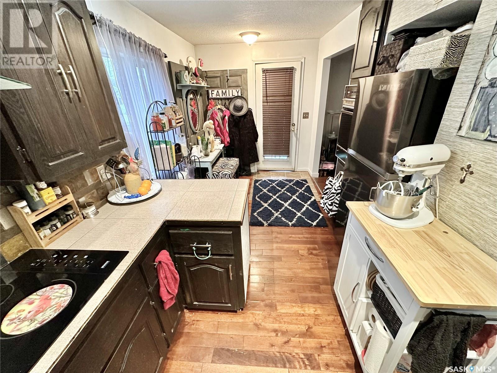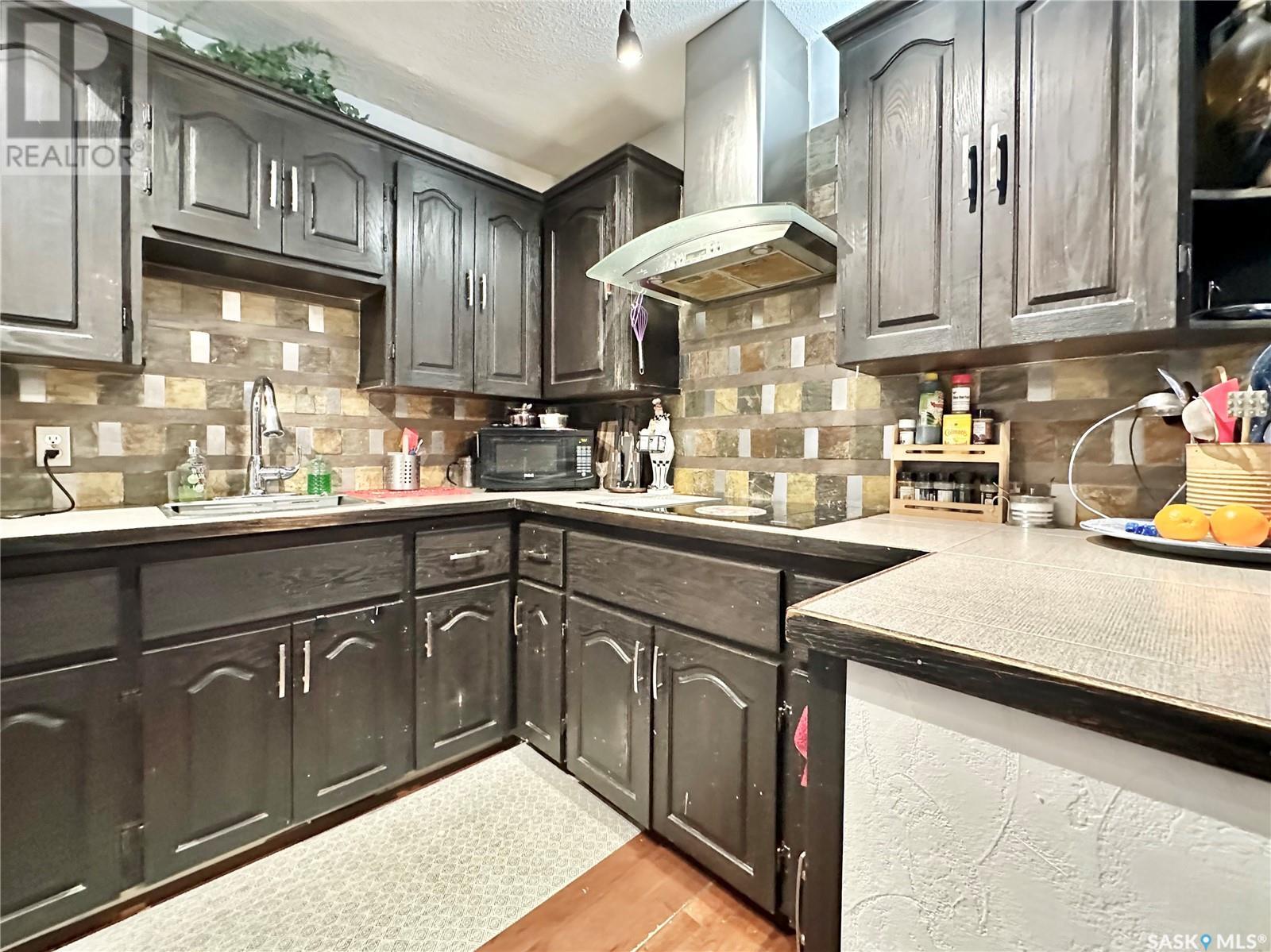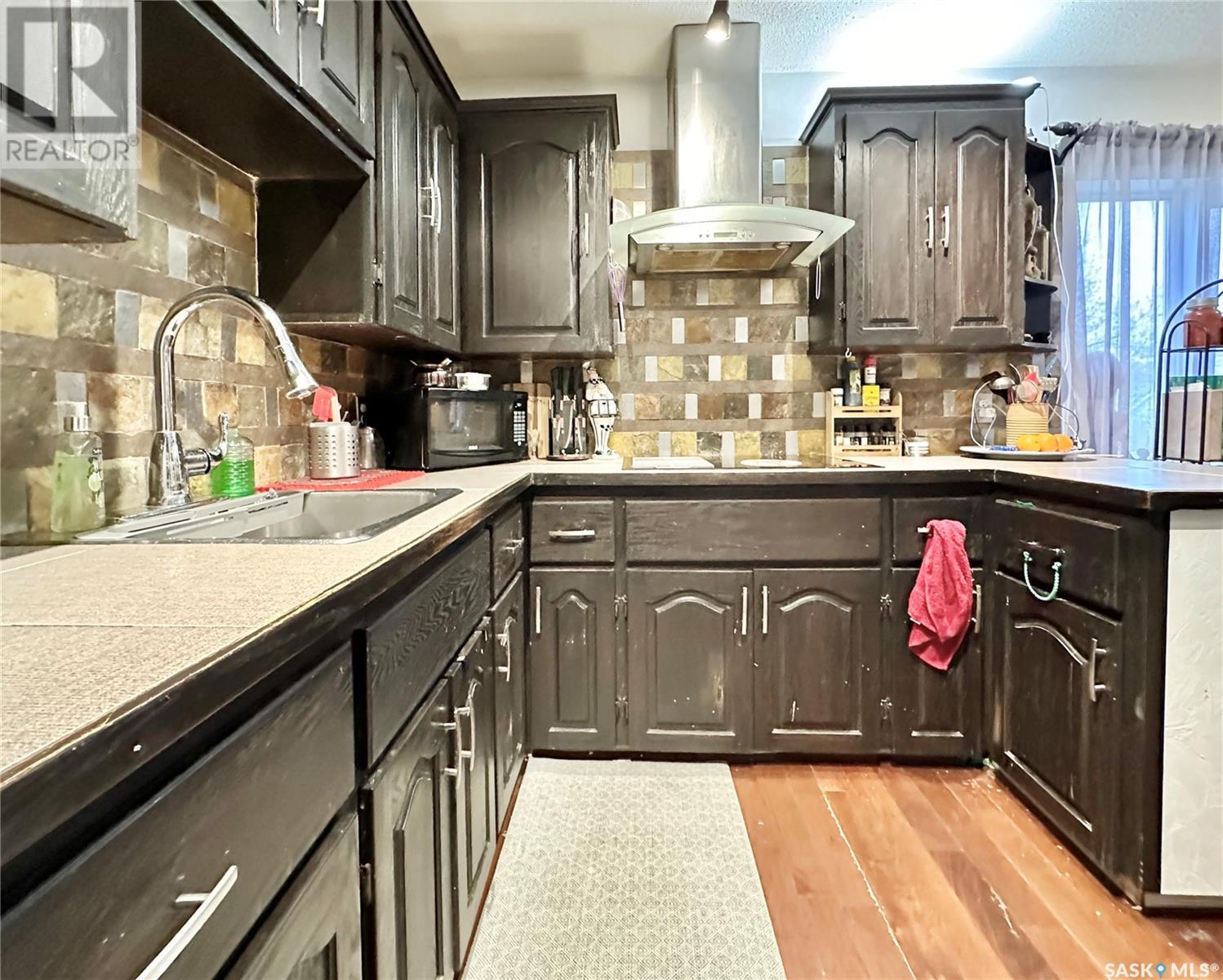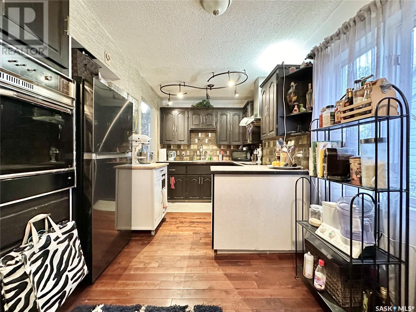 Lovely home centrally located full of character and charm. Bright open concept main level shows off the open stairway leading to upper level. Medium toned hardwood flooring throughout main level with trendy contrasting wall colour. Kitchen has espresso cabinets with a built-in oven, stove top and loads of storage. Room for a table and chairs or stools for the breakfast bar. Spacious living room and dining room lead to a sunroom that is your personal private getaway. This is where you can escape with a beverage and book. Beyond the sunroom is a fenced yard with an oversized single garage and additional parking. Back gate opens so you can park a RV camper or have easy access to your backyard. Bathroom has been updated to include soaker tub, surround, sliding glass shower doors and pedestal sink with storage under. Upper level has two good-sized bedrooms with hardwood floors. Back entry will hold all your outdoor gear and leads to lower level that is partially developed. This home is nicely maintained and close to major arteries of Regina. Central air. Metal roof. Newer furnace. (rented) (id:22211)
