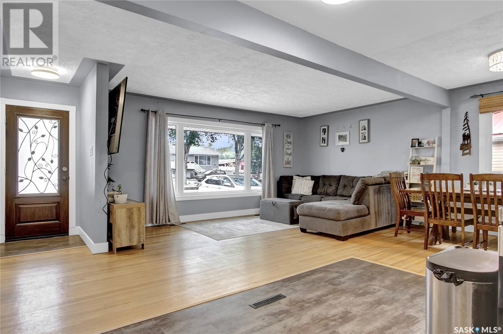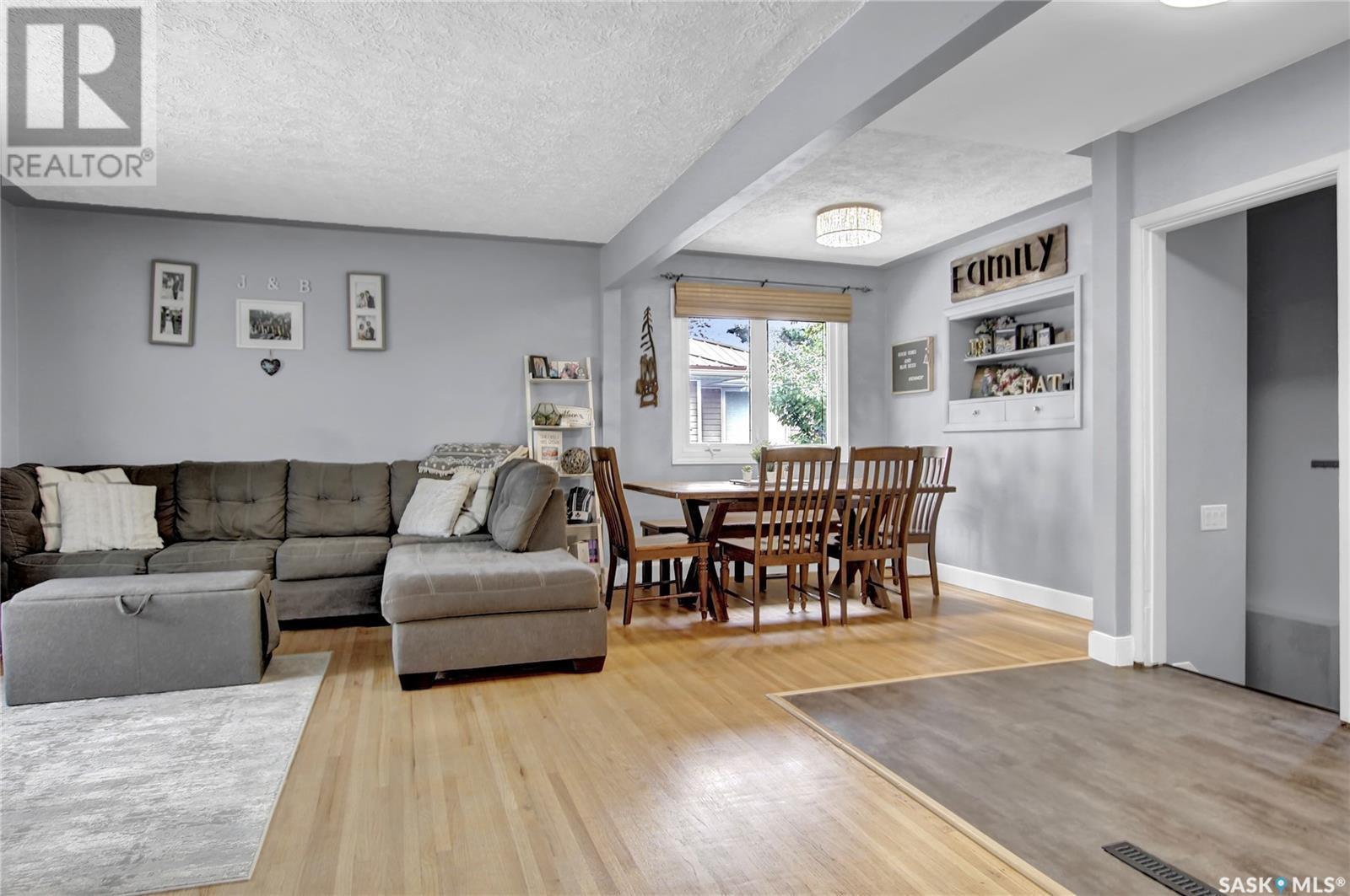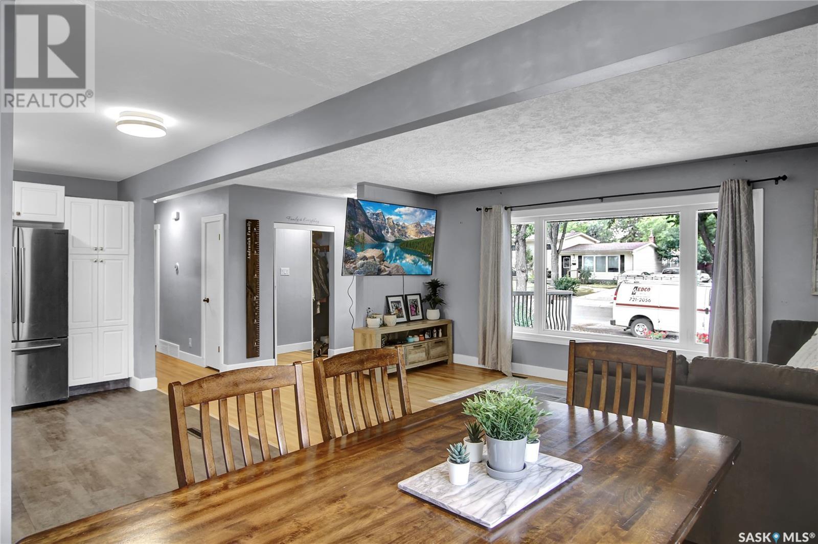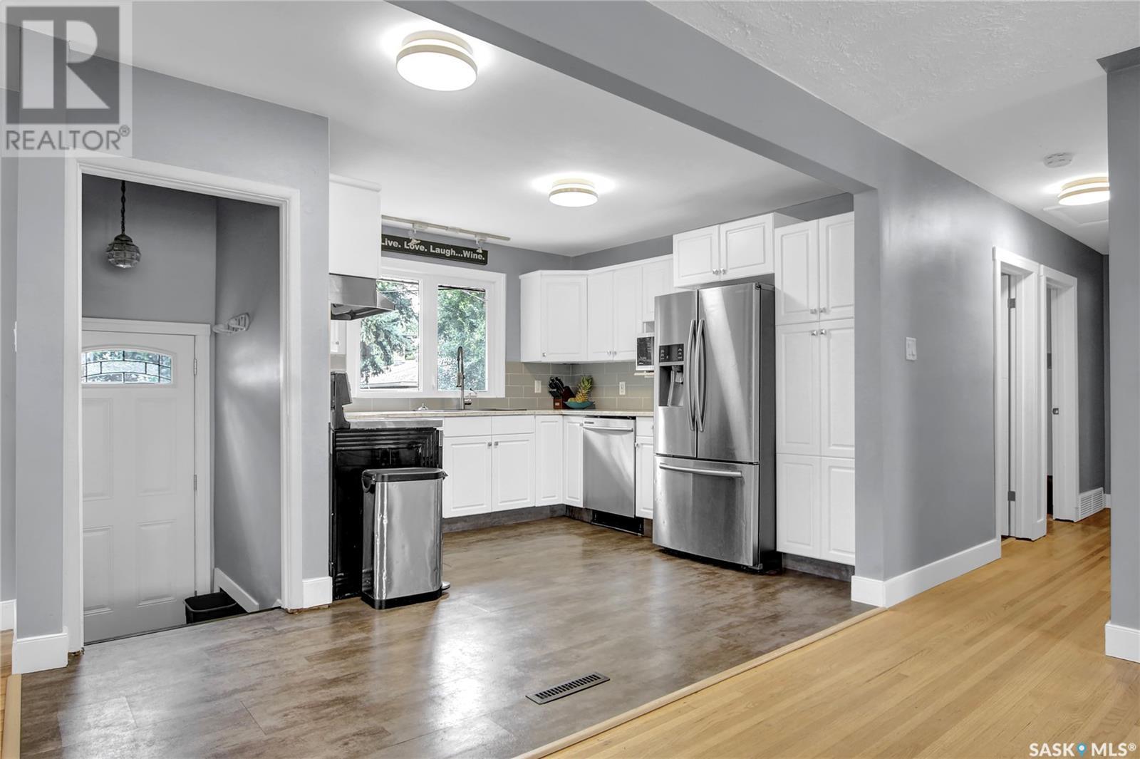 Welcome to 1809 Dufferin Road. Great South end location within walking distance to elementary school, close to U of Regina and all South end amenities. Great street appeal with the low maintenance siding, newer shingles, large front step, updated front door & most windows. The main floor has been opened up to a great room style layout. Hardwood floors thru most of main floor. Living and dining rooms are spacious. Kitchen has been updated with white cabinets, newer counter tops, tile back splash, black granite sink and stainless steel appliances. Views of backyard from kitchen. There are 3 bedrooms on the main level, all with hardwood floors. Interior doors, trim, plumbing & hardware have been upgraded. The bathroom has been renovated with large vanity with granite top, taps, toilet and tile surround to soaker tub. The basement is developed with a large rec room, bedroom (window may not meet egress), and storage area. Laundry is located in utility room. Spacious backyard with some newer pvc fencing, grass, patio and shed for extra storage. Good concrete driveway can accommodate 2 vehicles. Truly a great place to call home. Book your showing today!! (id:22211)