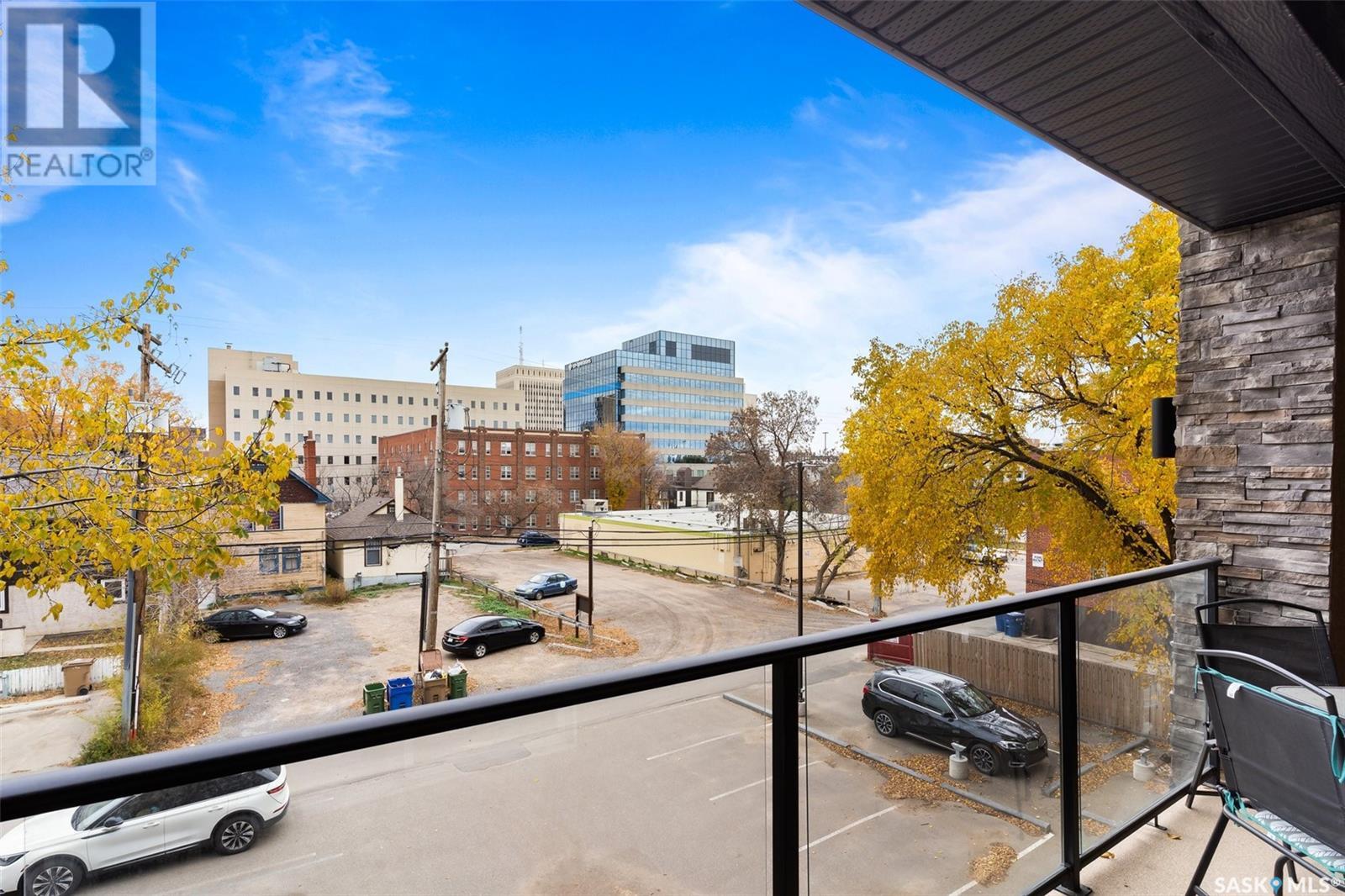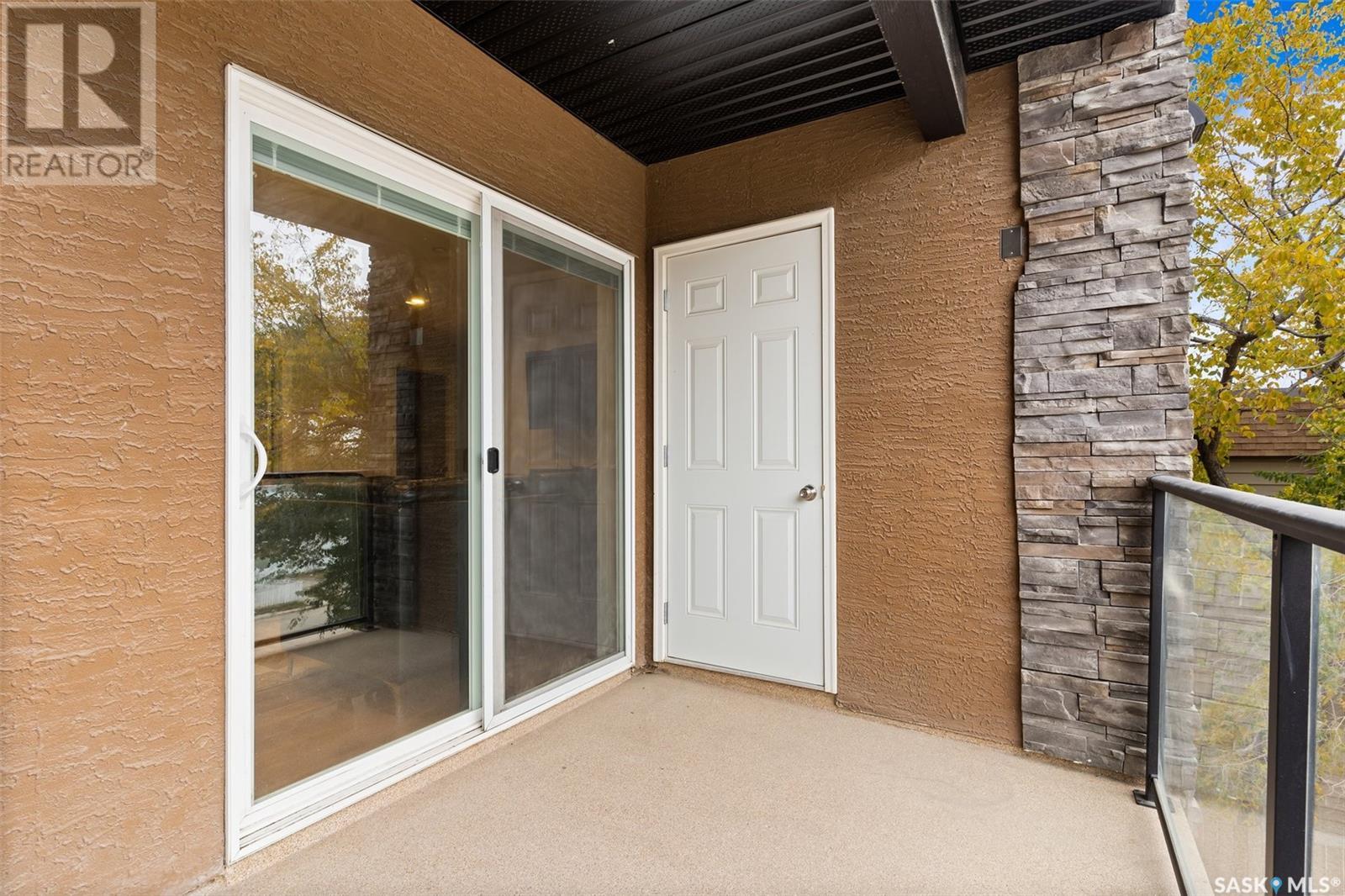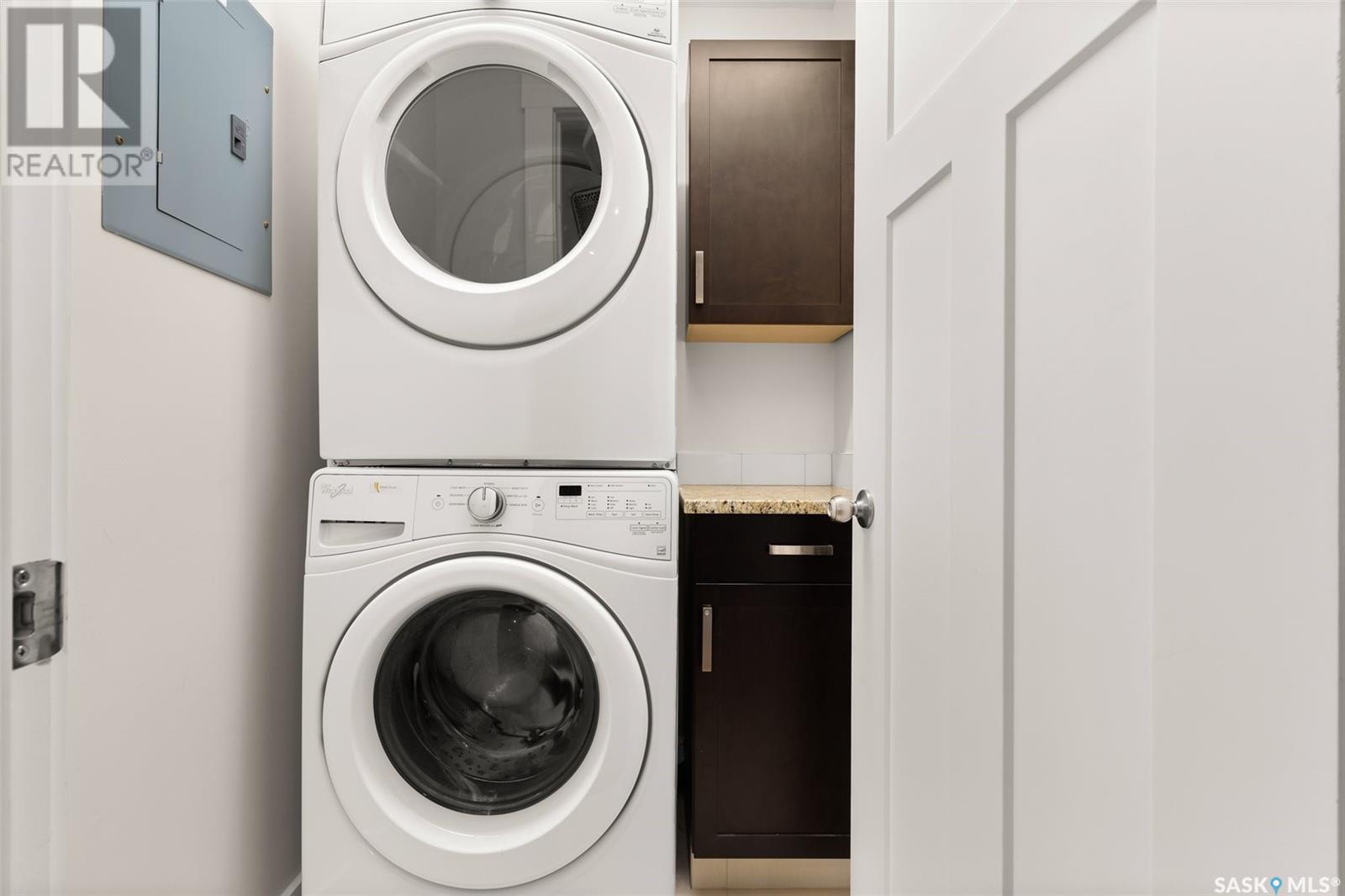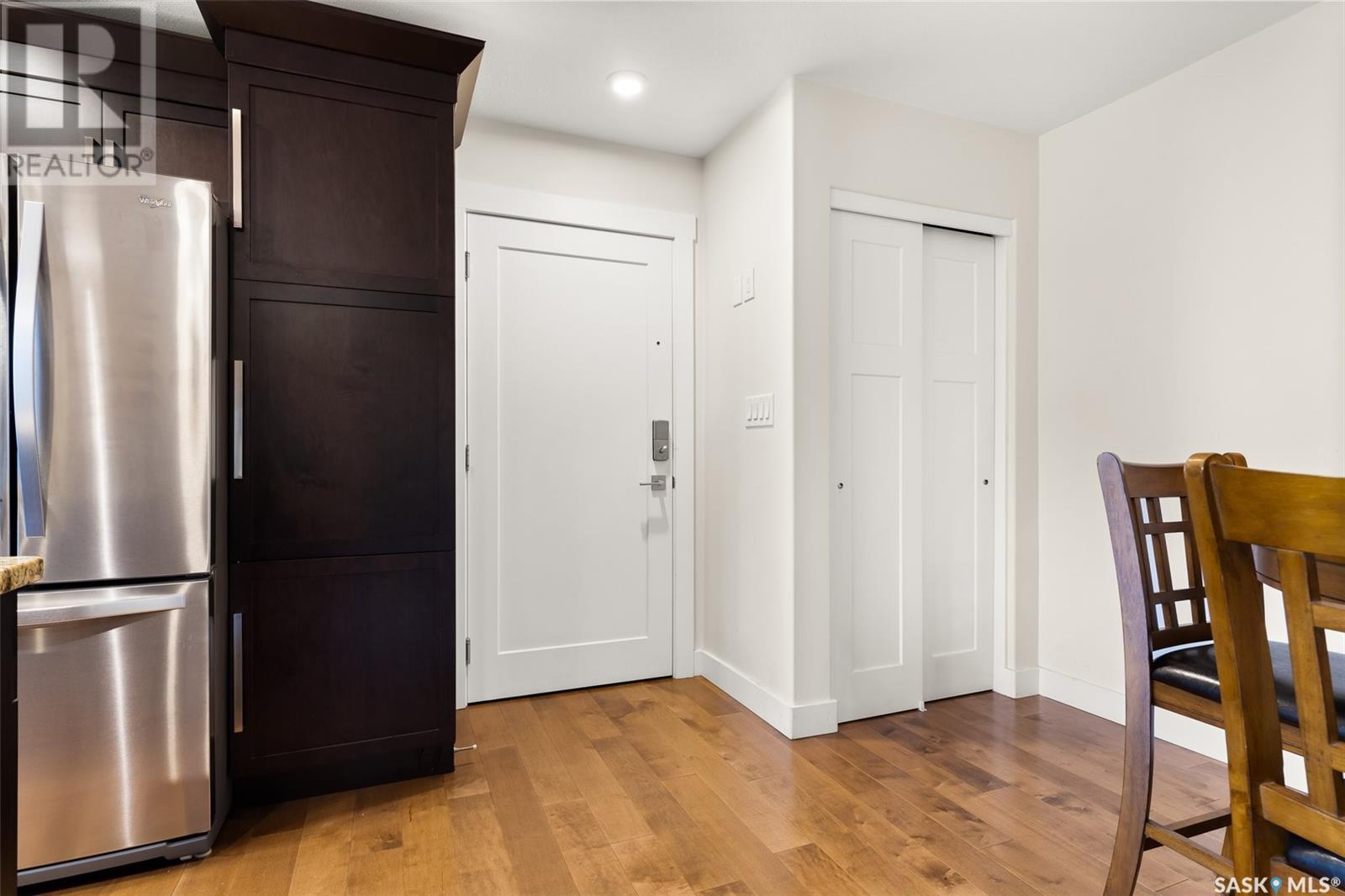 Upscale 2 bedroom, 2 bath condo located in the Cathedral neighbourhood! #303 is spacious and a great space for entertaining with its open concept floor plan. Hardwood flooring flows through the living room, dining area, kitchen and hallway. The kitchen includes ample cabinet space, a pantry for added storage, granite counters, tiled backsplash, under cabinet lighting and stainless-steel appliances. The east facing living room is bright and features an electric fireplace. Patio doors open to a good-sized balcony with a large utility/storage room. The laundry room is conveniently equipped with stacking washer and dryer, and cabinets for tucking away cleaning supplies. The main bathroom has a large vanity with granite counter top and tile flooring for easy cleaning. The primary bedroom boasts a half bath with granite counter top, tile flooring and space saving pocket door. The walk in closet is very generous in size and could be further customized for all your clothing. The second bedroom is a great size and the cozy carpet is nice to set your toes on in the morning. The Borgata on Rae is an attractive condominium with elevator access, secure front entrance, and is wheel chair accessible. (id:22211)