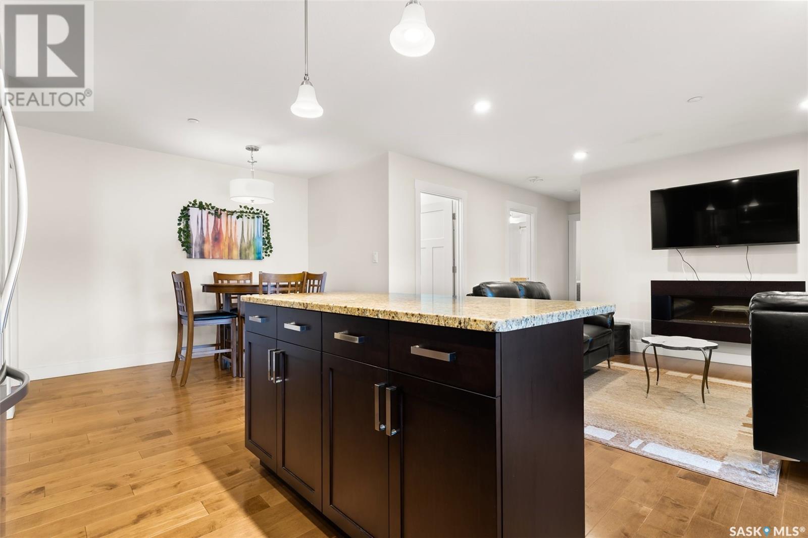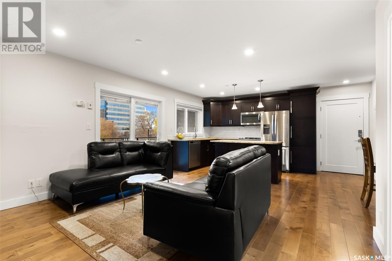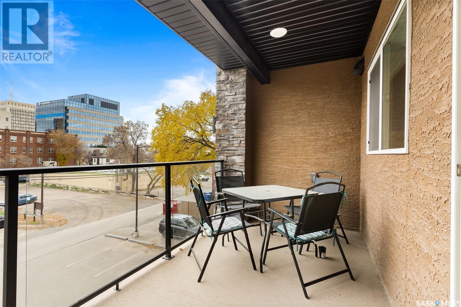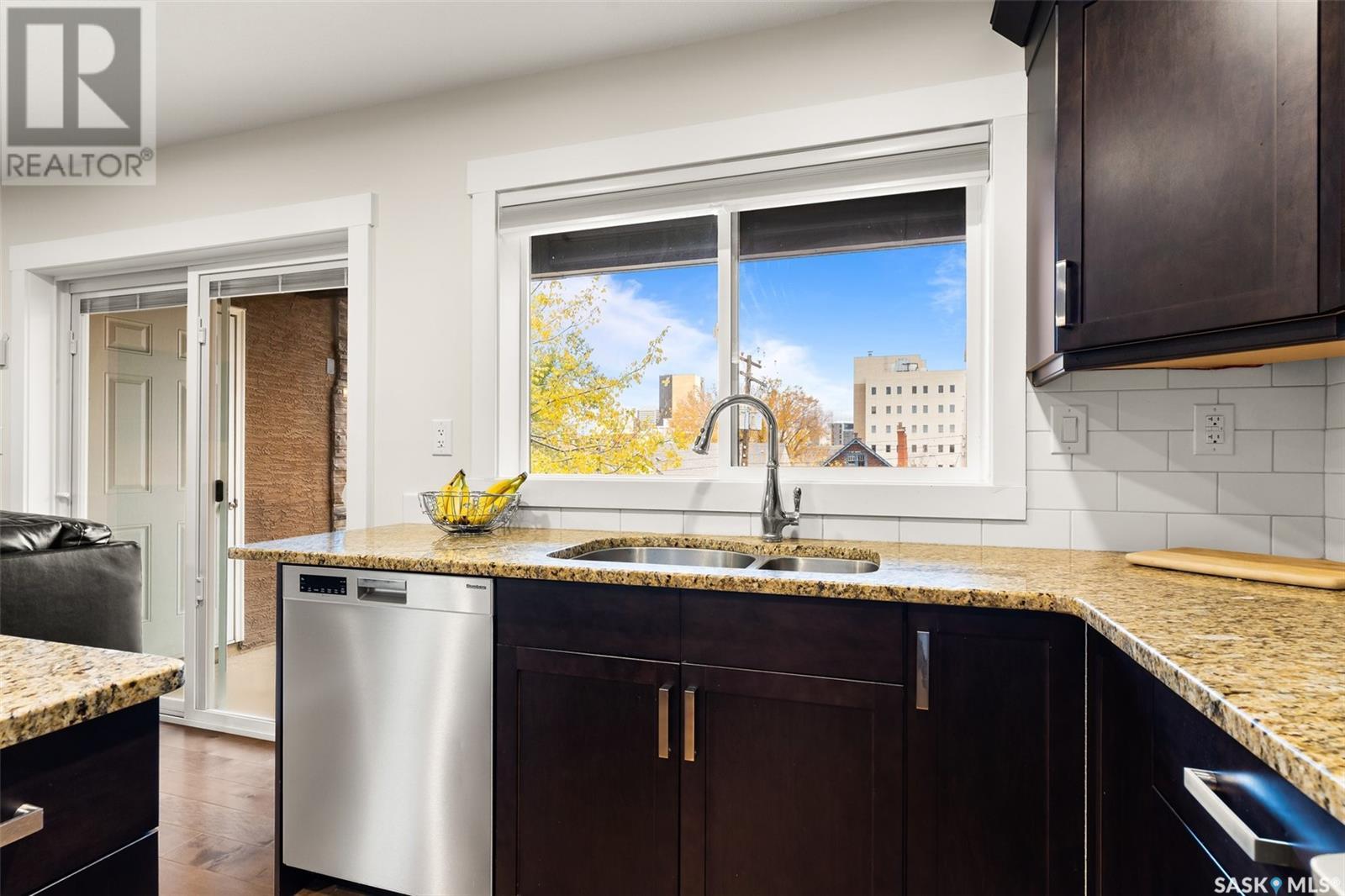 Upscale 2 bedroom, 2 bath condo located in the Cathedral neighbourhood! #303 is spacious and a great space for entertaining with its open concept floor plan. Hardwood flooring flows through the living room, dining area, kitchen and hallway. The kitchen includes ample cabinet space, a pantry for added storage, granite counters, tiled backsplash, under cabinet lighting and stainless-steel appliances. The east facing living room is bright and features an electric fireplace. Patio doors open to a good-sized balcony with a large utility/storage room. The laundry room is conveniently equipped with stacking washer and dryer, and cabinets for tucking away cleaning supplies. The main bathroom has a large vanity with granite counter top and tile flooring for easy cleaning. The primary bedroom boasts a half bath with granite counter top, tile flooring and space saving pocket door. The walk in closet is very generous in size and could be further customized for all your clothing. The second bedroom is a great size and the cozy carpet is nice to set your toes on in the morning. The Borgata on Rae is an attractive condominium with elevator access, secure front entrance, and is wheel chair accessible. (id:22211)