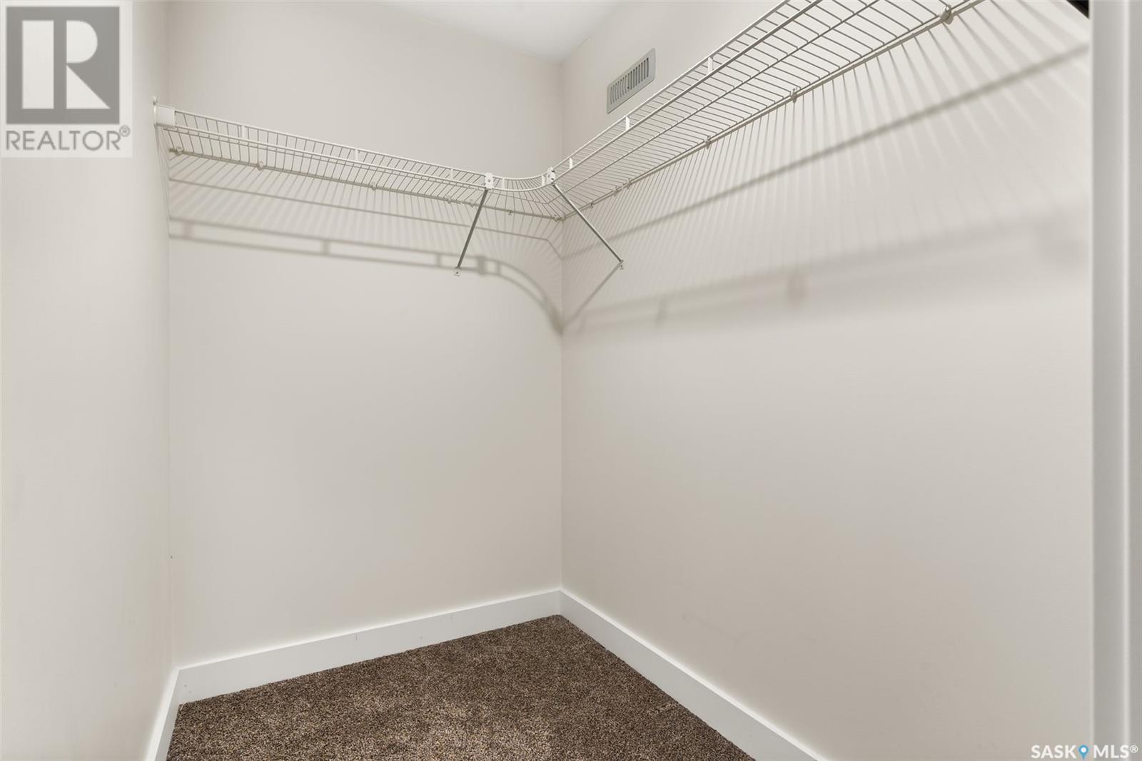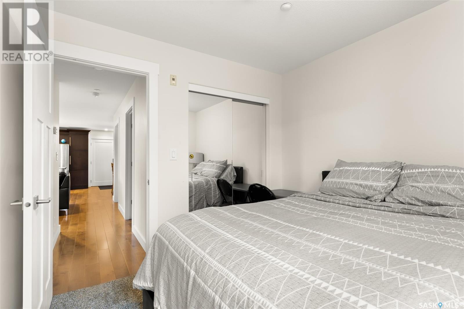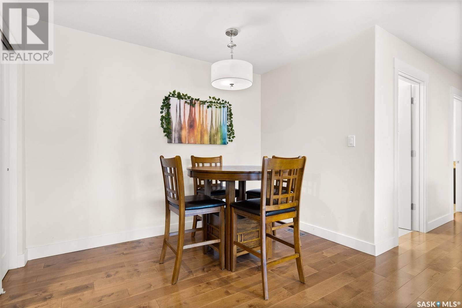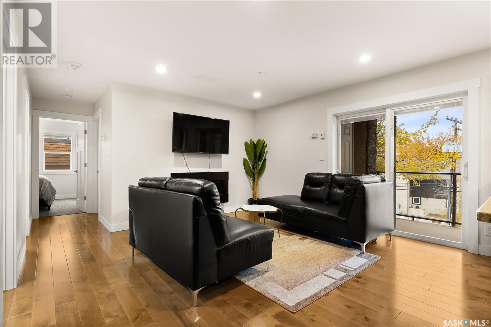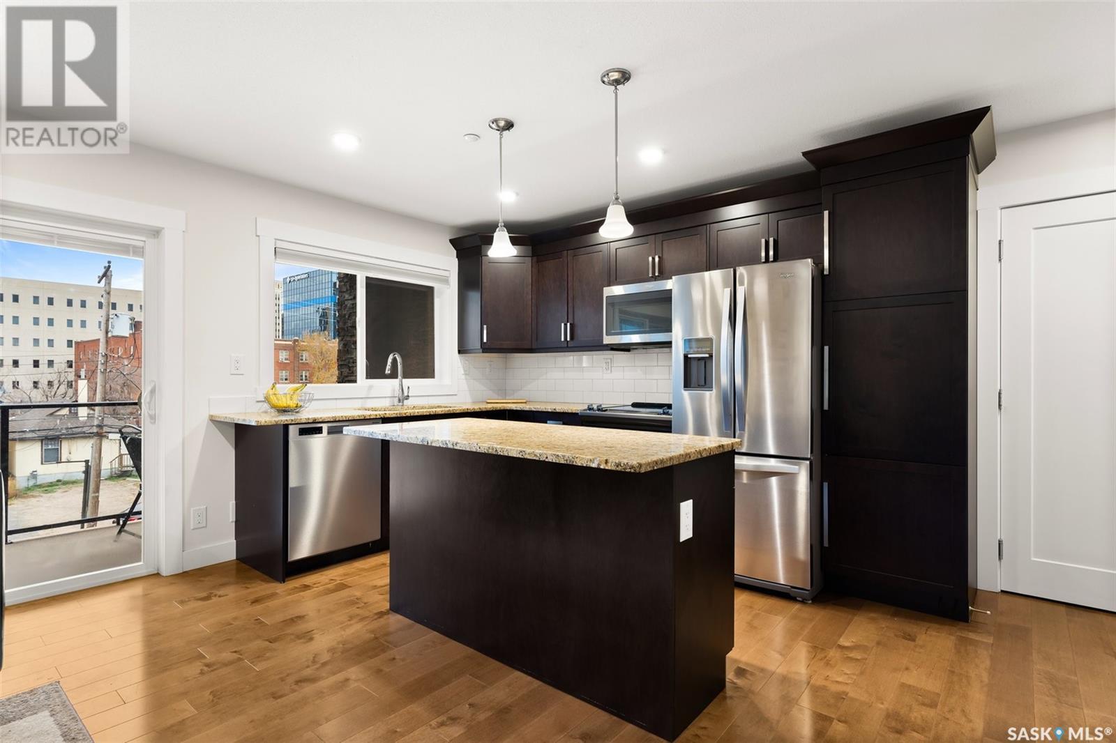 Upscale 2 bedroom, 2 bath condo located in the Cathedral neighbourhood! #303 is spacious and a great space for entertaining with its open concept floor plan. Hardwood flooring flows through the living room, dining area, kitchen and hallway. The kitchen includes ample cabinet space, a pantry for added storage, granite counters, tiled backsplash, under cabinet lighting and stainless-steel appliances. The east facing living room is bright and features an electric fireplace. Patio doors open to a good-sized balcony with a large utility/storage room. The laundry room is conveniently equipped with stacking washer and dryer, and cabinets for tucking away cleaning supplies. The main bathroom has a large vanity with granite counter top and tile flooring for easy cleaning. The primary bedroom boasts a half bath with granite counter top, tile flooring and space saving pocket door. The walk in closet is very generous in size and could be further customized for all your clothing. The second bedroom is a great size and the cozy carpet is nice to set your toes on in the morning. The Borgata on Rae is an attractive condominium with elevator access, secure front entrance, and is wheel chair accessible. (id:22211)