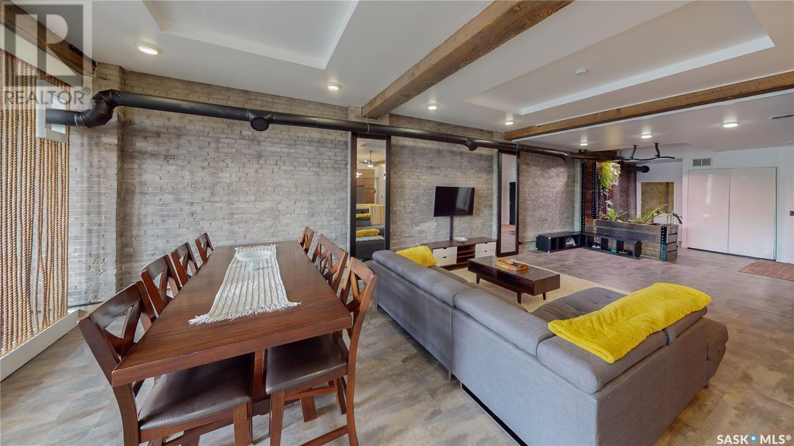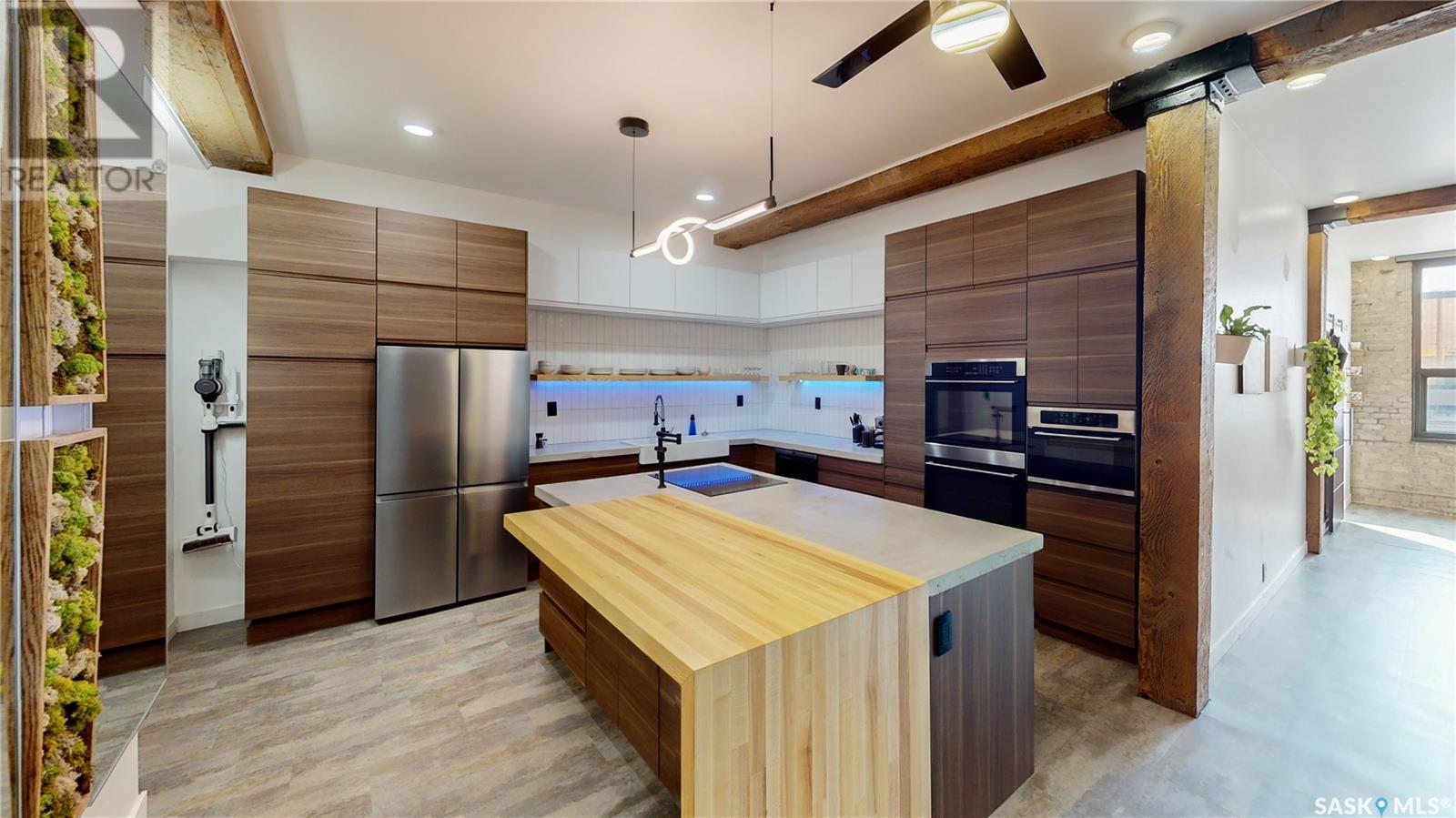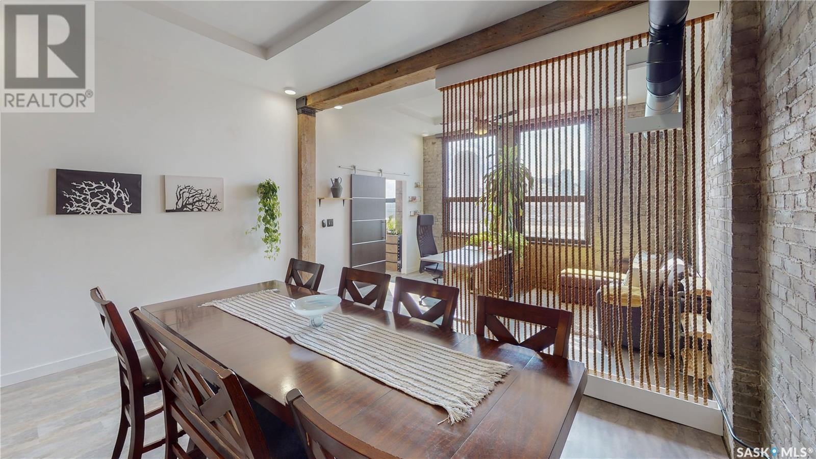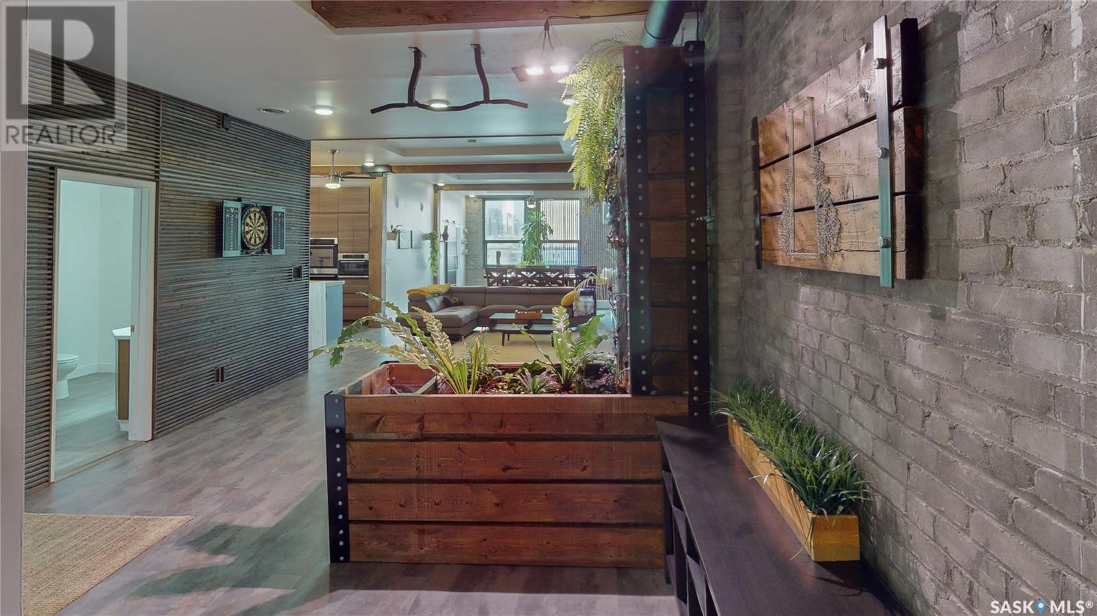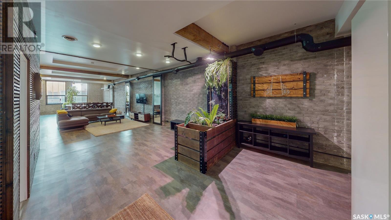 Welcome to unit 400 at 2128 Dewdney Ave in The Ackerman building! This 2 bed 3 bathroom, 1847 square foot fourth floor condo is located in Regina’s lively Warehouse district. You enter the fully furnished suite into the porch where a sitting area offers coat and shoe storage. One of the first things you see is a stunning vertical garden box with fully integrated lighting and watering system. Towards the back of the suite is the first bedroom with vinyl tile flooring, beautiful exposed brick and an auxiliary electrical heater. This bedroom also contains a dedicated entrance from the hallway. The 3 piece ensuite has a tile floor and a large corner jet tub. The main 3 piece bathroom is centrally located within the suite and has a tile shower, updated fixtures and a large vanity. The living room is open and bright with light filling the suite from large south facing windows. The original exposed beams and brick offer authentic warehouse condo feels. The kitchen has an abundance of cabinet storage. It's finished with concrete countertops, a waterfall butcher block, soft close cabinets/drawers, and LED under-lit floating shelves. New appliances include an induction cooktop with pot filler, stainless steel fridge, built in double oven, microwave and dishwasher. The laundry and utility room is neatly behind a door in the kitchen and includes the front load washer and dryer and has an updated gas furnace and water heater. The spacious dining area easily fits a large 8 person dining table. The office at the front of the unit is filled with light as the large windows look out to the cityscape. The primary bedroom is spacious enough for a king size bed and has two additional large south facing windows. The primary also contains a walk-in closet and a 3 piece ensuite with a large steam shower. Flexible possession date is available with option to continue executive rental ($2,350/mo) or renew Jan 1, 2024 (id:22211)
