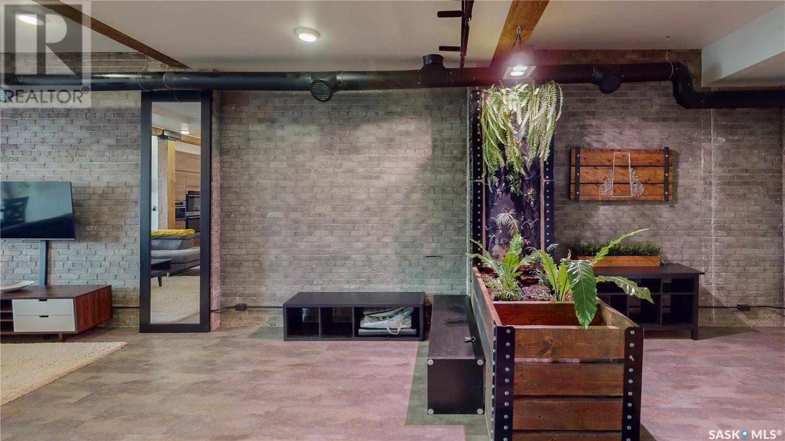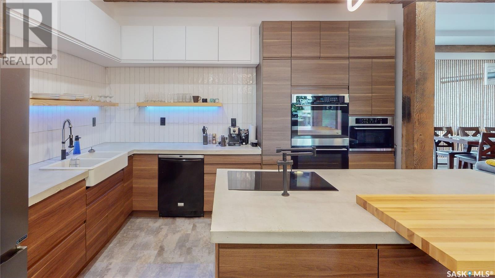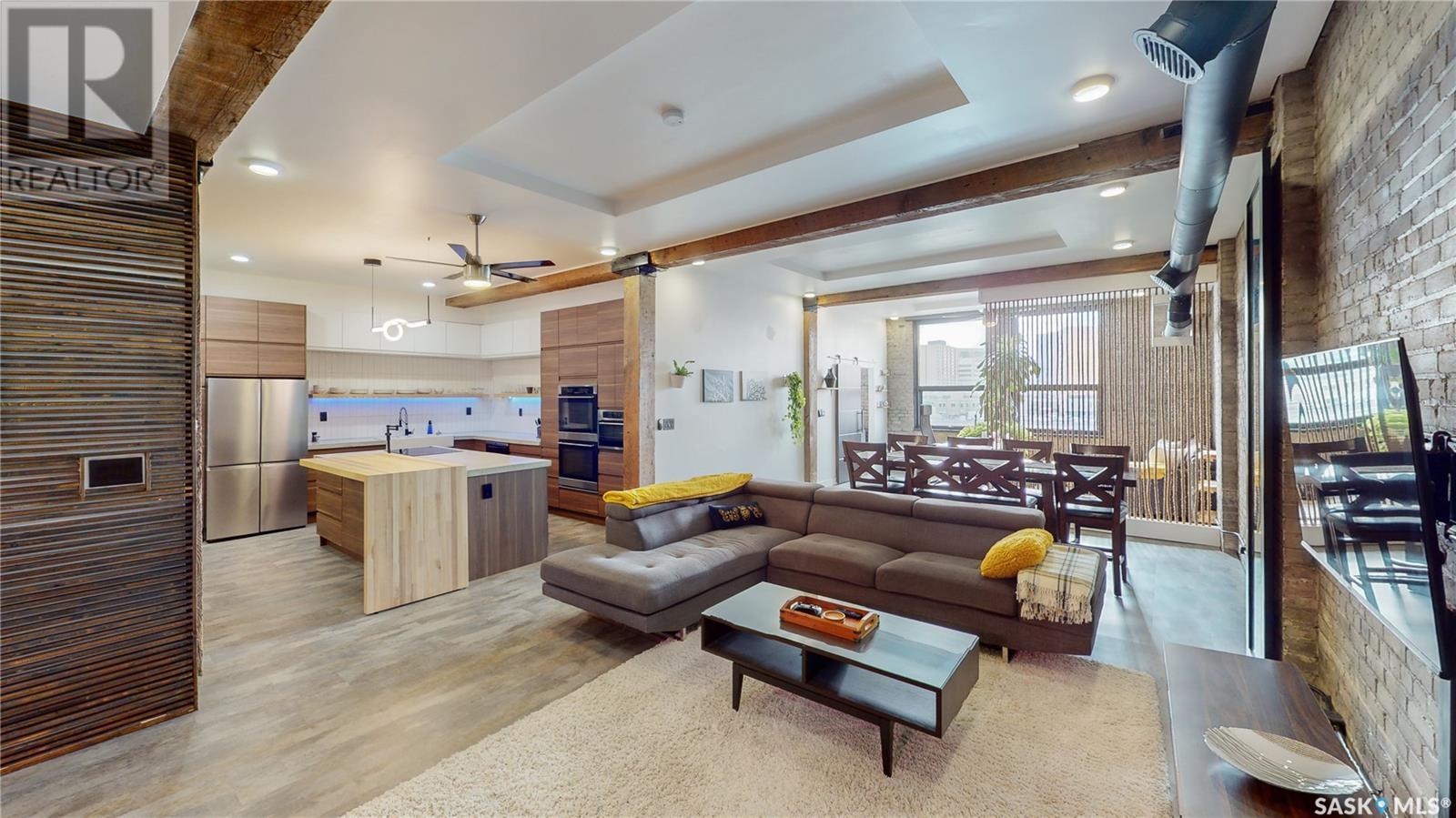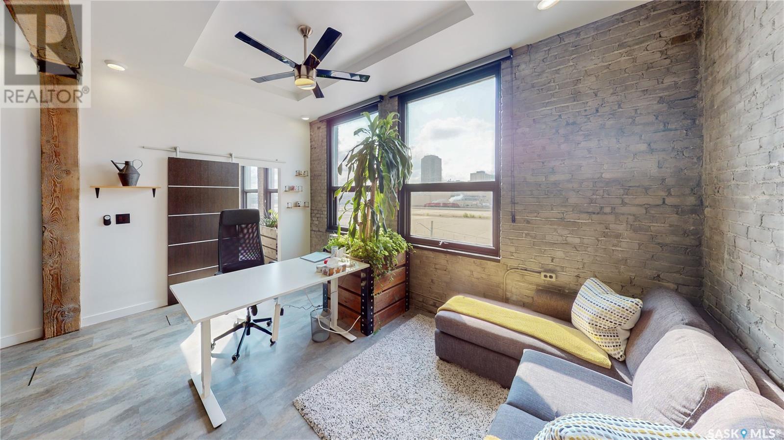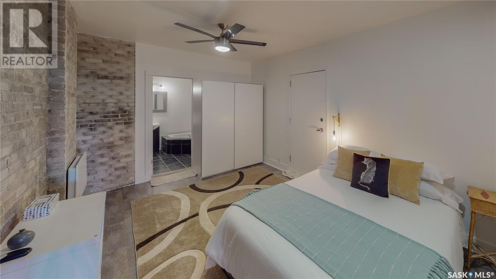 Welcome to unit 400 at 2128 Dewdney Ave in The Ackerman building! This 2 bed 3 bathroom, 1847 square foot fourth floor condo is located in Regina’s lively Warehouse district. You enter the fully furnished suite into the porch where a sitting area offers coat and shoe storage. One of the first things you see is a stunning vertical garden box with fully integrated lighting and watering system. Towards the back of the suite is the first bedroom with vinyl tile flooring, beautiful exposed brick and an auxiliary electrical heater. This bedroom also contains a dedicated entrance from the hallway. The 3 piece ensuite has a tile floor and a large corner jet tub. The main 3 piece bathroom is centrally located within the suite and has a tile shower, updated fixtures and a large vanity. The living room is open and bright with light filling the suite from large south facing windows. The original exposed beams and brick offer authentic warehouse condo feels. The kitchen has an abundance of cabinet storage. It's finished with concrete countertops, a waterfall butcher block, soft close cabinets/drawers, and LED under-lit floating shelves. New appliances include an induction cooktop with pot filler, stainless steel fridge, built in double oven, microwave and dishwasher. The laundry and utility room is neatly behind a door in the kitchen and includes the front load washer and dryer and has an updated gas furnace and water heater. The spacious dining area easily fits a large 8 person dining table. The office at the front of the unit is filled with light as the large windows look out to the cityscape. The primary bedroom is spacious enough for a king size bed and has two additional large south facing windows. The primary also contains a walk-in closet and a 3 piece ensuite with a large steam shower. Flexible possession date is available with option to continue executive rental ($2,350/mo) or renew Jan 1, 2024 (id:22211)